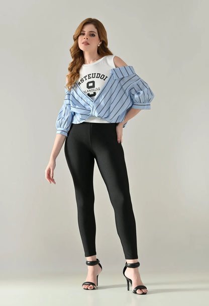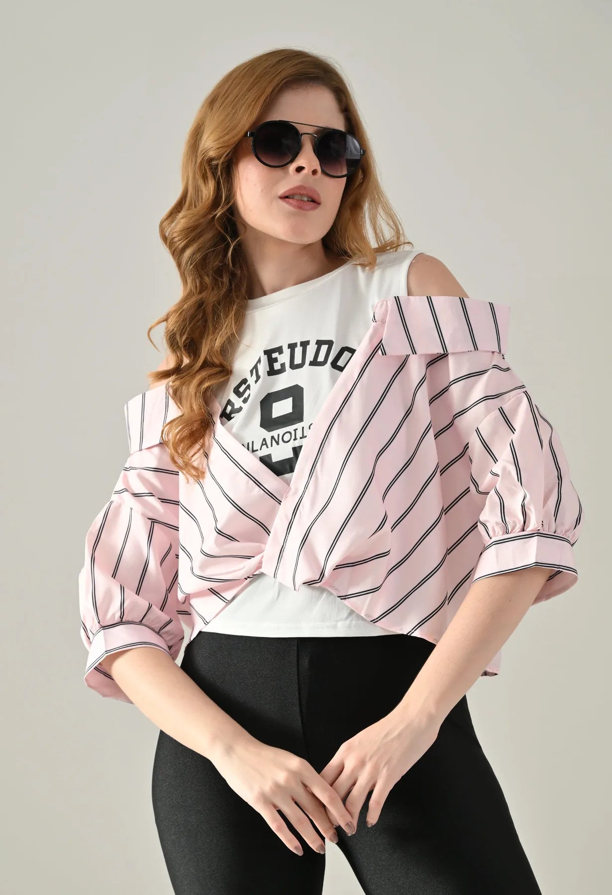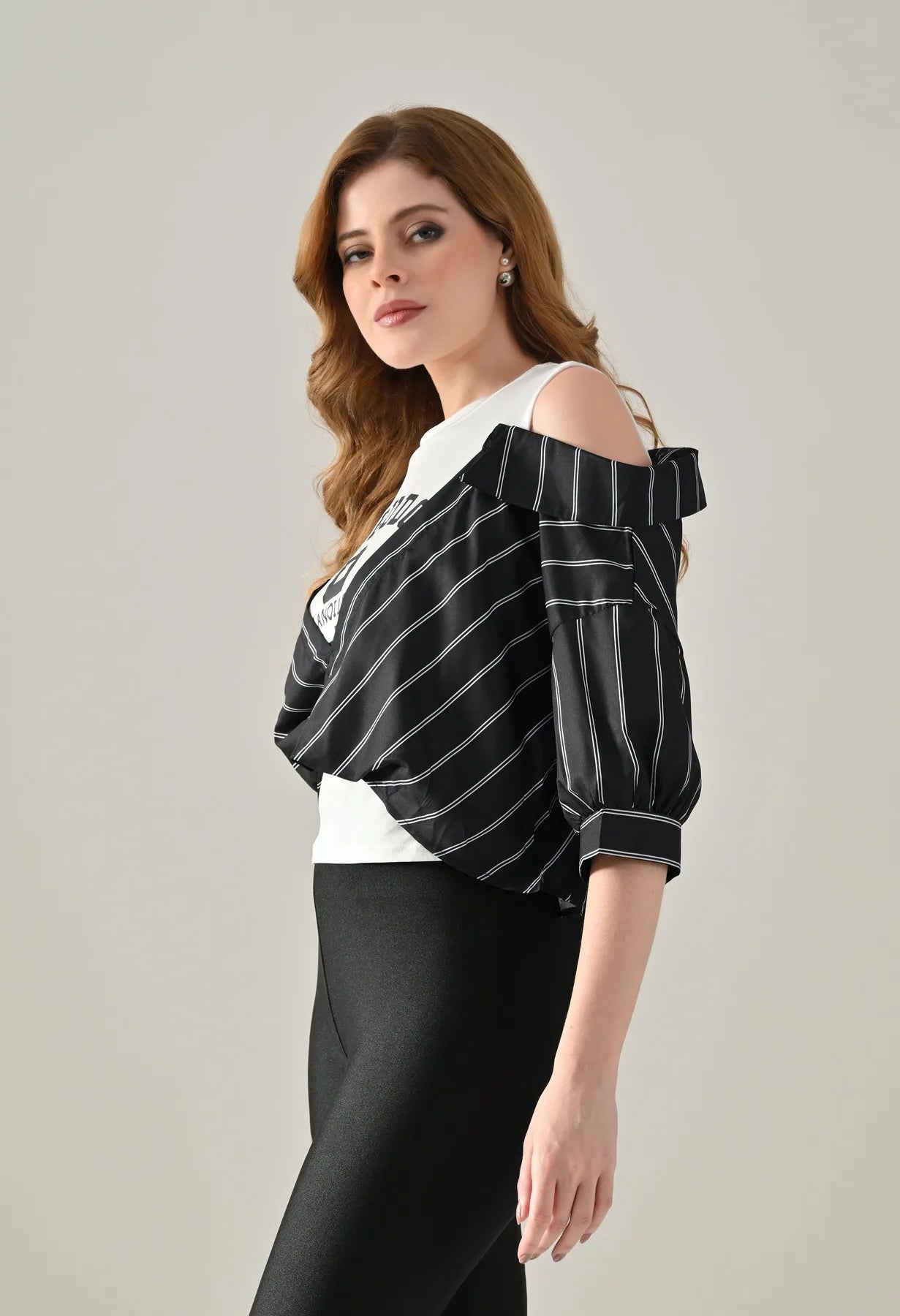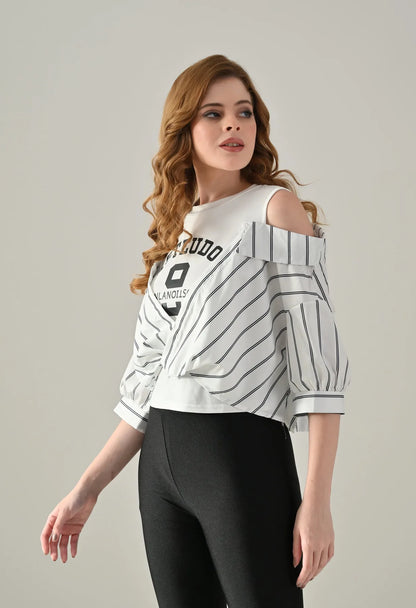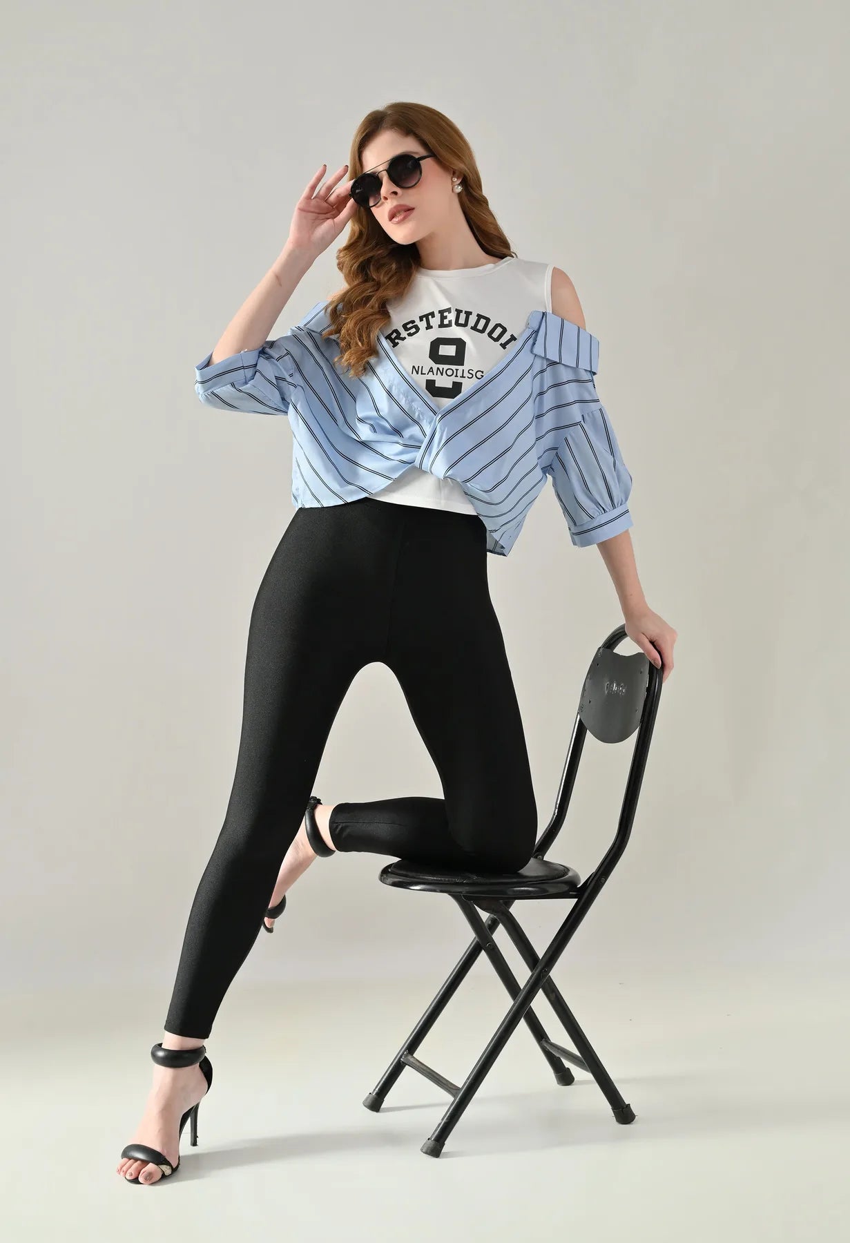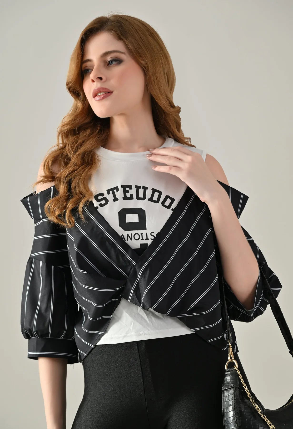 This unique design blends casual comfort with a fashionable twist. The inner layer comes with a trendy printed T-shirt, while the outer layer mimics a striped shirt for a smart layered effect. Featuring a classic round neck and three-fourth sleeves, it’s perfect for an effortlessly stylish everyday look or a polished street-style vibe.