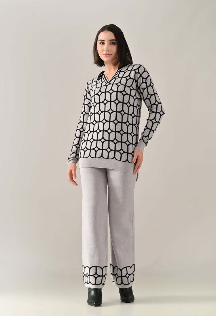 A chic sweater-knitted co-ord set featuring a collared V-neck top with long fitted sleeves and rib detailing at the hem and sleeve openings. Designed with a high-low front and back hem and side slits for a modern silhouette. The straight solid lower include a broad elasticated waist and ribbed hem, offering a perfect blend of style and comfort. Showcasing geometric pattern, this set is crafted from soft, comfortable, and stretchable fabric, ideal for a cozy yet elegant look.
