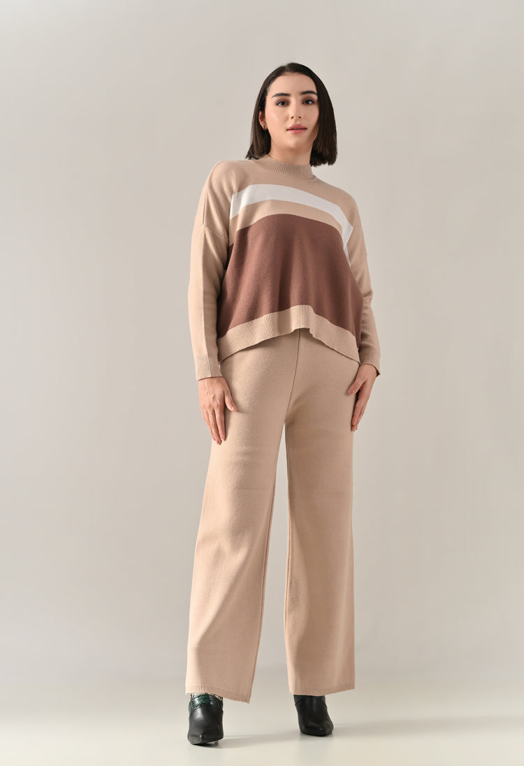 A trendy stripe knitted co-ord set featuring a mock neck with rib detailing, short Length, baggy loose-fit style with full sleeves. The top showcases a stripe pattern at the front with a regular ribbed hem for a structured finish. Paired with straight solid lower designed with a broad elasticated waist. Crafted from soft, comfortable, and stretchable fabric, this set combines cozy texture with modern design for effortless everyday style.