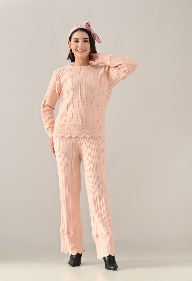 A stylish textured knitted coord set featuring a round neckline with rib detail and regular full sleeves. Designed with scalloped hem and sleeve openings for a delicate, feminine touch. The pants come with a broad elasticated waistline and scalloped leg openings, adding charm and comfort to the look. Made from soft, comfortable, and stretchable fabric, this set blends cozy elegance with effortless everyday style.