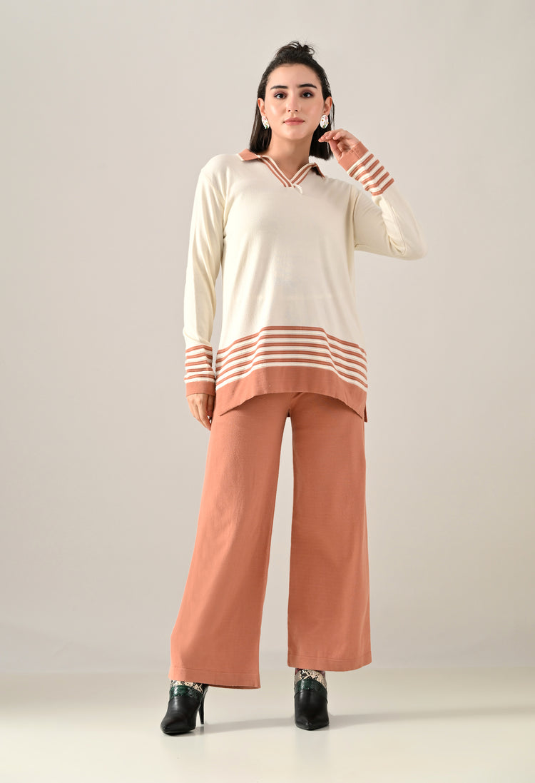 A trendy sweater-knitted co-ord set featuring a V-shaped neckline with a collar and regular full sleeves accented by a stripe design. The top includes a regular hem with matching stripe detail and side slits for added ease. Paired with flared stripe trousers featuring a broad elasticated waistband with coordinated stripe detailing. Made from soft, comfortable, and stretchable fabric, this set blends sporty style with cozy elegance — perfect for casual chic looks.