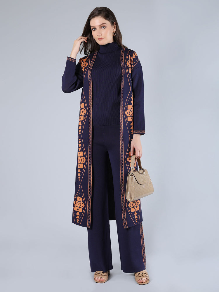 The Warm Knitted Three-Piece Set features a round neckline, long printed cardigan with full sleeves, and straight knitted pants, perfect for cozy autumn and winter wear. Crafted from stretchable material, it combines comfort and chic style for casual day wear or vacation outings.