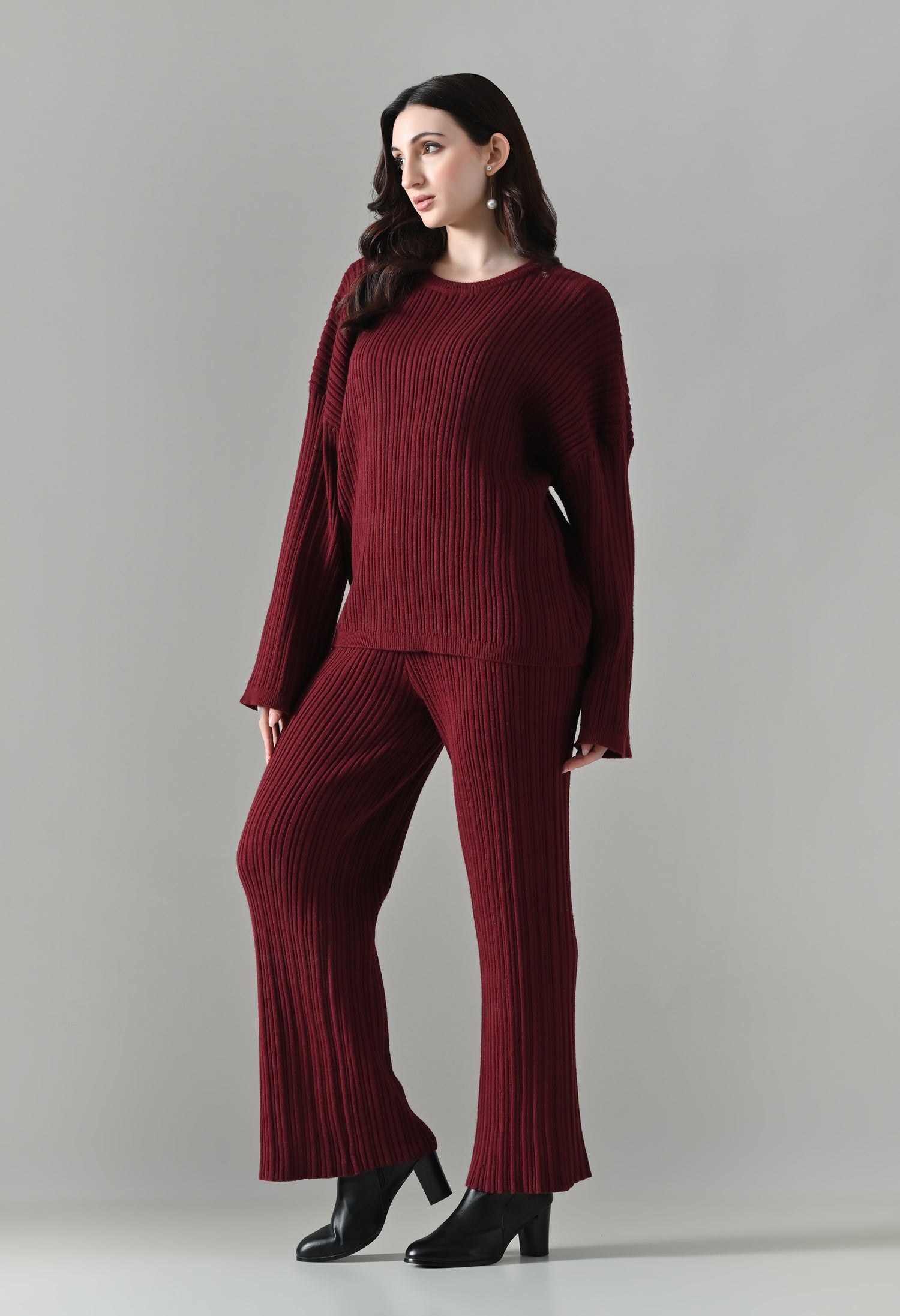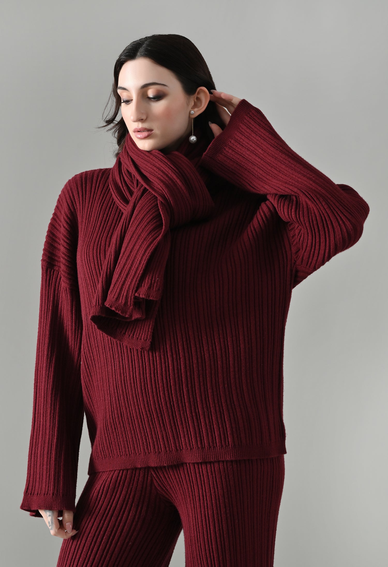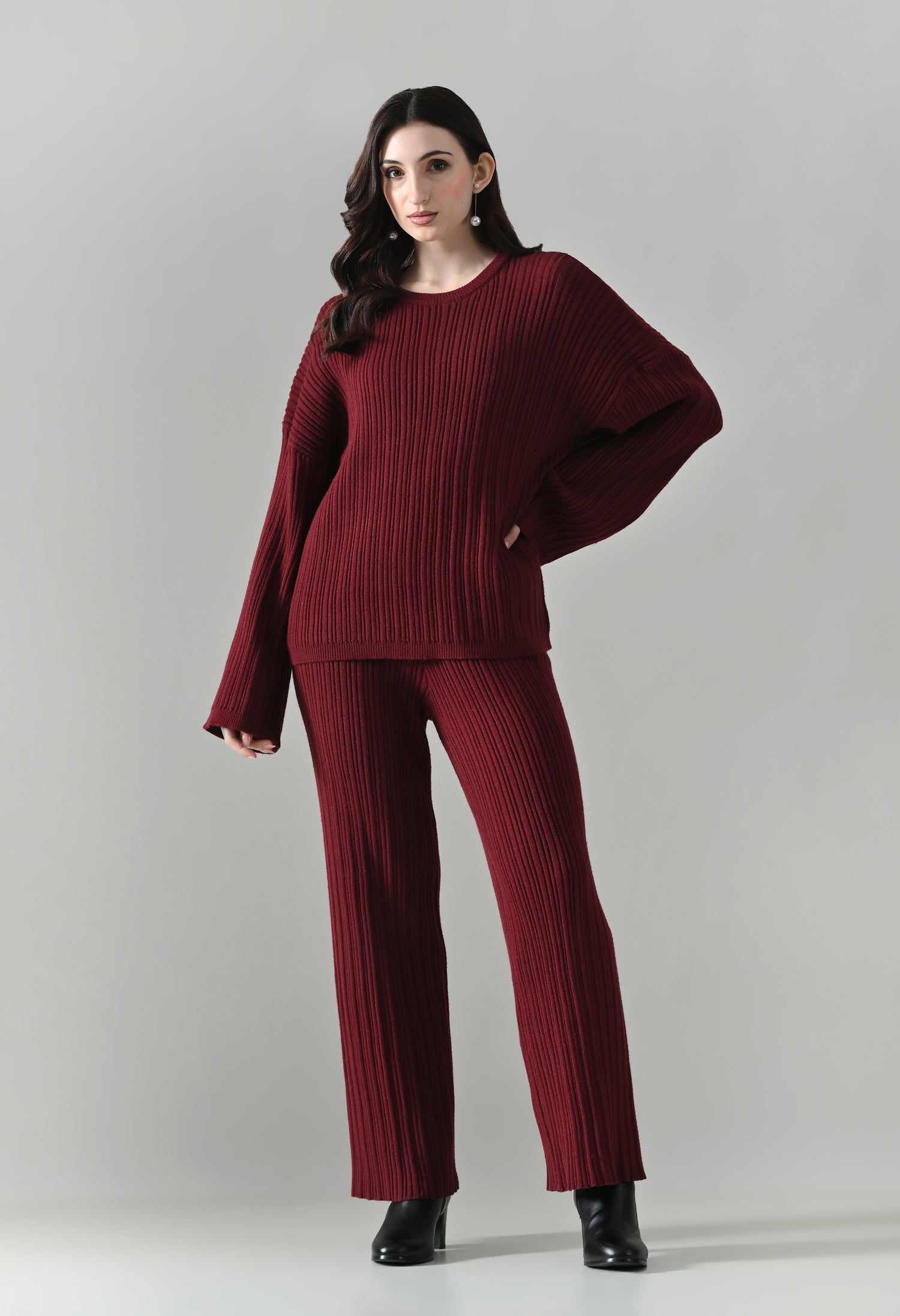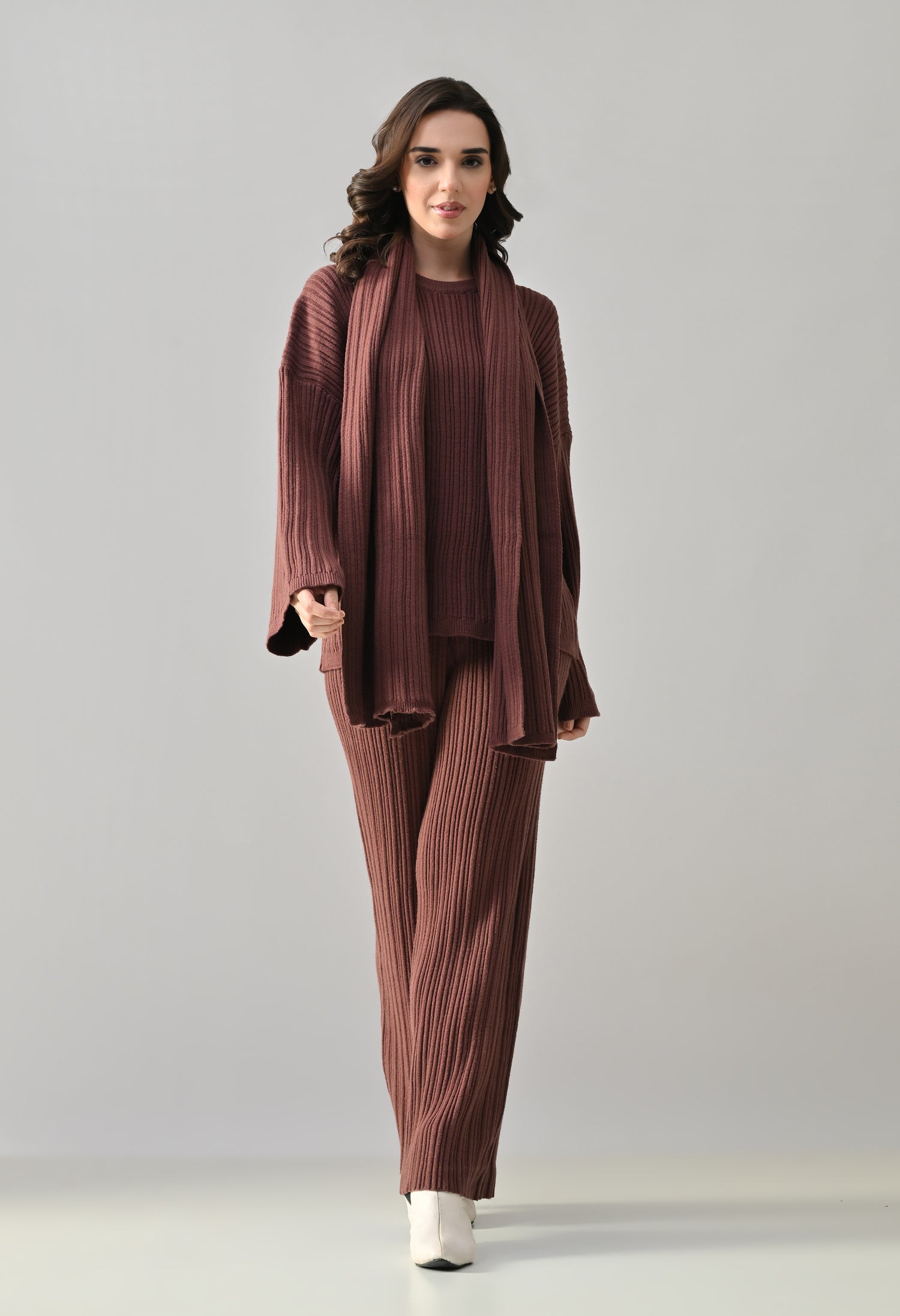 This cozy three-piece knit set includes a matching top, bottom, and muffler, designed for effortless winter comfort with a coordinated look. Crafted from a soft ribbed knit fabric, the set features a relaxed-fit top with a classic round neckline and three-quarter–length sleeves for easy, everyday wear. The matching bottoms are designed in a straight, comfortable silhouette with a clean finish, offering warmth without compromising on style. Completing the set is a coordinating ribbed muffler that adds extra coziness and a layered winter appeal. The rich solid tone enhances its versatile, lounge-to-outdoor styling potential, making it ideal for casual outings, travel, or relaxed winter days.
