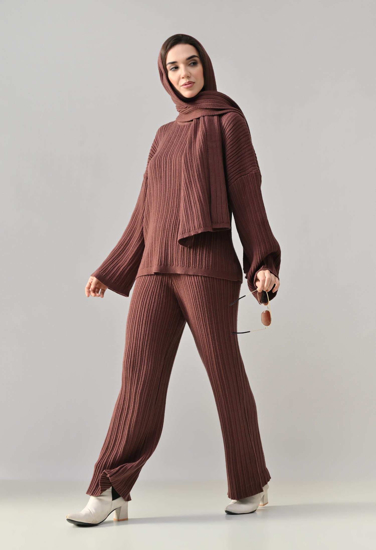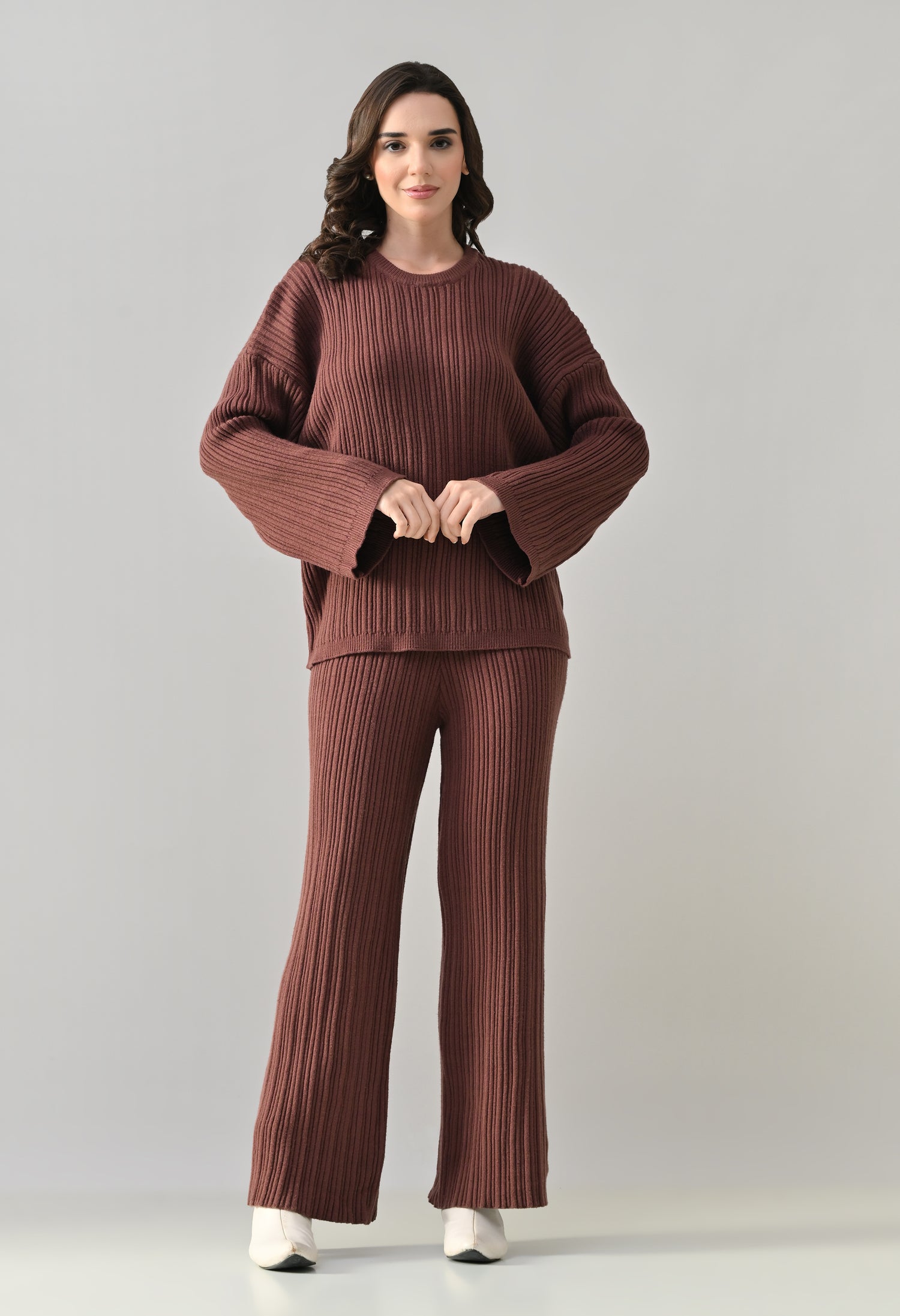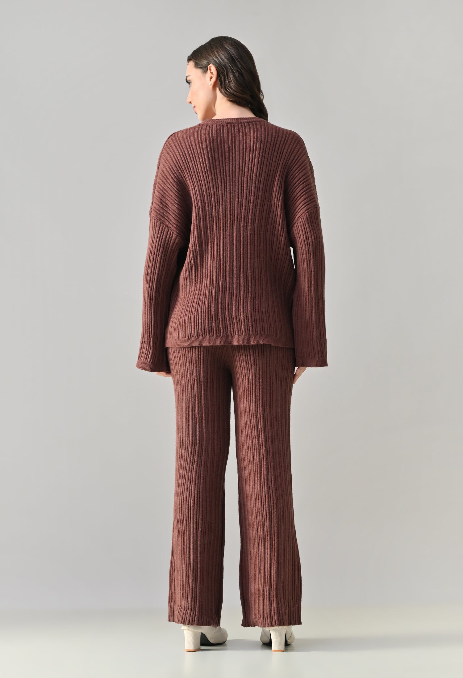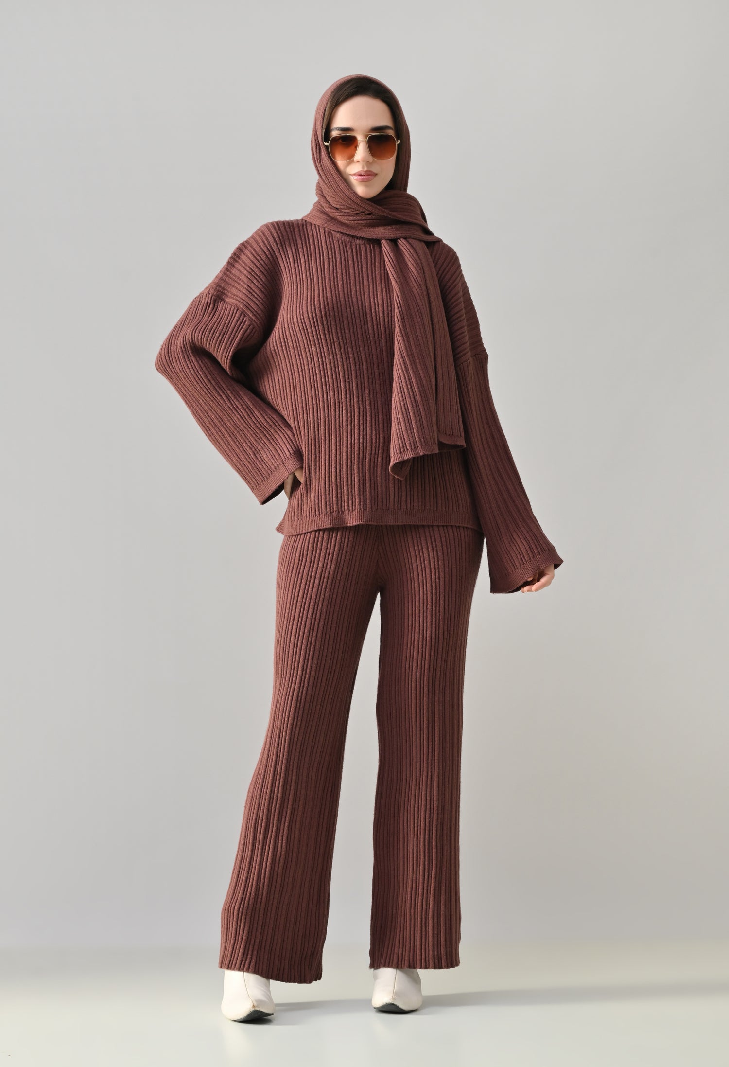 This cozy three-piece knit set includes a matching top, bottom, and muffler, designed for effortless winter comfort with a coordinated look. Crafted from a soft ribbed knit fabric, the set features a relaxed-fit top with a classic round neckline and three-quarter–length sleeves for easy, everyday wear. The matching bottoms are designed in a straight, comfortable silhouette with a clean finish, offering warmth without compromising on style. Completing the set is a coordinating ribbed muffler that adds extra coziness and a layered winter appeal. The rich solid tone enhances its versatile, lounge-to-outdoor styling potential, making it ideal for casual outings, travel, or relaxed winter days.