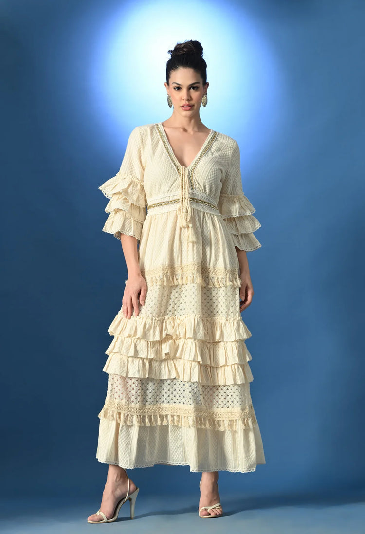 Embrace timeless elegance in this jacquard maxi dress, styled with a V-neckline and tassel ties for a delicate touch. The front is adorned with scalloped lace, lurex tassel lace, and intricate bead and sequin embellishments at the neck and waist, adding shimmer and charm. Thoughtful details like lace cut patches, three cut-and-sew panels, and ¾ ruffle sleeves elevate its graceful silhouette. The smocking panel and elastic at the back waist ensure comfort and shape, while the half lining and soft, breezy non-stretchable fabric make it perfect for all-day wear.