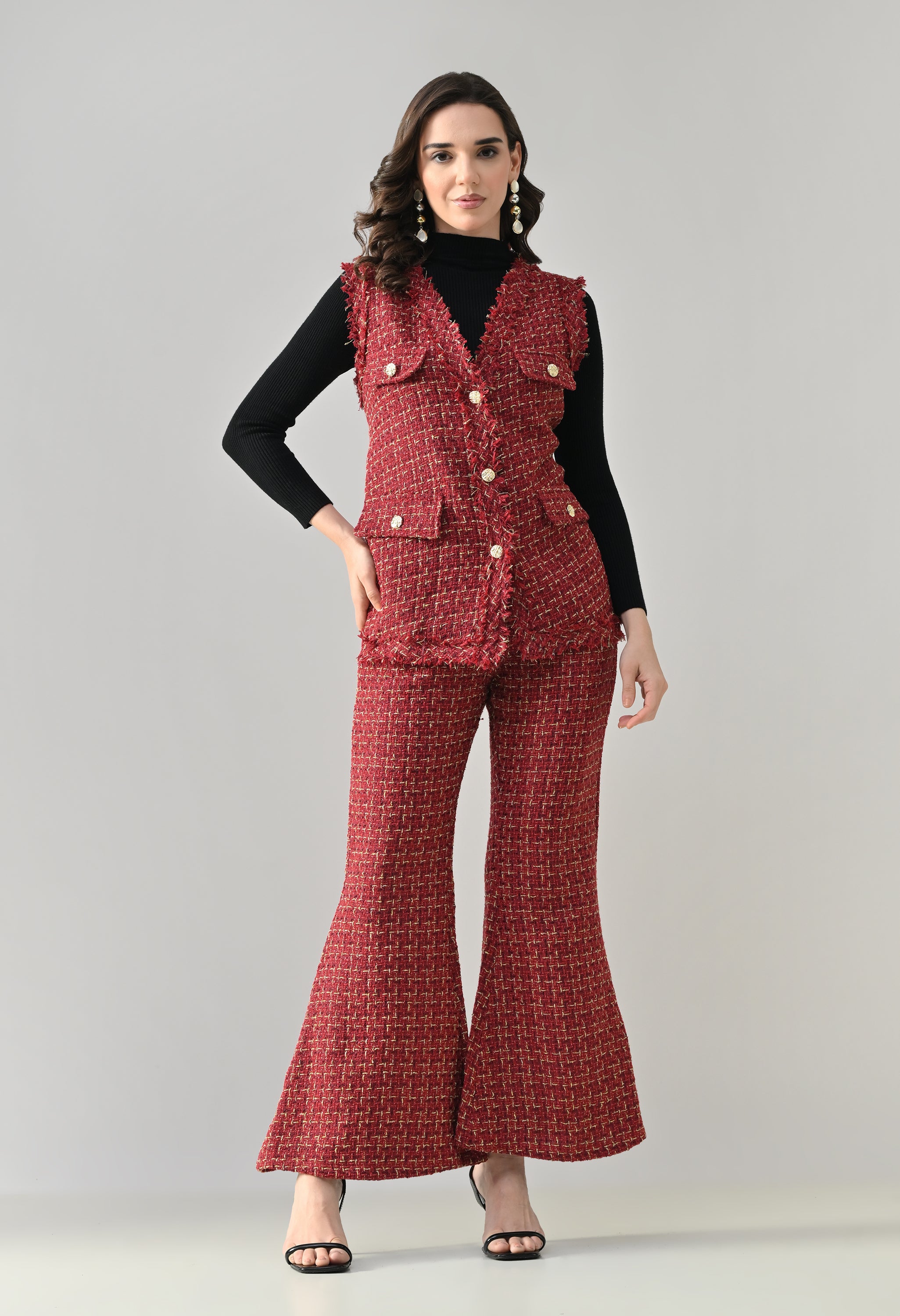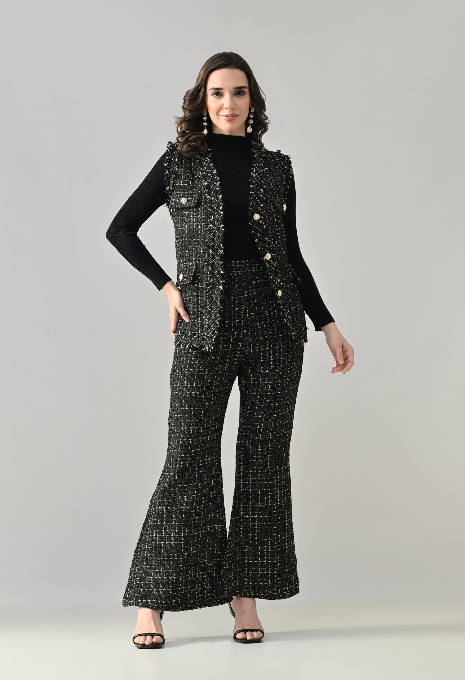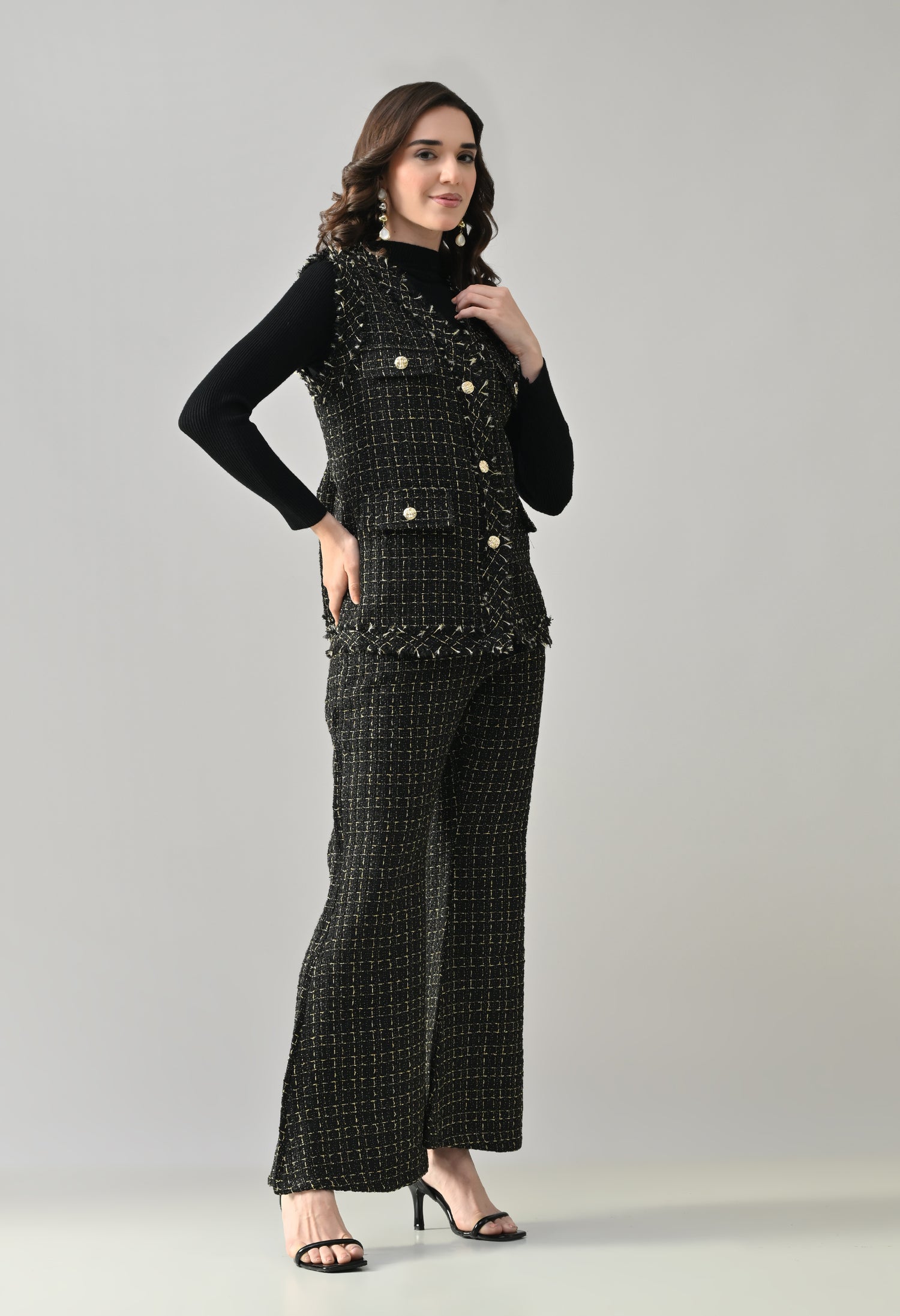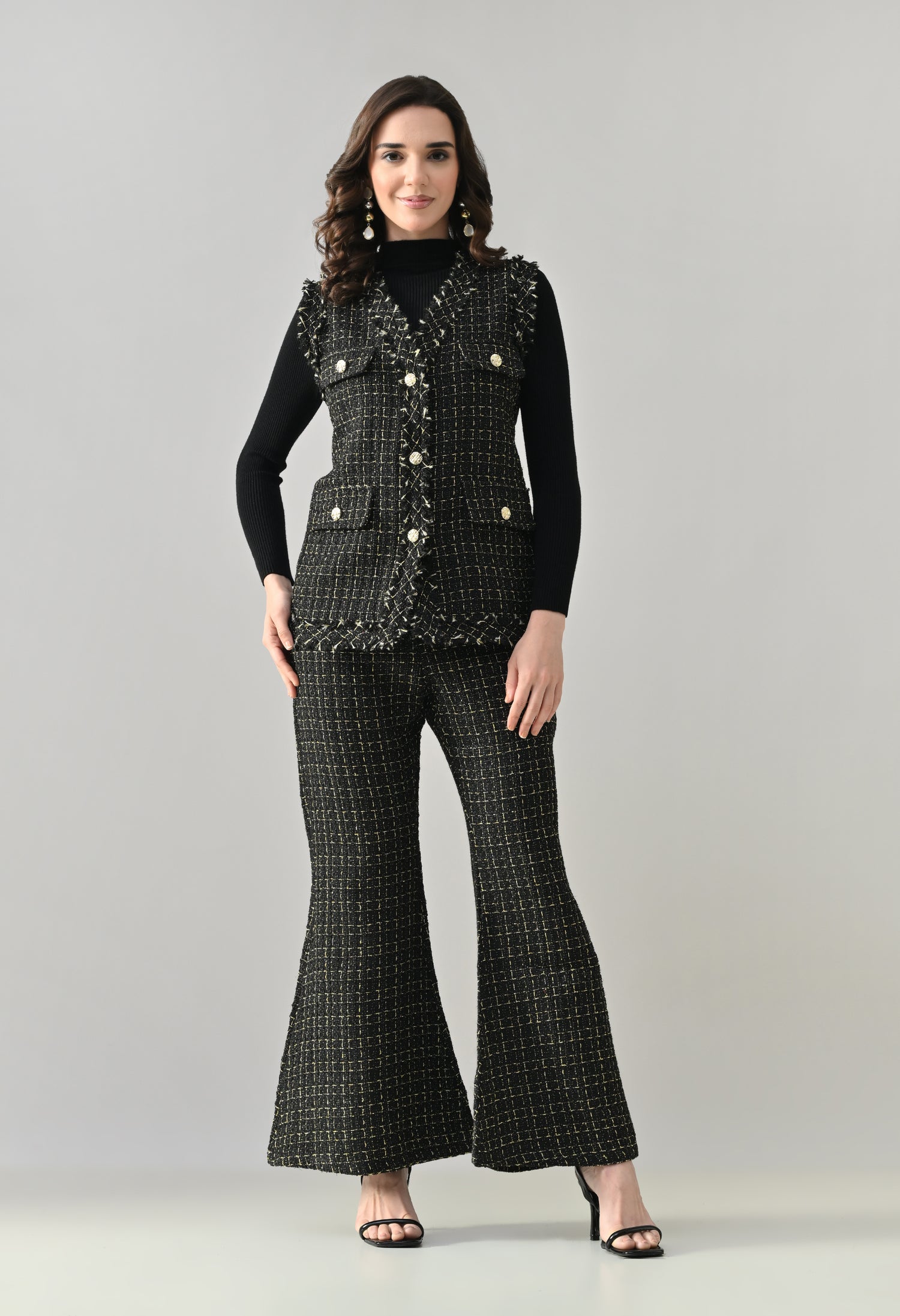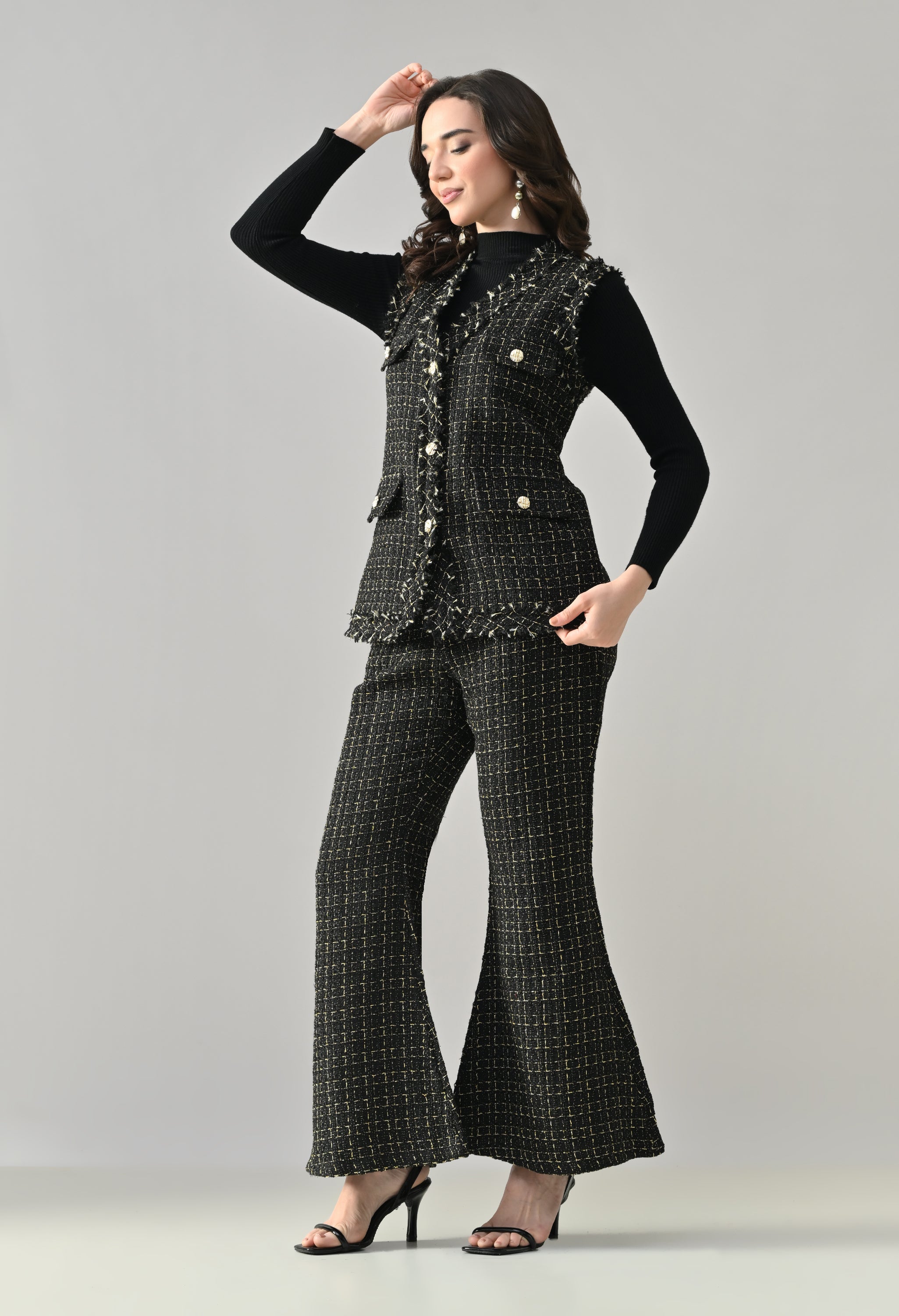 This stylish 3-piece tweed co-ord set delivers a refined yet contemporary look with its structured tailoring and layered styling. The sleeveless tweed vest features a sharp V-neckline and statement gold metallic buttons, enhanced with showy flap pockets for a luxe finish. Paired with matching tweed bell-bottom pants, the set offers a flattering silhouette with practical details for comfort. Completing the look is a stretchable ribbed black inner top with a high neck and full sleeves, adding contrast and versatility—perfect for chic day outings or elevated casual wear.