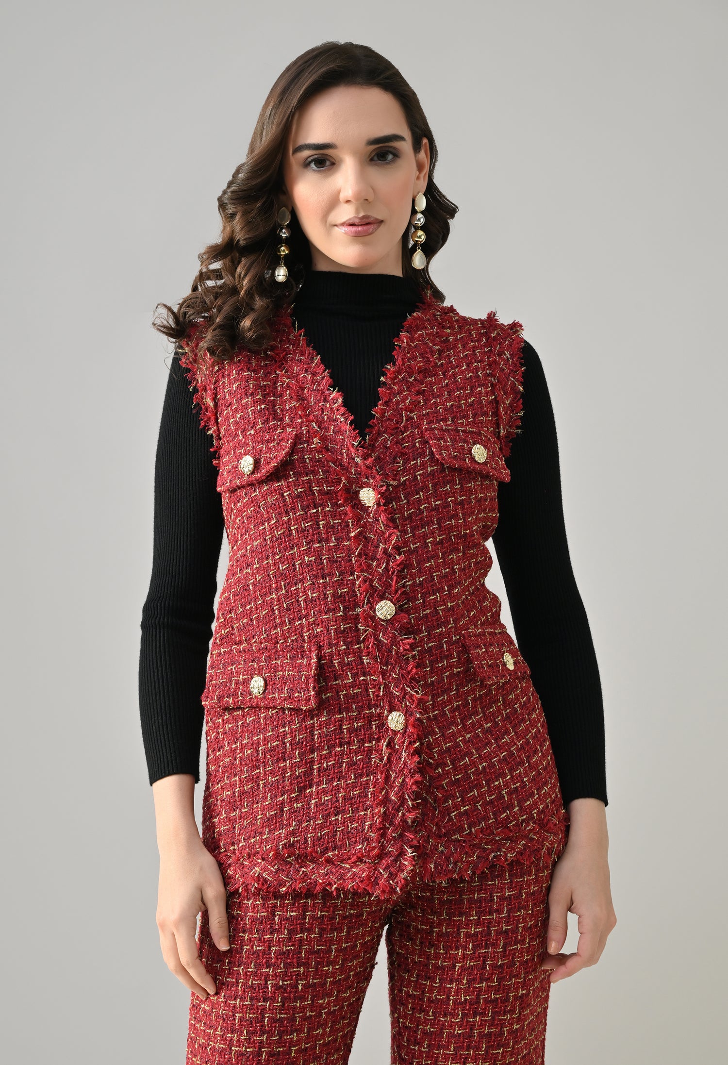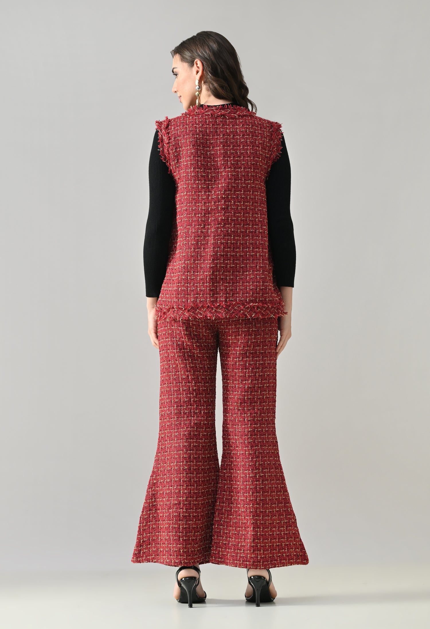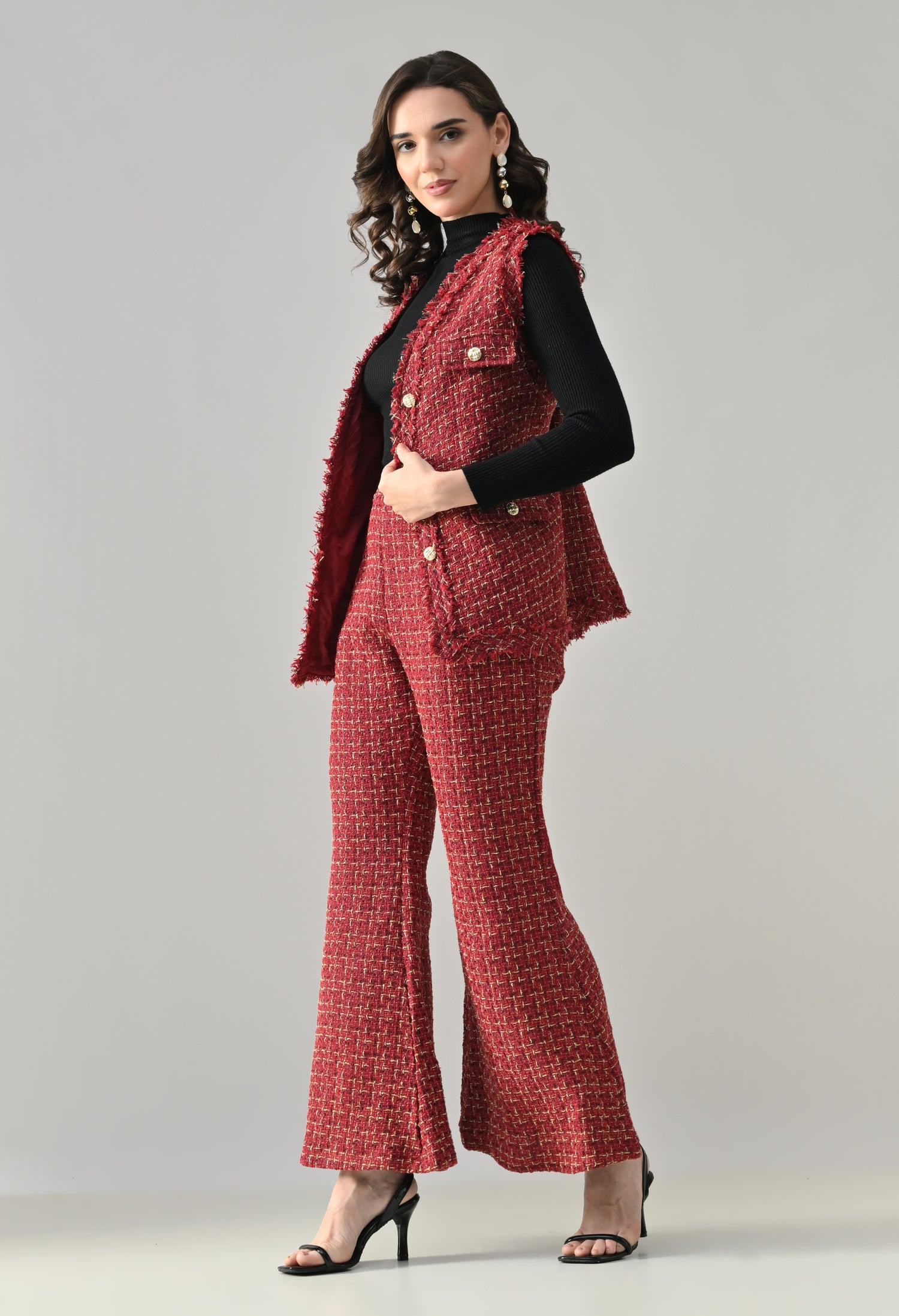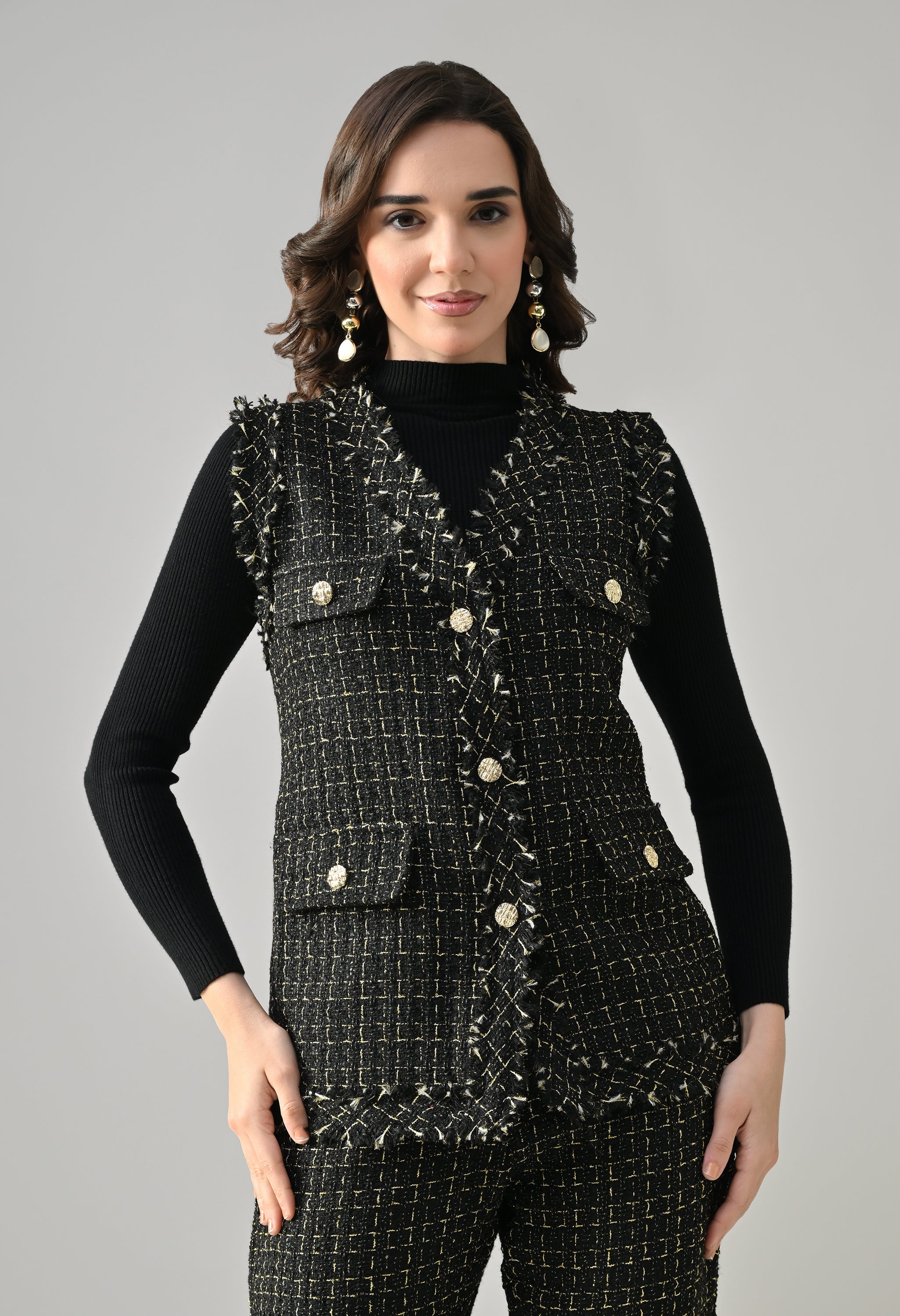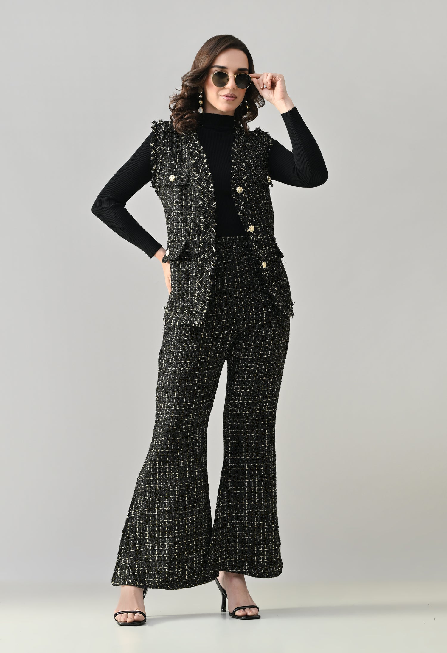 This stylish 3-piece tweed co-ord set delivers a refined yet contemporary look with its structured tailoring and layered styling. The sleeveless tweed vest features a sharp V-neckline and statement gold metallic buttons, enhanced with showy flap pockets for a luxe finish. Paired with matching tweed bell-bottom pants, the set offers a flattering silhouette with practical details for comfort. Completing the look is a stretchable ribbed black inner top with a high neck and full sleeves, adding contrast and versatility—perfect for chic day outings or elevated casual wear.