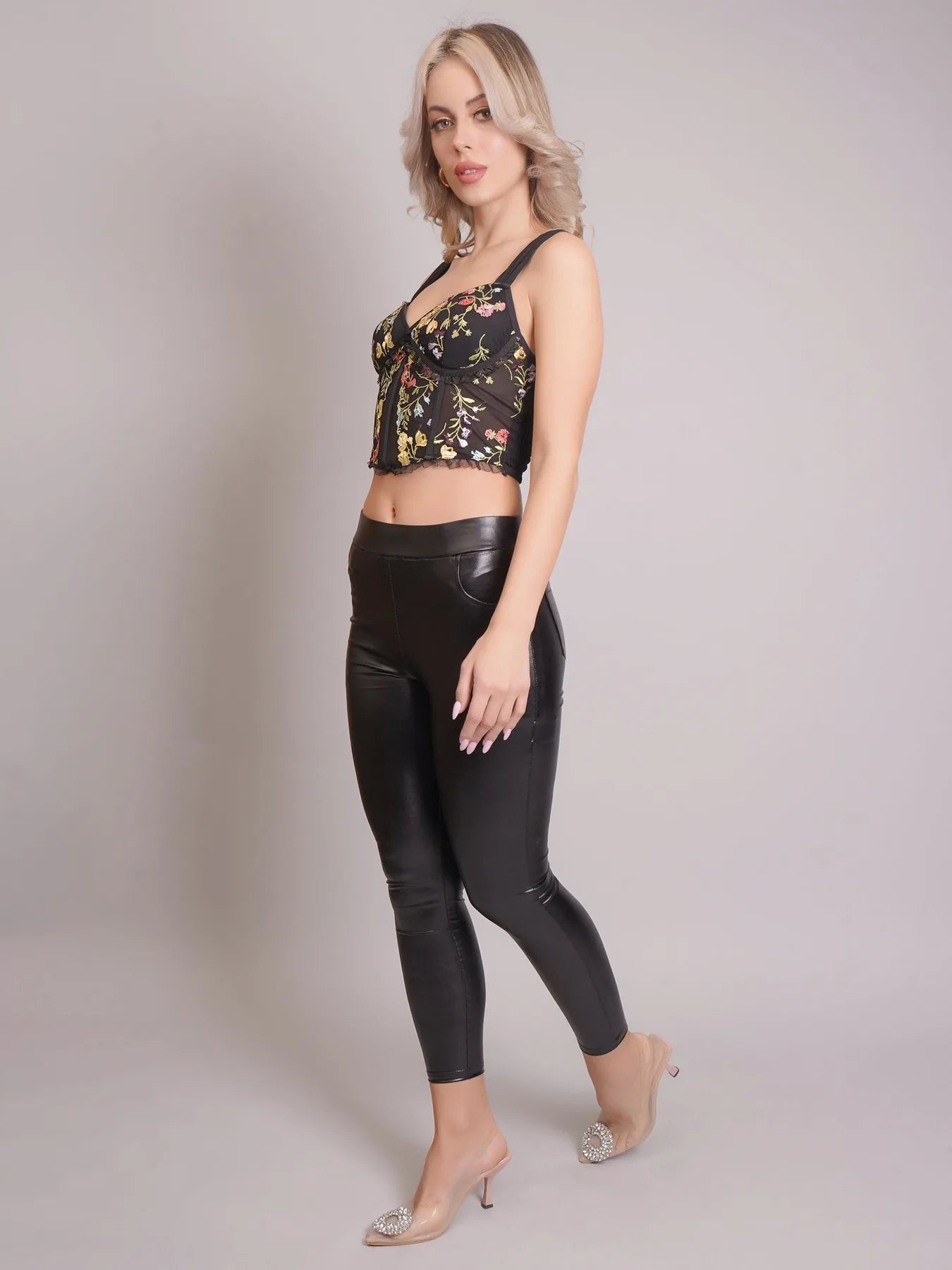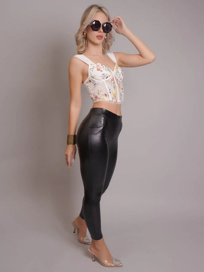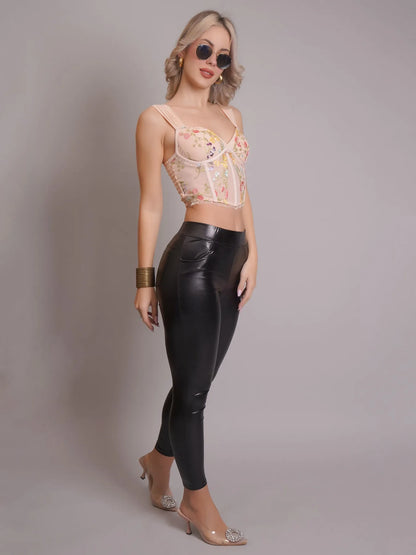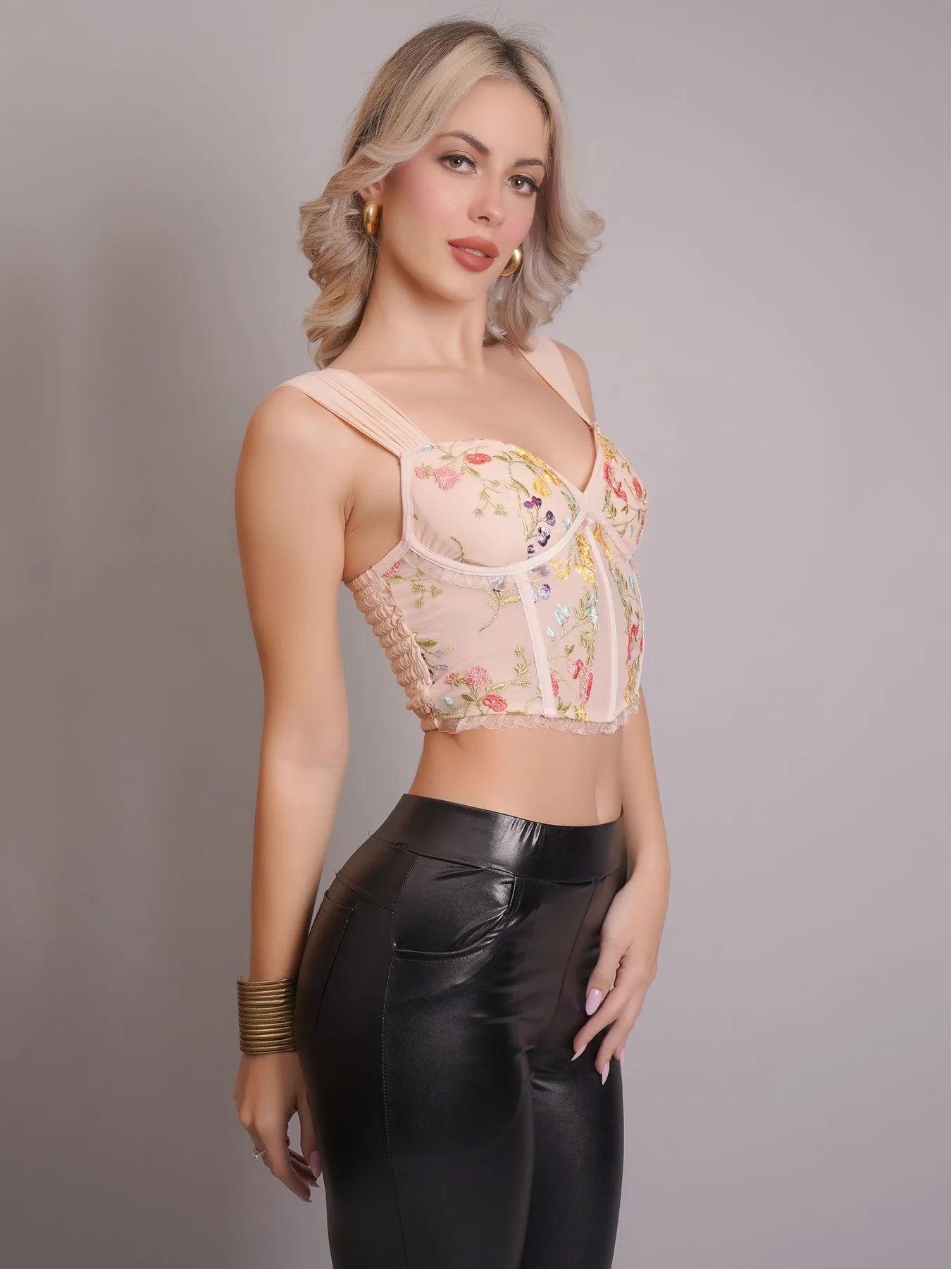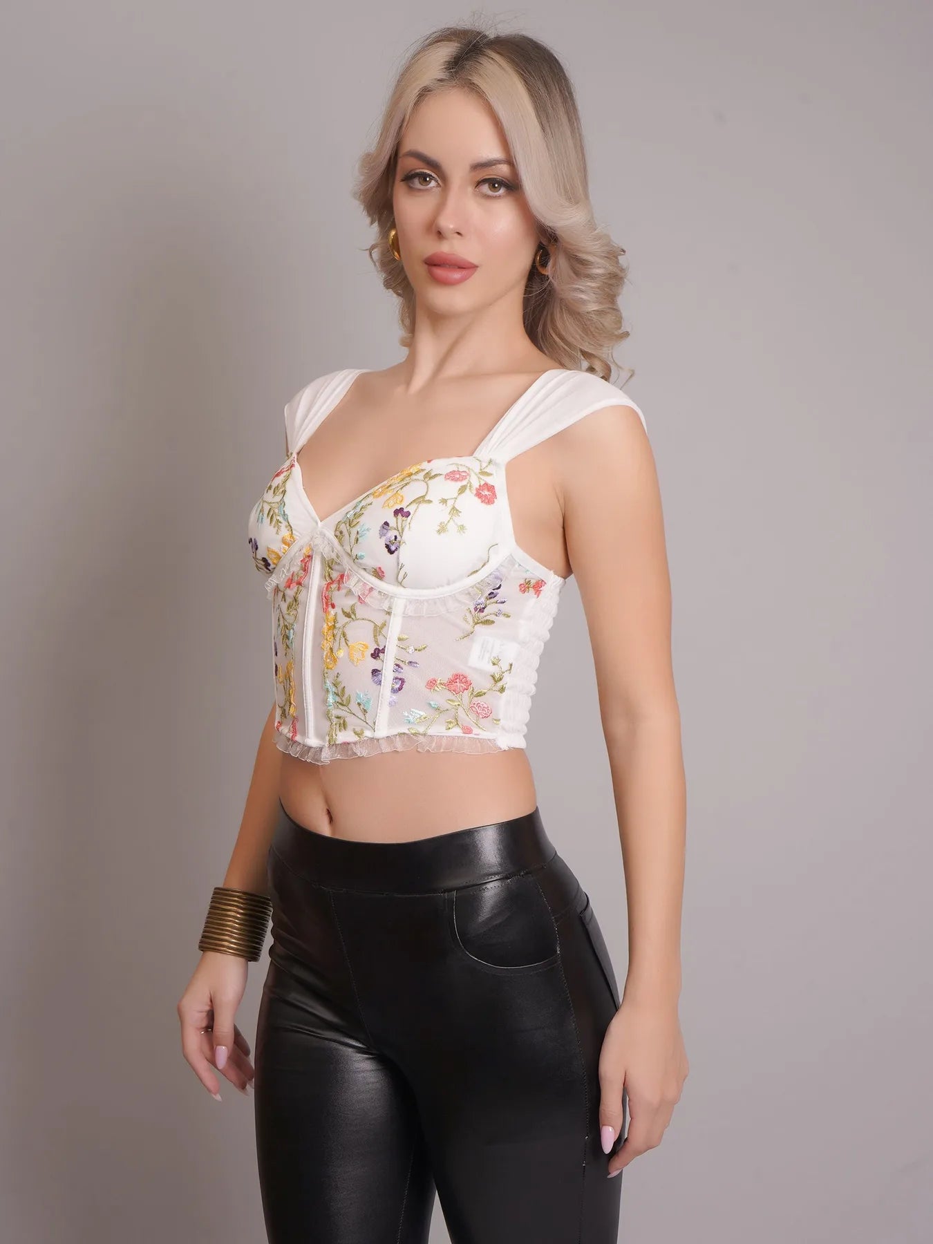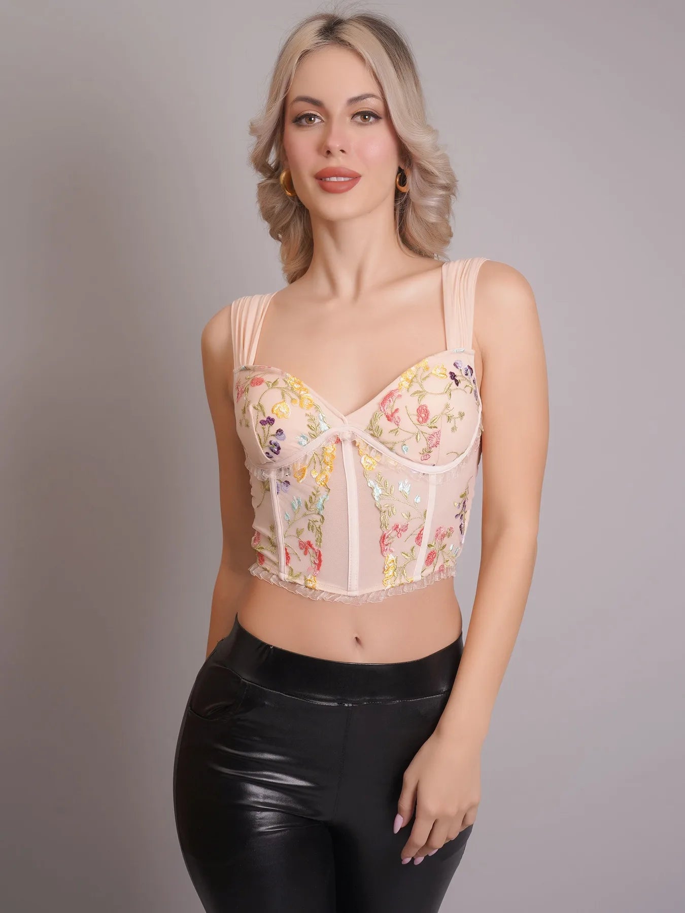 Turn heads with our Floral Embroidery Corset Top—a perfect blend of elegance and chic appeal. Featuring intricate floral embroidery on net fabric, a fitted silhouette with a sleeveless design, and a stretchable back for added comfort. Ideal for spring, summer, or evening wear!