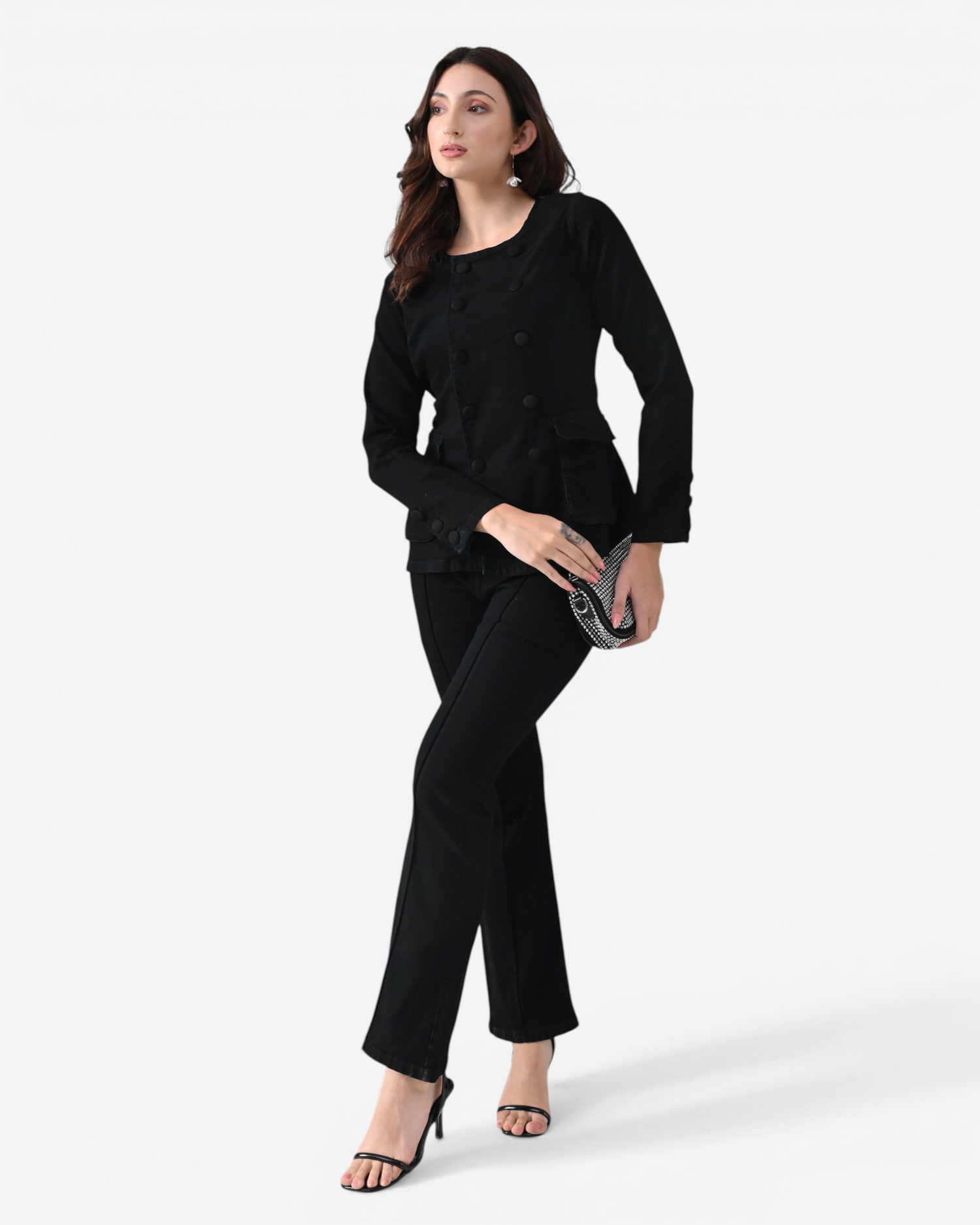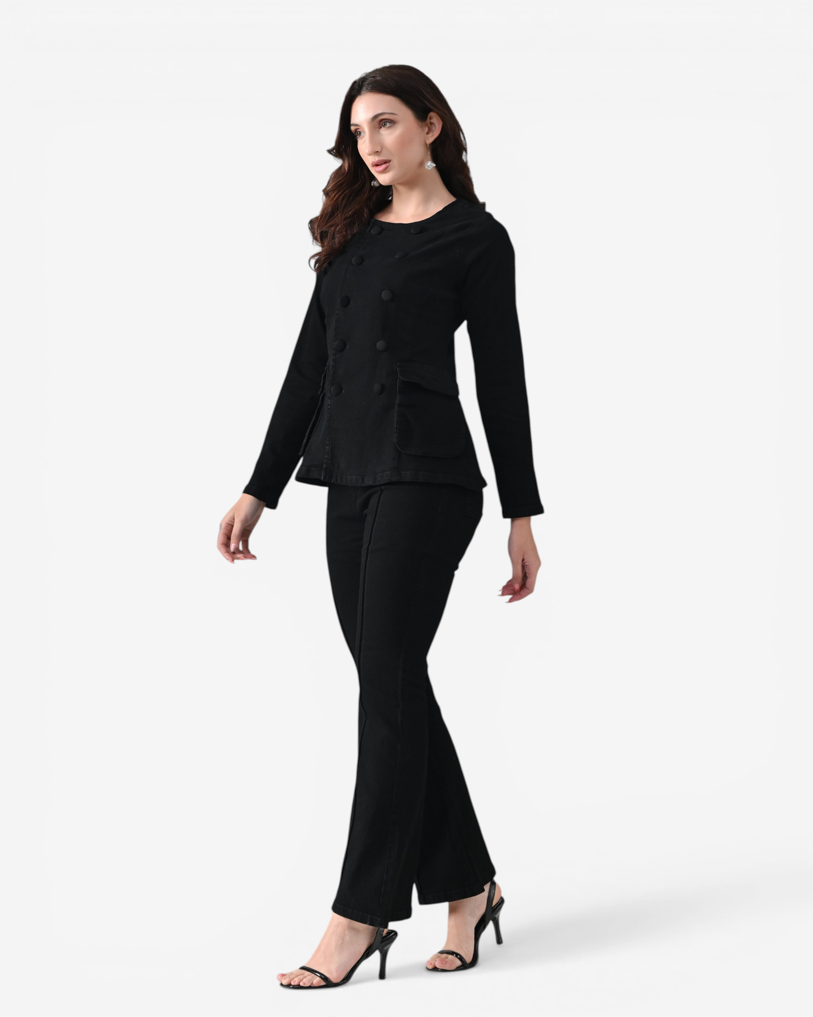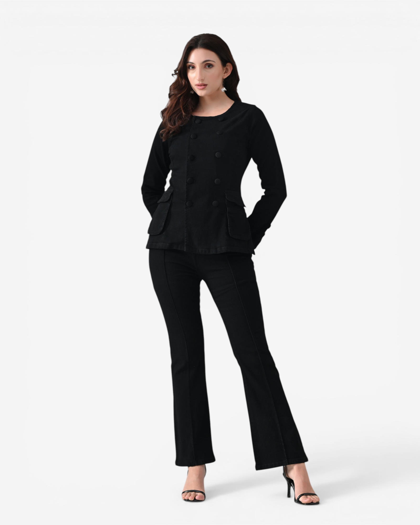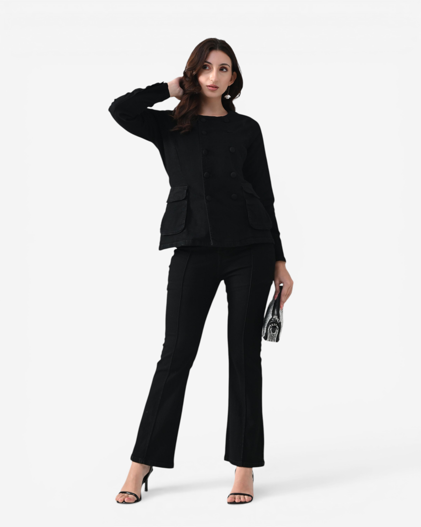 This co-ord set blends sharp tailoring with a timeless, structured silhouette. The jacket features a round neckline with a double-breasted button design that adds a refined, statement look, while the tailored fit enhances the waist. Functional flap pockets and button-detailed cuffs elevate its utility appeal. Paired with matching straight-to-slightly-flared trousers featuring front seam detailing, the set creates a sleek, elongated profile. Ideal for power dressing, evening outings, or elevated casual styling.