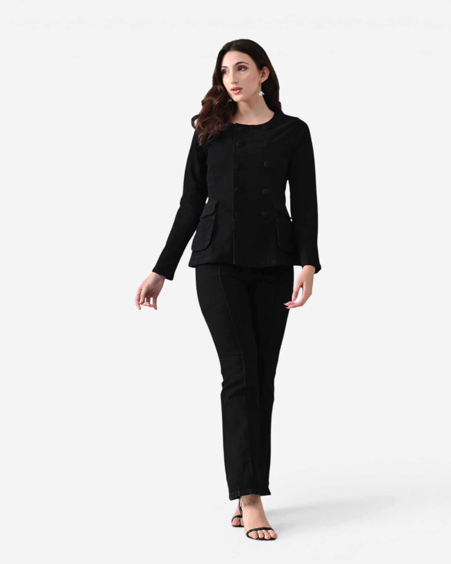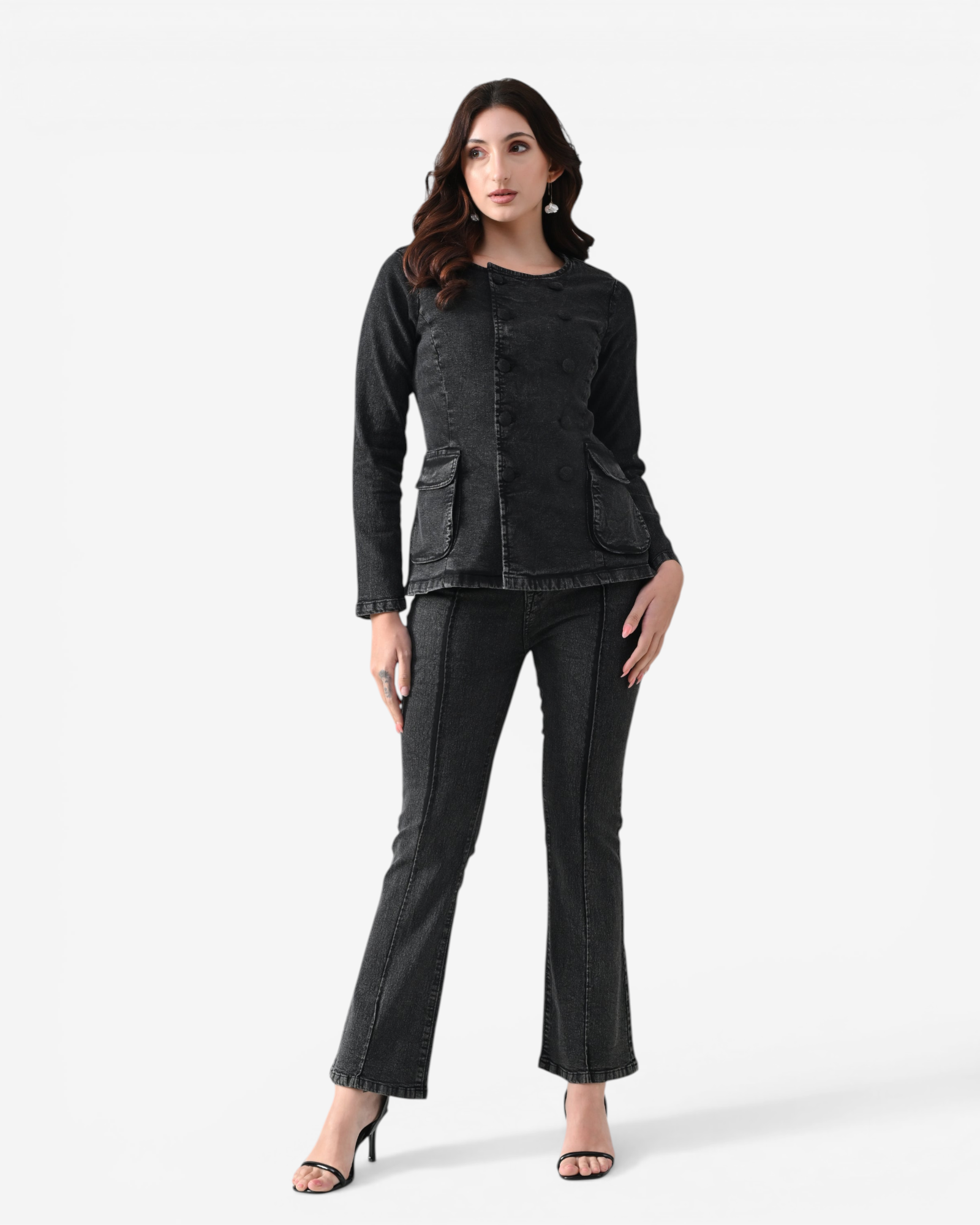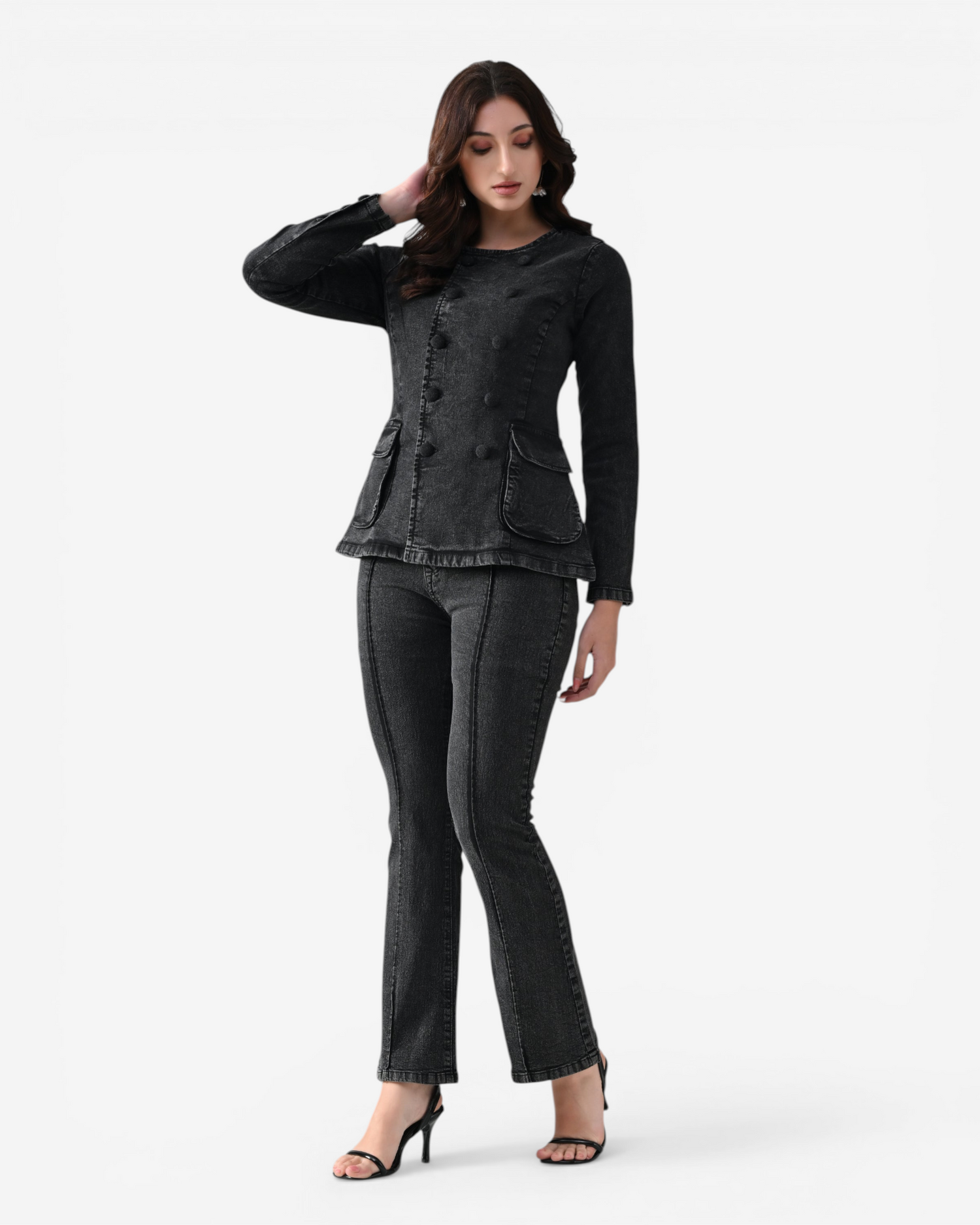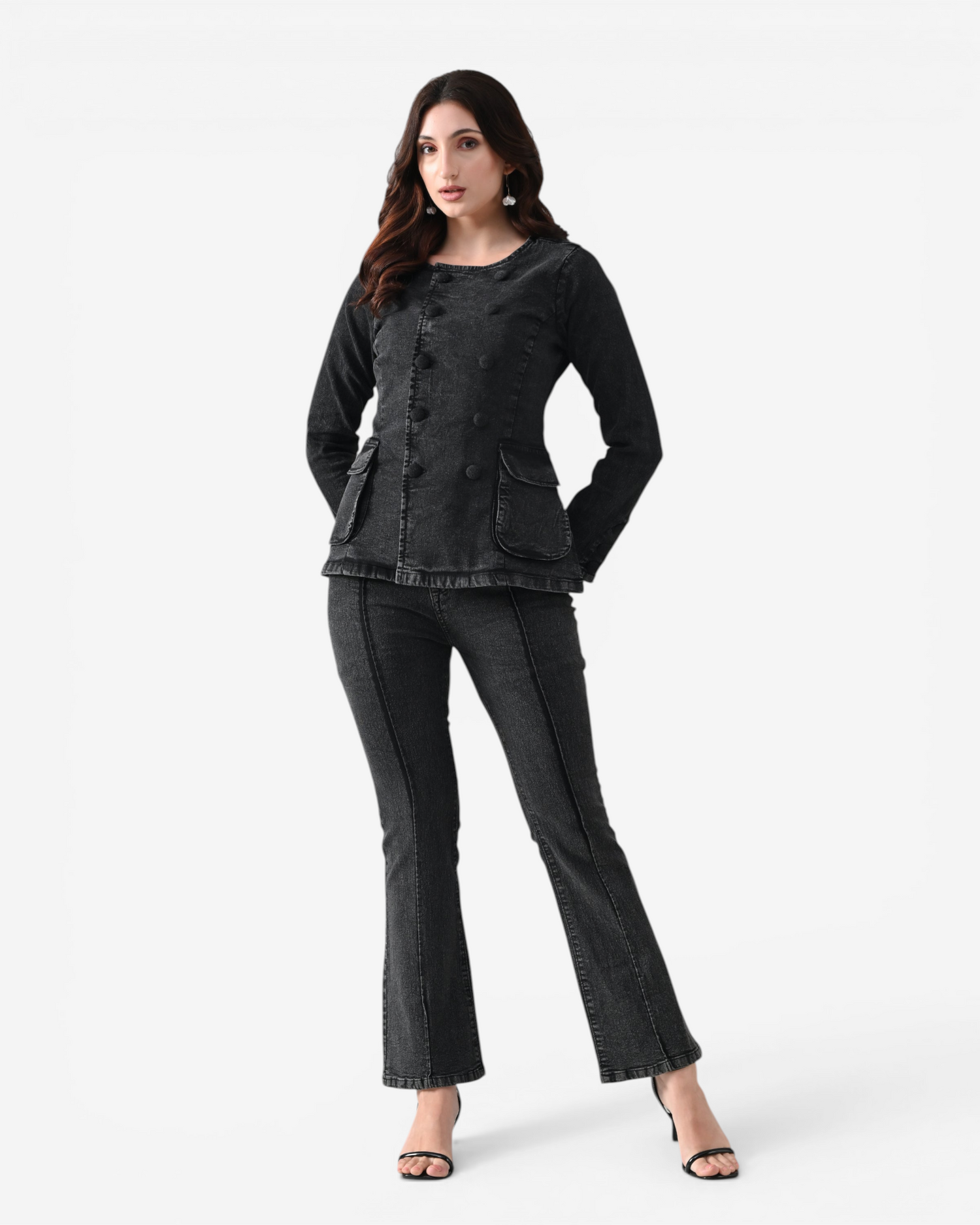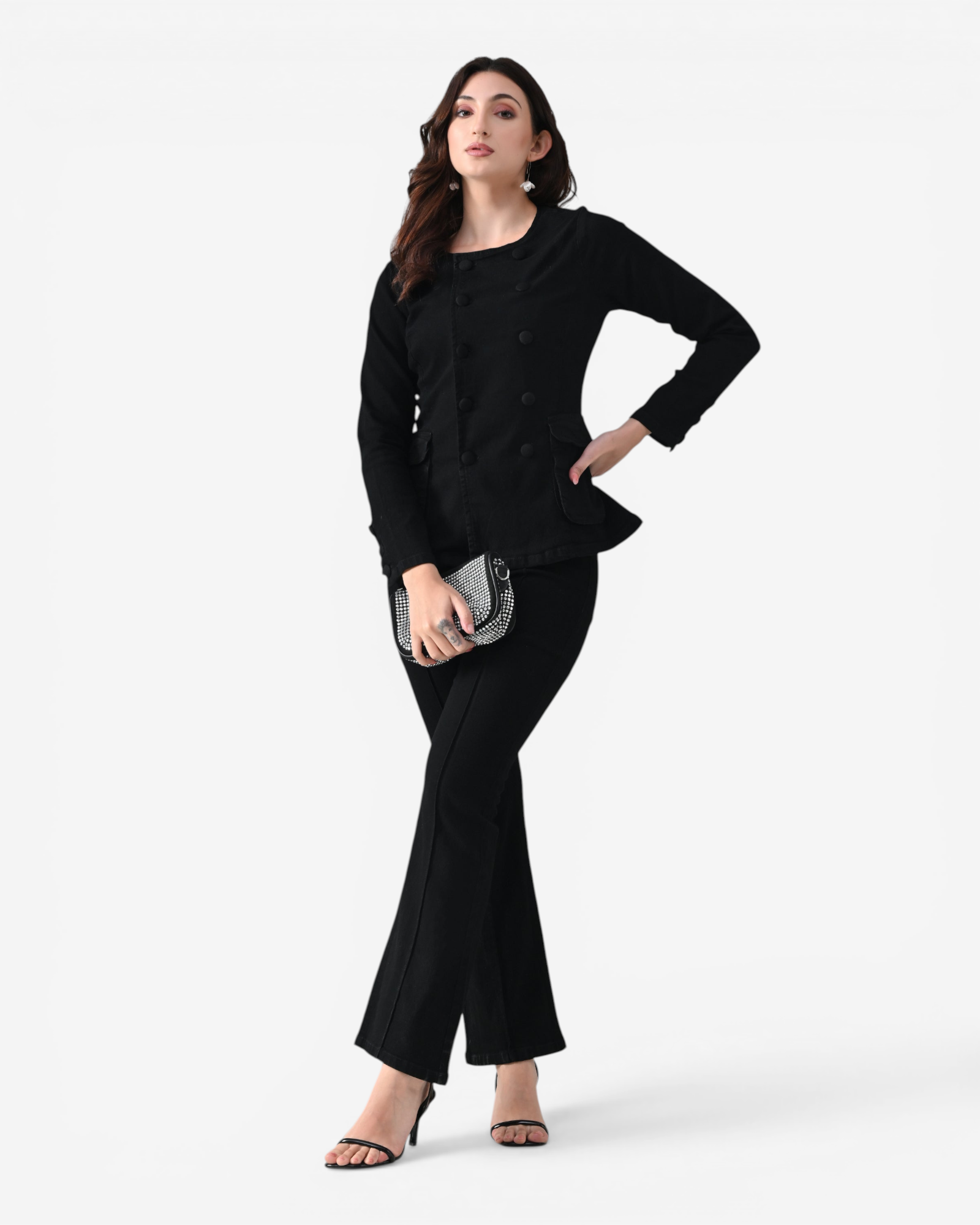 This co-ord set blends sharp tailoring with a timeless, structured silhouette. The jacket features a round neckline with a double-breasted button design that adds a refined, statement look, while the tailored fit enhances the waist. Functional flap pockets and button-detailed cuffs elevate its utility appeal. Paired with matching straight-to-slightly-flared trousers featuring front seam detailing, the set creates a sleek, elongated profile. Ideal for power dressing, evening outings, or elevated casual styling.