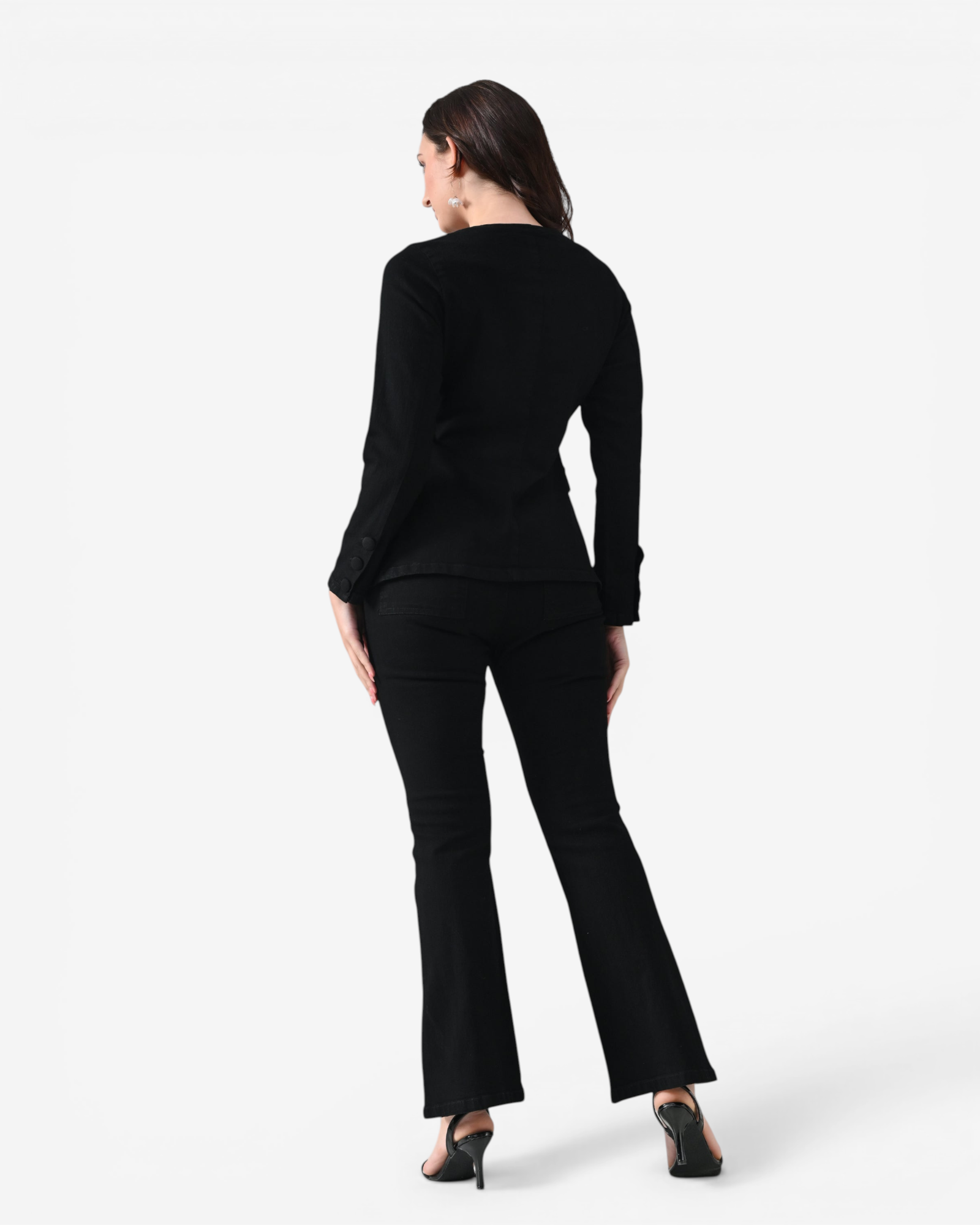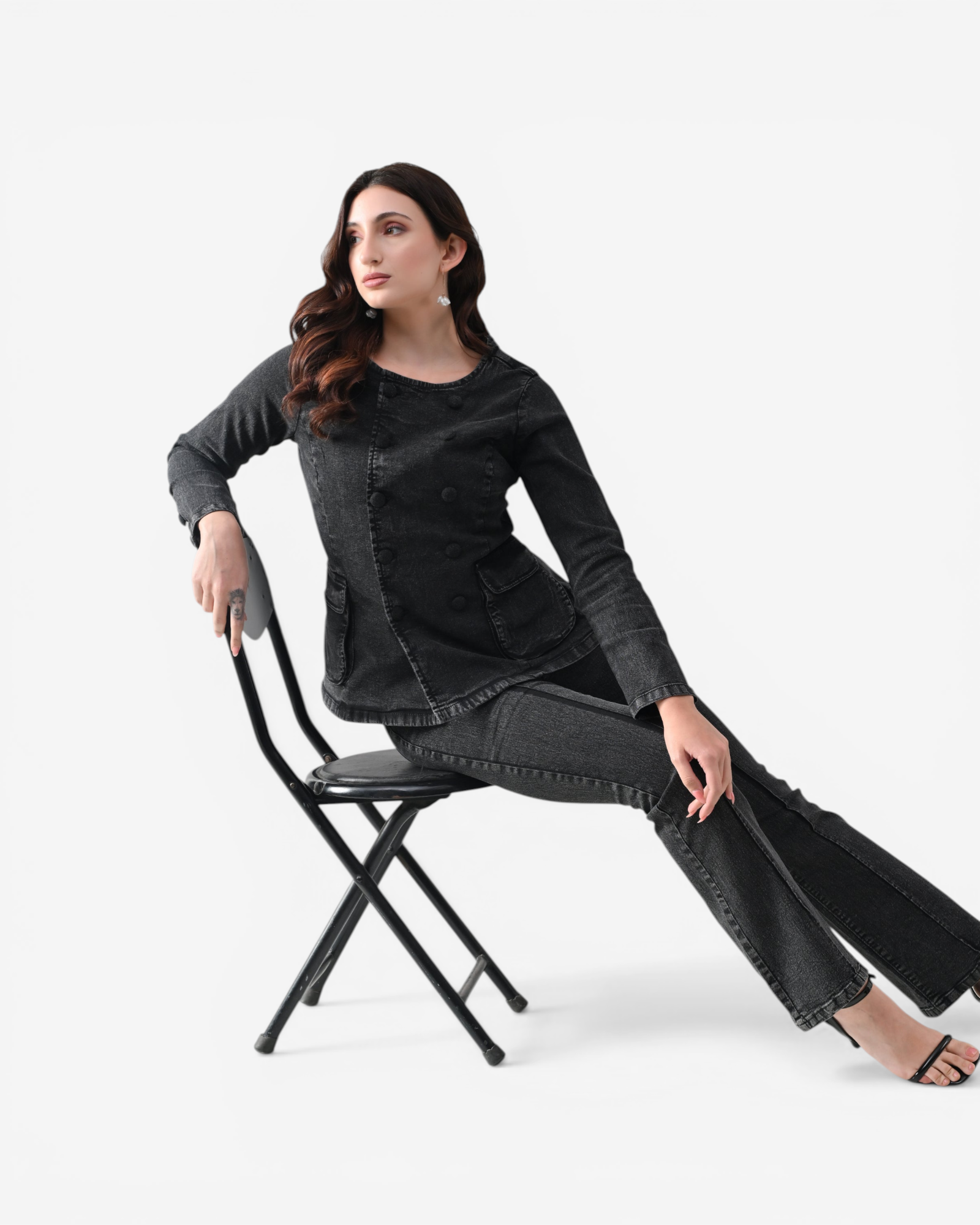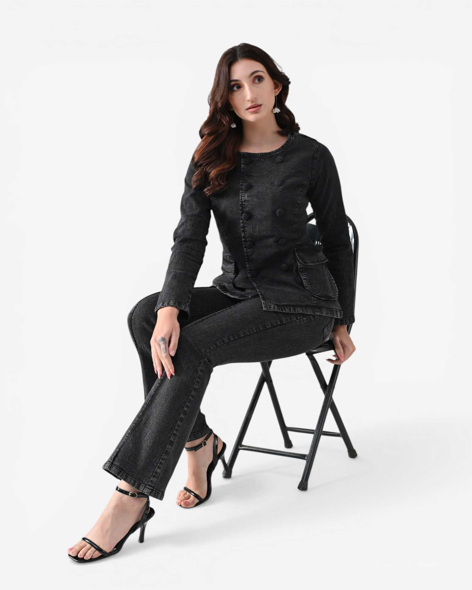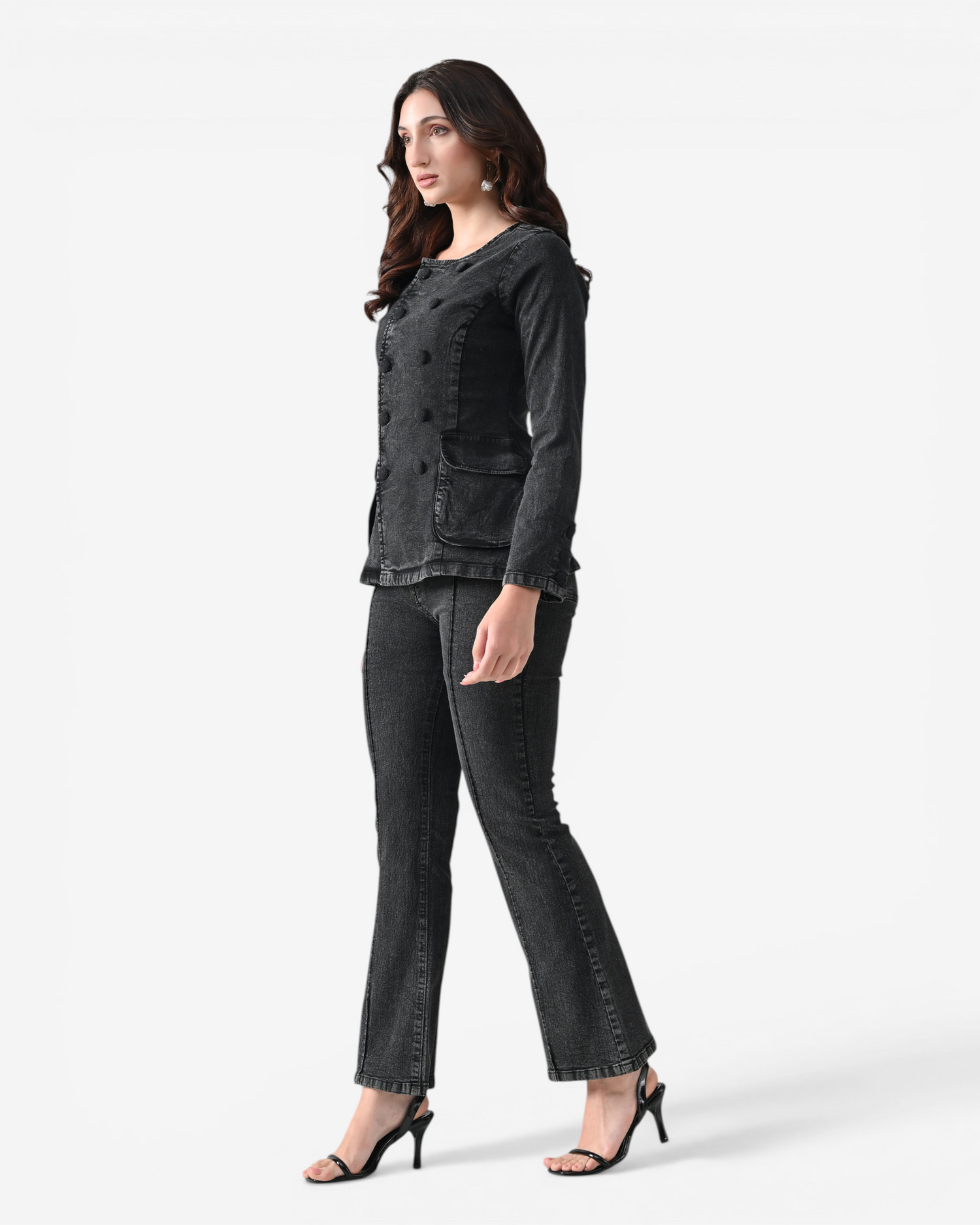 This co-ord set blends sharp tailoring with a timeless, structured silhouette. The jacket features a round neckline with a double-breasted button design that adds a refined, statement look, while the tailored fit enhances the waist. Functional flap pockets and button-detailed cuffs elevate its utility appeal. Paired with matching straight-to-slightly-flared trousers featuring front seam detailing, the set creates a sleek, elongated profile. Ideal for power dressing, evening outings, or elevated casual styling.