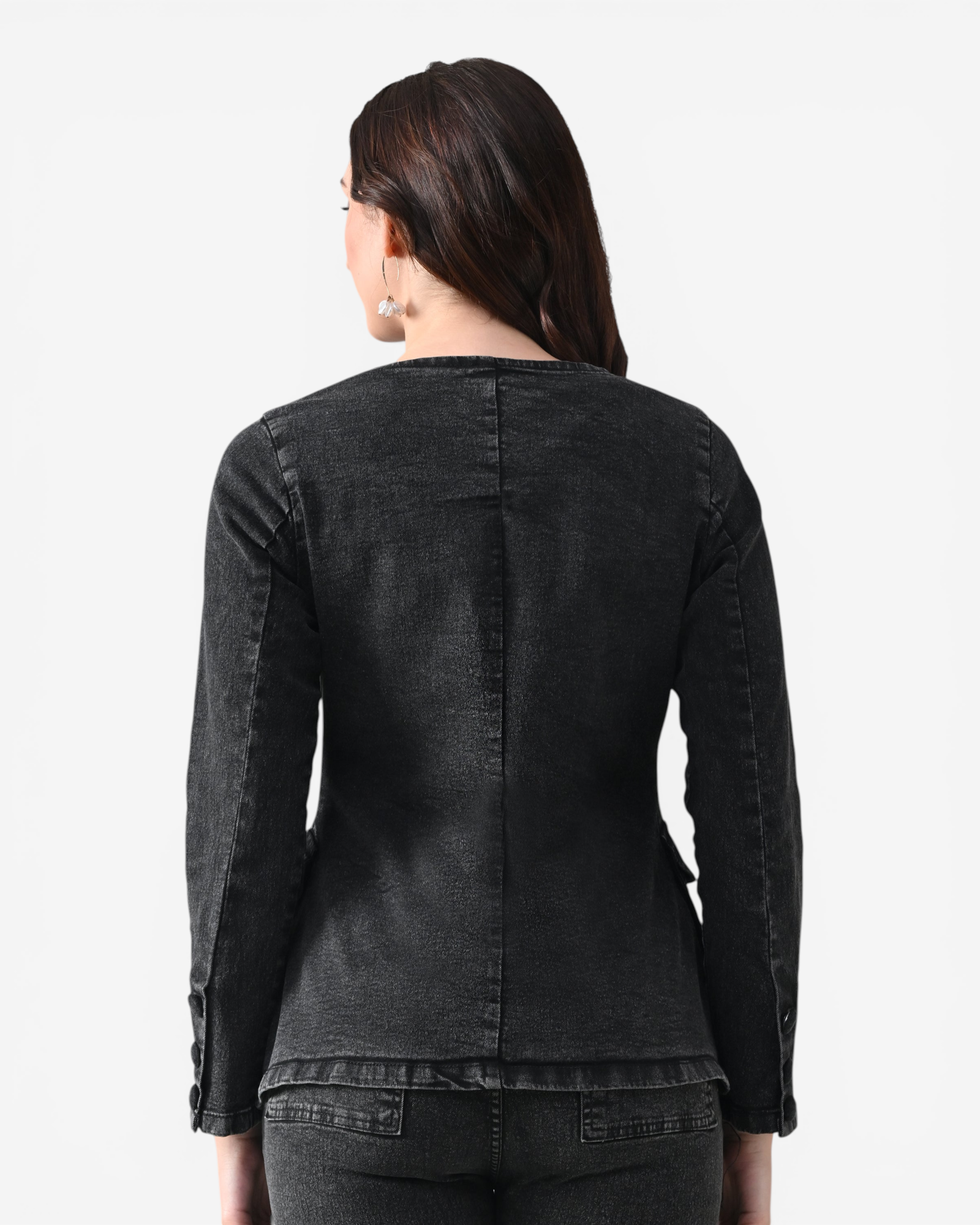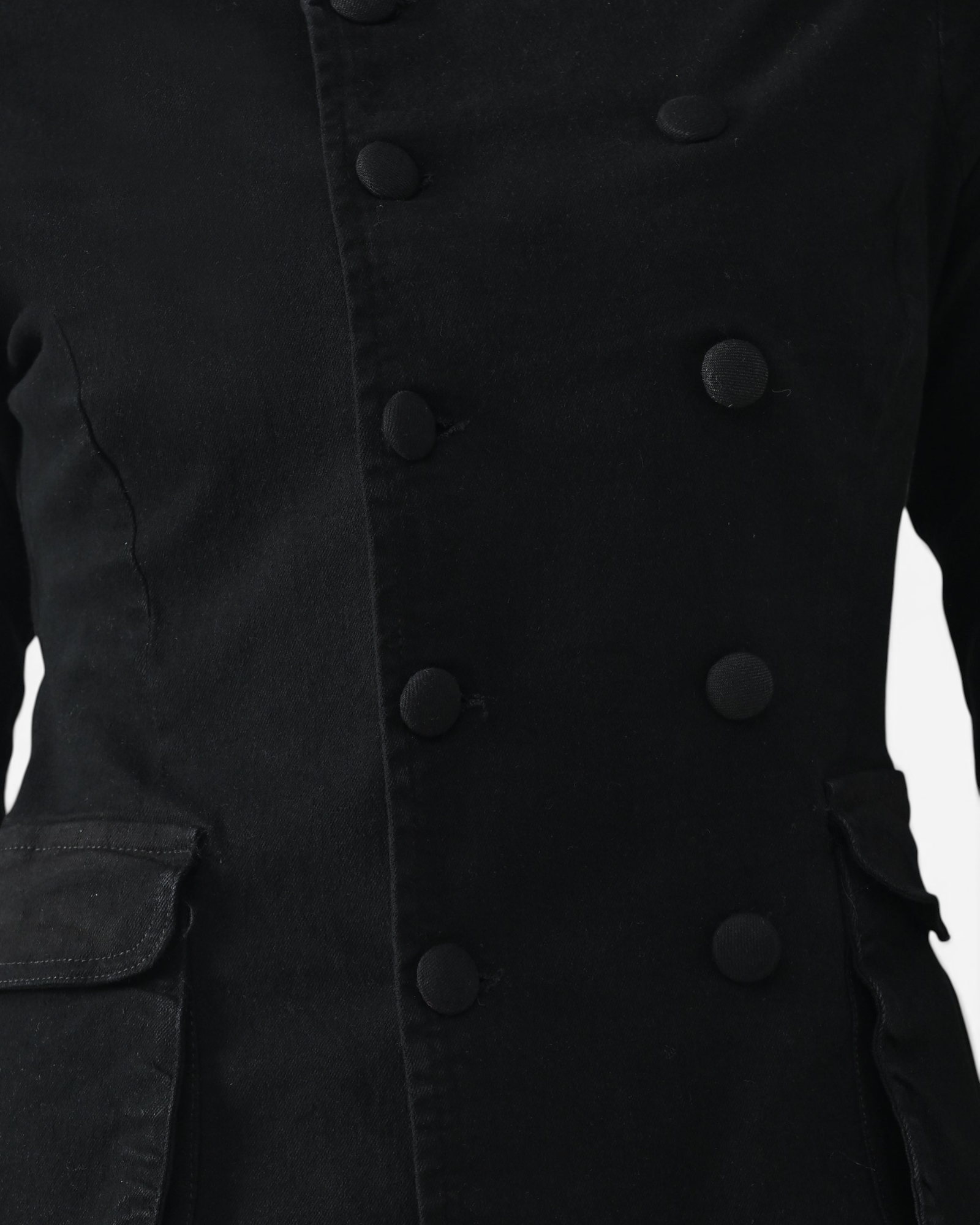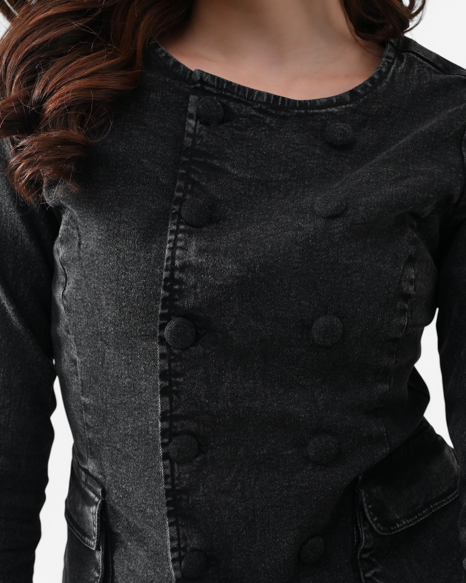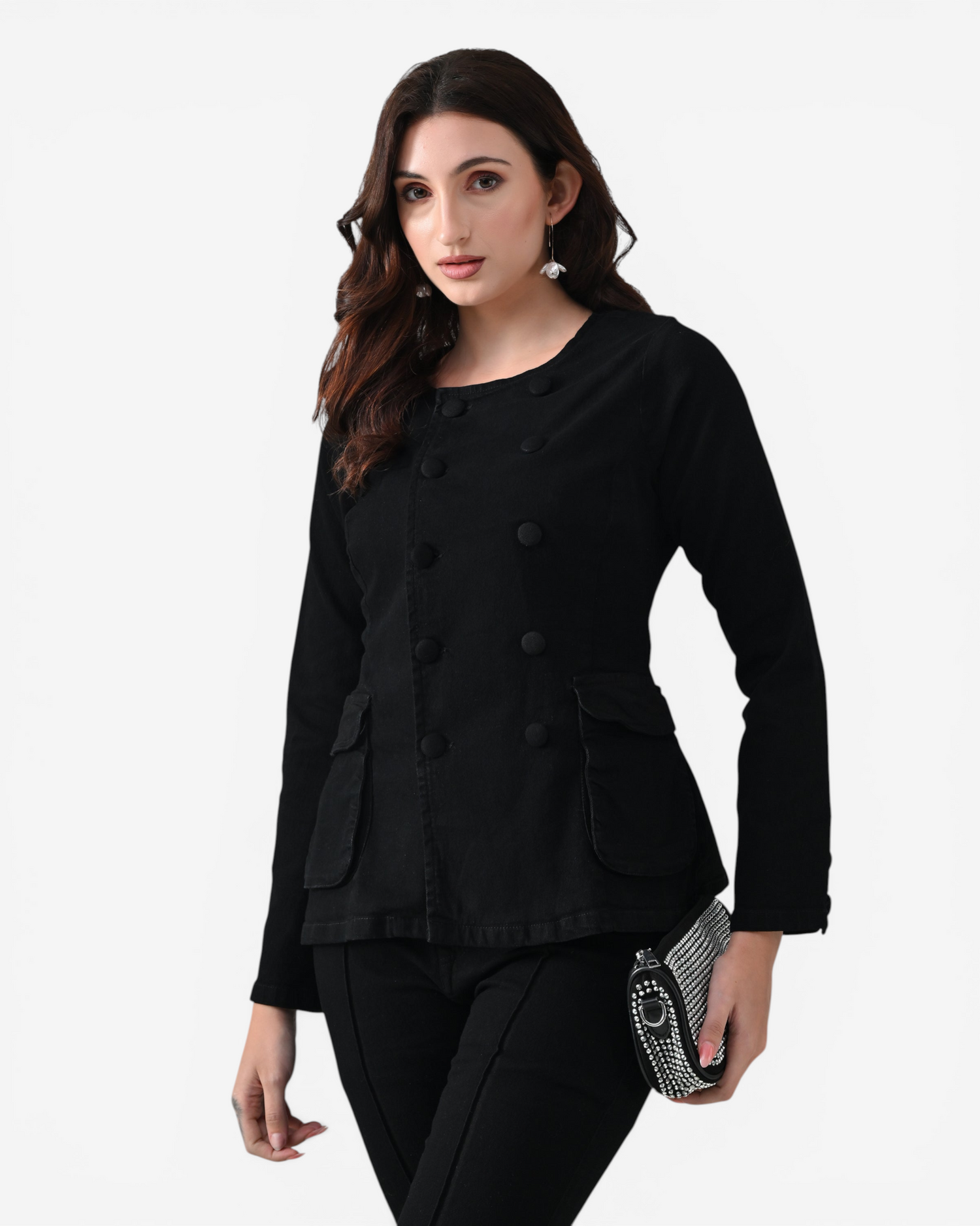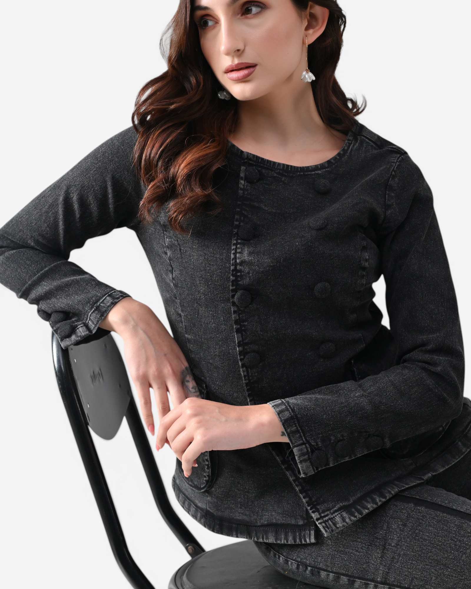 This co-ord set blends sharp tailoring with a timeless, structured silhouette. The jacket features a round neckline with a double-breasted button design that adds a refined, statement look, while the tailored fit enhances the waist. Functional flap pockets and button-detailed cuffs elevate its utility appeal. Paired with matching straight-to-slightly-flared trousers featuring front seam detailing, the set creates a sleek, elongated profile. Ideal for power dressing, evening outings, or elevated casual styling.
