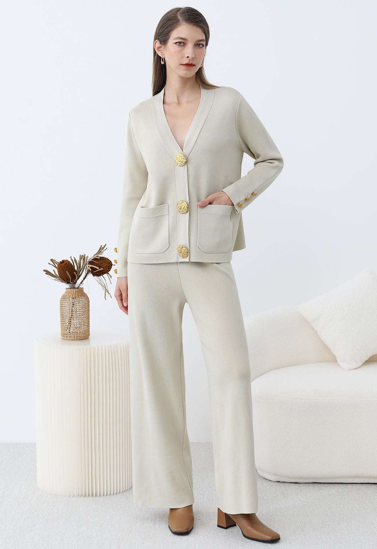 Elevate your winter wardrobe with this Golden Button Patch Pocket Knit Cardigan and Pants Set. The cardigan’s golden buttons and patch pockets evoke timeless elegance, while the soft knit fabric ensures effortless comfort. Paired with coordinating pants, this set blends classic charm with modern ease, making it a versatile choice for refined, everyday style.