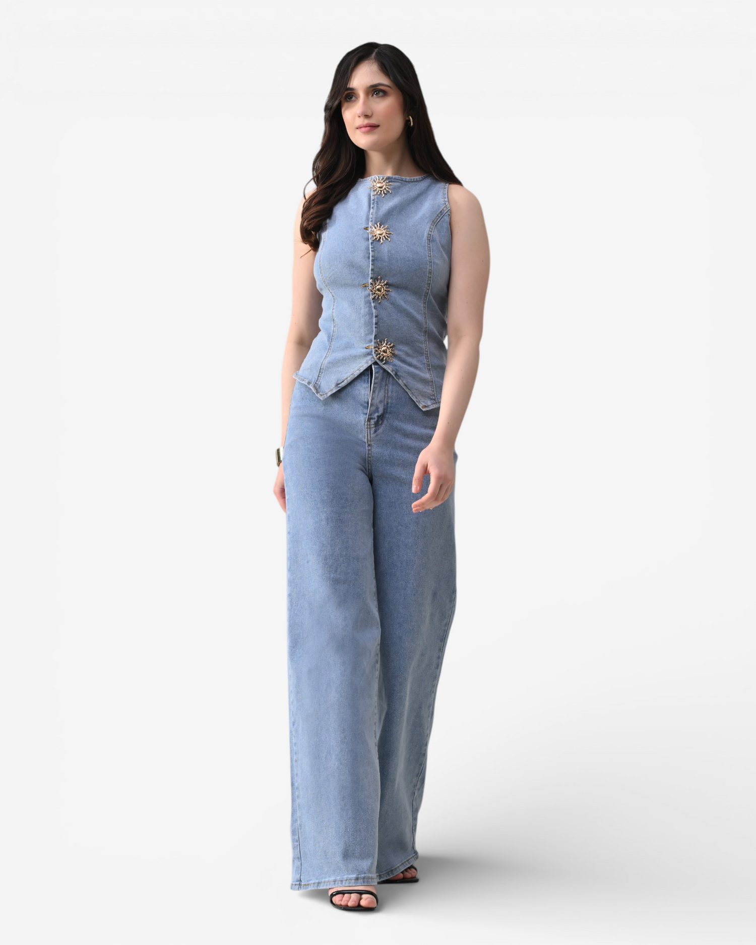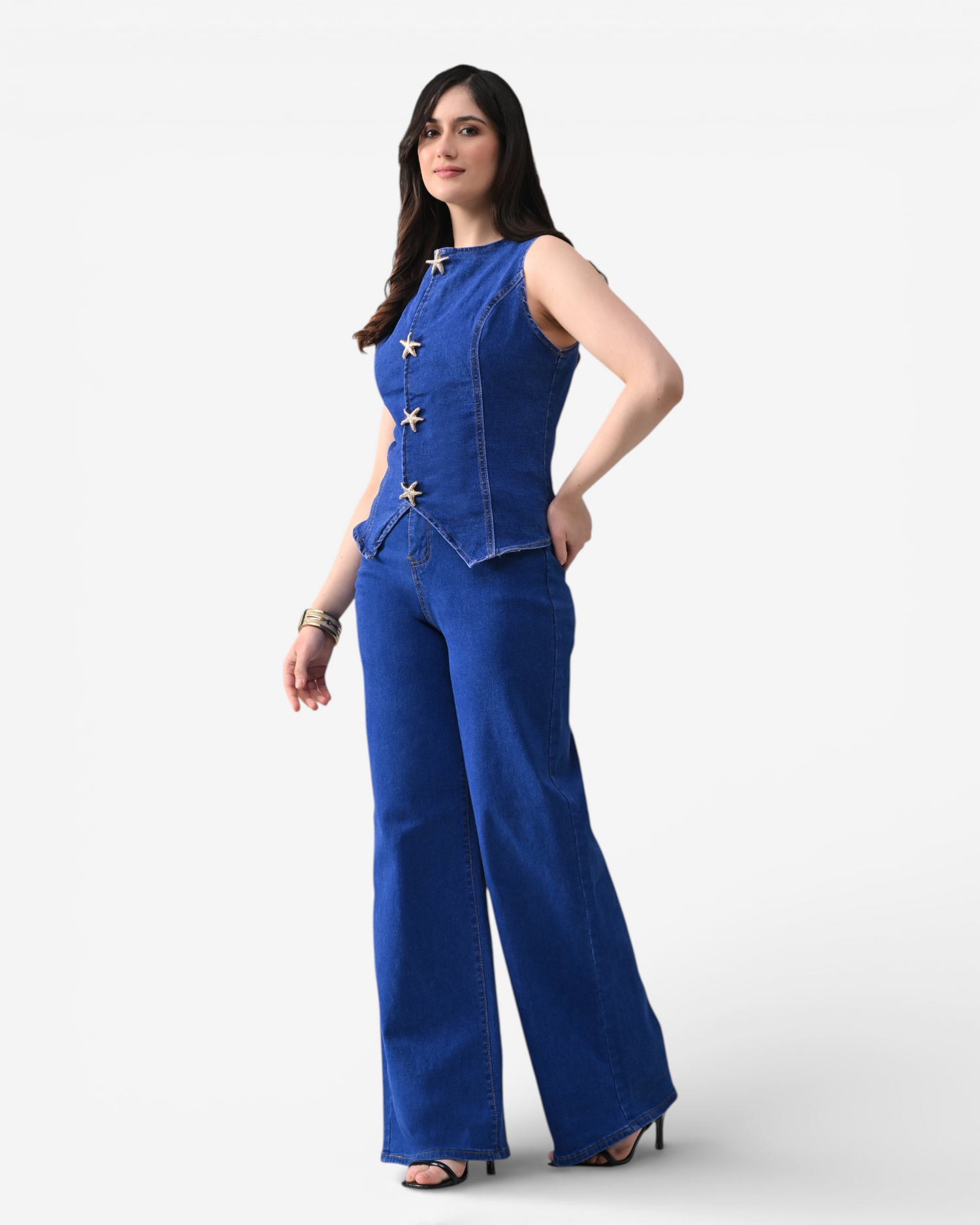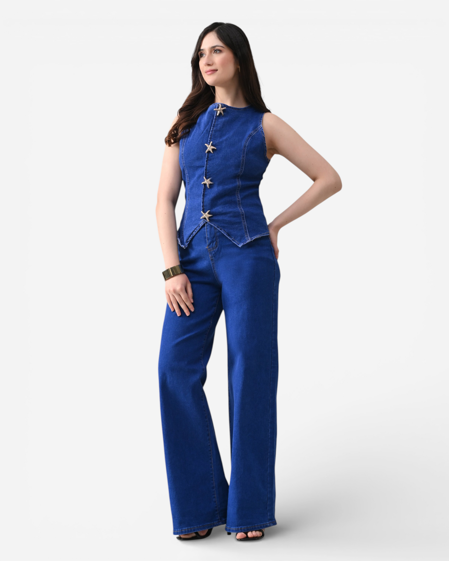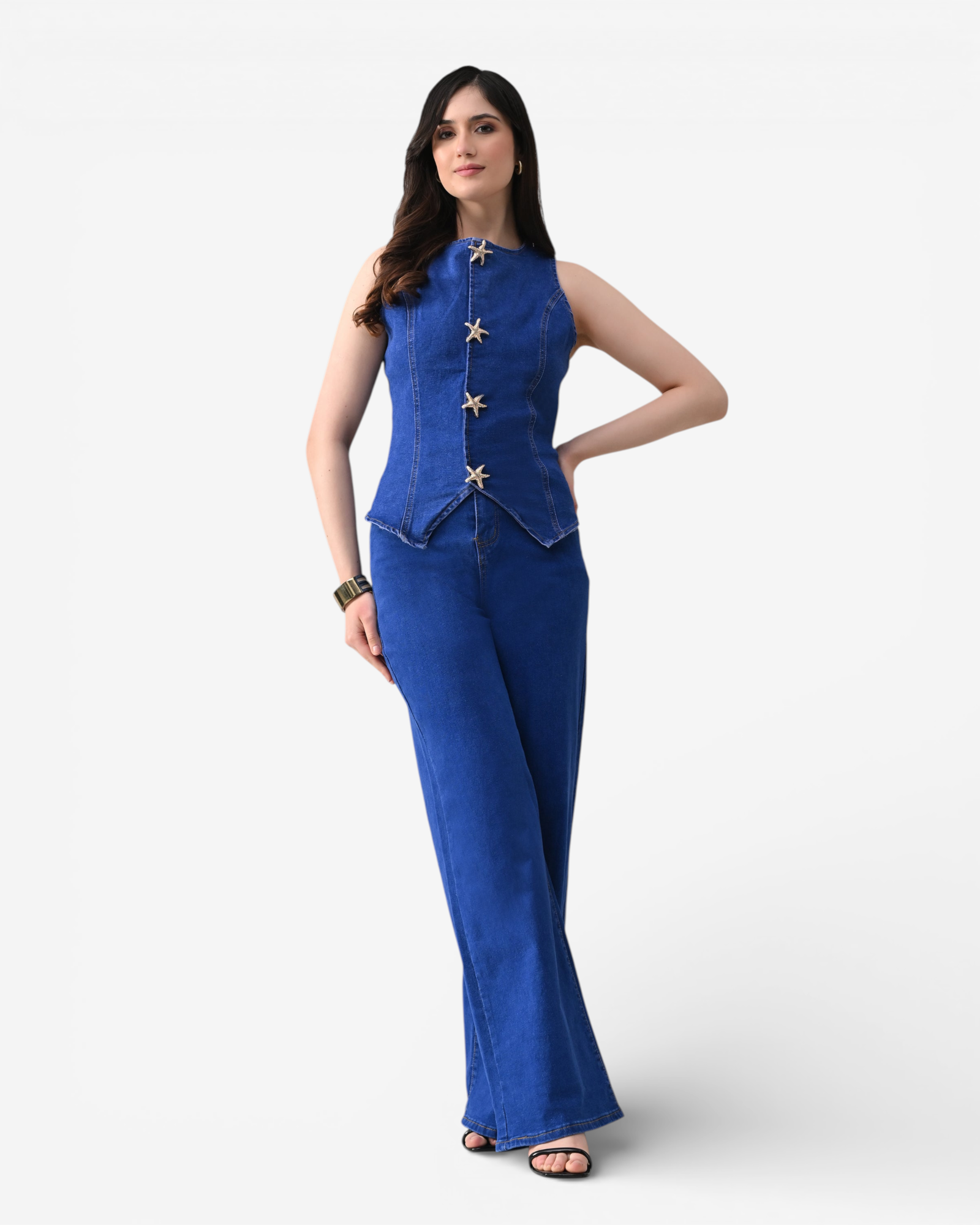 This two-piece denim set features a structured sleeveless top paired with wide-leg high-rise jeans. The top is tailored with curved panel detailing that enhances shape and gives a contoured fit. The front is highlighted with statement star-shaped button closures and a center opening, while the hem is cut in a subtle V-shape for a sharp finish.