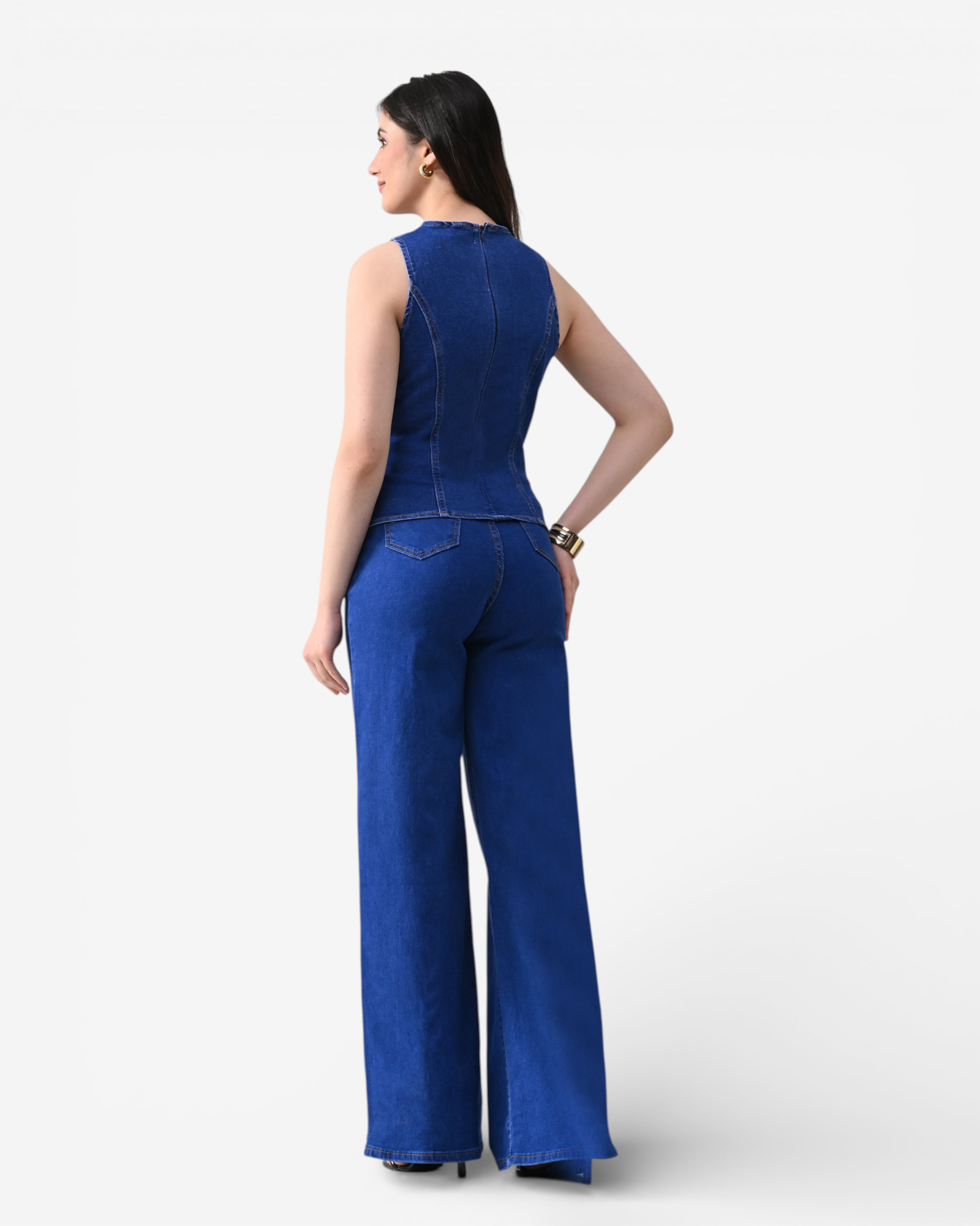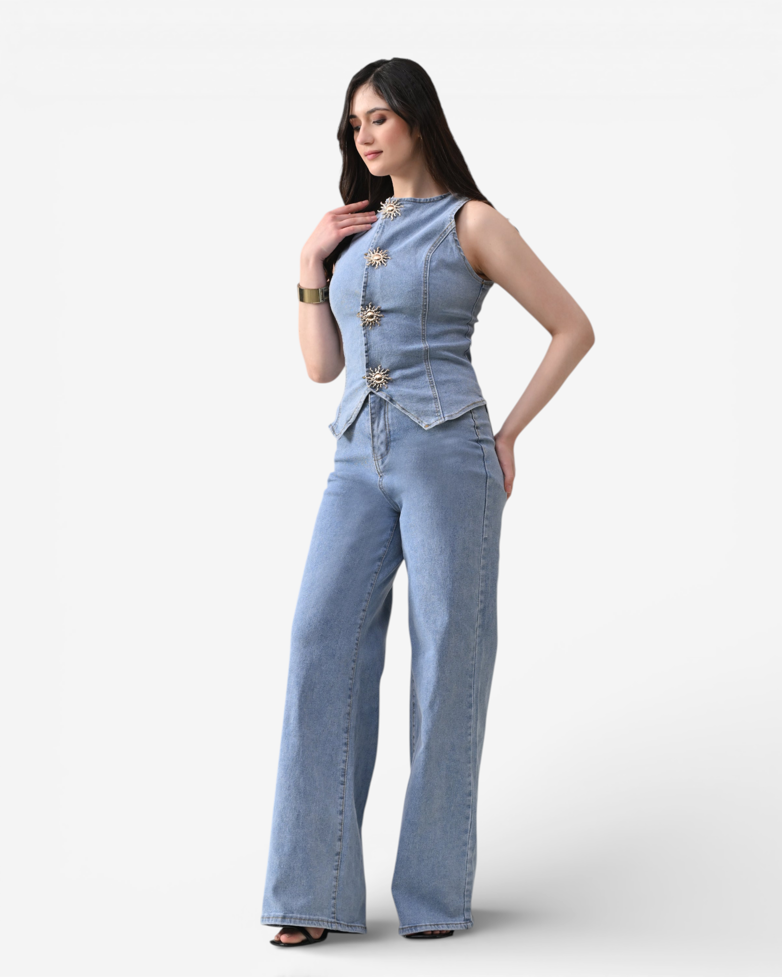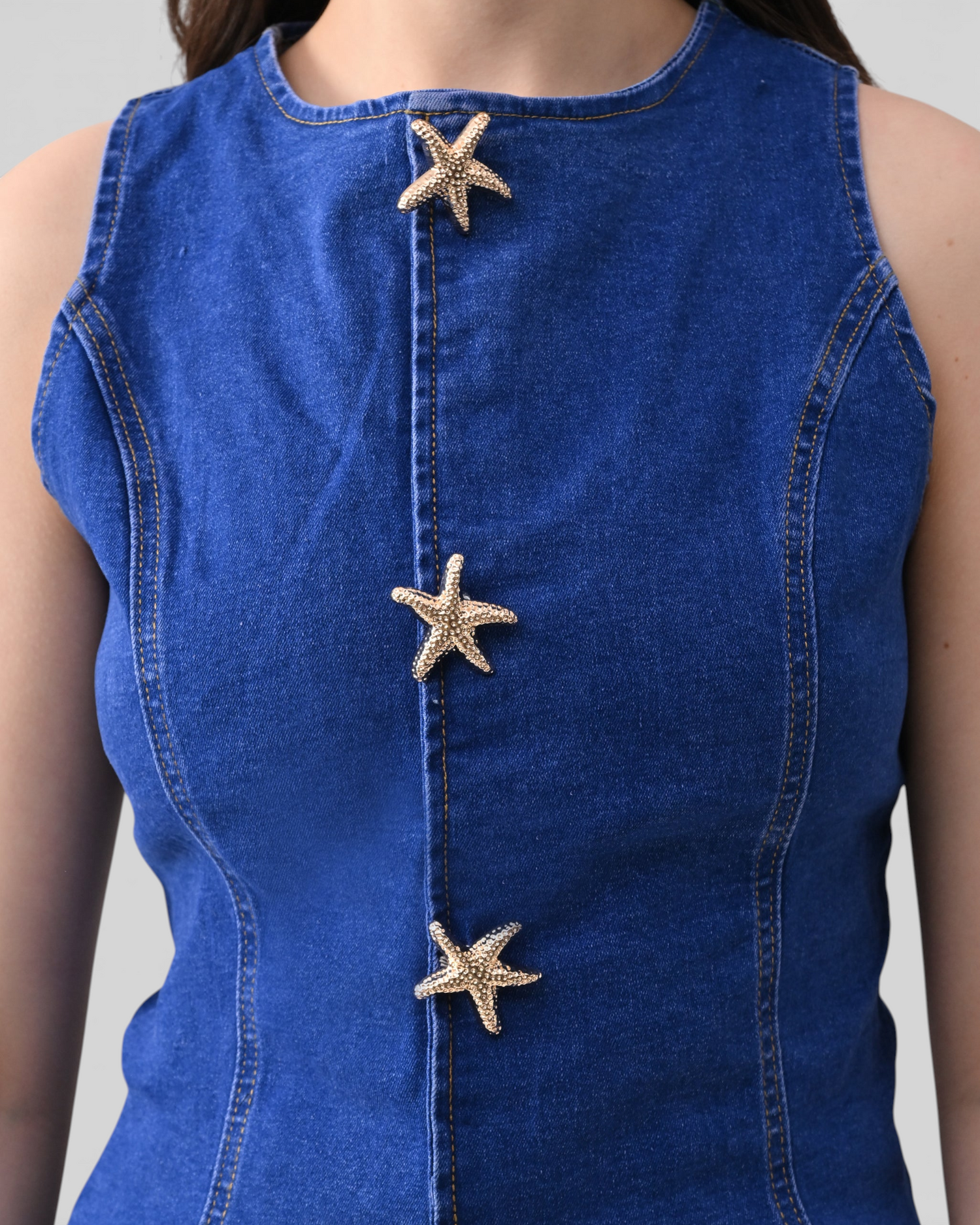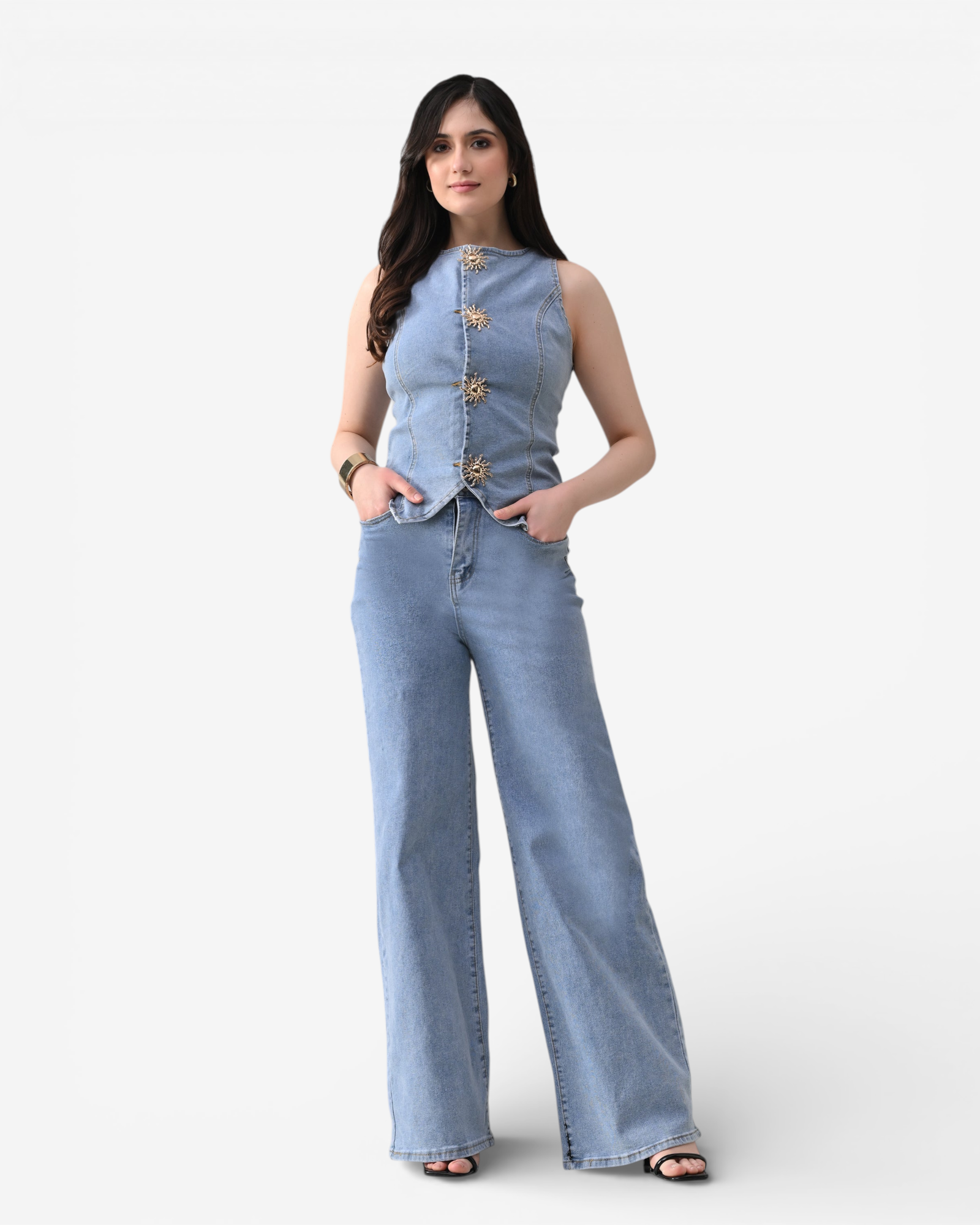 This two-piece denim set features a structured sleeveless top paired with wide-leg high-rise jeans. The top is tailored with curved panel detailing that enhances shape and gives a contoured fit. The front is highlighted with statement star-shaped button closures and a center opening, while the hem is cut in a subtle V-shape for a sharp finish.