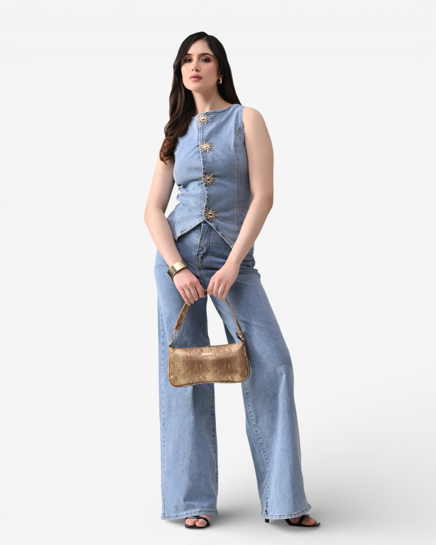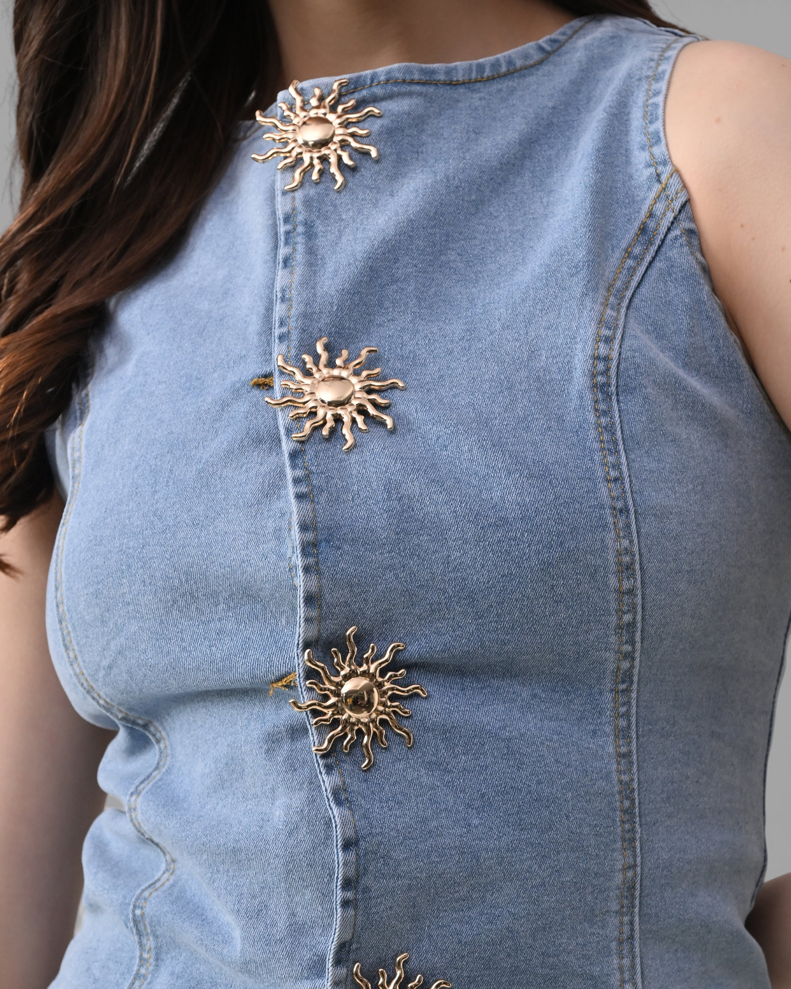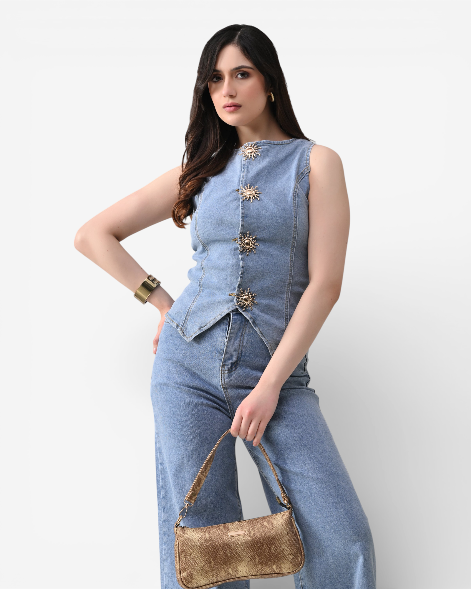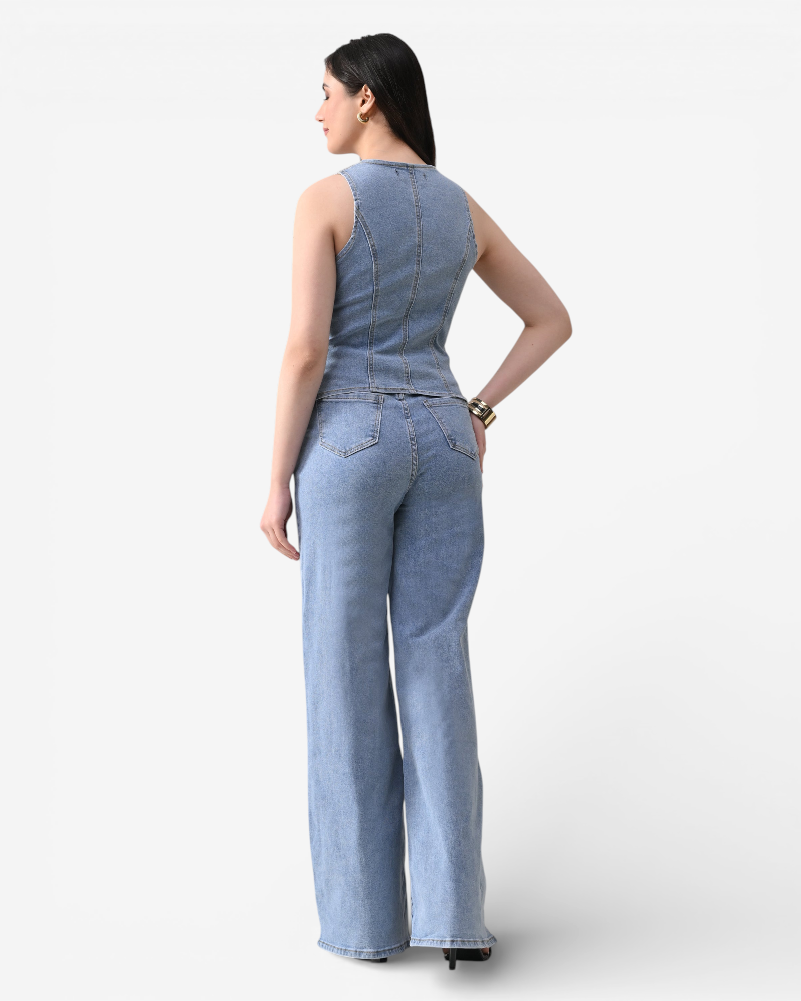 This two-piece denim set features a structured sleeveless top paired with wide-leg high-rise jeans. The top is tailored with curved panel detailing that enhances shape and gives a contoured fit. The front is highlighted with statement star-shaped button closures and a center opening, while the hem is cut in a subtle V-shape for a sharp finish.