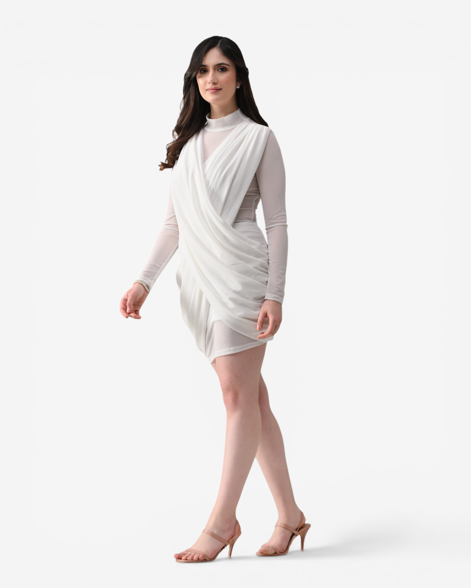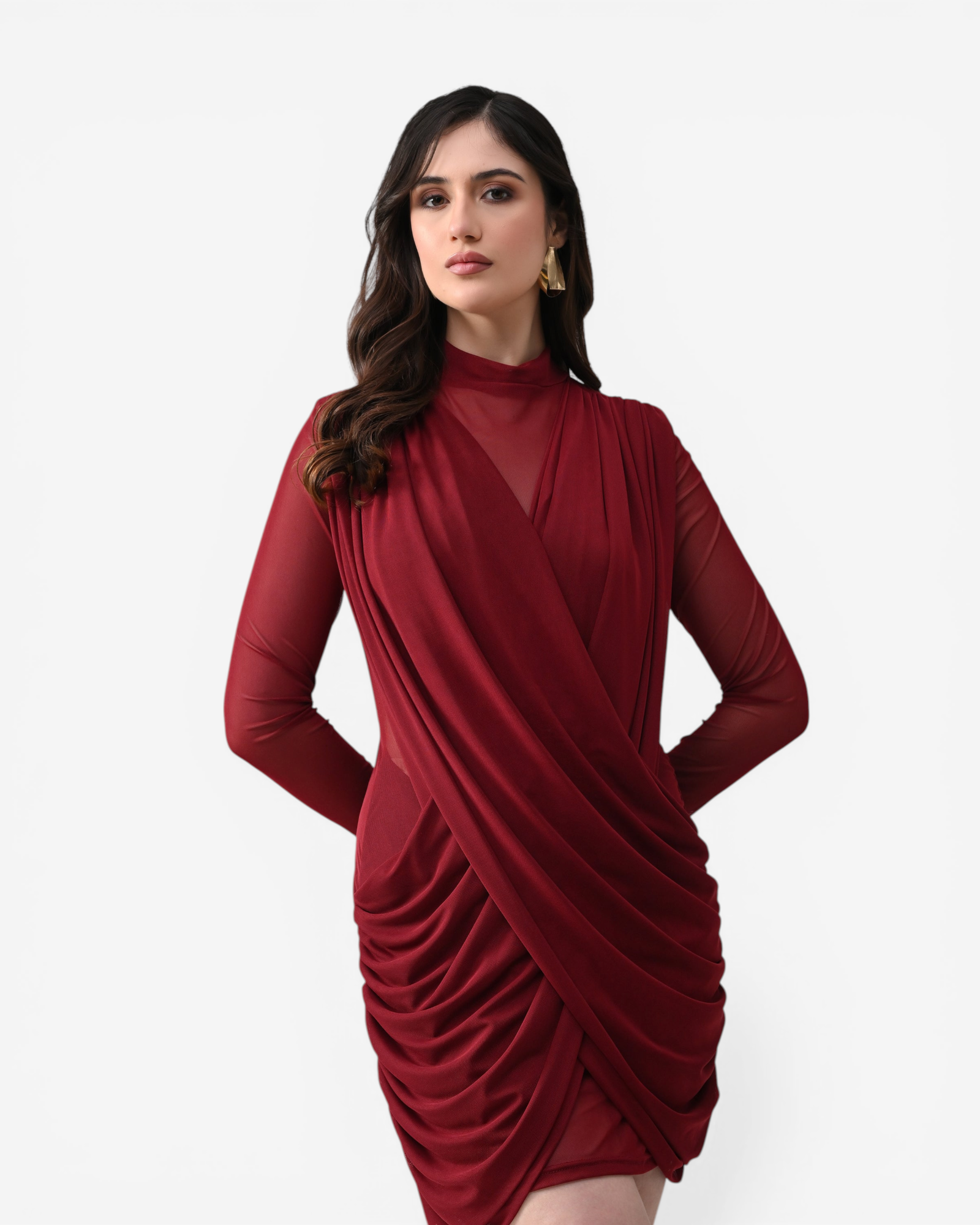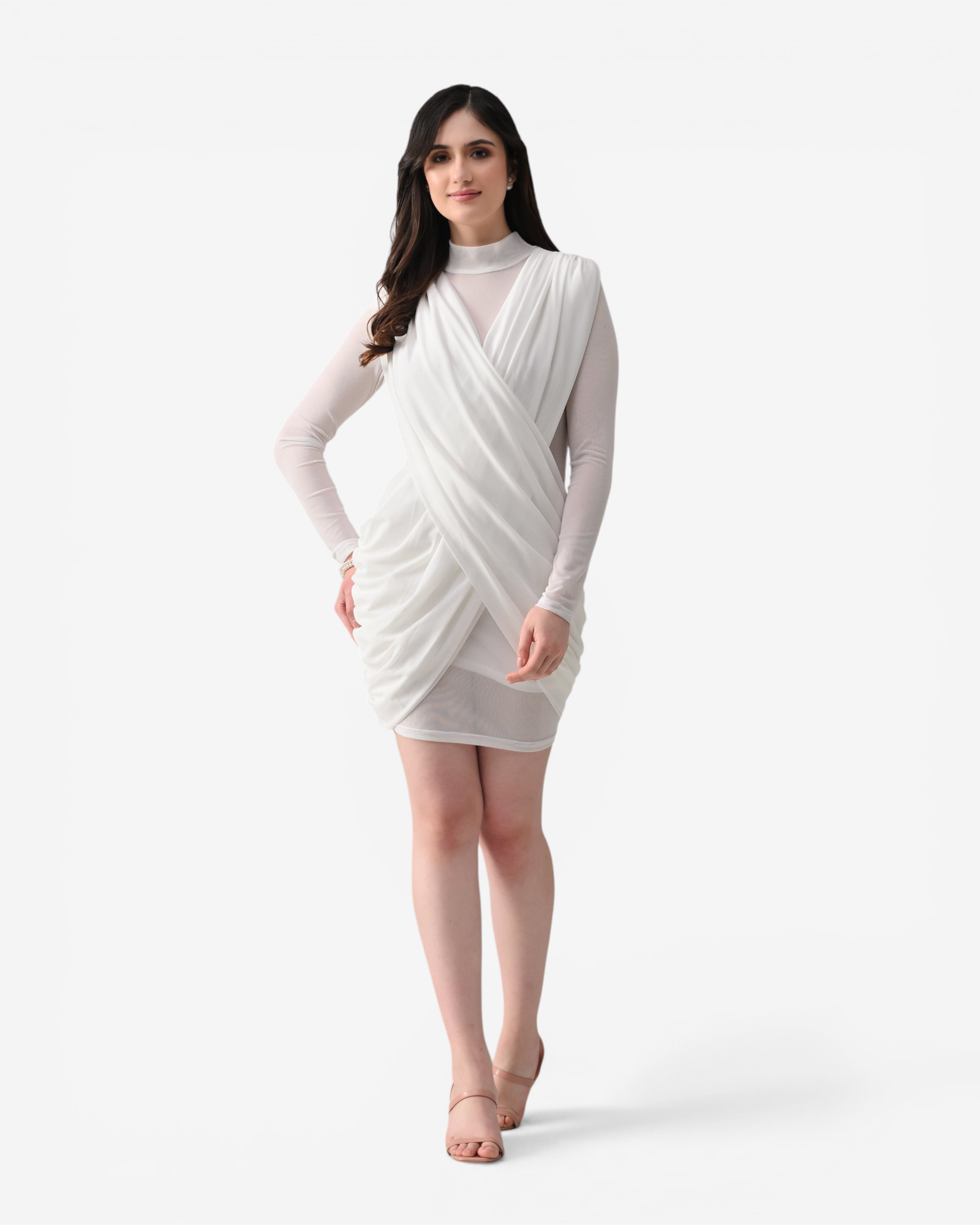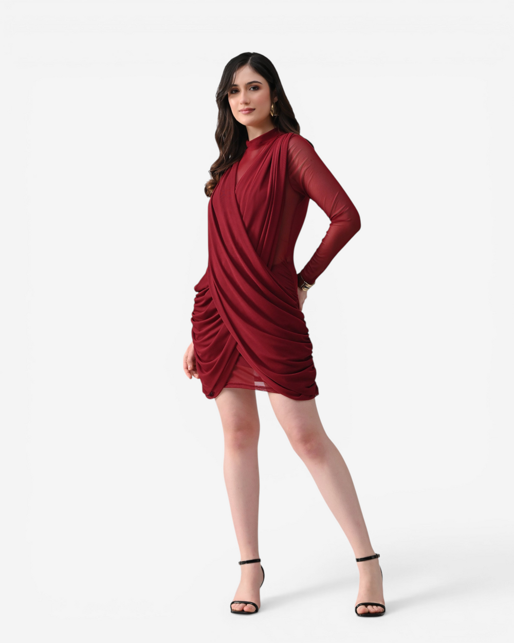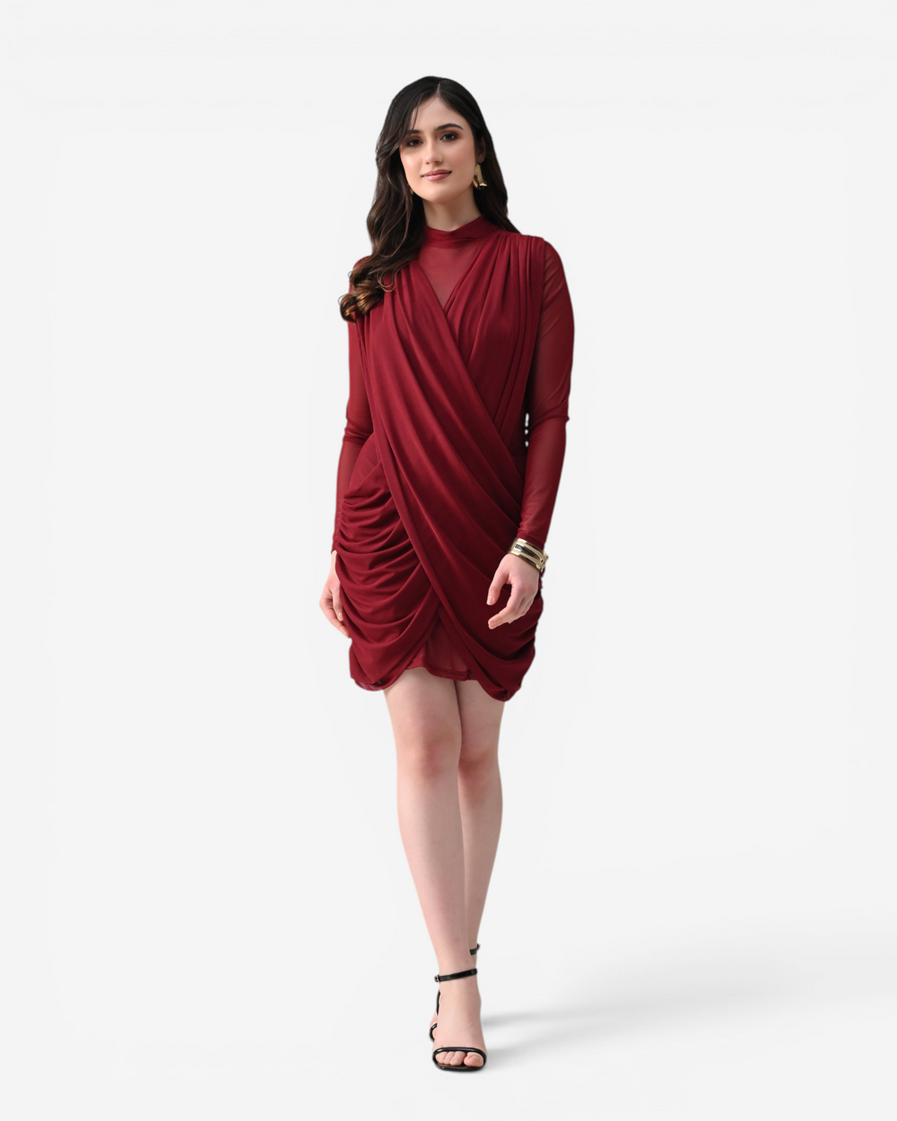This mini dress blends elegance with modern detailing. Designed in a lightweight, stretch mesh fabric, it features a high neckline with sheer full sleeves that add a refined touch. The front showcases a beautifully draped, crossover overlay that creates a flattering wrap-effect silhouette. The fitted inner lining enhances shape, while ruched detailing along the sides adds texture and accentuates curves. The back maintains a clean, body-hugging finish, giving the dress a sleek and polished look from every angle.