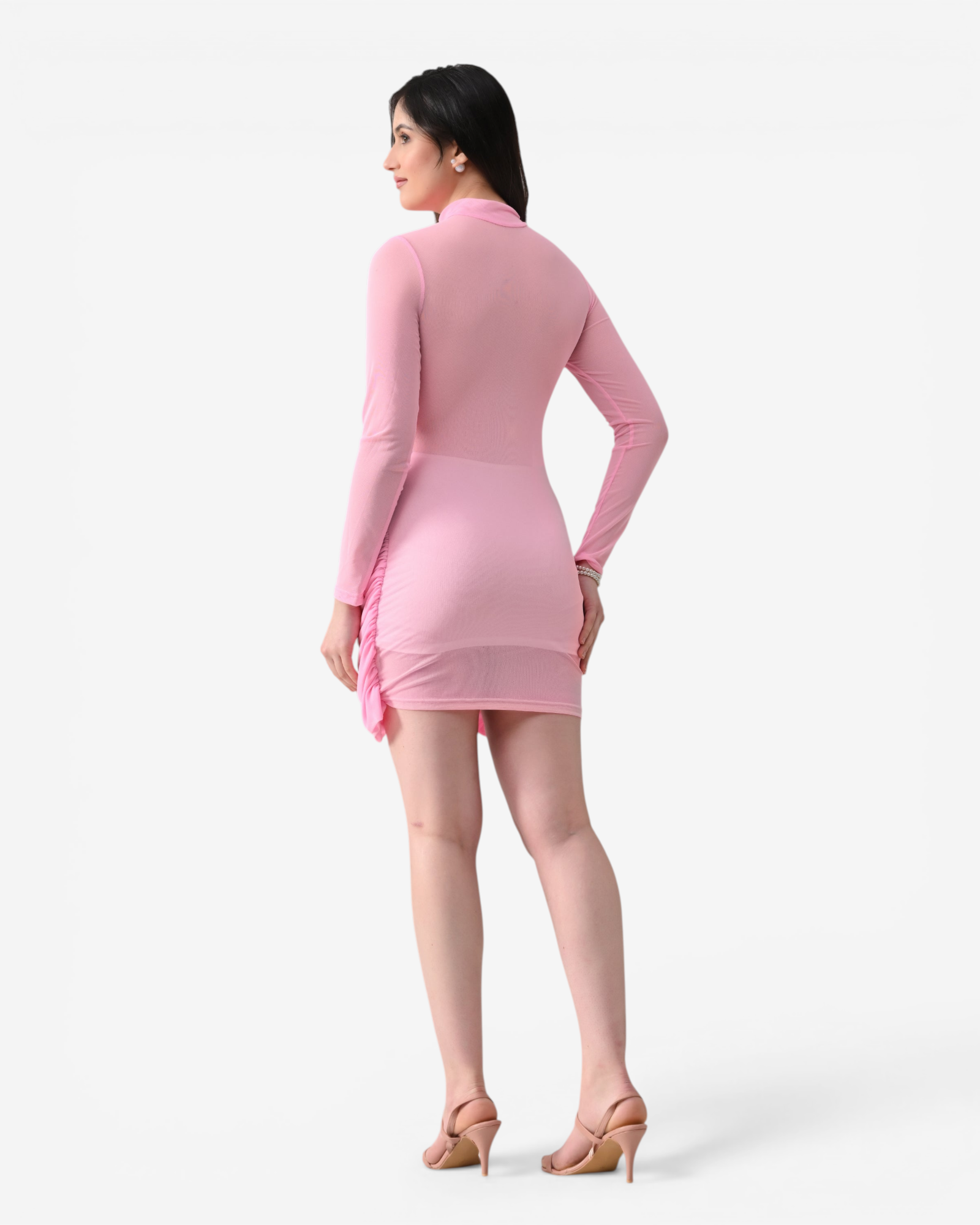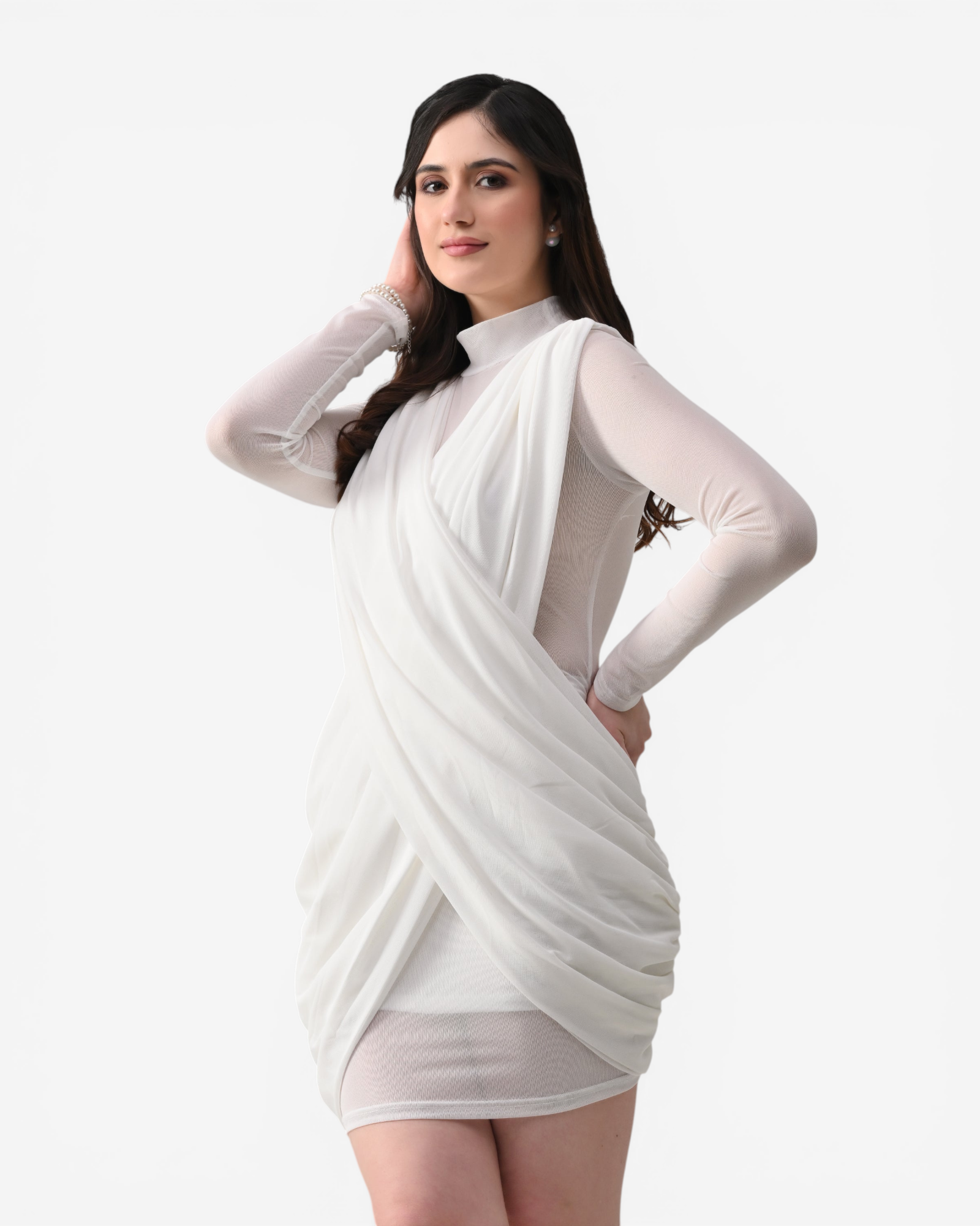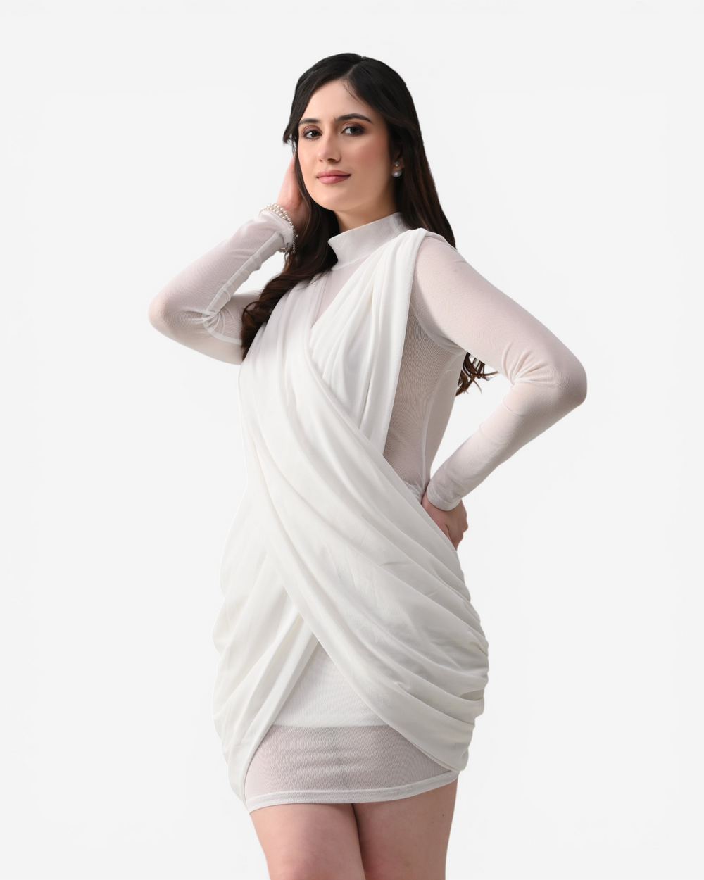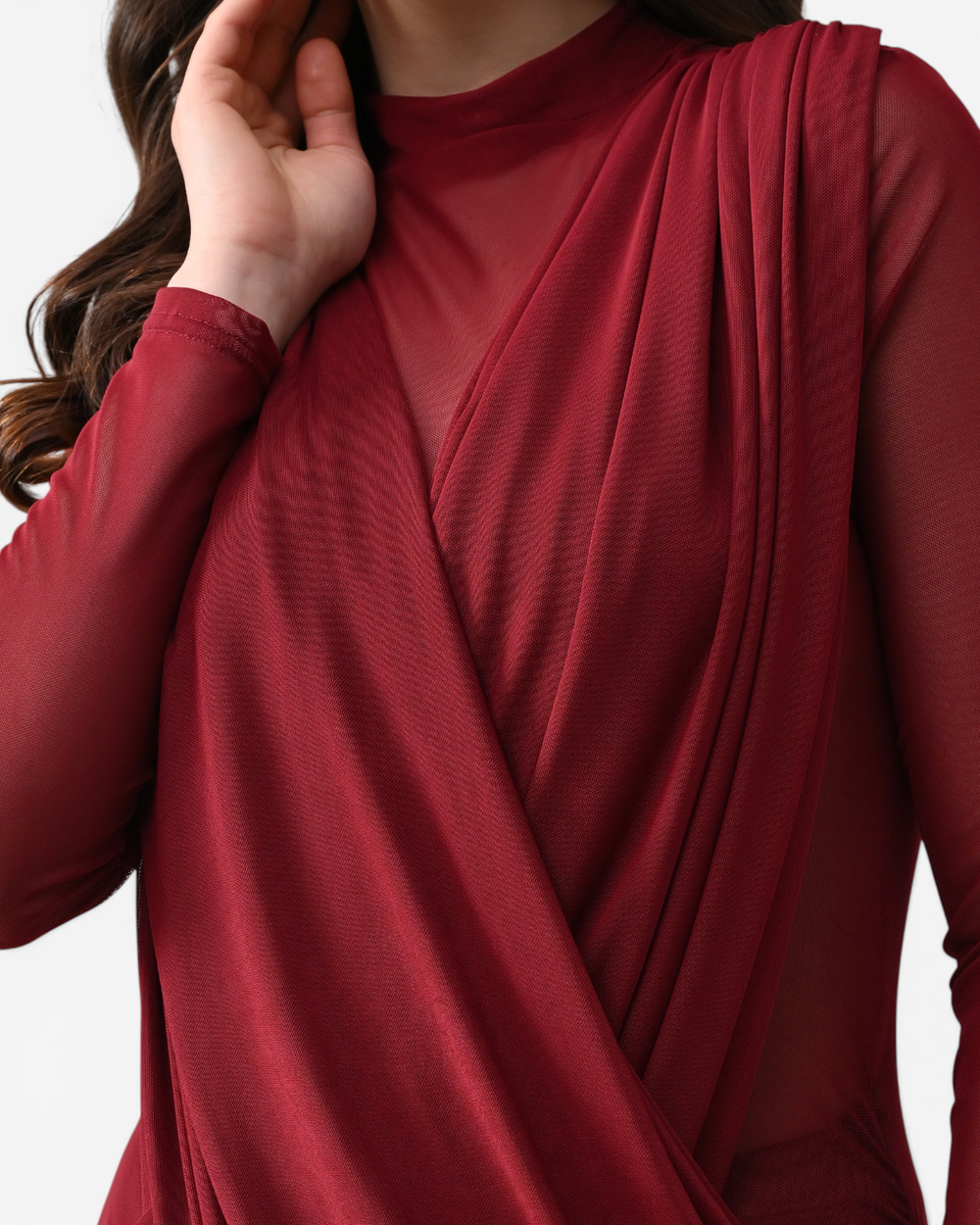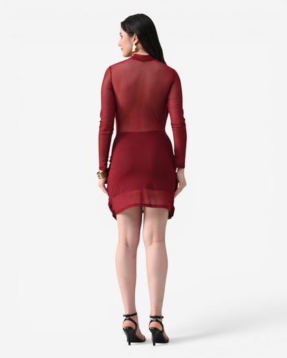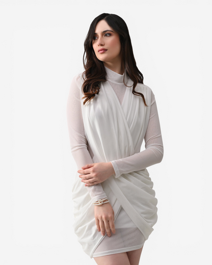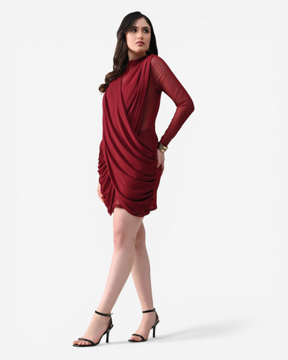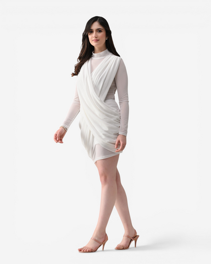This mini dress blends elegance with modern detailing. Designed in a lightweight, stretch mesh fabric, it features a high neckline with sheer full sleeves that add a refined touch. The front showcases a beautifully draped, crossover overlay that creates a flattering wrap-effect silhouette. The fitted inner lining enhances shape, while ruched detailing along the sides adds texture and accentuates curves. The back maintains a clean, body-hugging finish, giving the dress a sleek and polished look from every angle.