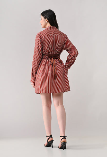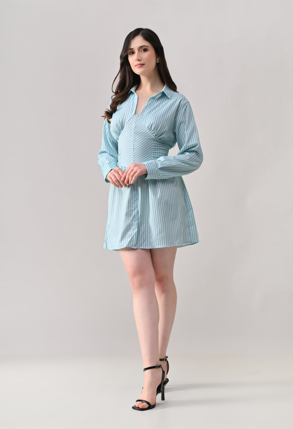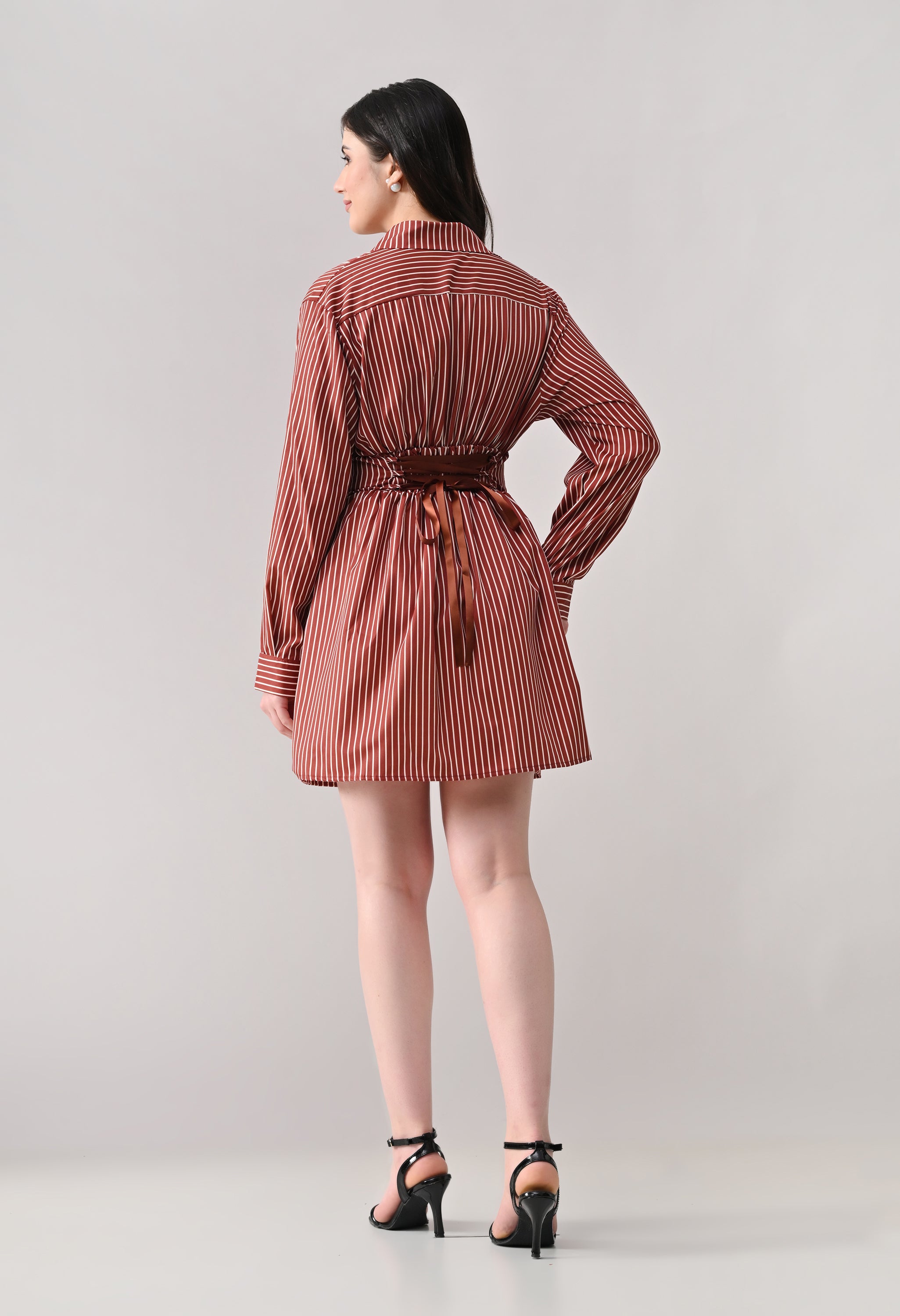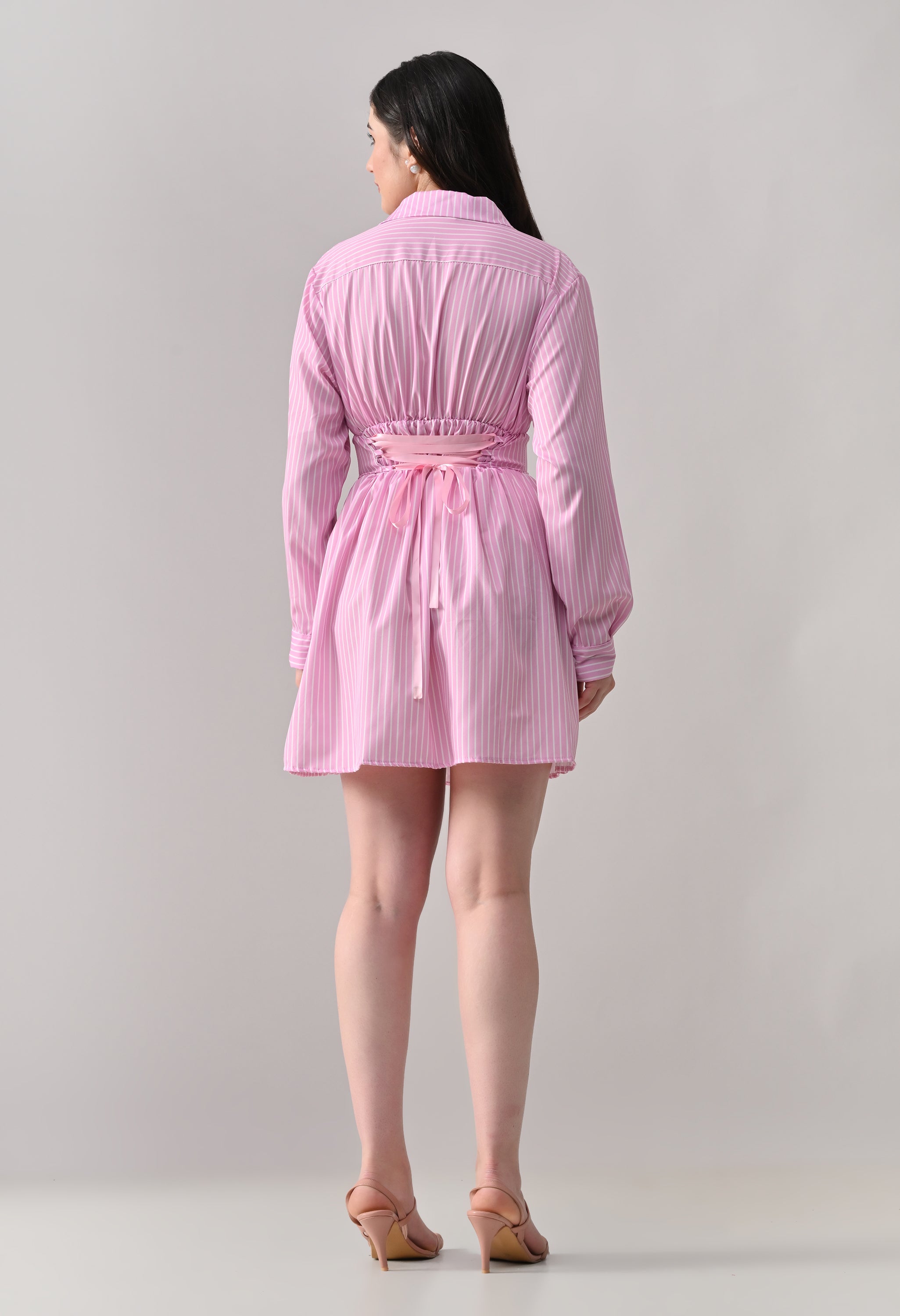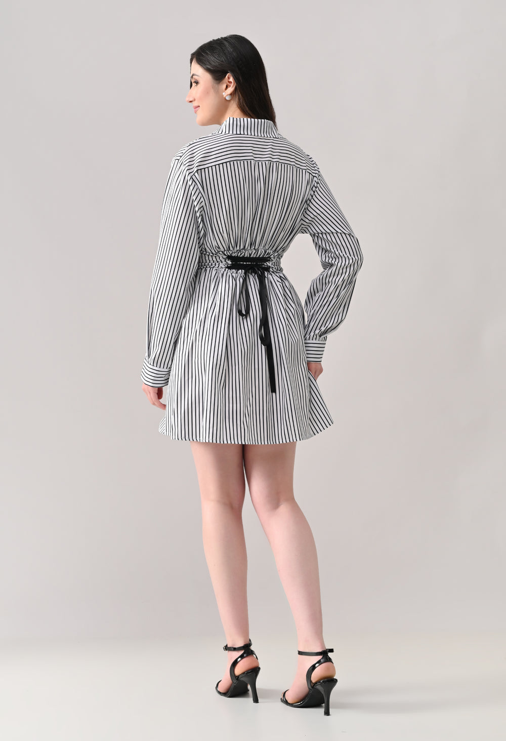 This striped shirt dress features a collared neckline with a partial front button-down closure and long sleeves with cuff detailing, designed with a structured panelled bodice that enhances shape, an elasticated waist for a comfortable and flexible fit, and adjustable lace-up tie detailing at the back for added definition, flowing into a flared mini-length skirt for a flattering and feminine silhouette.