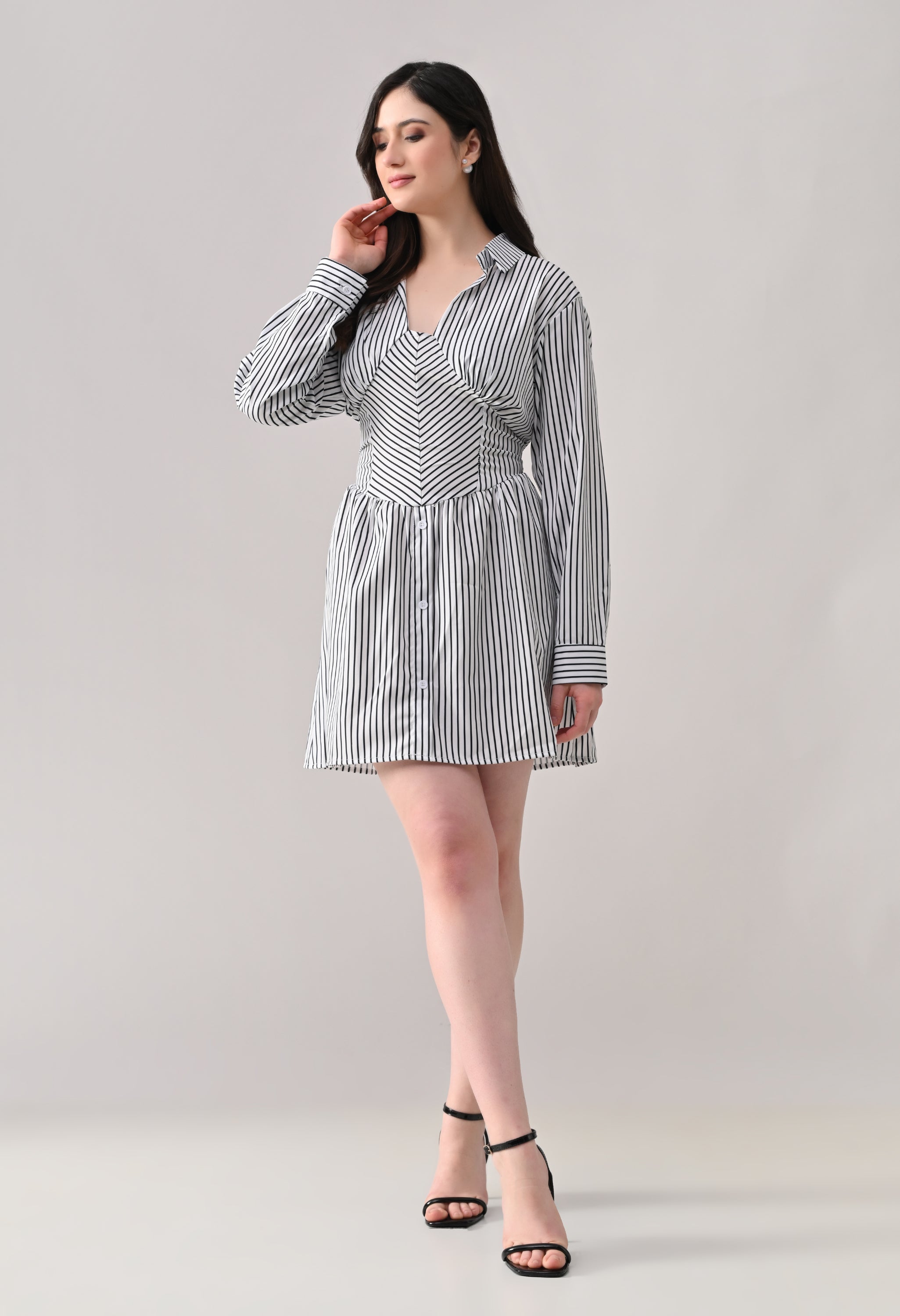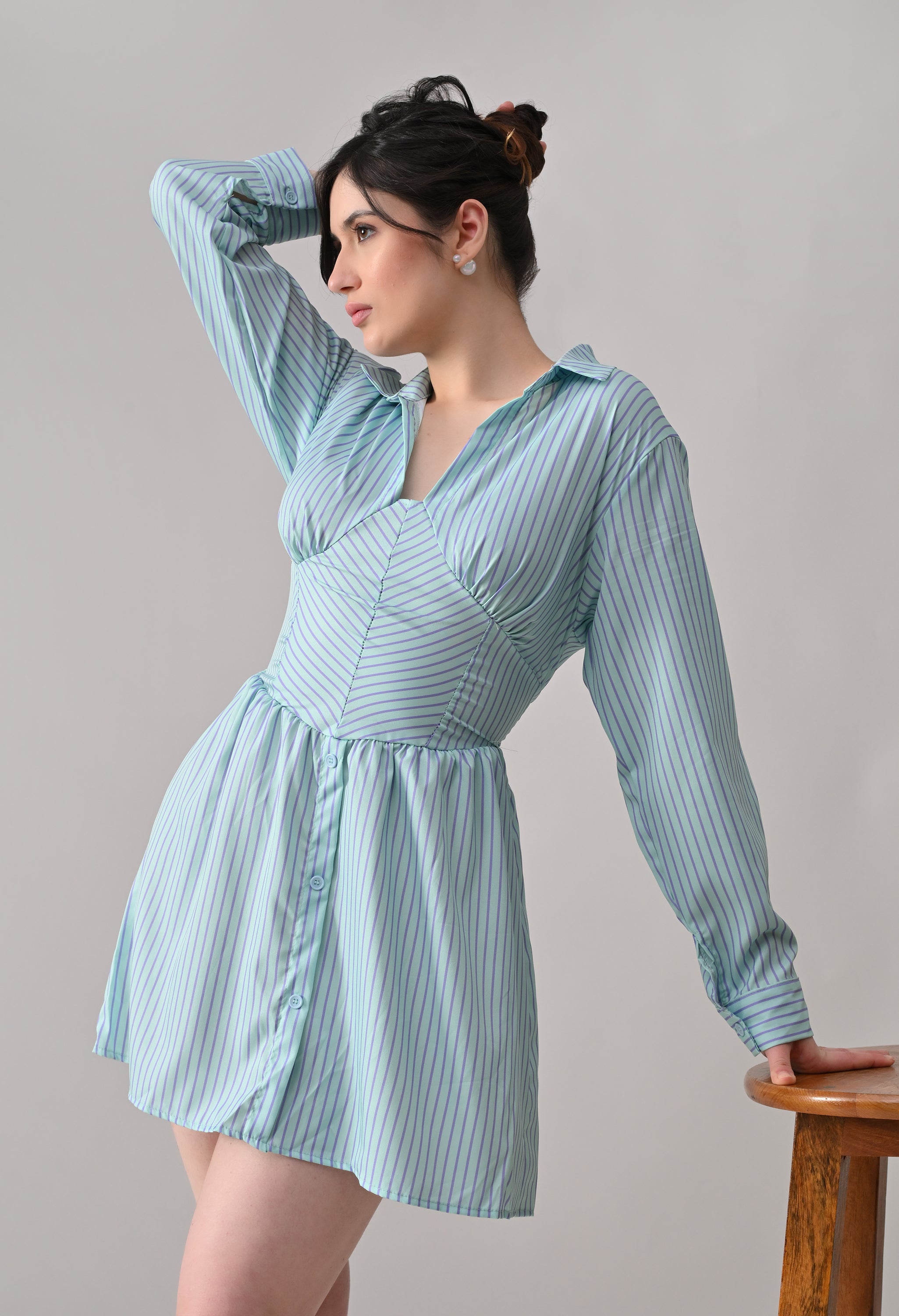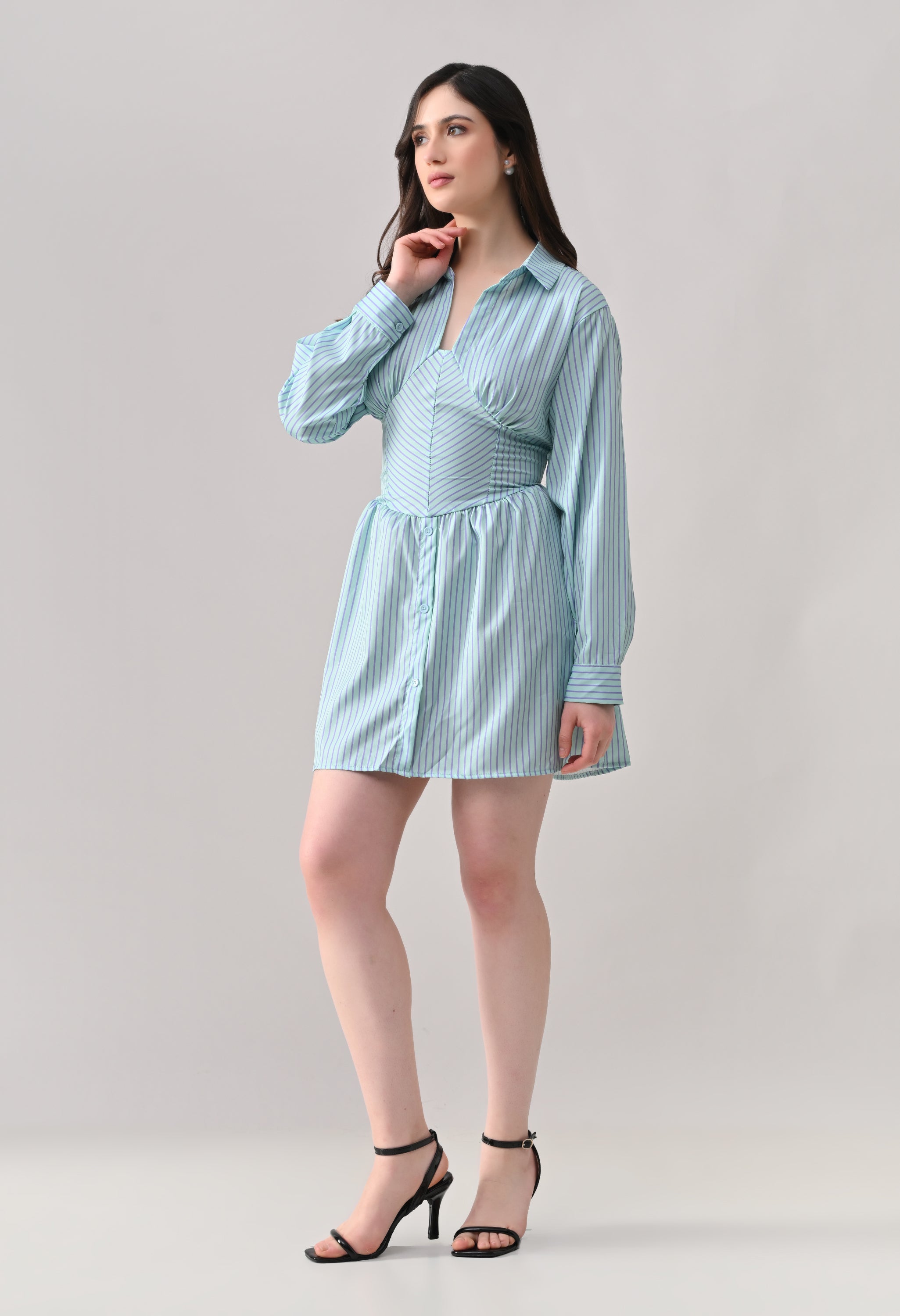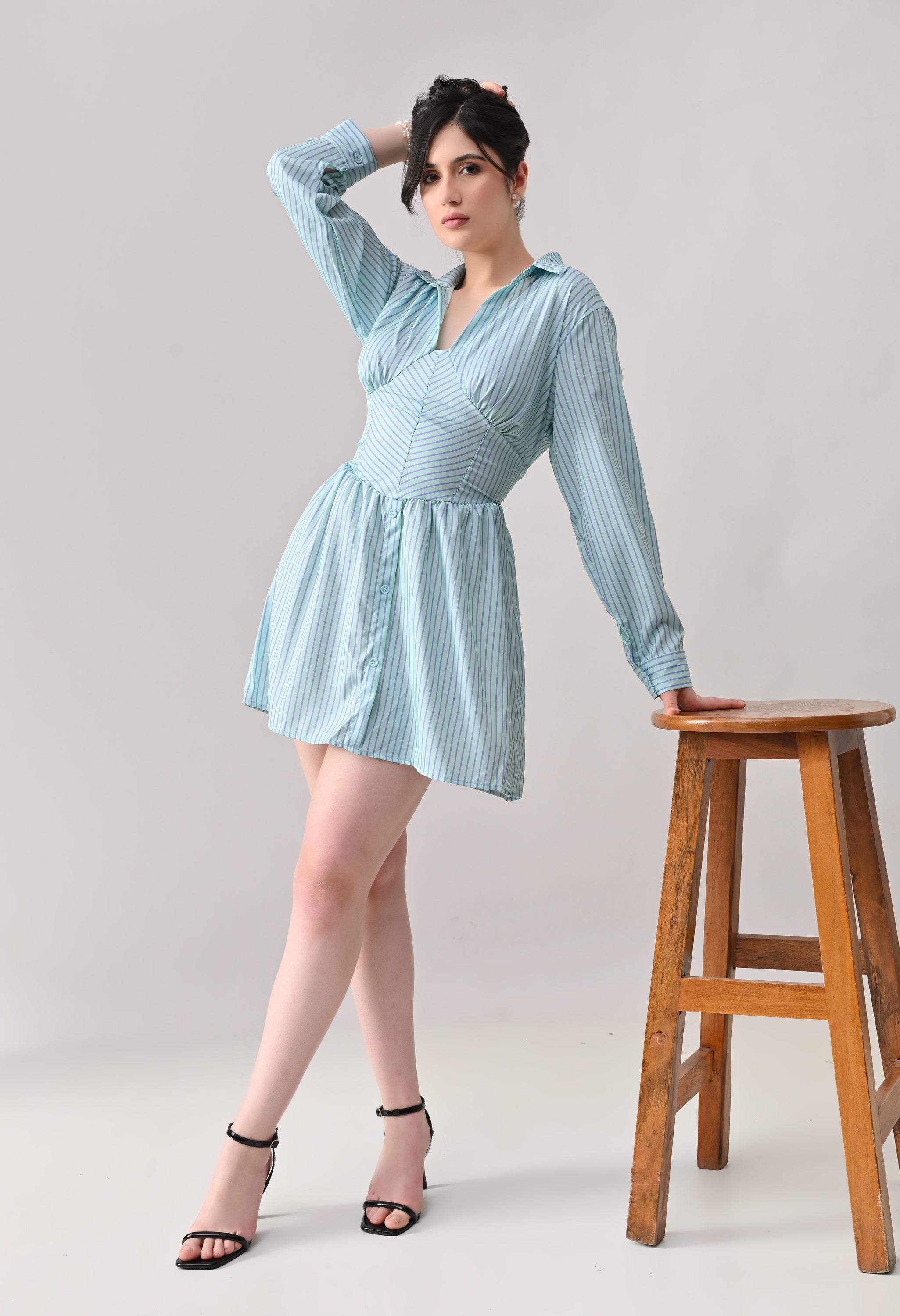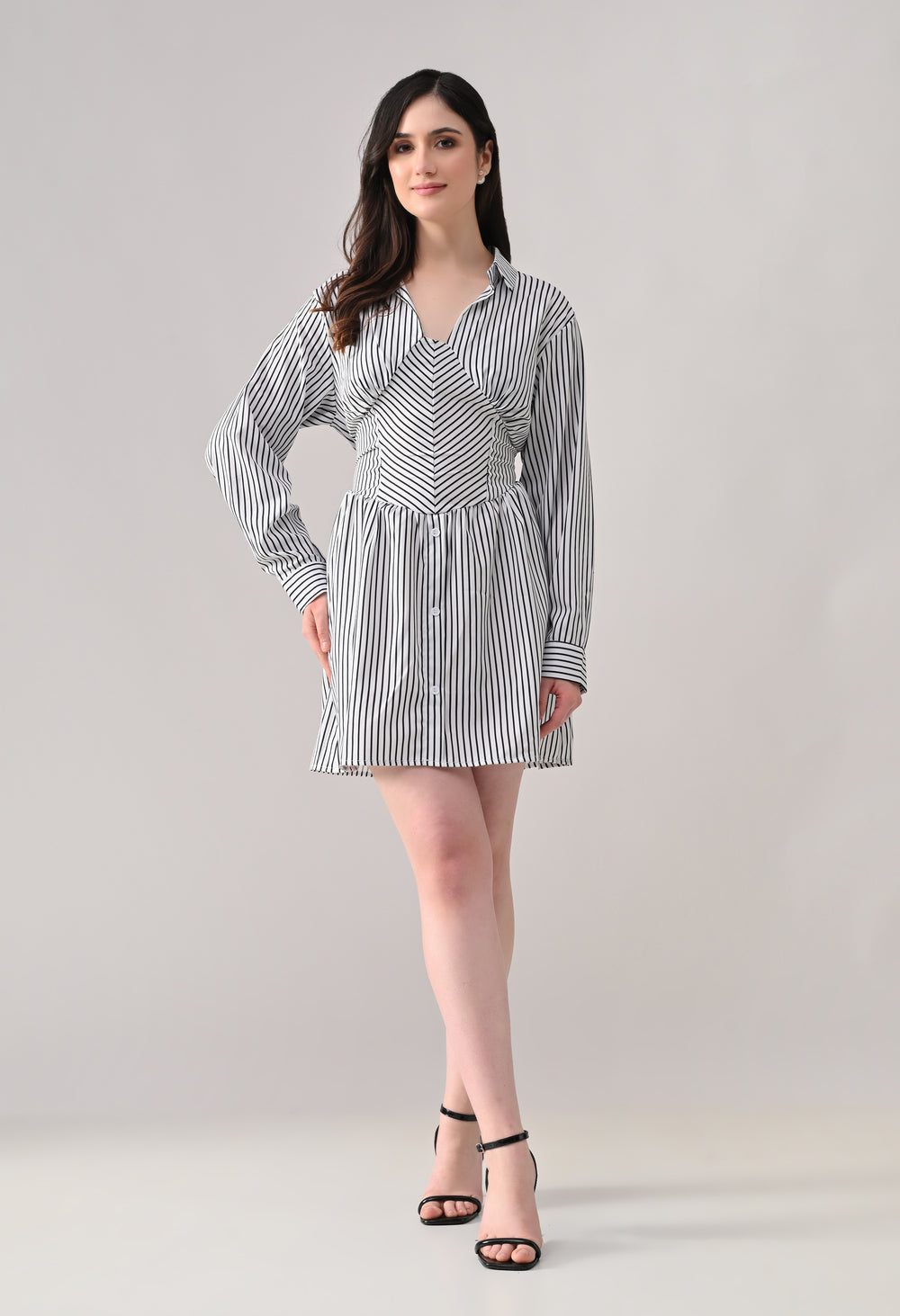 This striped shirt dress features a collared neckline with a partial front button-down closure and long sleeves with cuff detailing, designed with a structured panelled bodice that enhances shape, an elasticated waist for a comfortable and flexible fit, and adjustable lace-up tie detailing at the back for added definition, flowing into a flared mini-length skirt for a flattering and feminine silhouette.