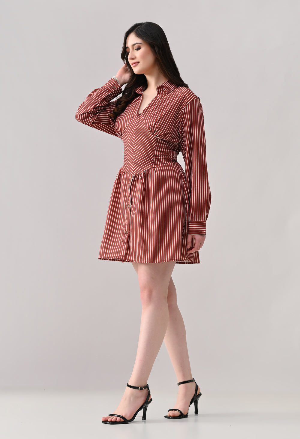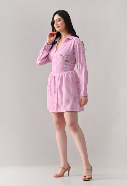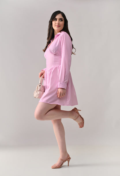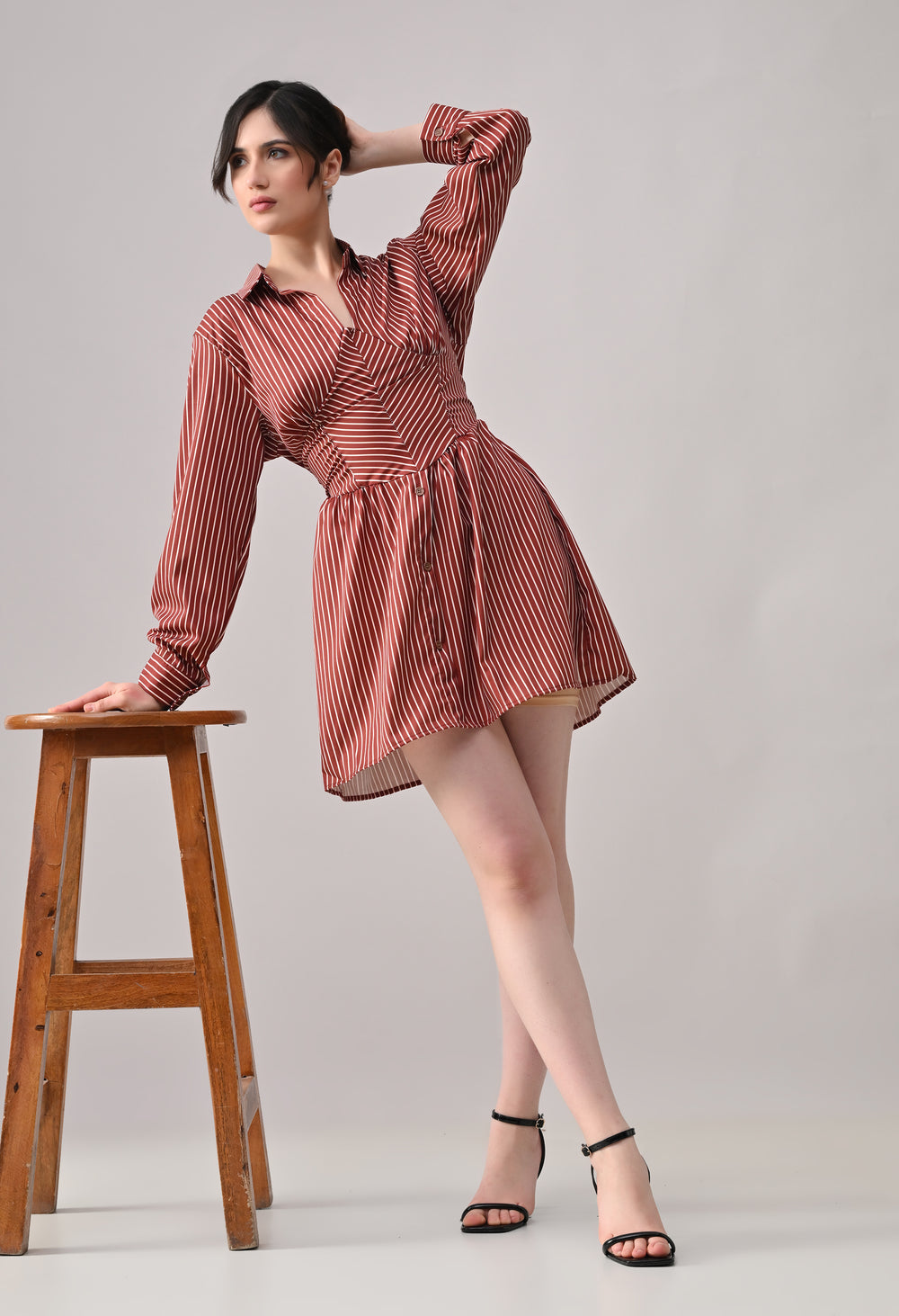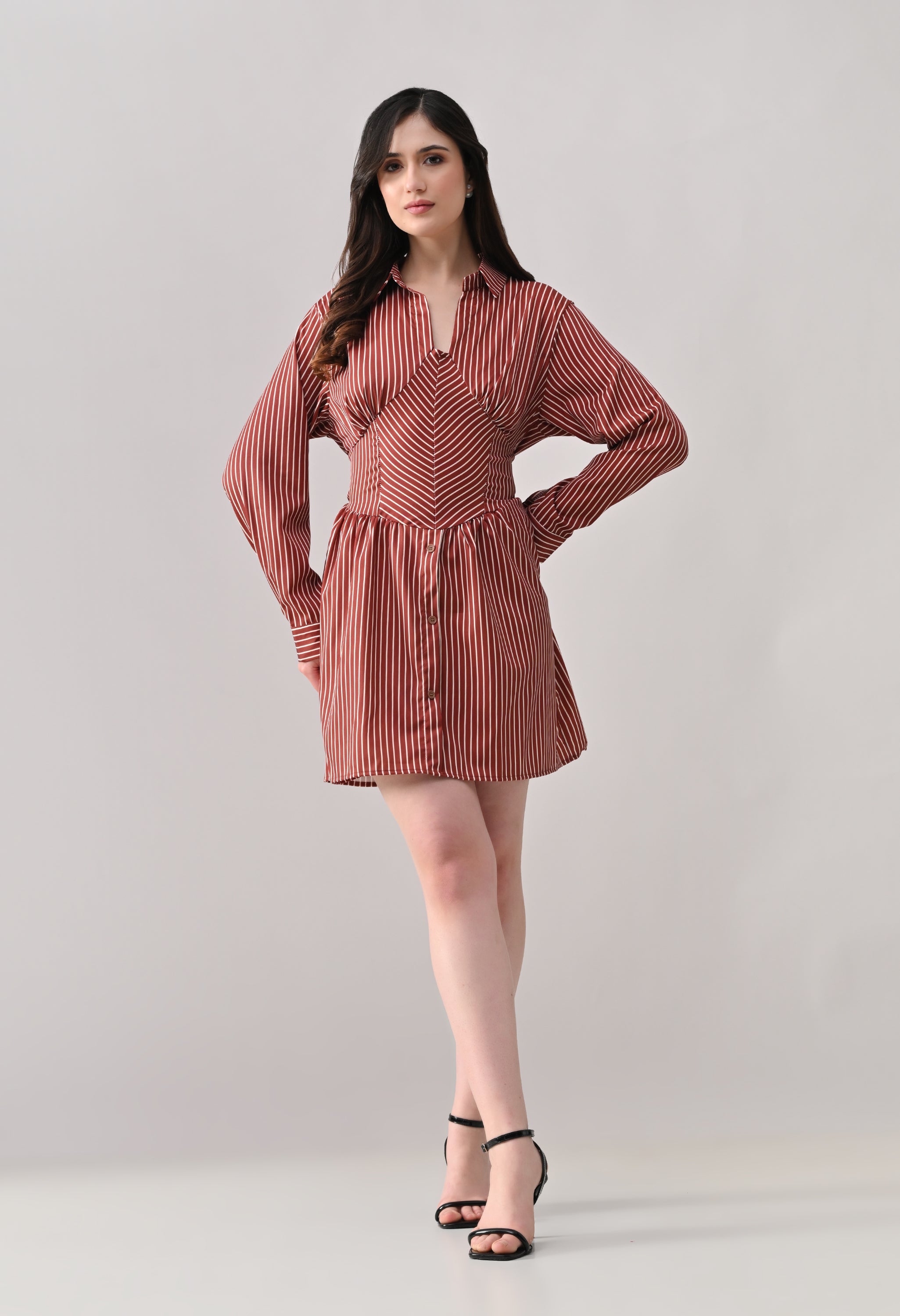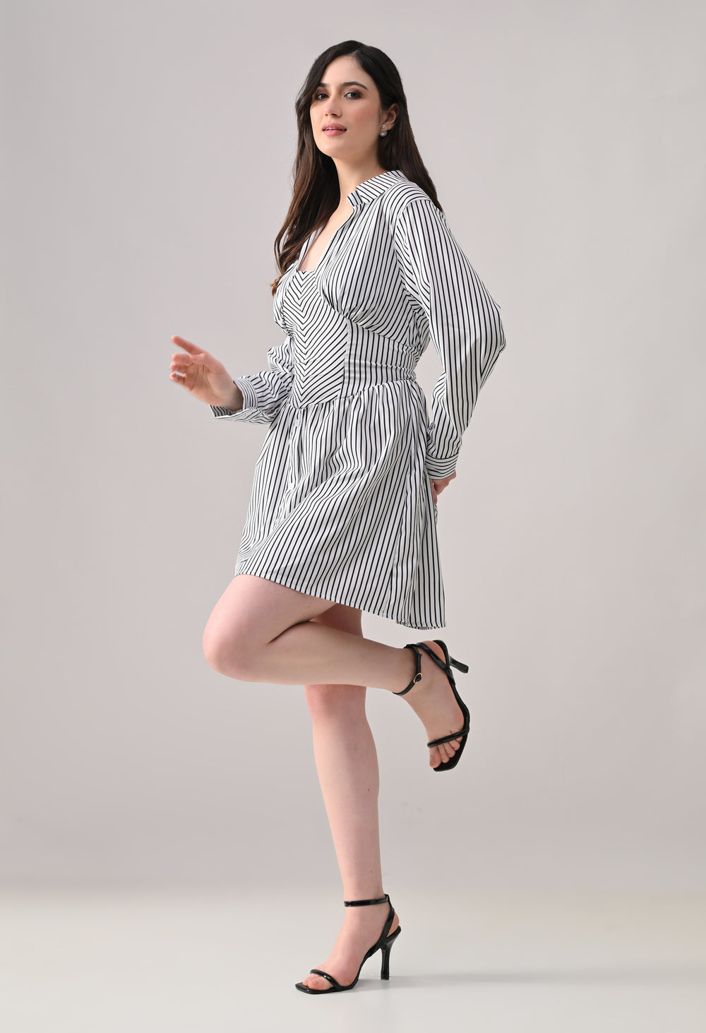 This striped shirt dress features a collared neckline with a partial front button-down closure and long sleeves with cuff detailing, designed with a structured panelled bodice that enhances shape, an elasticated waist for a comfortable and flexible fit, and adjustable lace-up tie detailing at the back for added definition, flowing into a flared mini-length skirt for a flattering and feminine silhouette.
