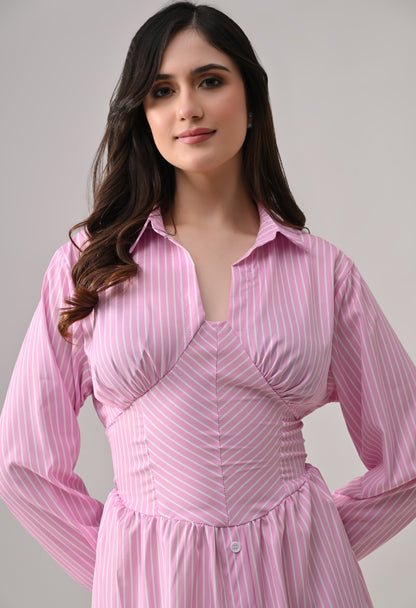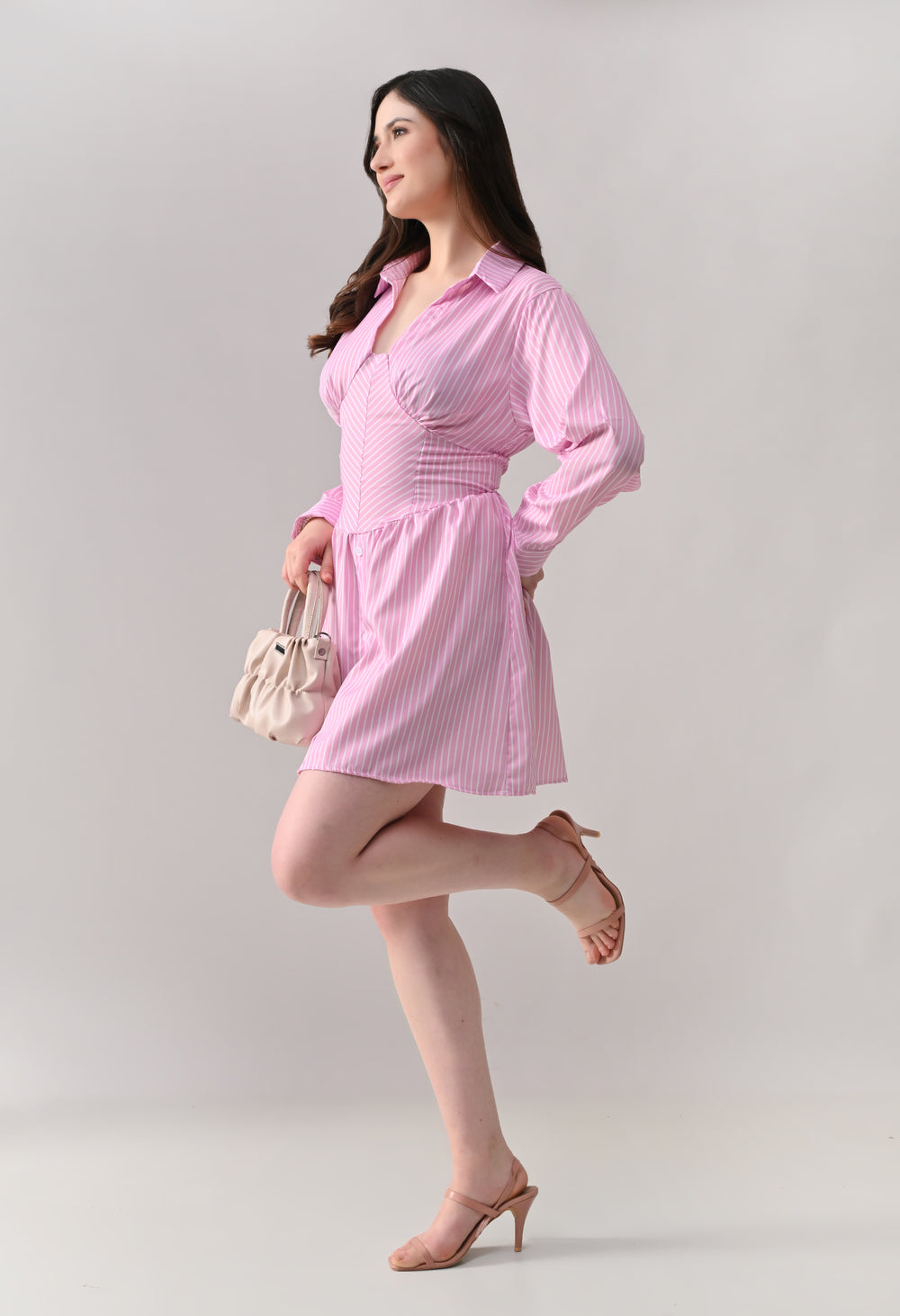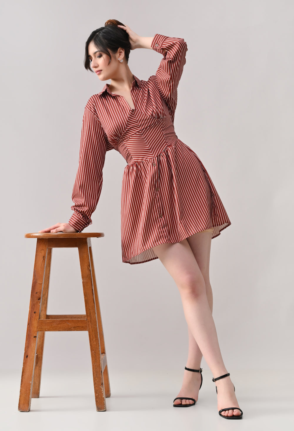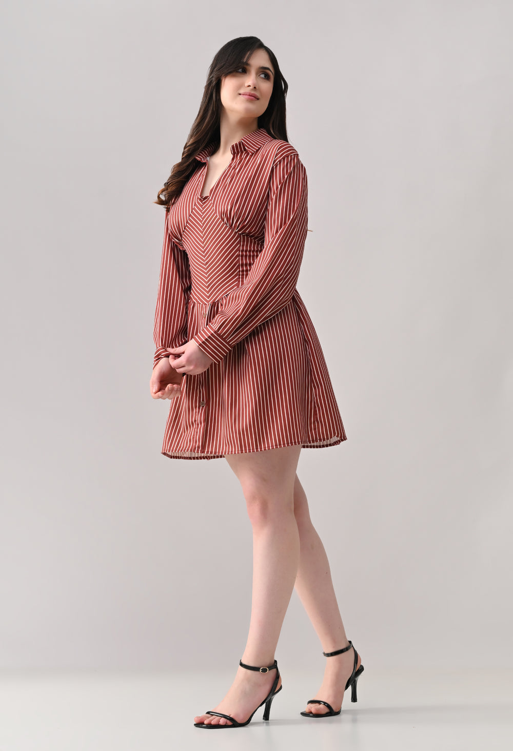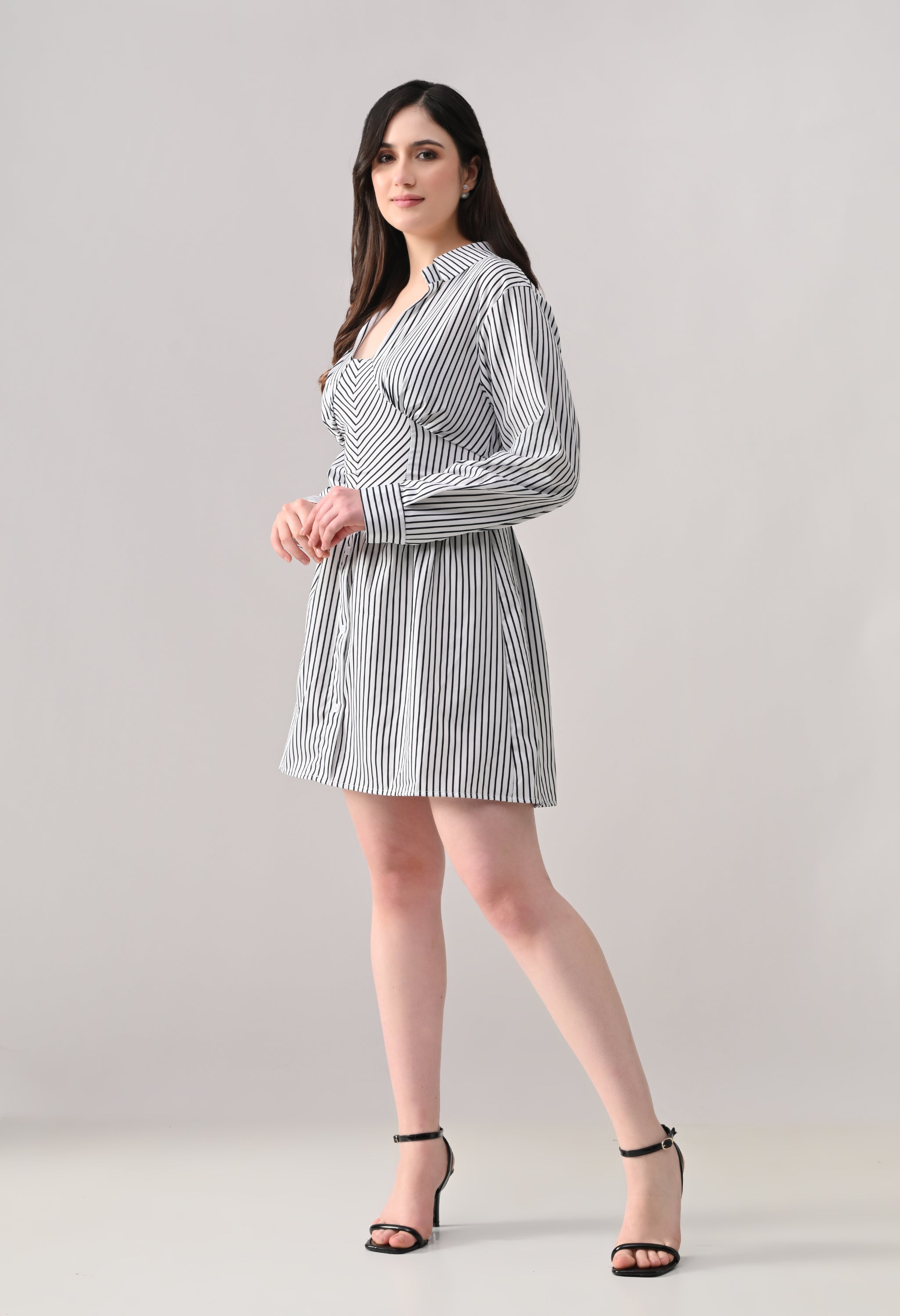 This striped shirt dress features a collared neckline with a partial front button-down closure and long sleeves with cuff detailing, designed with a structured panelled bodice that enhances shape, an elasticated waist for a comfortable and flexible fit, and adjustable lace-up tie detailing at the back for added definition, flowing into a flared mini-length skirt for a flattering and feminine silhouette.