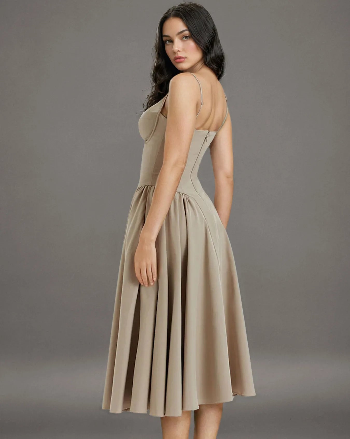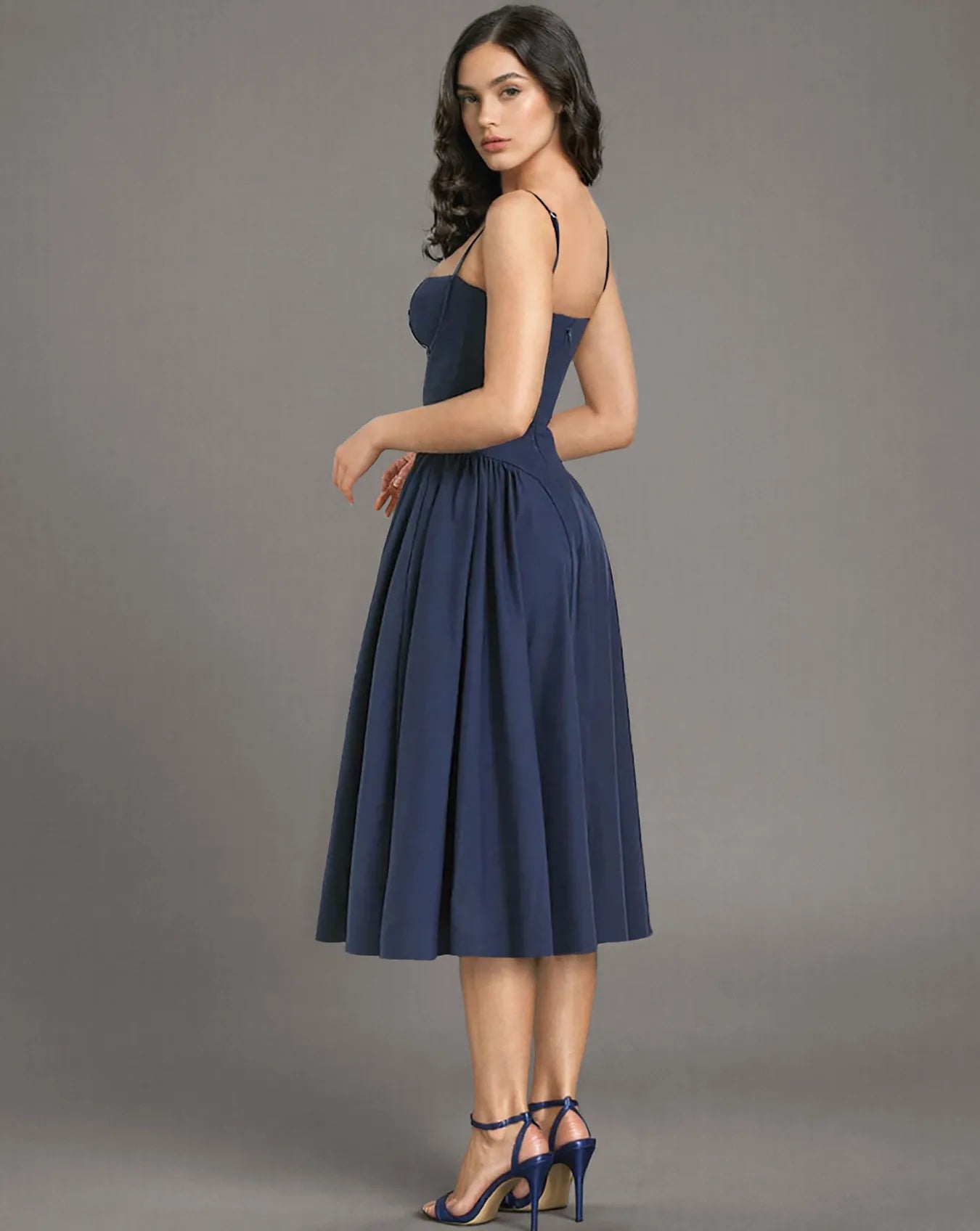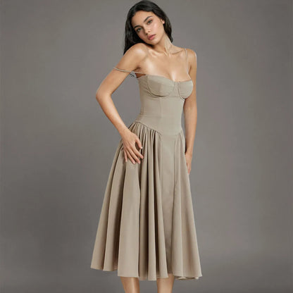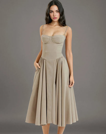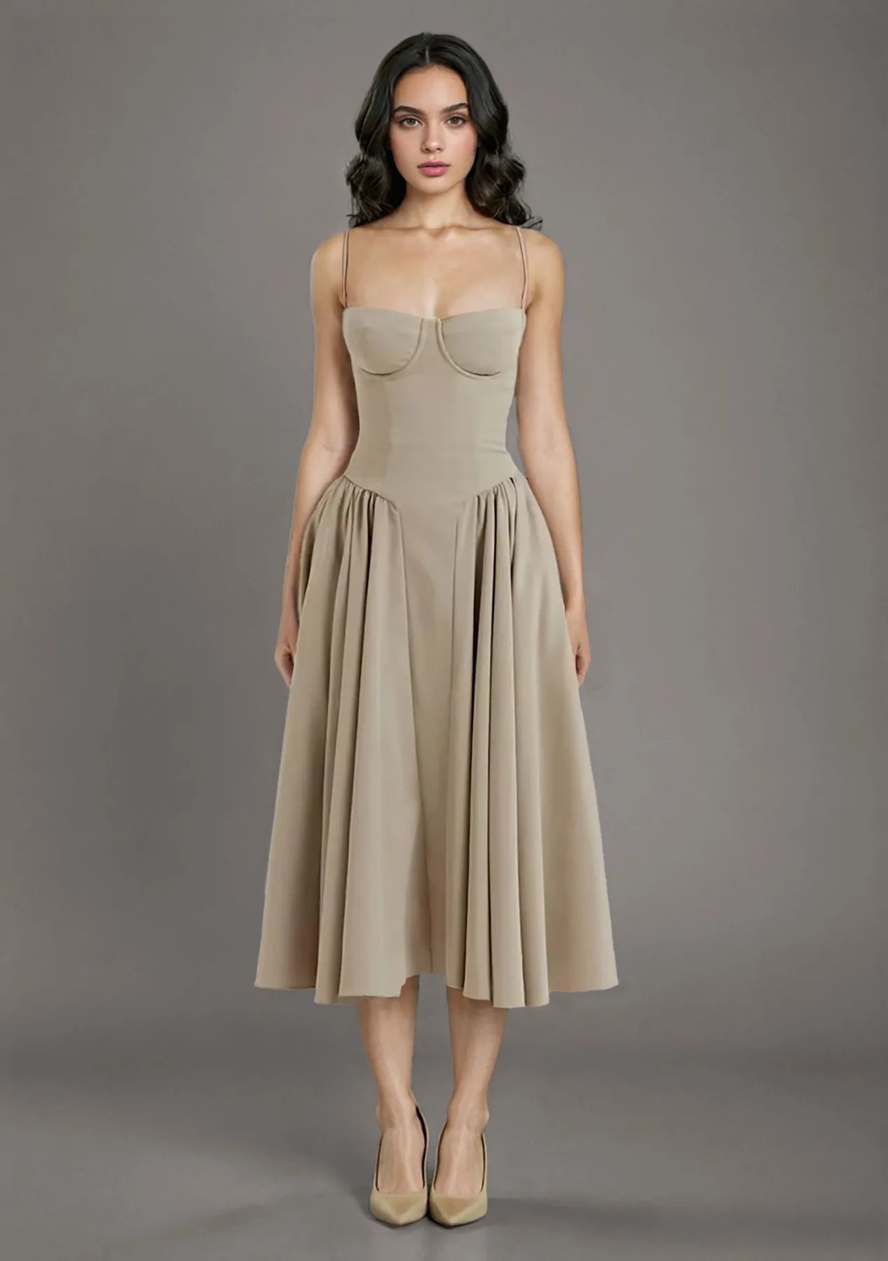 Step out in style with this waist fit and flare midi sundress, featuring a flattering V-shaped low waist with ruching and a distinctive flared hem. Perfect for any occasion—from sunny holidays to chic evening outings.