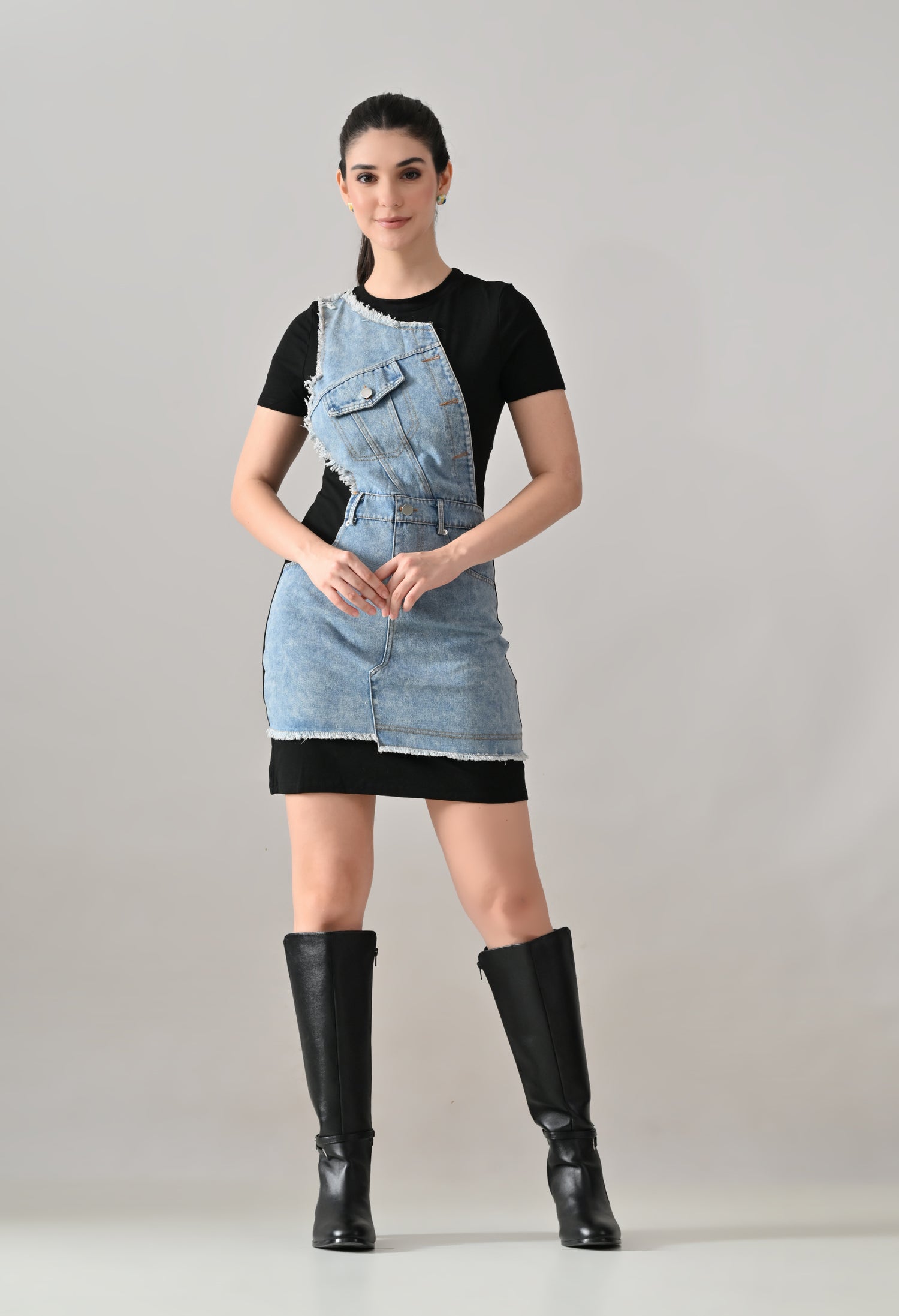 Effortlessly chic, the Denim Whisper Dress blends a classic black bodycon silhouette with an edgy denim overlay. Featuring raw hem detailing, utility pocket accents, and a flattering fit, this versatile piece takes you from casual daytime outings to statement evening looks with ease.