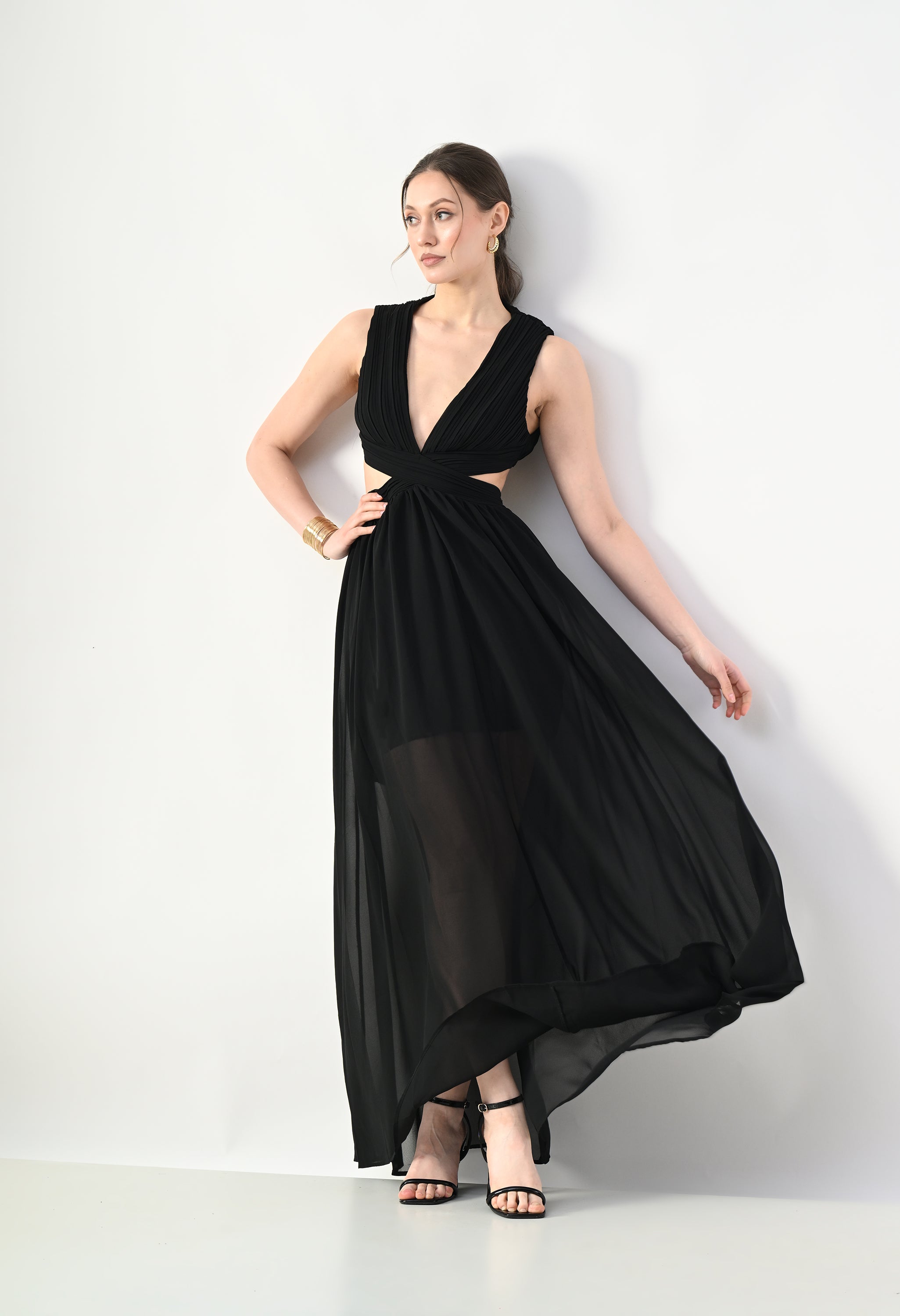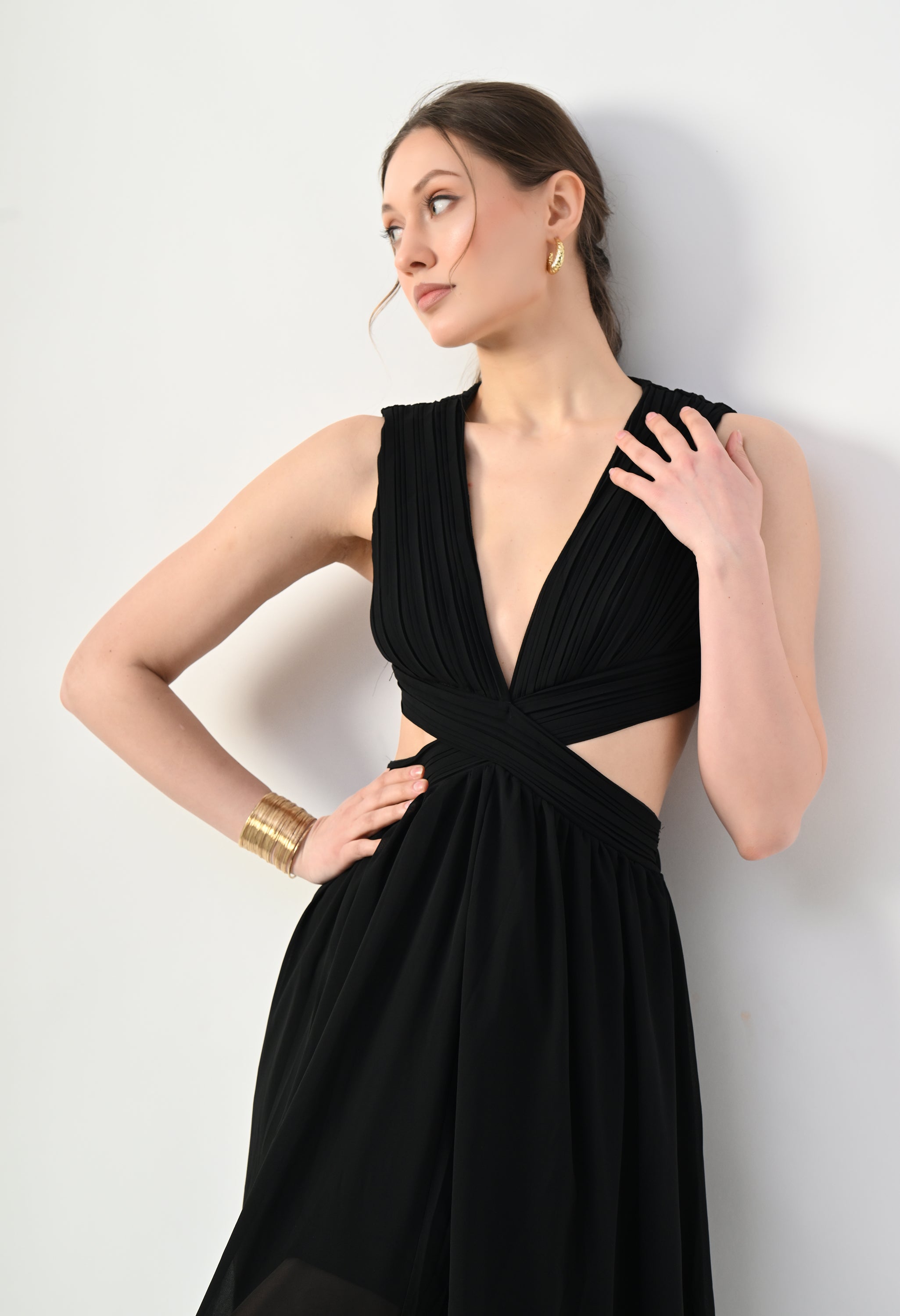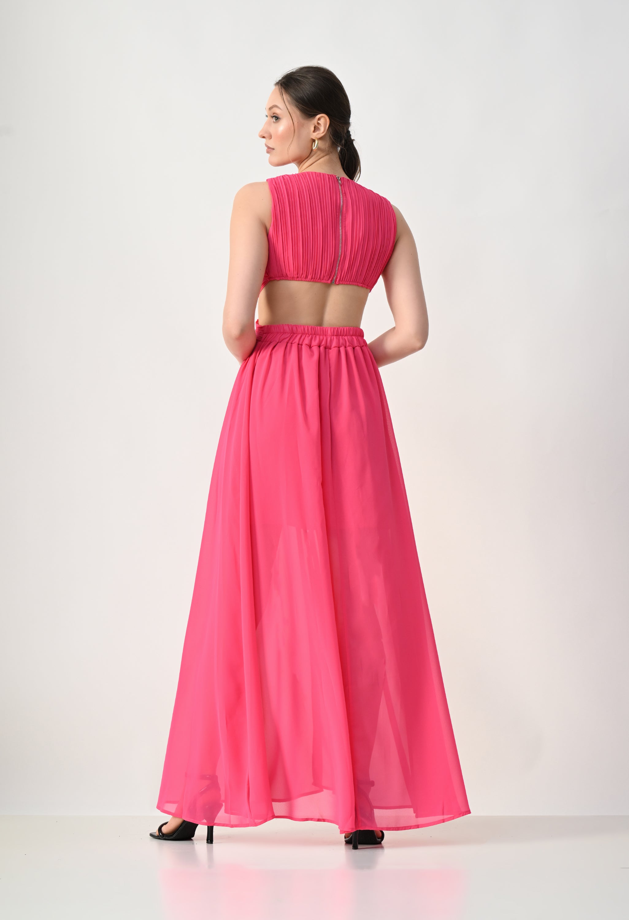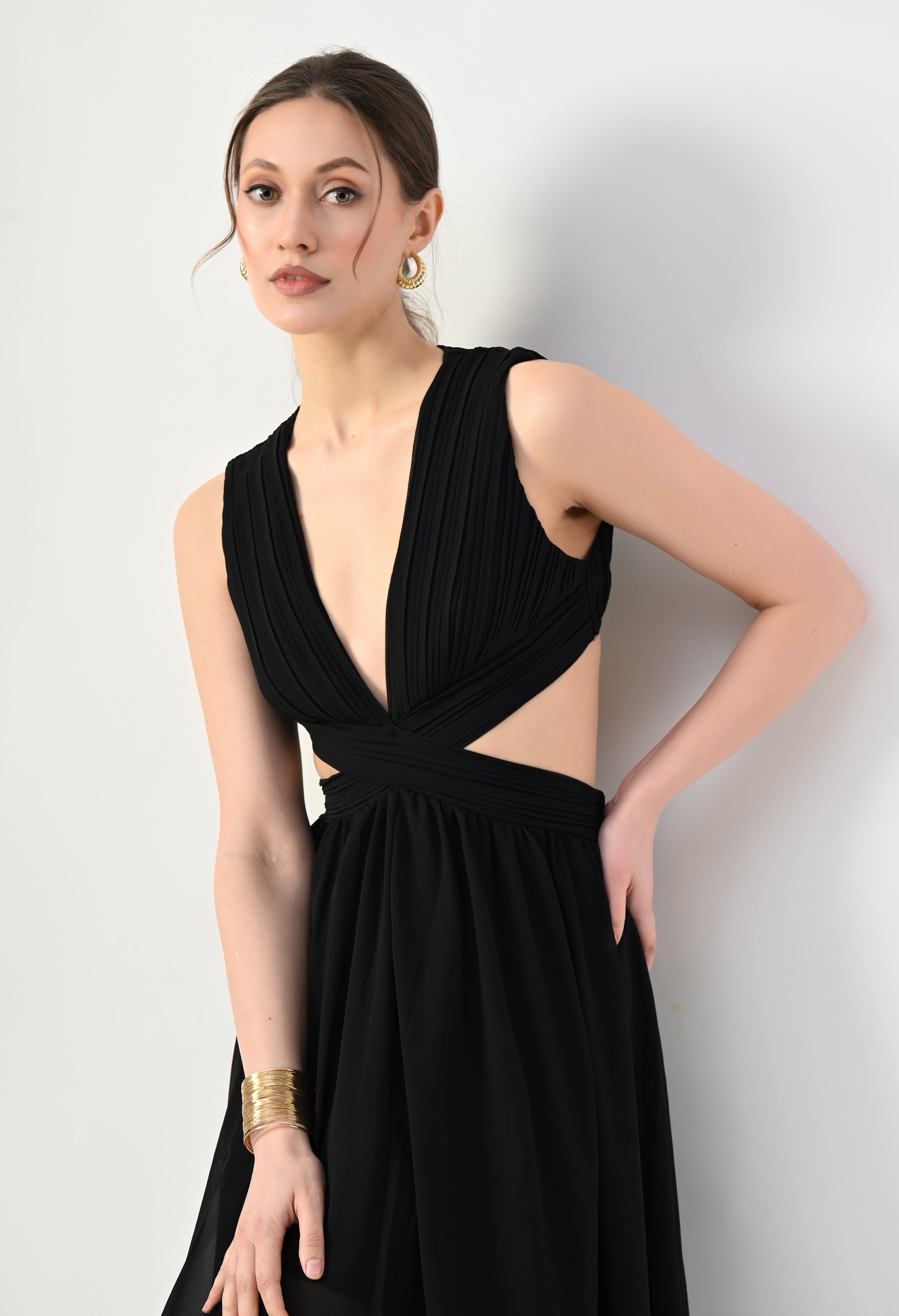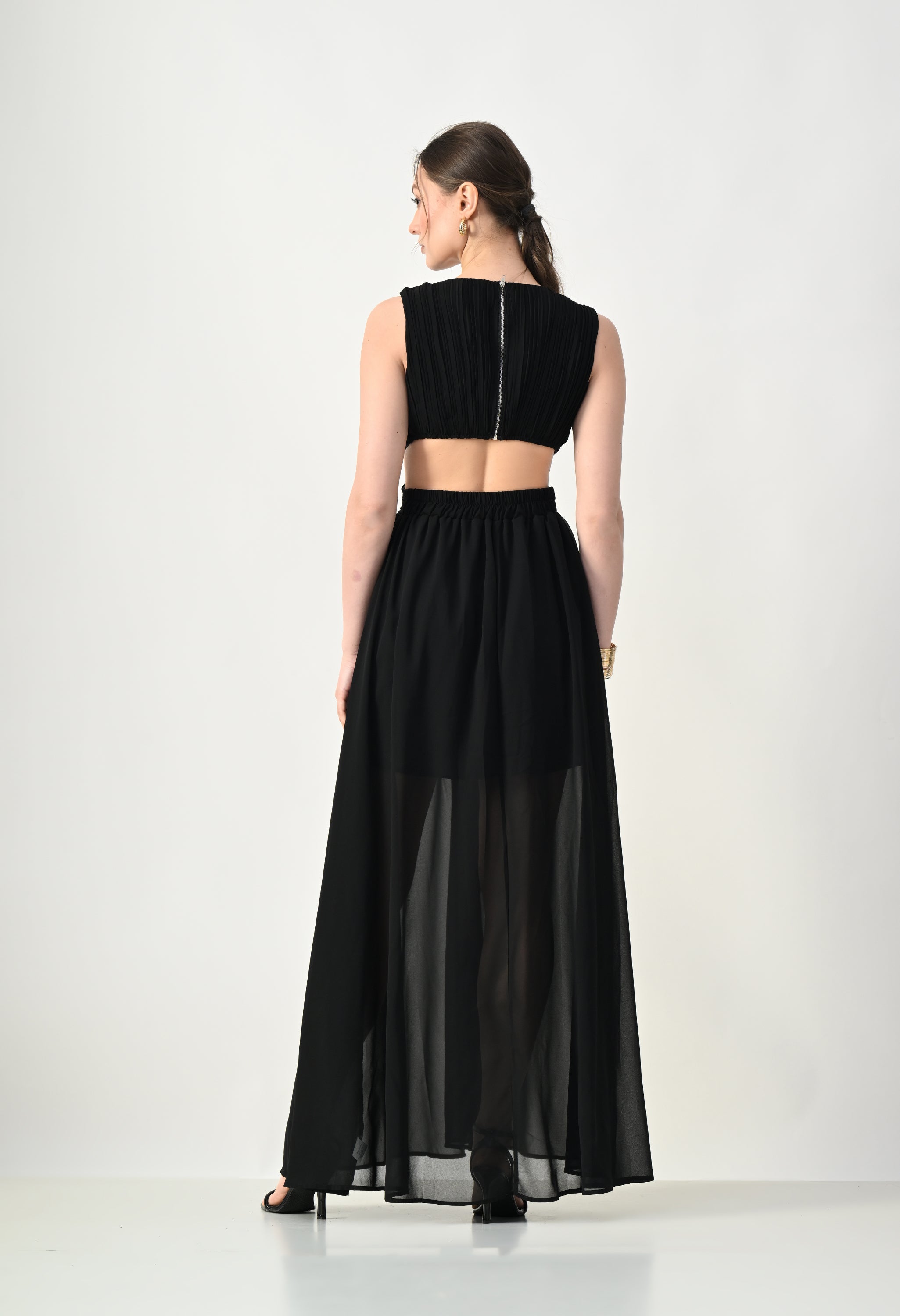 This elegant maxi dress features a pleated bodice with a deep V-neckline that creates a flattering and elongated silhouette. The front design highlights a cross-wrap waist detail that enhances the shape while adding a sculpted visual element. A subtle waist cut-out connects the bodice to the flowing skirt, giving the dress a modern and airy feel. The skirt falls in a soft, sheer layered silhouette that moves gracefully, while the back features a cropped pleated top with a center zipper and an elasticated waistband on the skirt for a comfortable and secure fit.