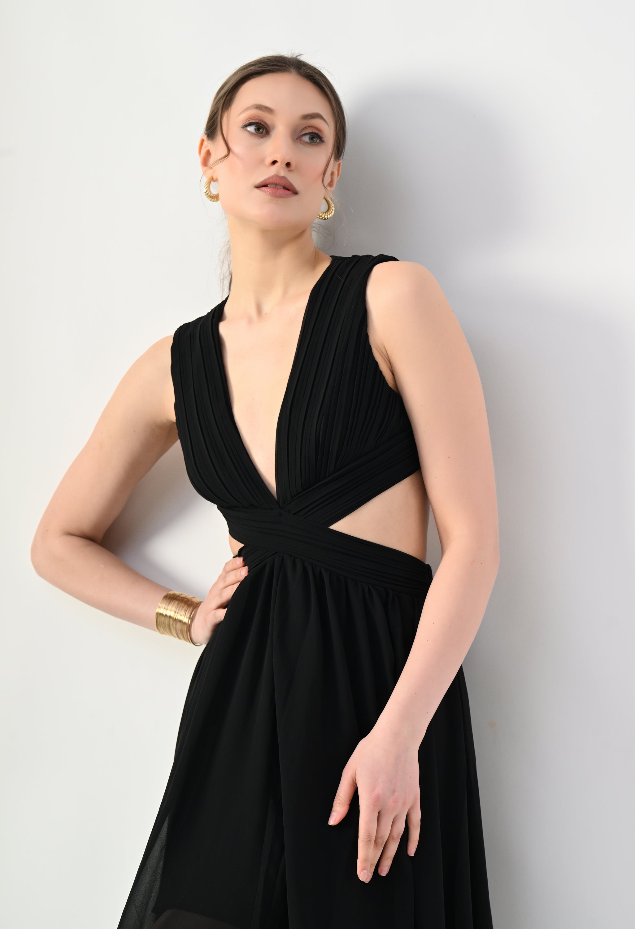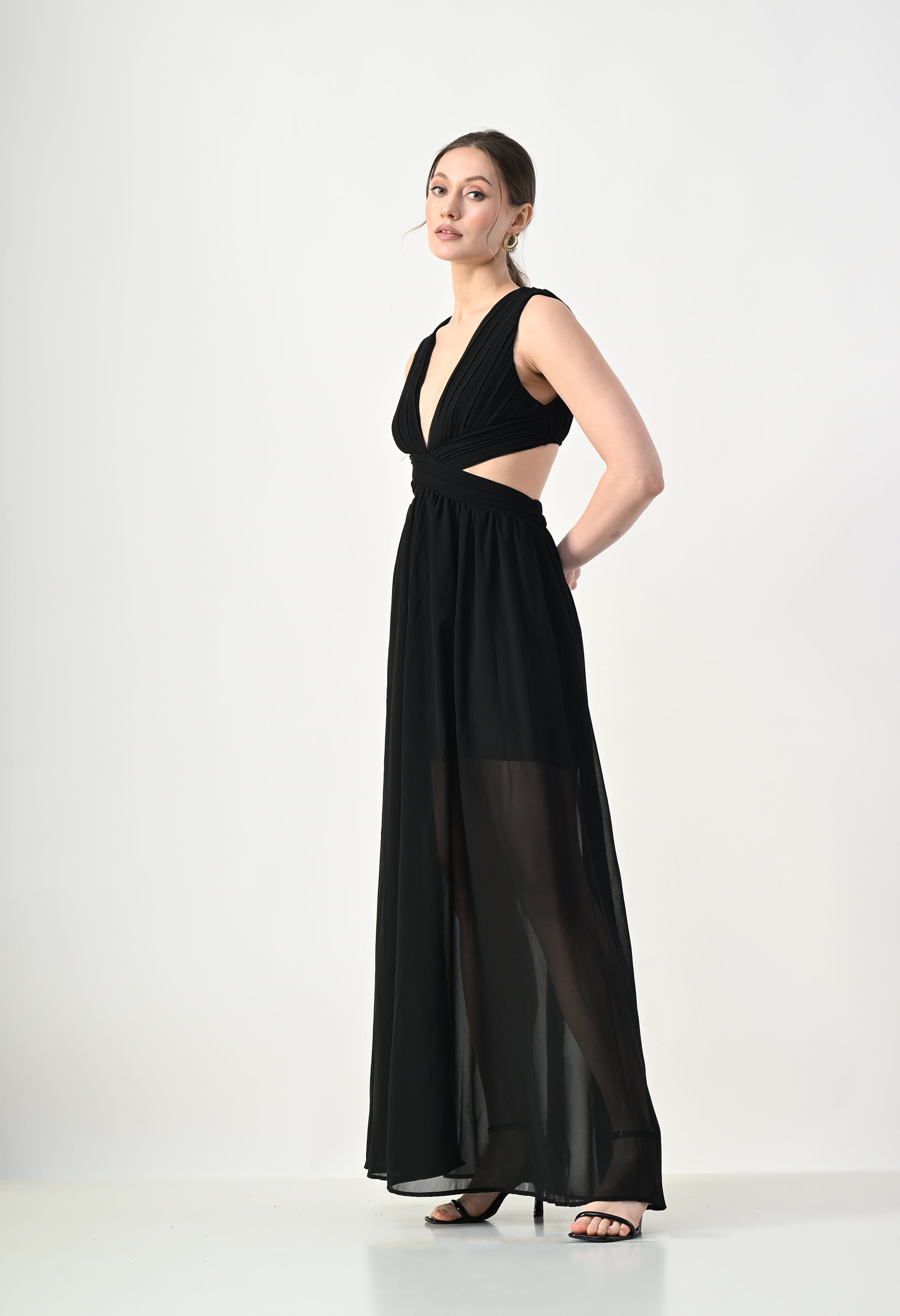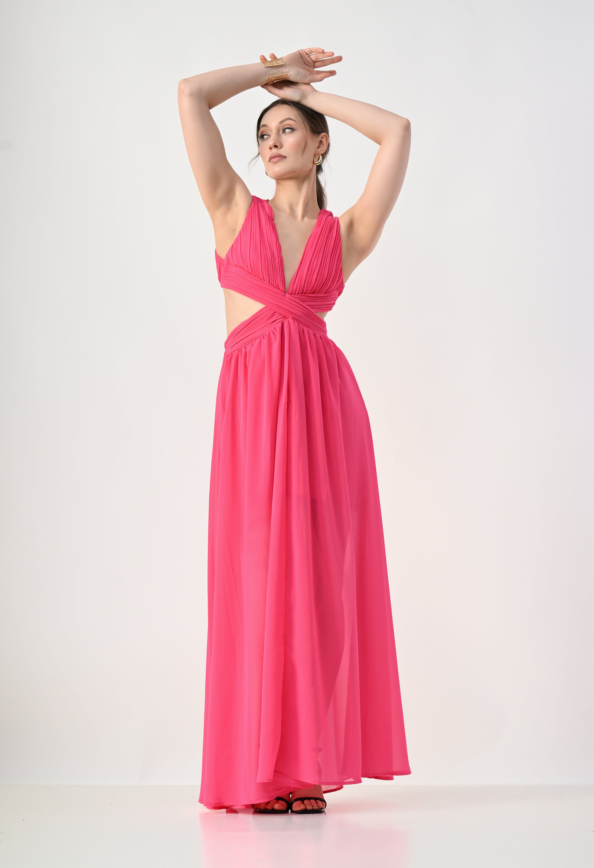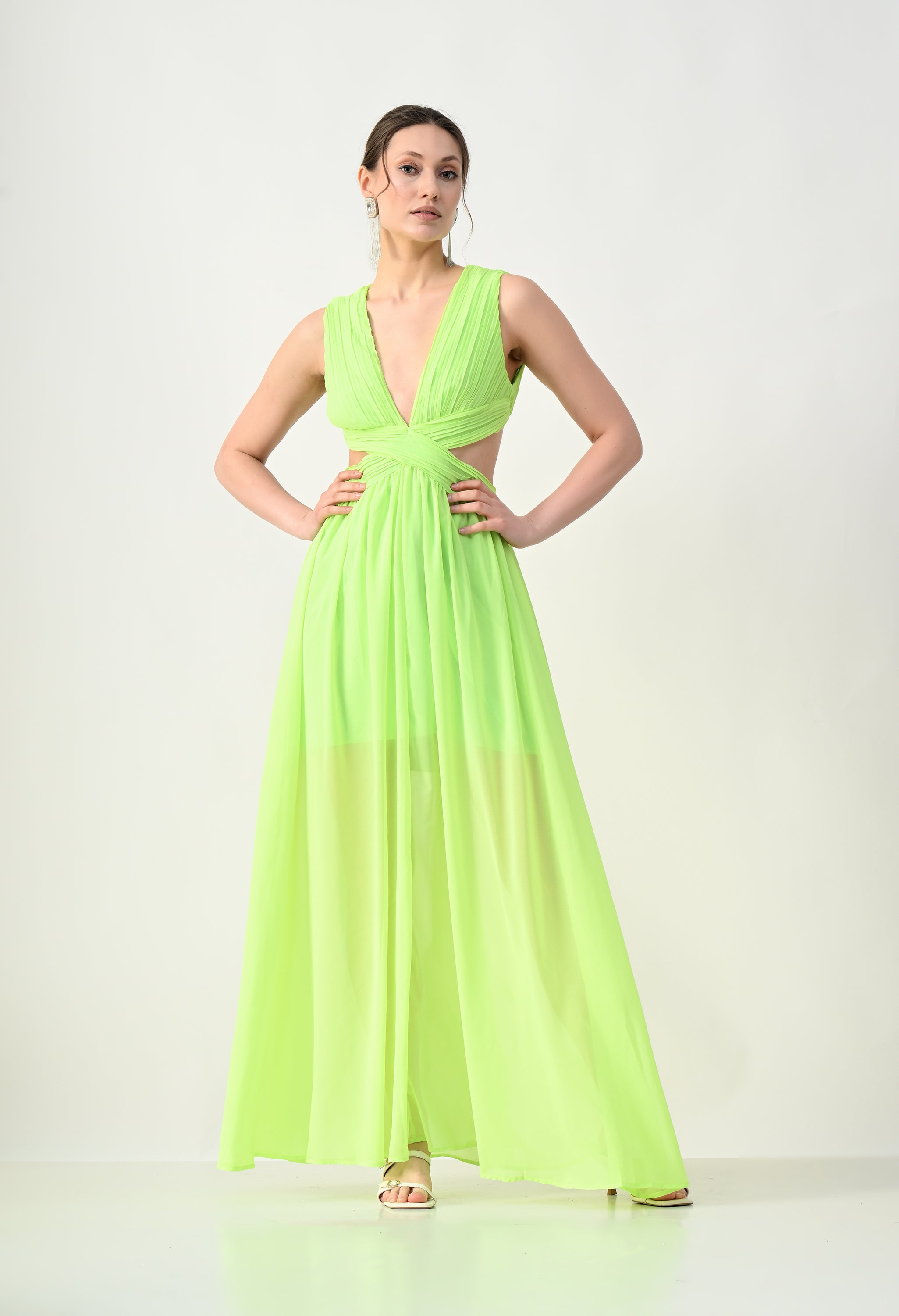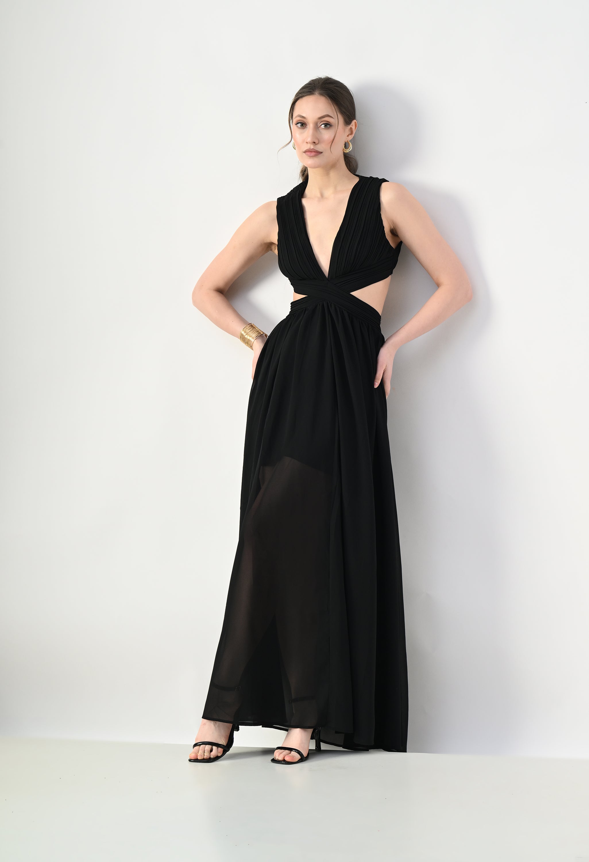 This elegant maxi dress features a pleated bodice with a deep V-neckline that creates a flattering and elongated silhouette. The front design highlights a cross-wrap waist detail that enhances the shape while adding a sculpted visual element. A subtle waist cut-out connects the bodice to the flowing skirt, giving the dress a modern and airy feel. The skirt falls in a soft, sheer layered silhouette that moves gracefully, while the back features a cropped pleated top with a center zipper and an elasticated waistband on the skirt for a comfortable and secure fit.