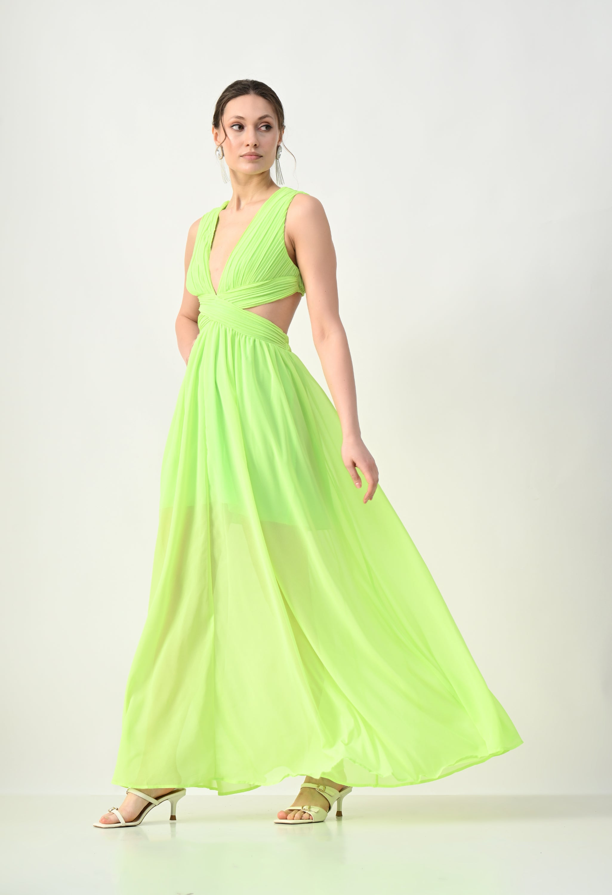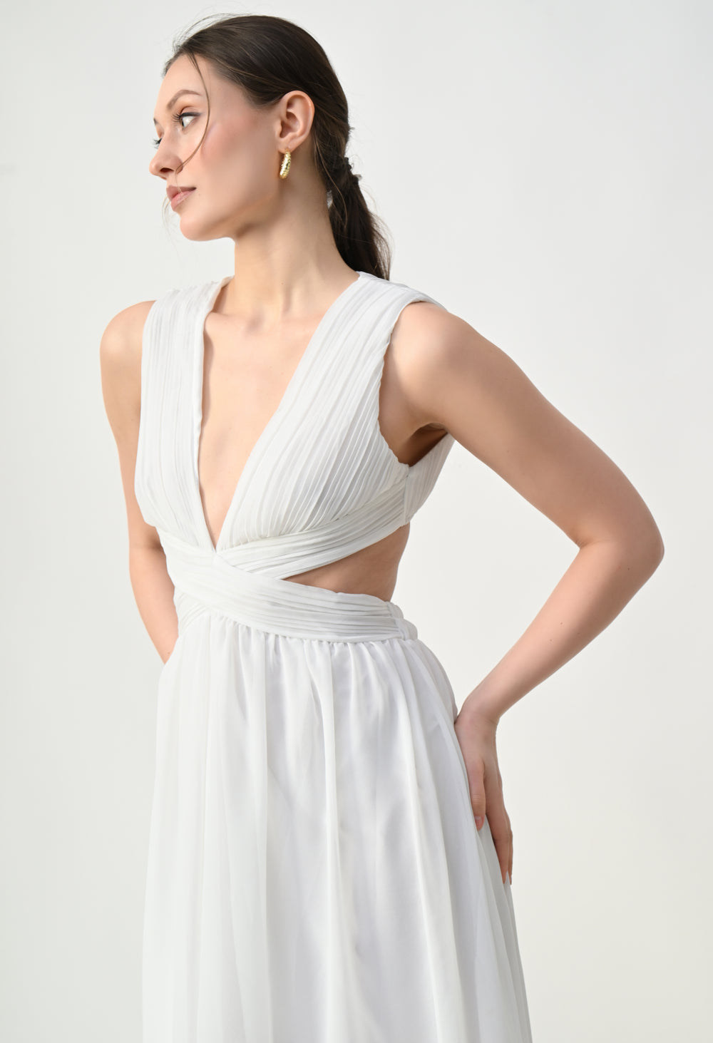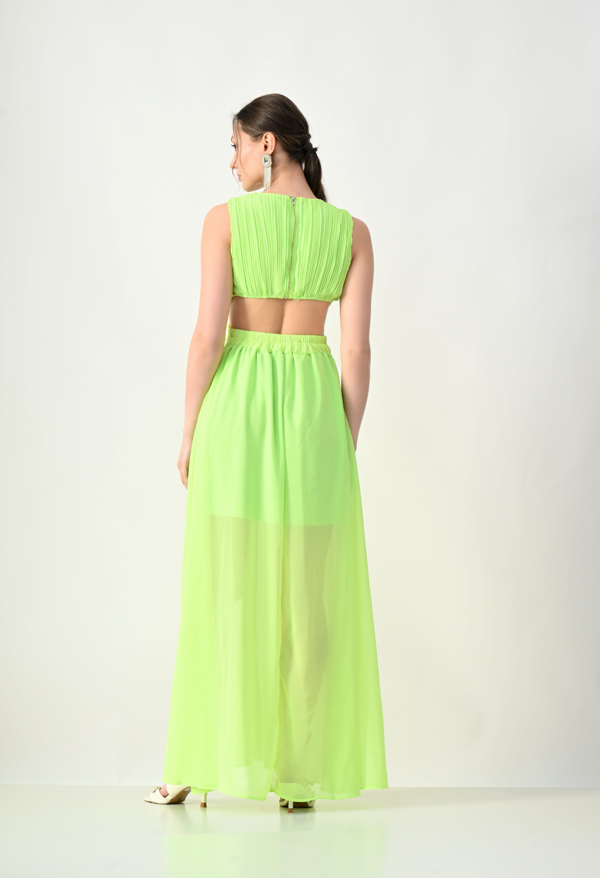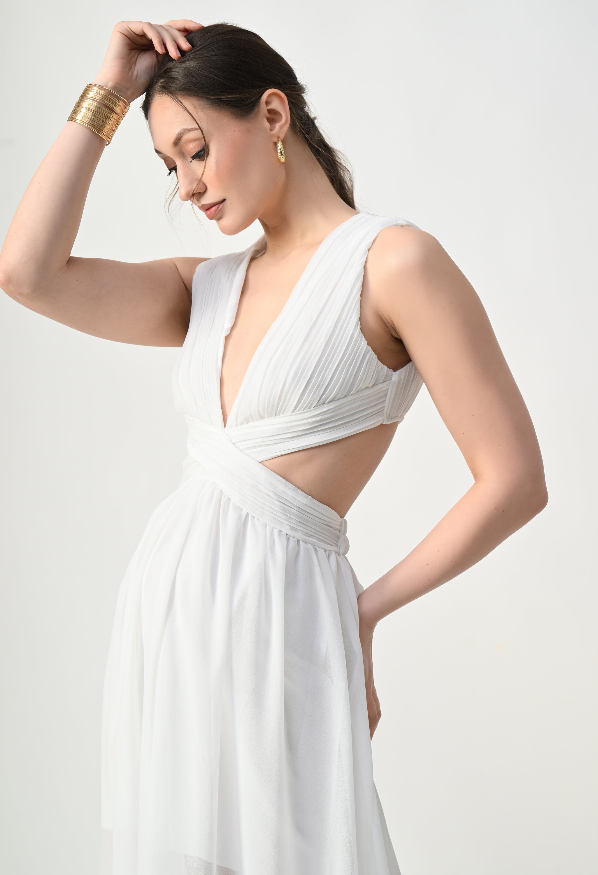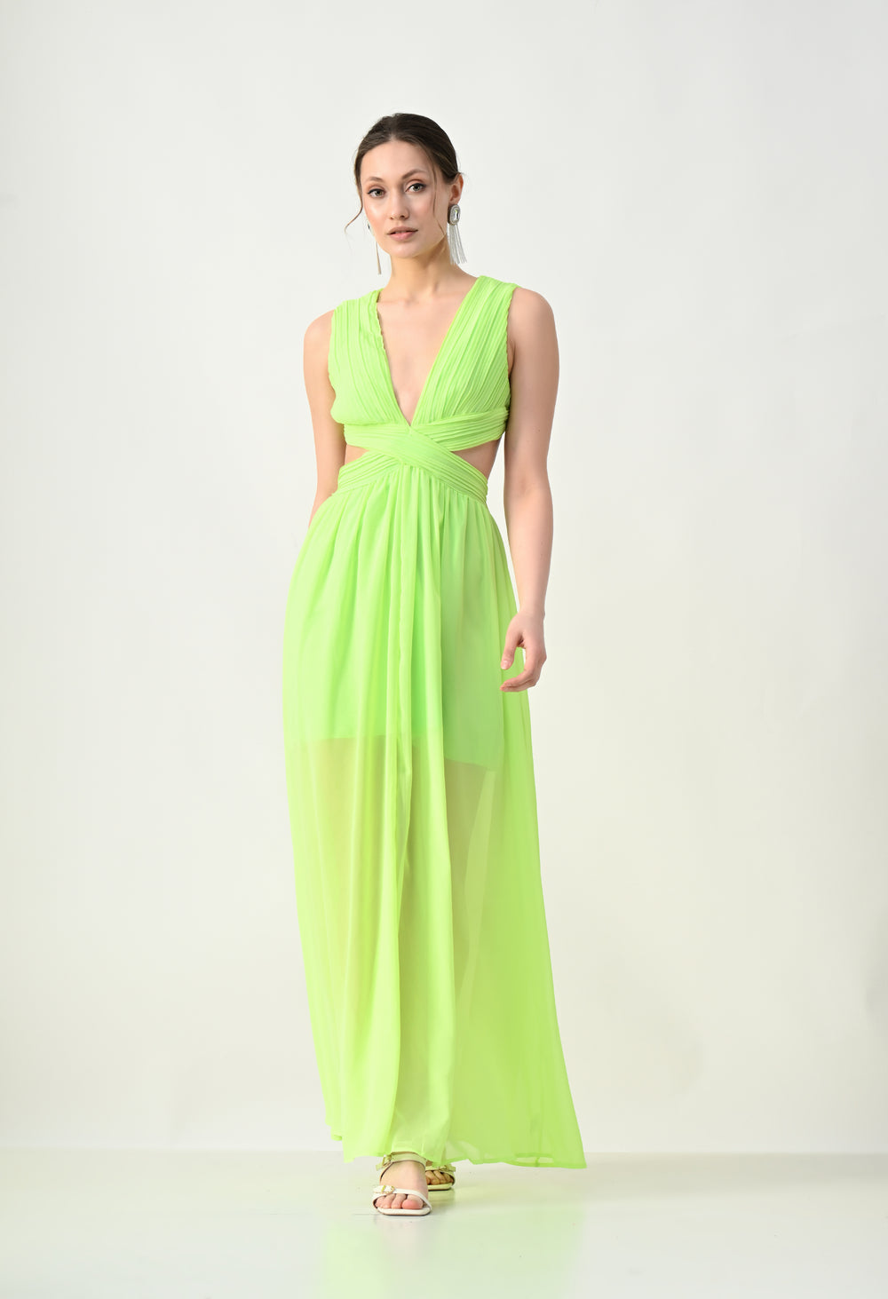 This elegant maxi dress features a pleated bodice with a deep V-neckline that creates a flattering and elongated silhouette. The front design highlights a cross-wrap waist detail that enhances the shape while adding a sculpted visual element. A subtle waist cut-out connects the bodice to the flowing skirt, giving the dress a modern and airy feel. The skirt falls in a soft, sheer layered silhouette that moves gracefully, while the back features a cropped pleated top with a center zipper and an elasticated waistband on the skirt for a comfortable and secure fit.