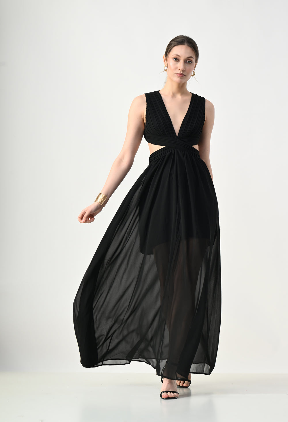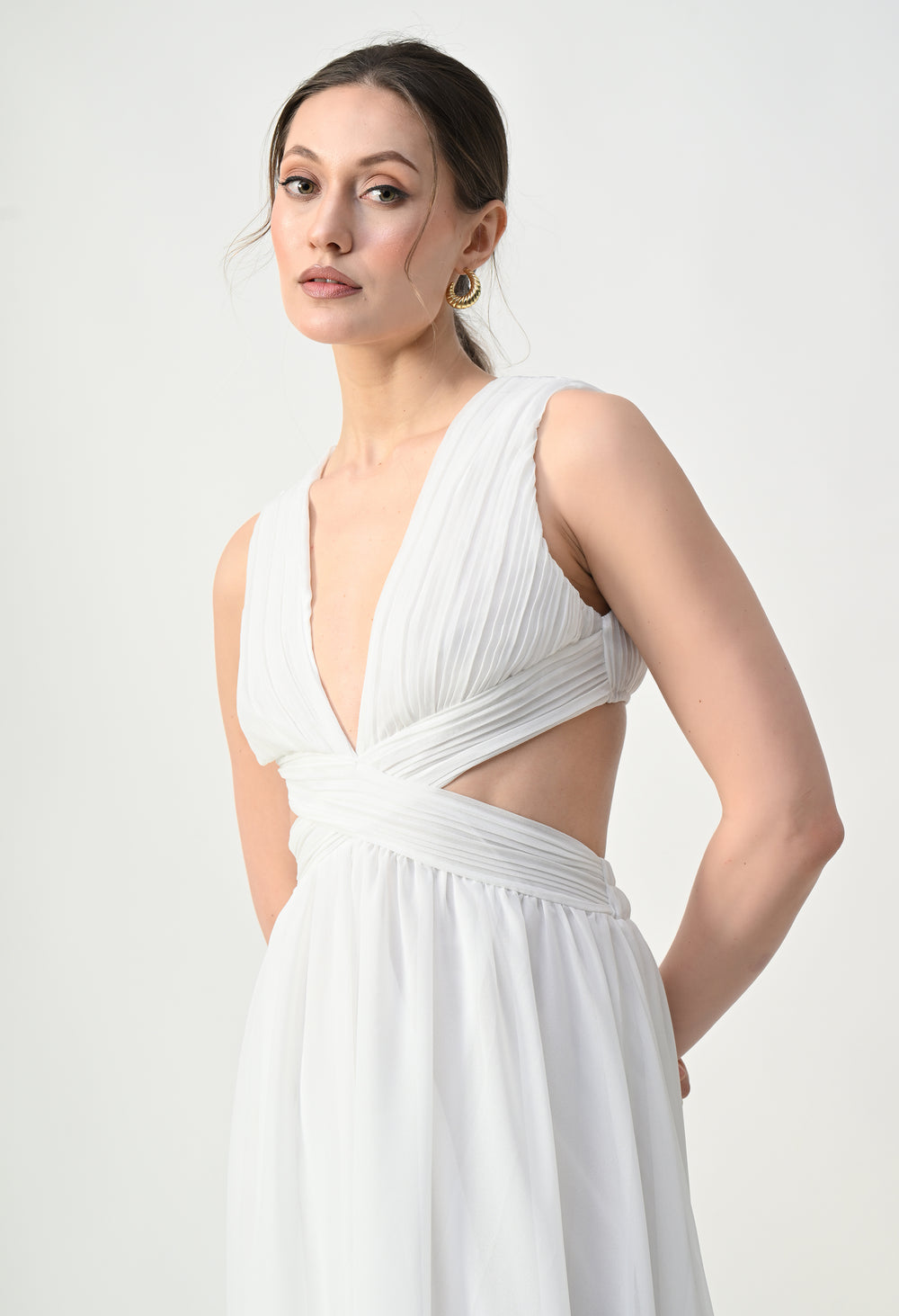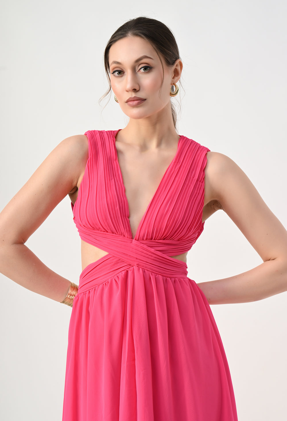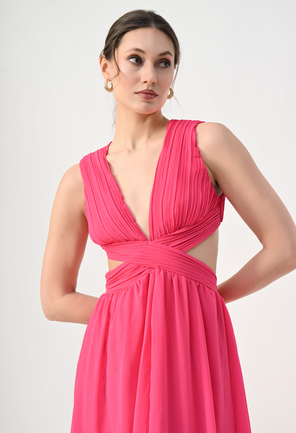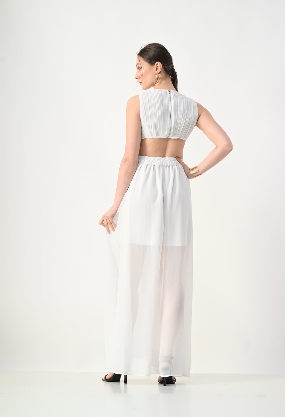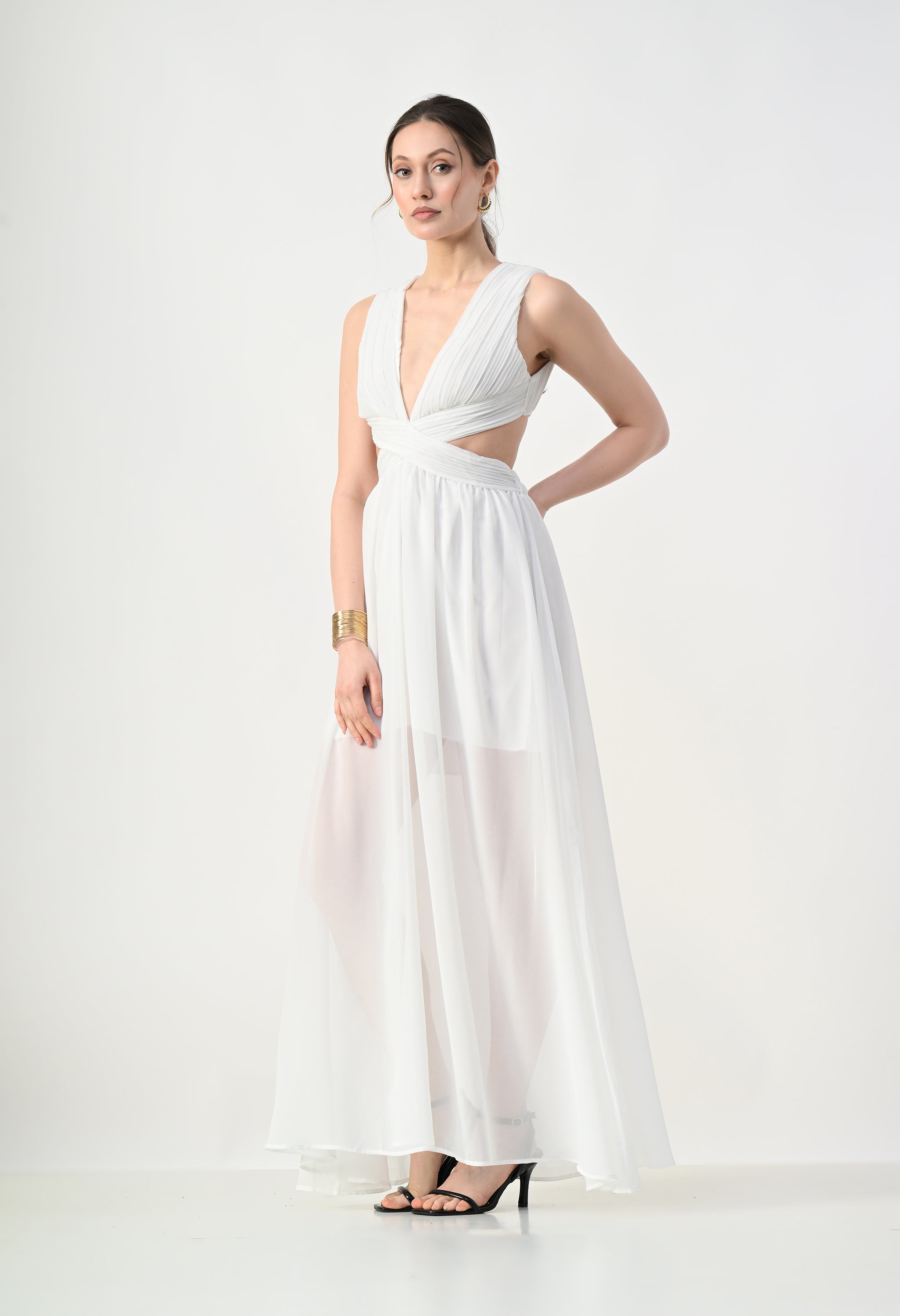 This elegant maxi dress features a pleated bodice with a deep V-neckline that creates a flattering and elongated silhouette. The front design highlights a cross-wrap waist detail that enhances the shape while adding a sculpted visual element. A subtle waist cut-out connects the bodice to the flowing skirt, giving the dress a modern and airy feel. The skirt falls in a soft, sheer layered silhouette that moves gracefully, while the back features a cropped pleated top with a center zipper and an elasticated waistband on the skirt for a comfortable and secure fit.