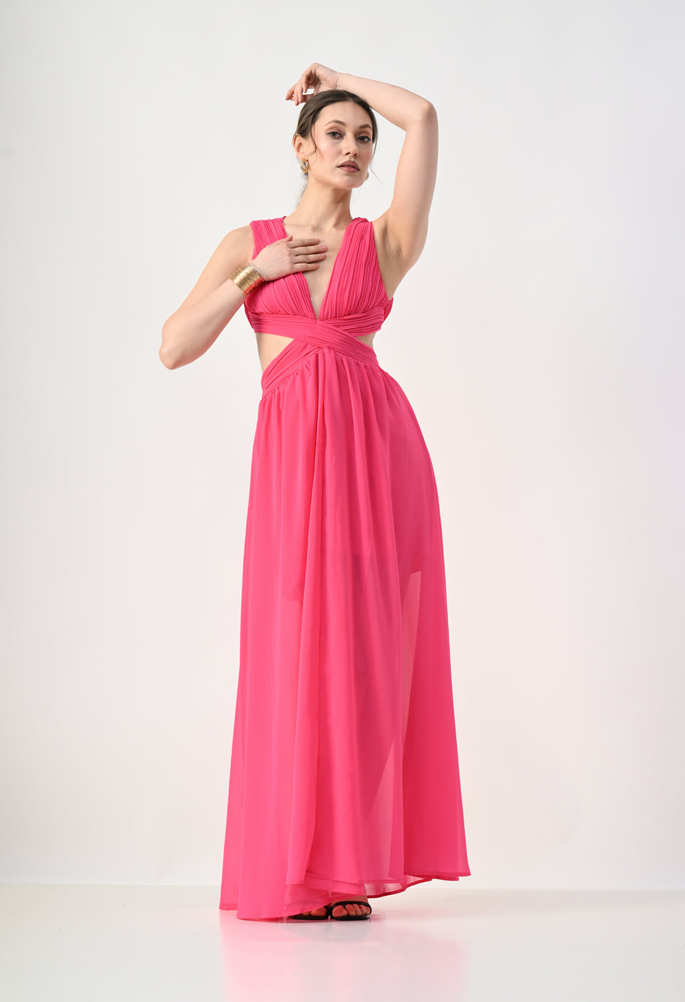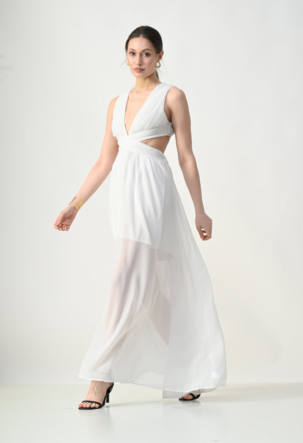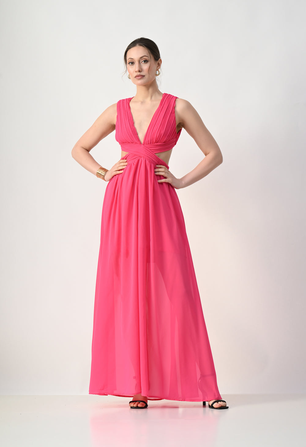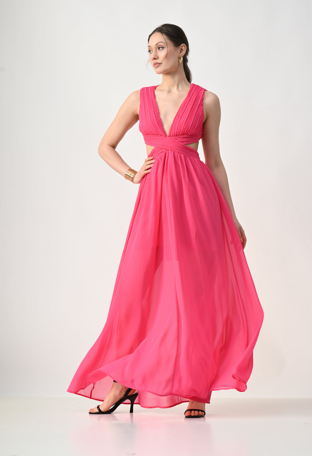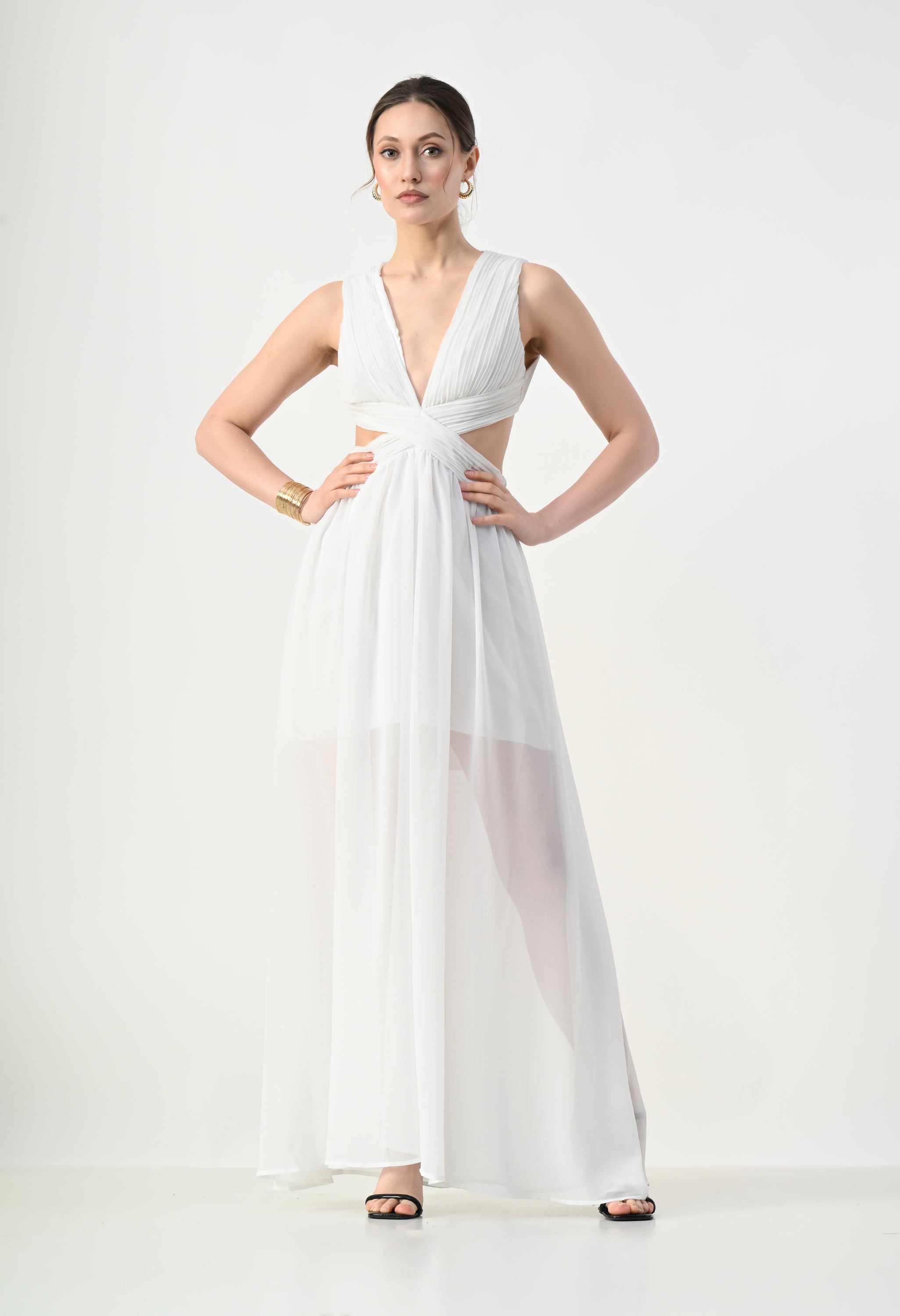 This elegant maxi dress features a pleated bodice with a deep V-neckline that creates a flattering and elongated silhouette. The front design highlights a cross-wrap waist detail that enhances the shape while adding a sculpted visual element. A subtle waist cut-out connects the bodice to the flowing skirt, giving the dress a modern and airy feel. The skirt falls in a soft, sheer layered silhouette that moves gracefully, while the back features a cropped pleated top with a center zipper and an elasticated waistband on the skirt for a comfortable and secure fit.