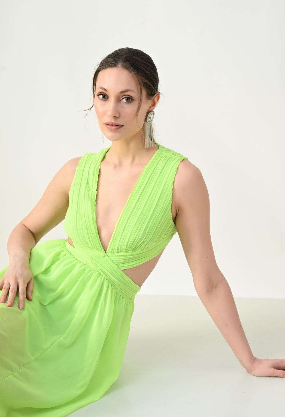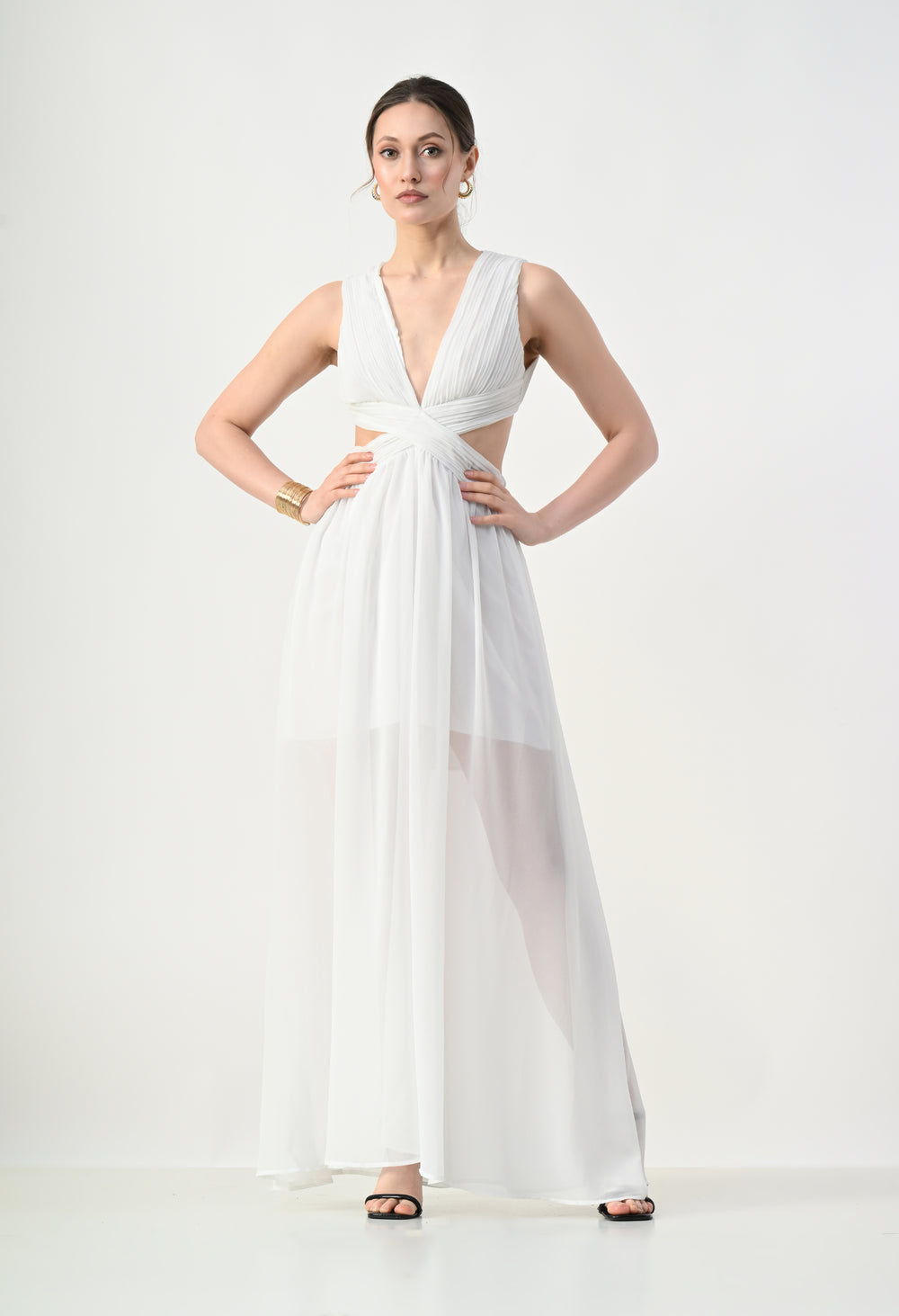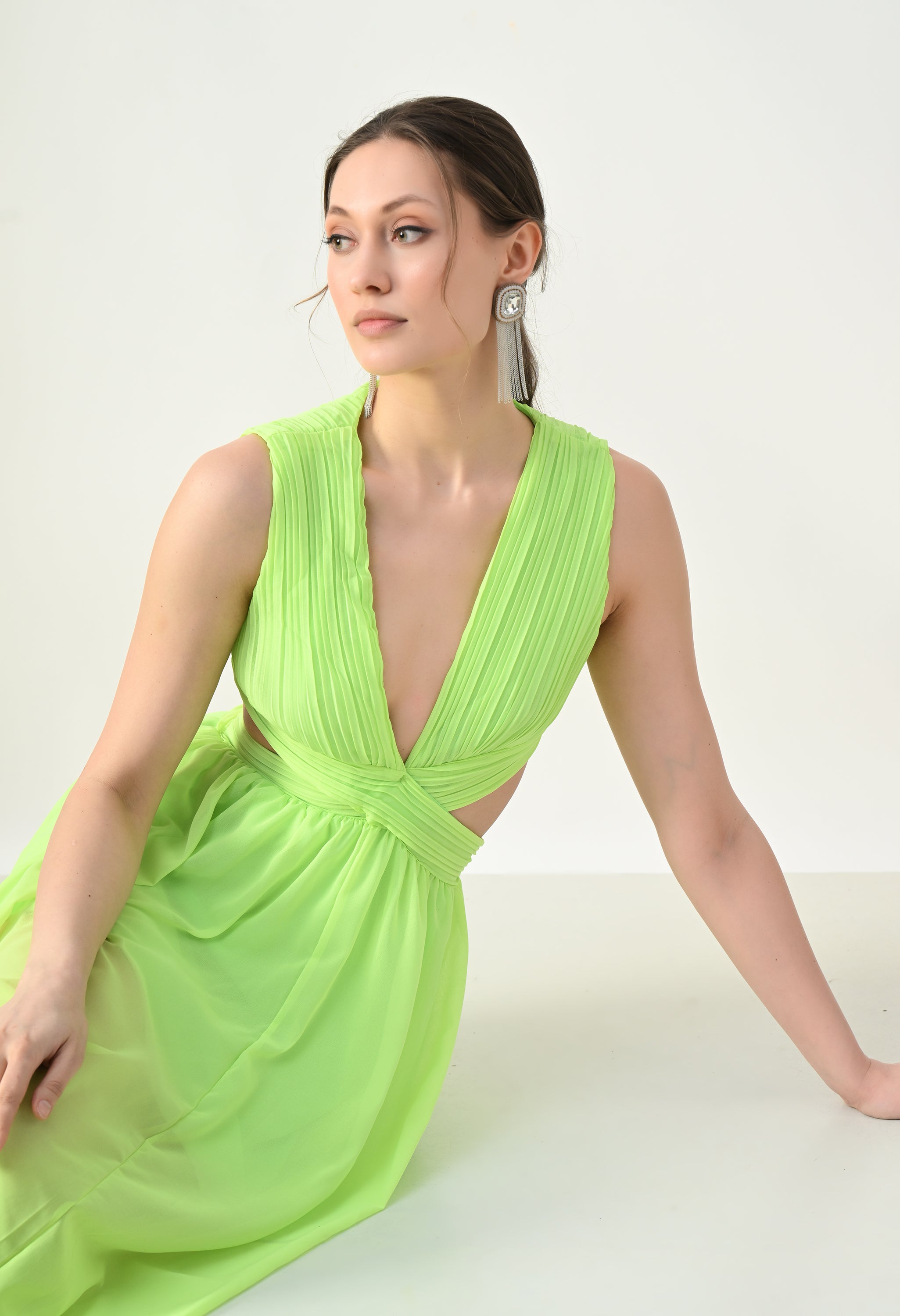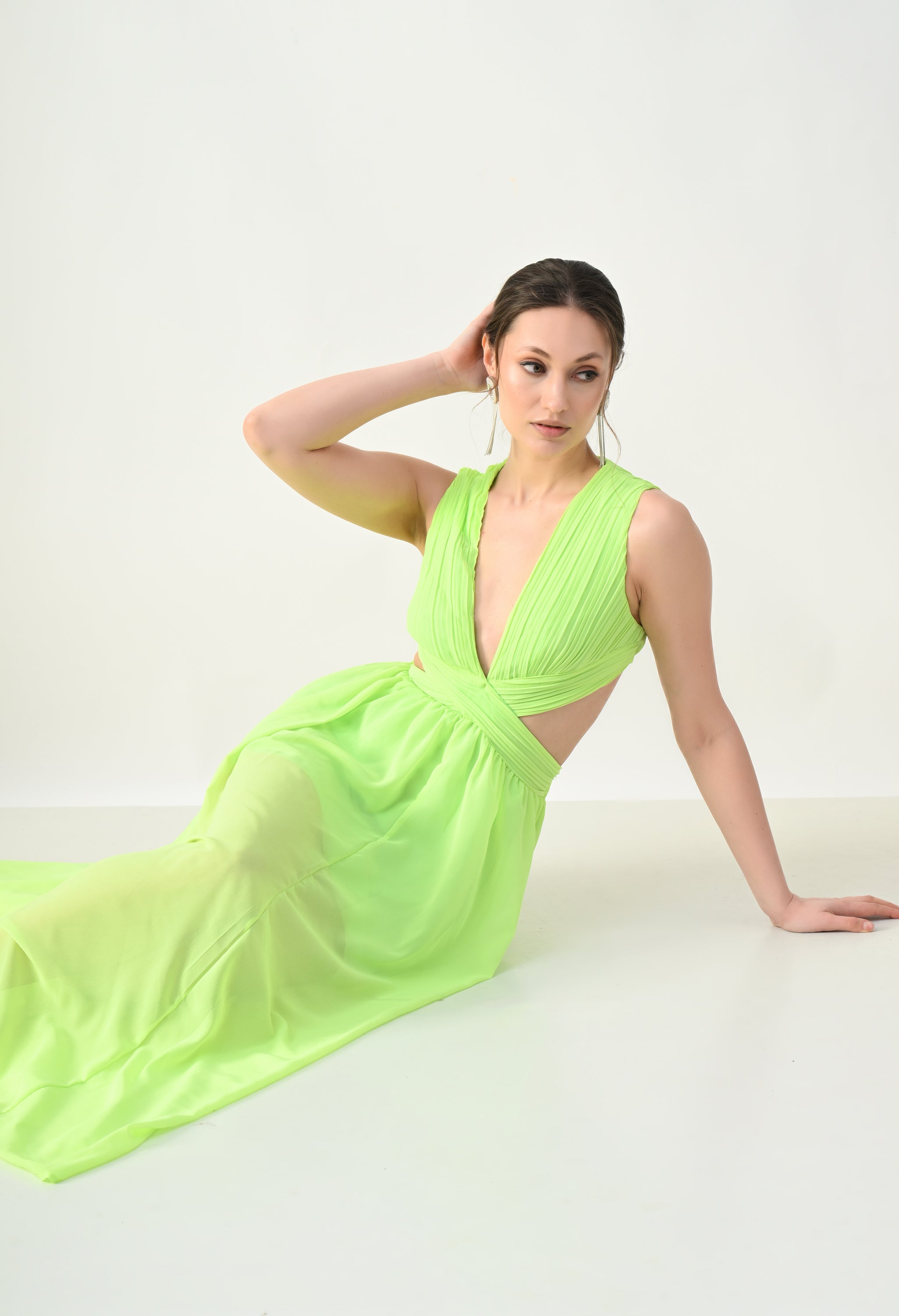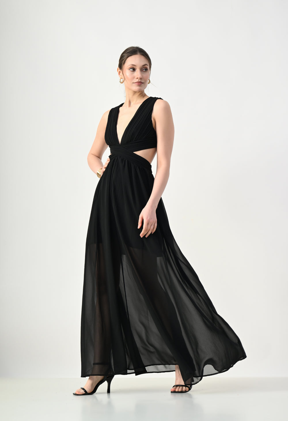 This elegant maxi dress features a pleated bodice with a deep V-neckline that creates a flattering and elongated silhouette. The front design highlights a cross-wrap waist detail that enhances the shape while adding a sculpted visual element. A subtle waist cut-out connects the bodice to the flowing skirt, giving the dress a modern and airy feel. The skirt falls in a soft, sheer layered silhouette that moves gracefully, while the back features a cropped pleated top with a center zipper and an elasticated waistband on the skirt for a comfortable and secure fit.