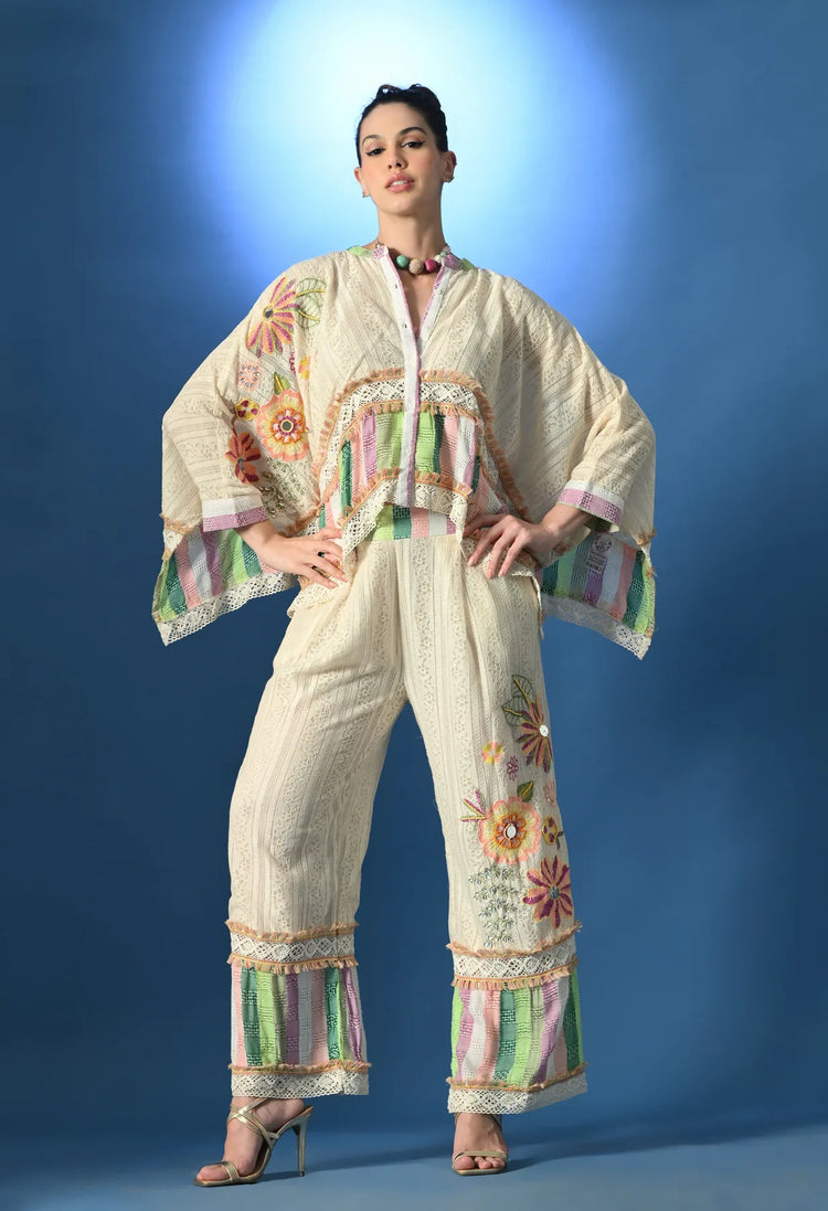 Chic short lace kaftan shirt with straight pants, featuring a round collar, poly pearl buttons, and mirror floral embroidery. Designed with crochet and fringe lace all over, ¾ kaftan sleeves, and multi-jacquard details at waist and hem. The straight lace pants come with mirror embroidery and jacquard patchwork, creating a stylish, breezy, and festive co-ord set.