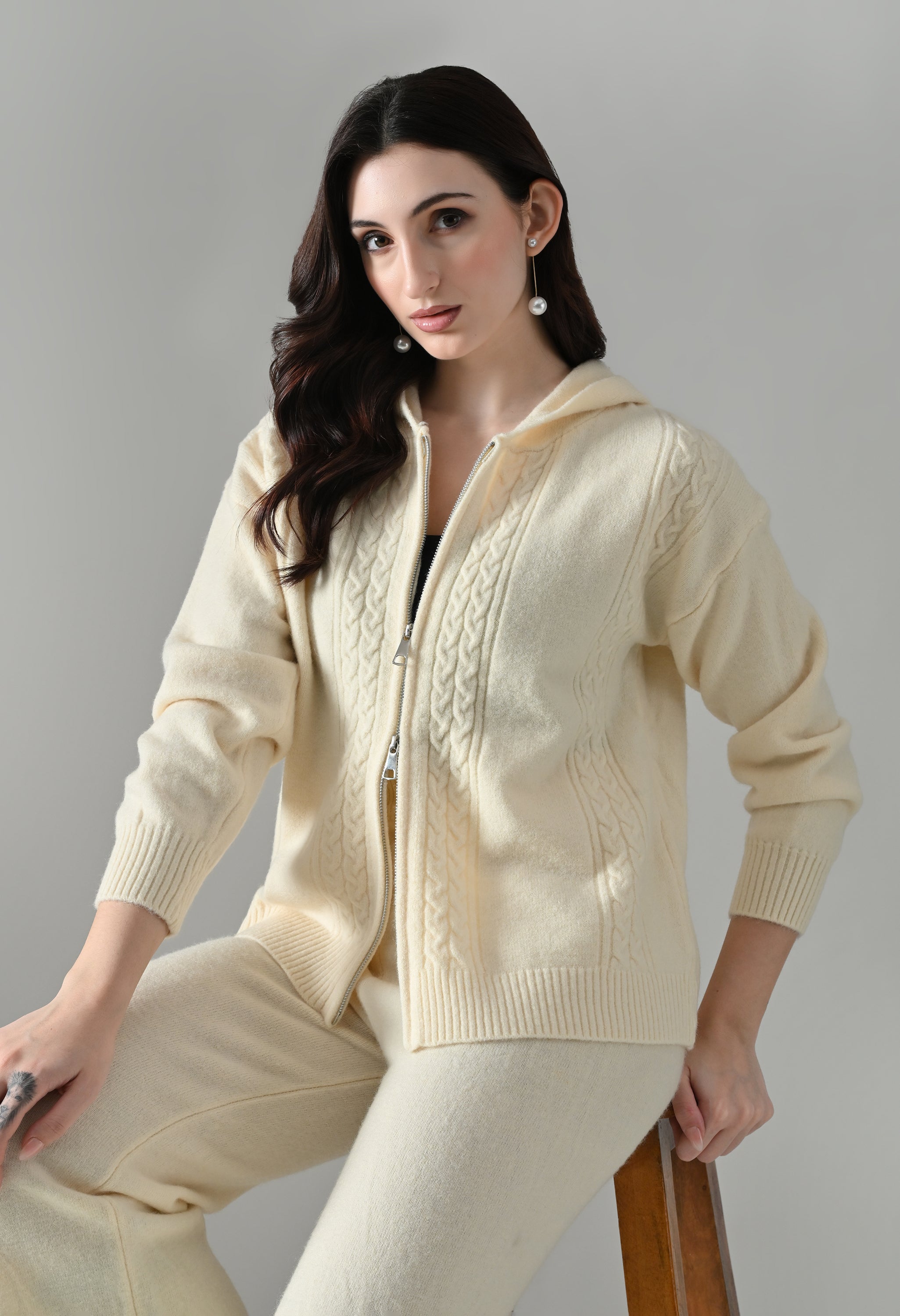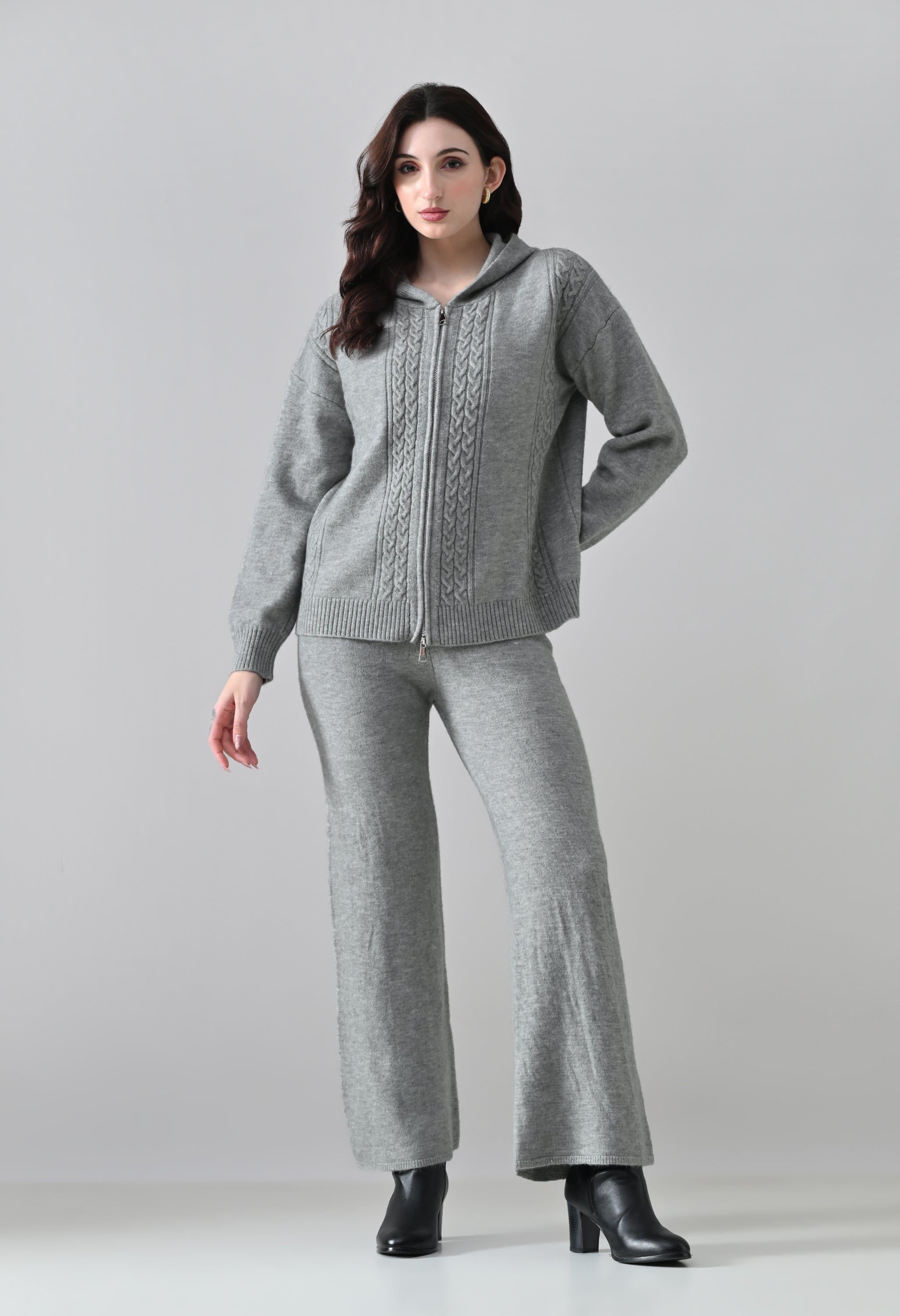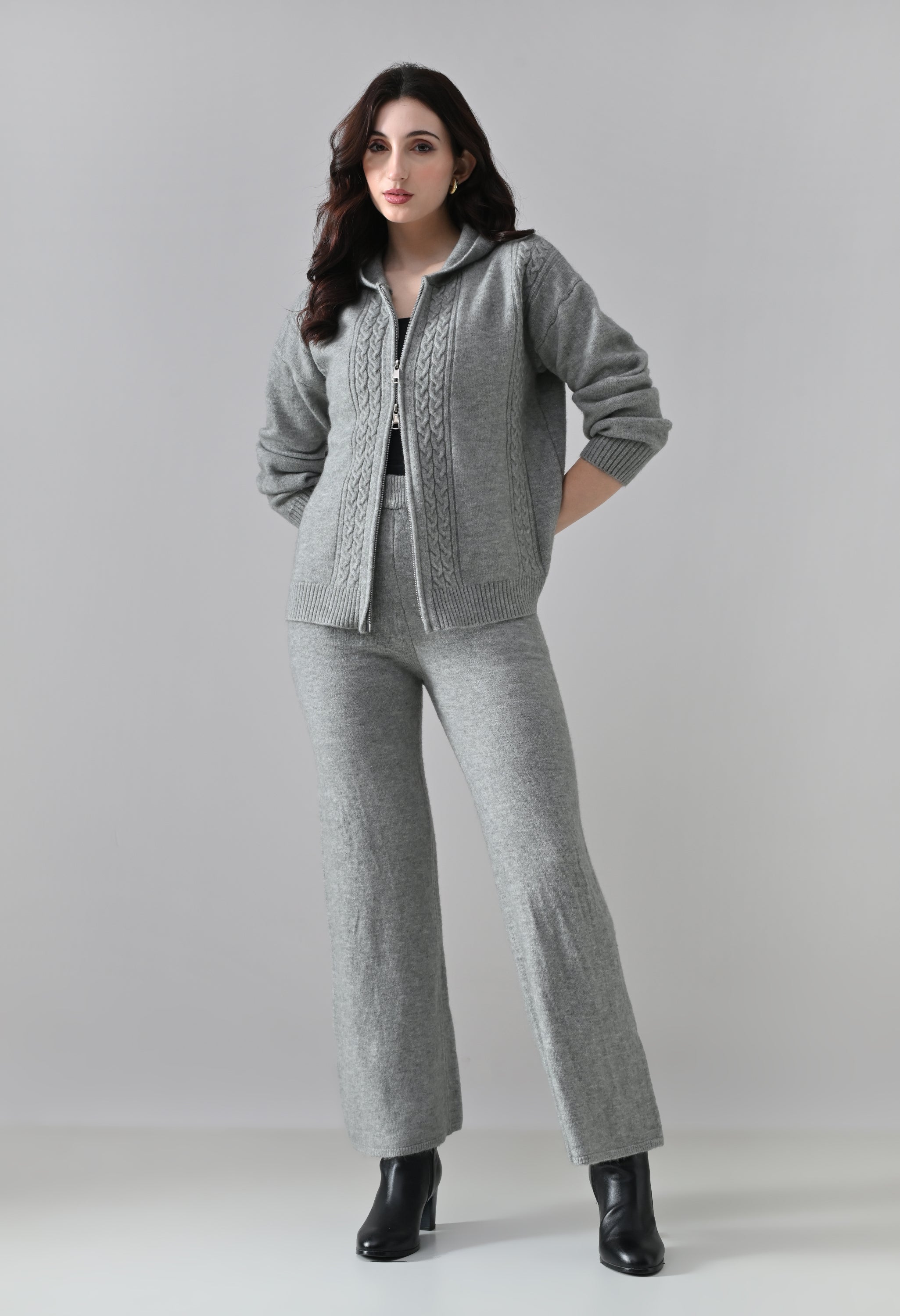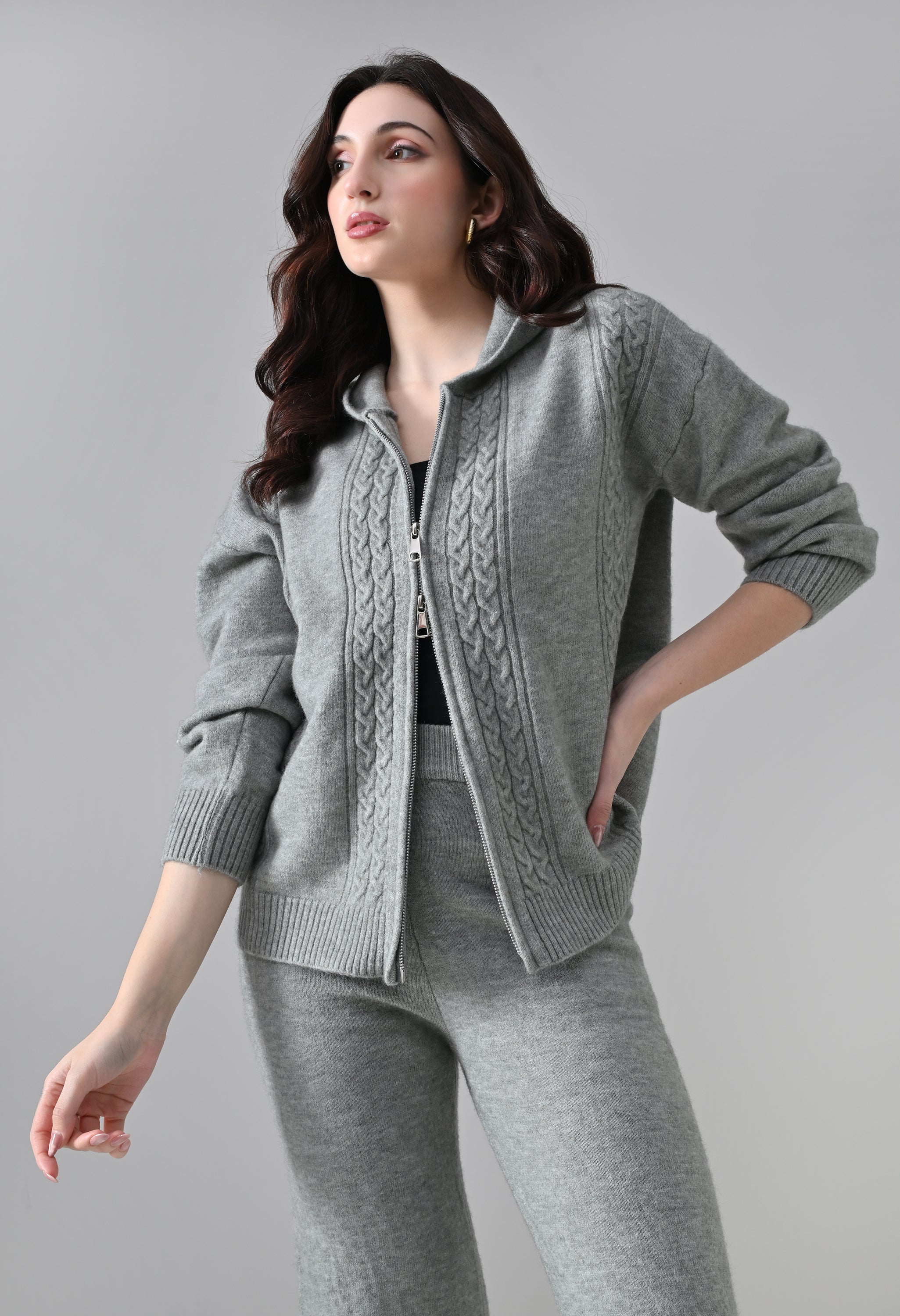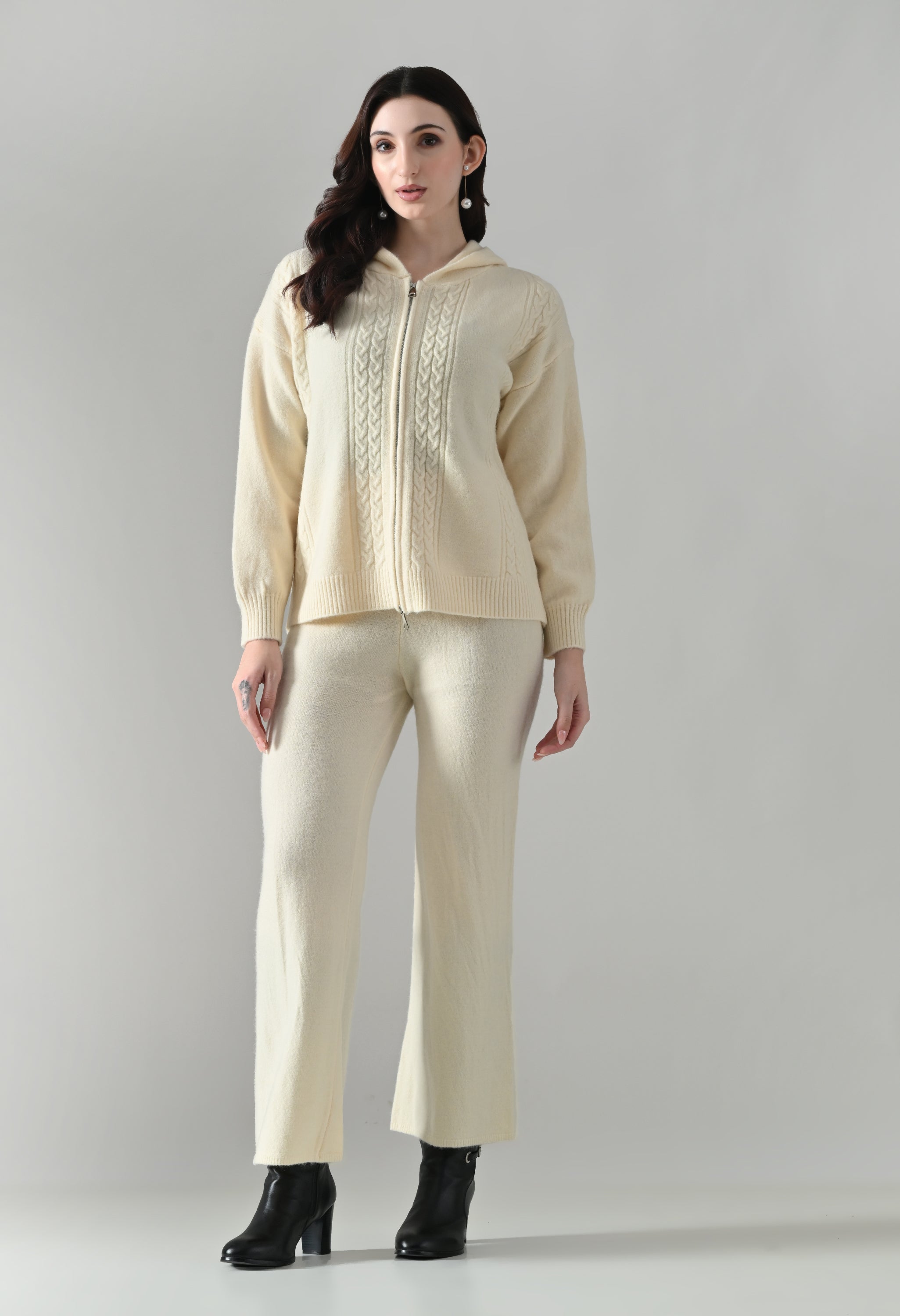 This soft woolen-blend knit co-ord set combines warmth, comfort, and everyday style. The hoodie features a front zip-up closure, a cozy hooded neckline, and elegant cable-knit detailing on the front. Full sleeves with ribbed cuffs and a regular-length ribbed hem offer a secure, clean finish. The matching bottoms come with an elasticated waistband and a straight-fit silhouette, ensuring effortless comfort and a relaxed look—perfect for winter lounging or casual outings.
