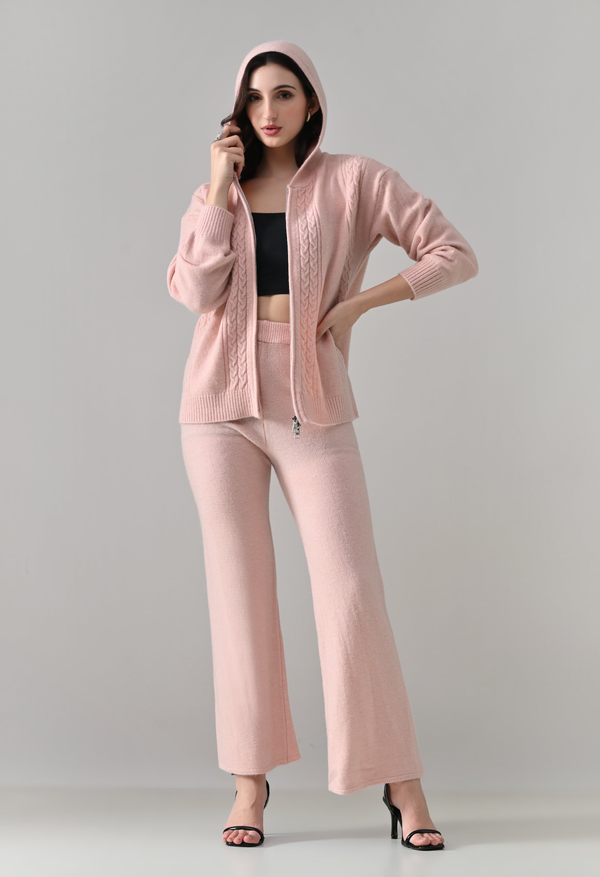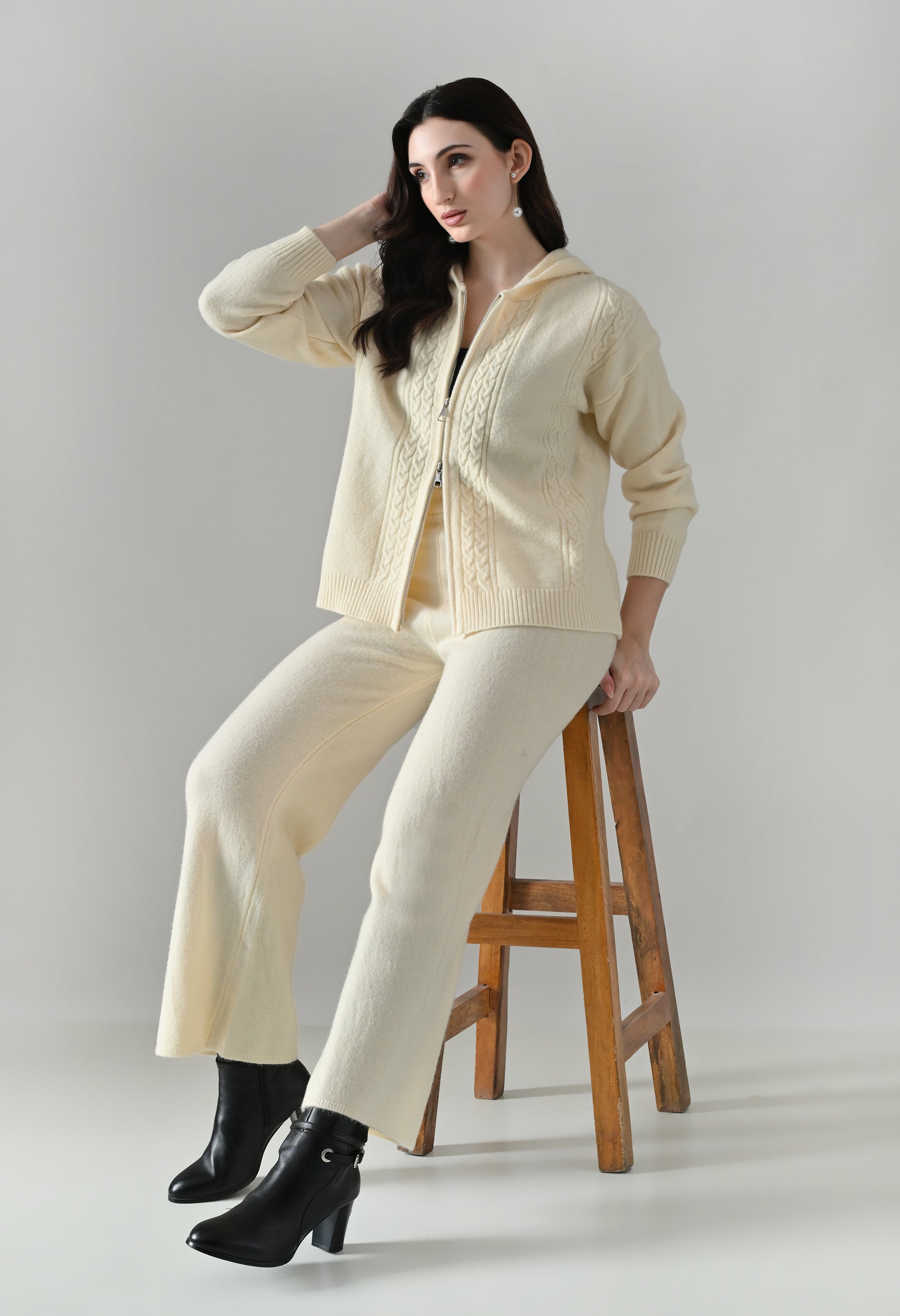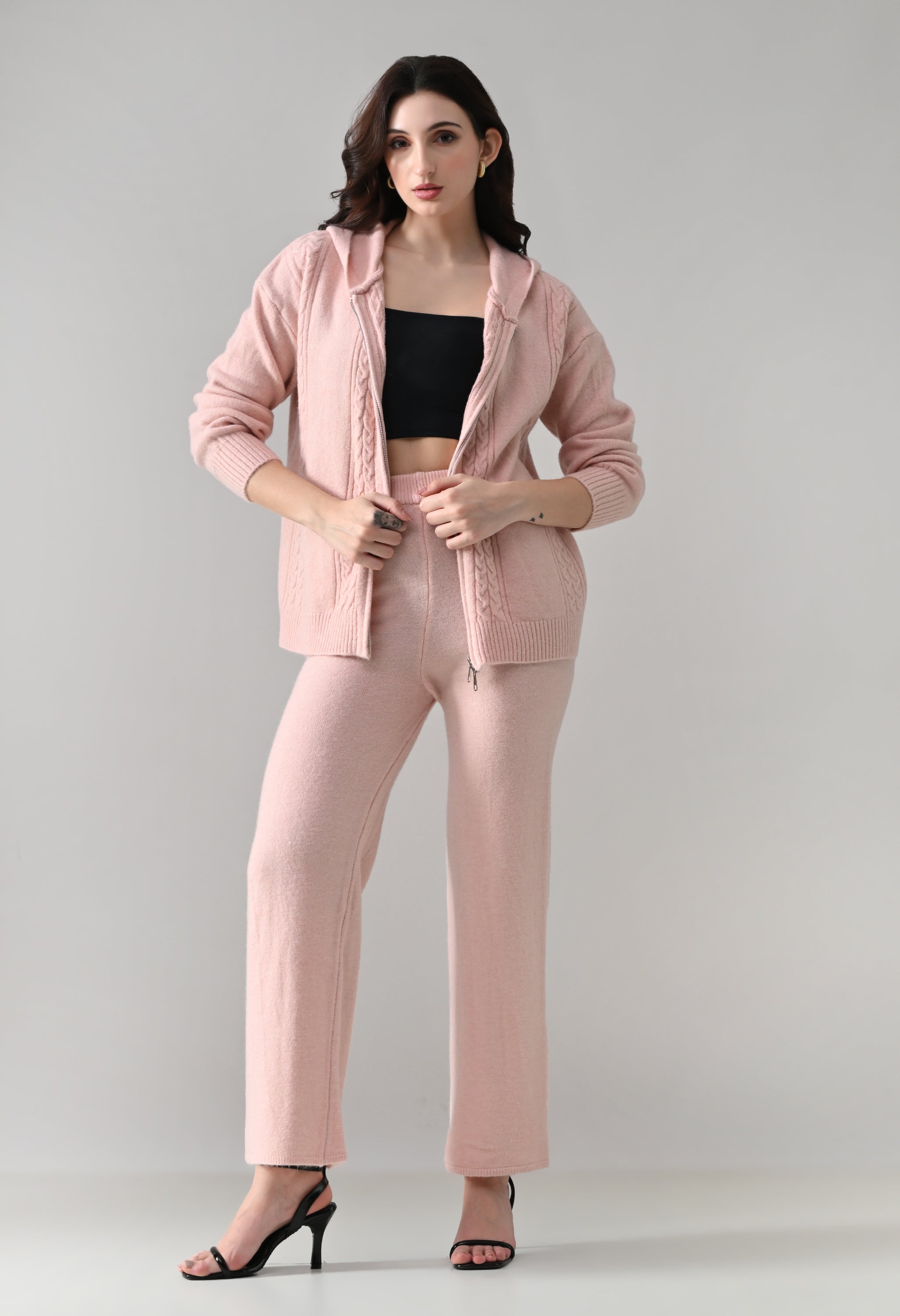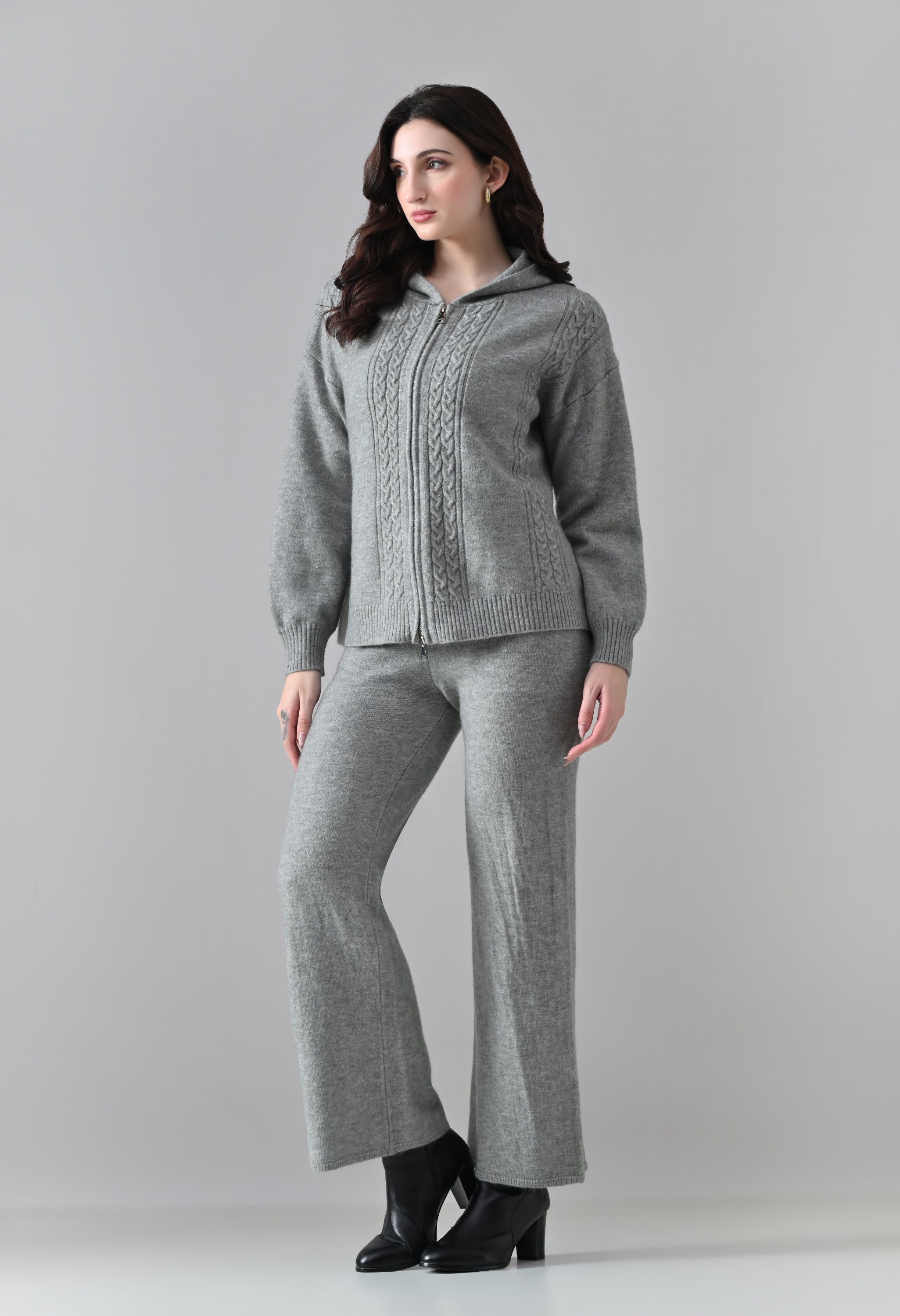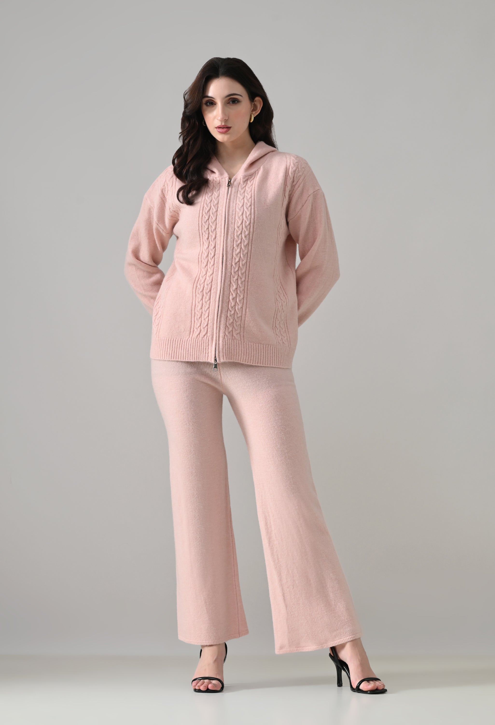 This soft woolen-blend knit co-ord set combines warmth, comfort, and everyday style. The hoodie features a front zip-up closure, a cozy hooded neckline, and elegant cable-knit detailing on the front. Full sleeves with ribbed cuffs and a regular-length ribbed hem offer a secure, clean finish. The matching bottoms come with an elasticated waistband and a straight-fit silhouette, ensuring effortless comfort and a relaxed look—perfect for winter lounging or casual outings.