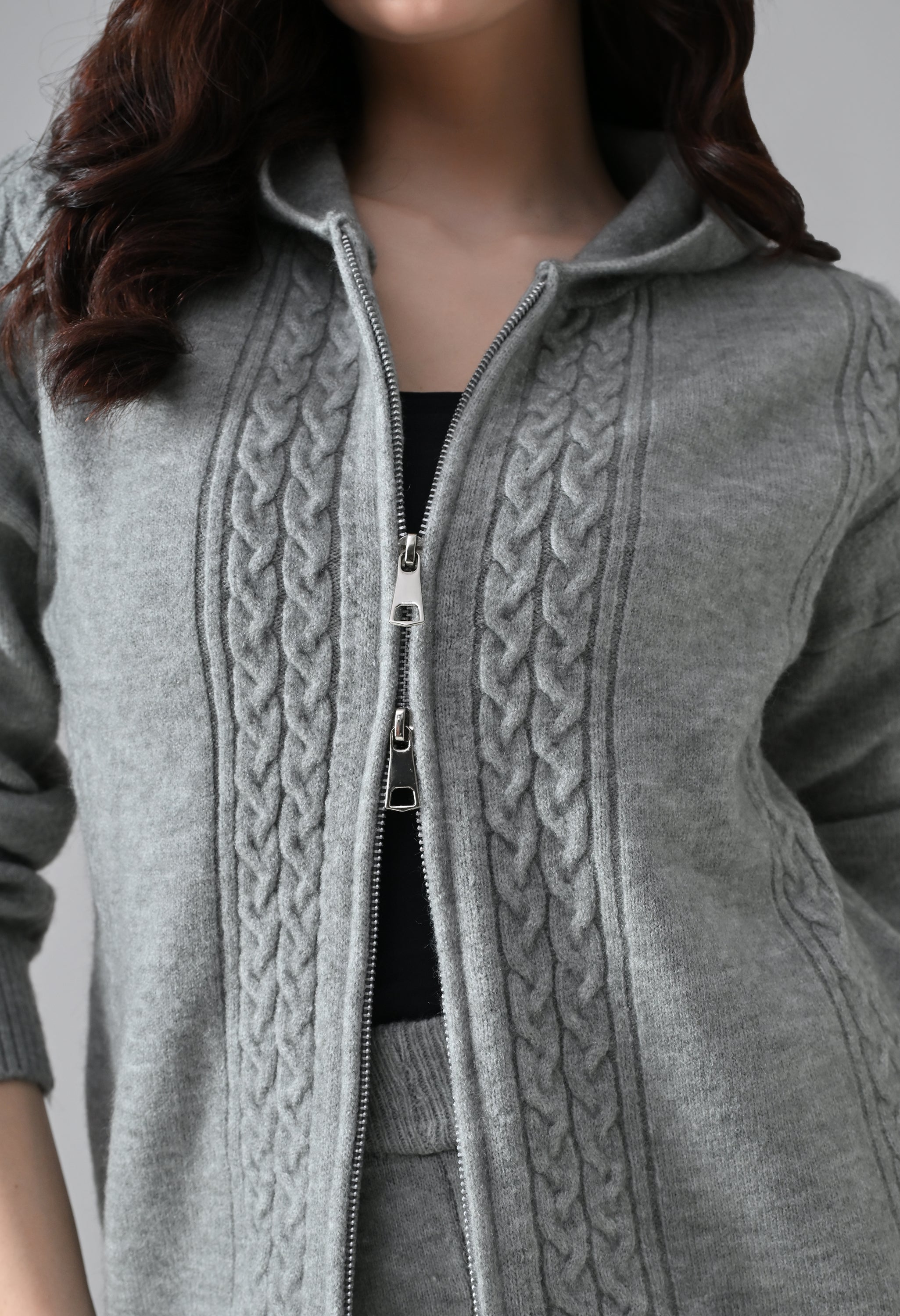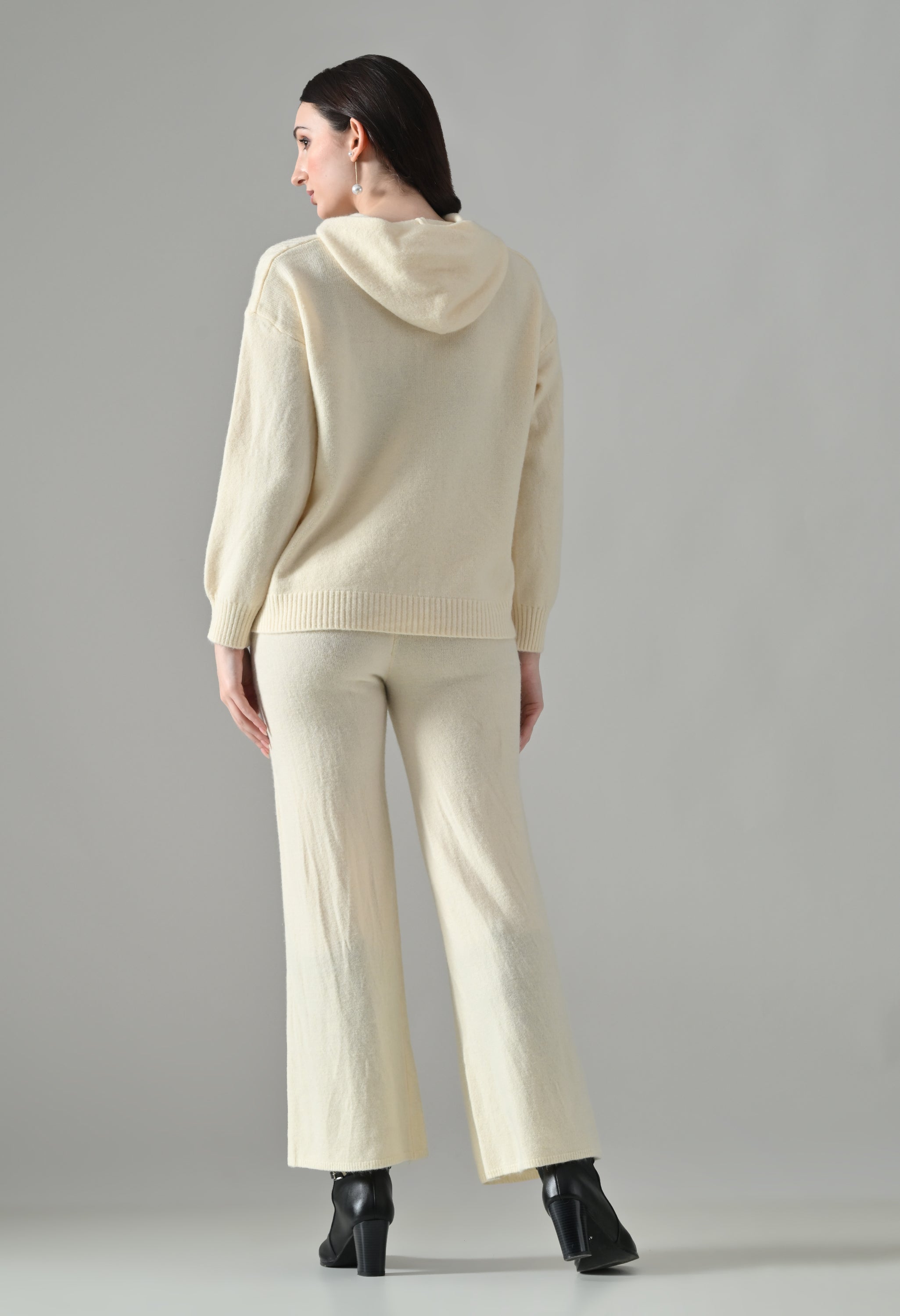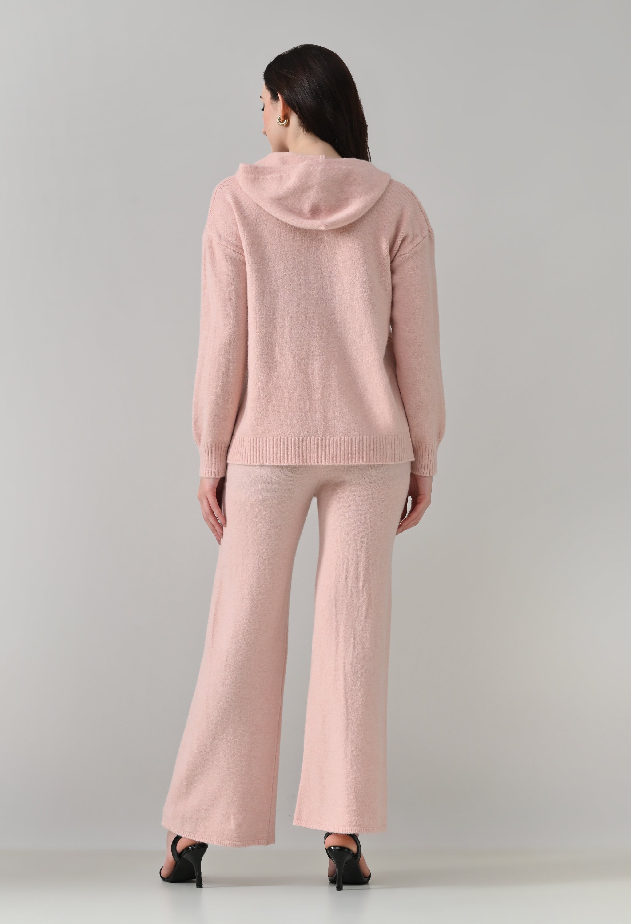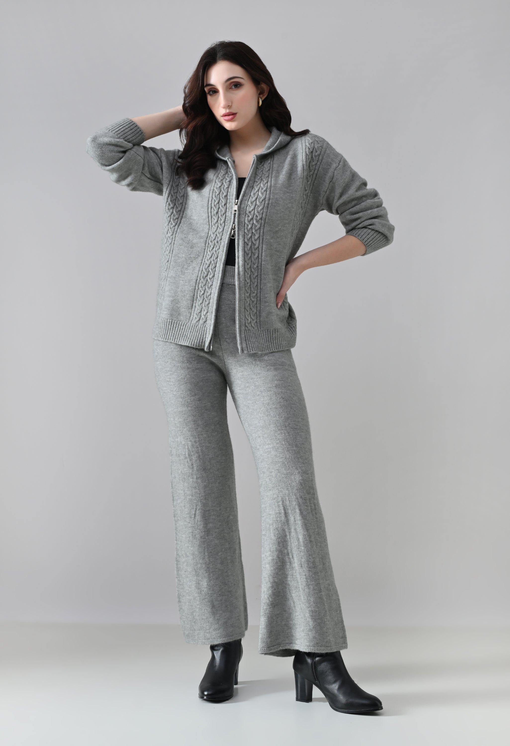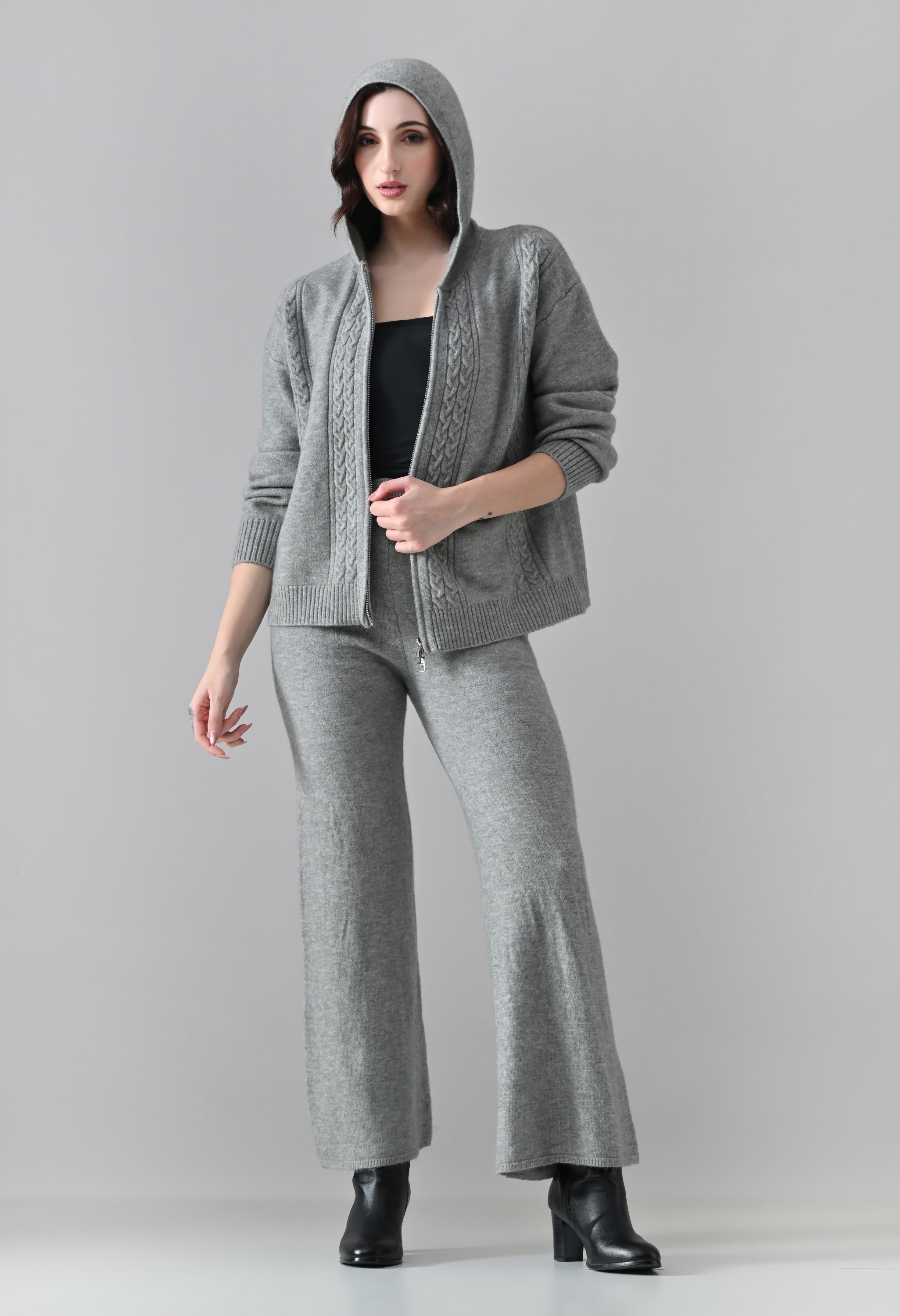 This soft woolen-blend knit co-ord set combines warmth, comfort, and everyday style. The hoodie features a front zip-up closure, a cozy hooded neckline, and elegant cable-knit detailing on the front. Full sleeves with ribbed cuffs and a regular-length ribbed hem offer a secure, clean finish. The matching bottoms come with an elasticated waistband and a straight-fit silhouette, ensuring effortless comfort and a relaxed look—perfect for winter lounging or casual outings.