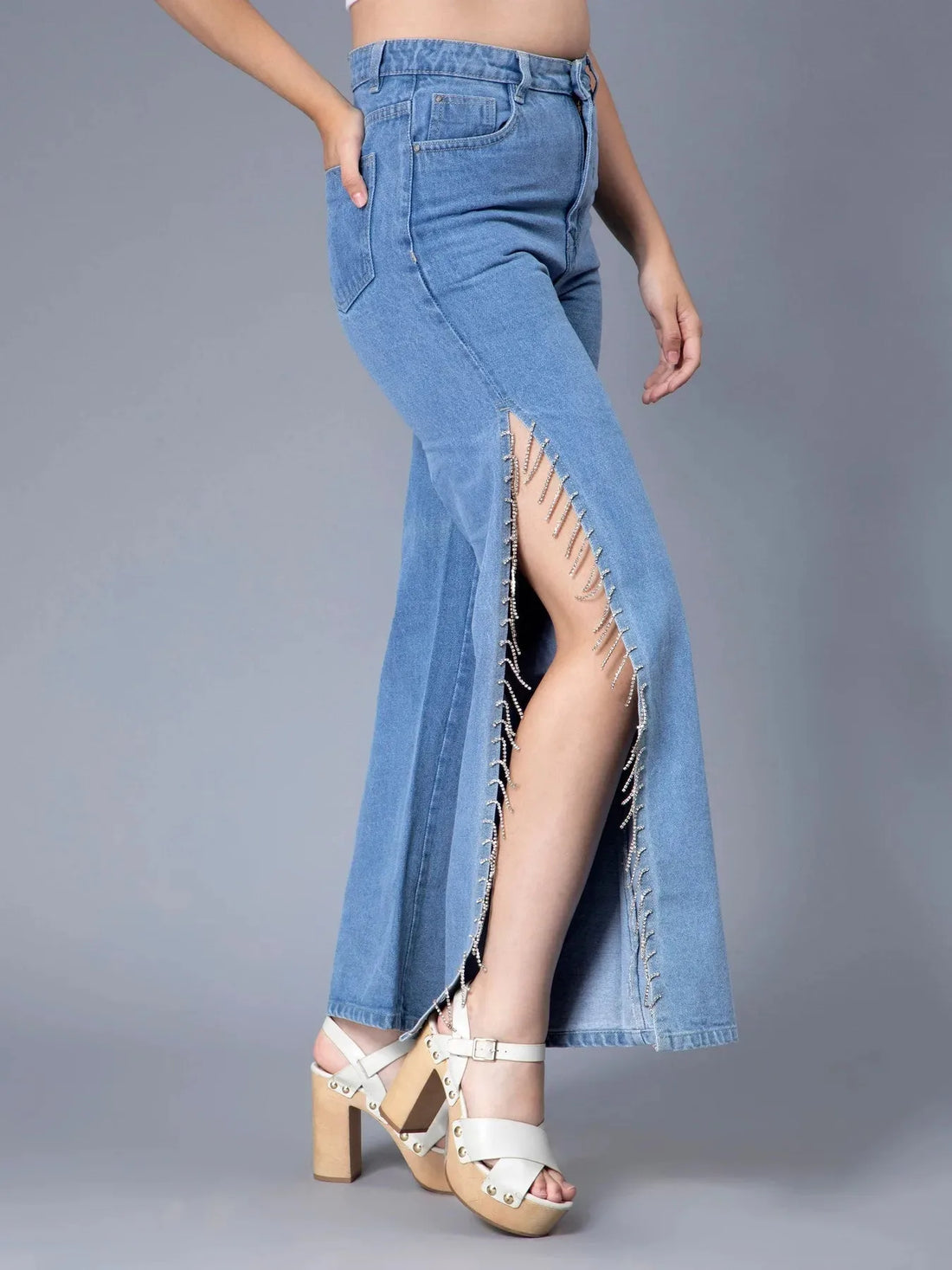 Rhinestones Fringe Side Slit Denim JeansRhinestones Fringe Side Slit Denim Jeans- Regular price
