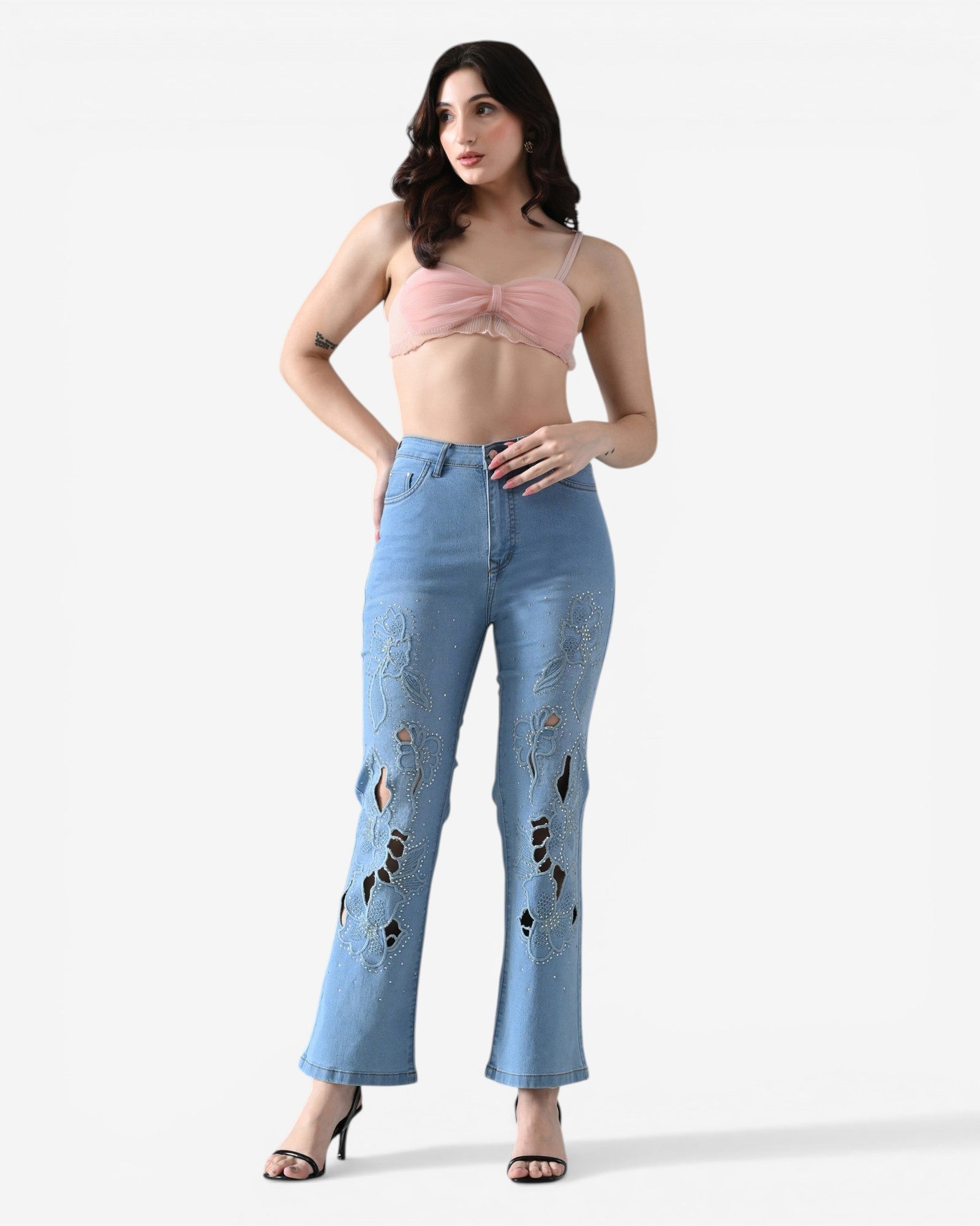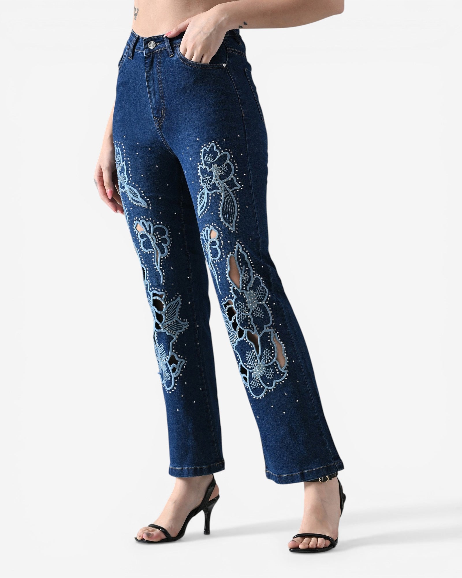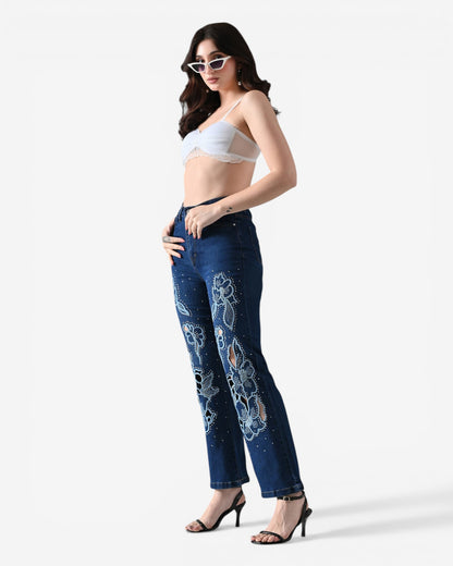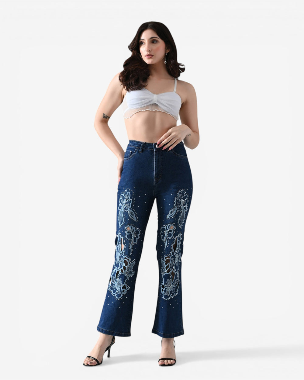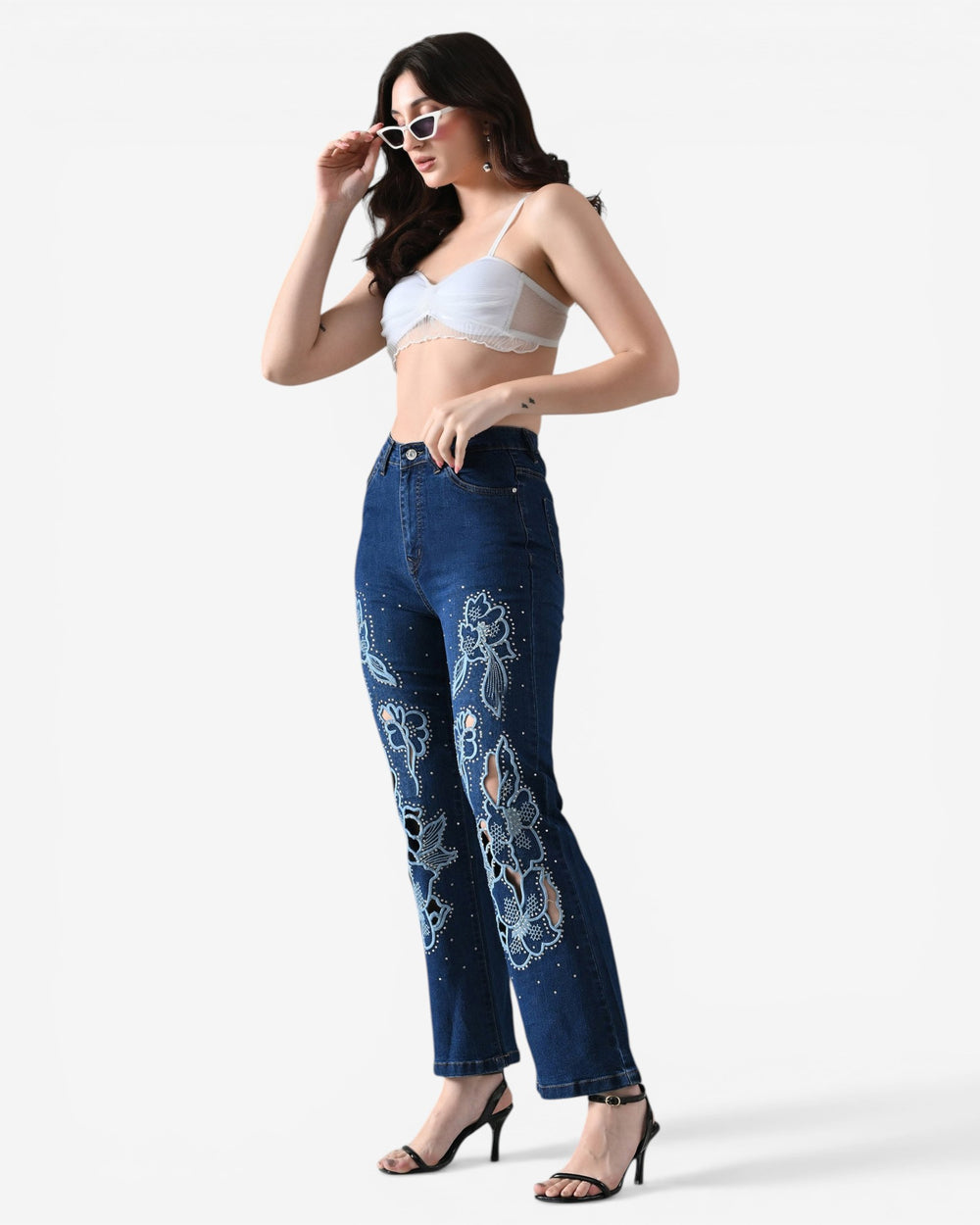 These denim jeans feature a statement floral cutwork design that adds an artistic, handcrafted appeal. Accented with delicate embellishments and sheer cut-out detailing, they create a striking balance between edgy and feminine. The straight-fit silhouette with a slight flare at the hem ensures a flattering shape while making these jeans a standout piece for festive, party, or elevated casual looks.