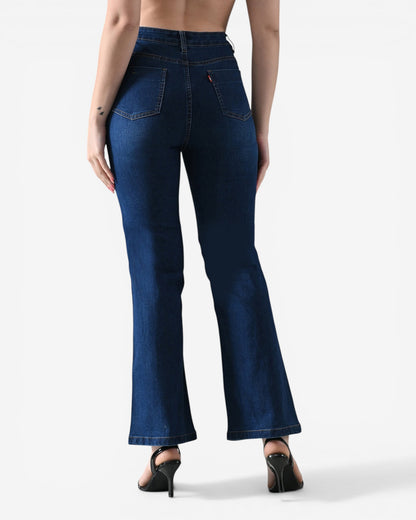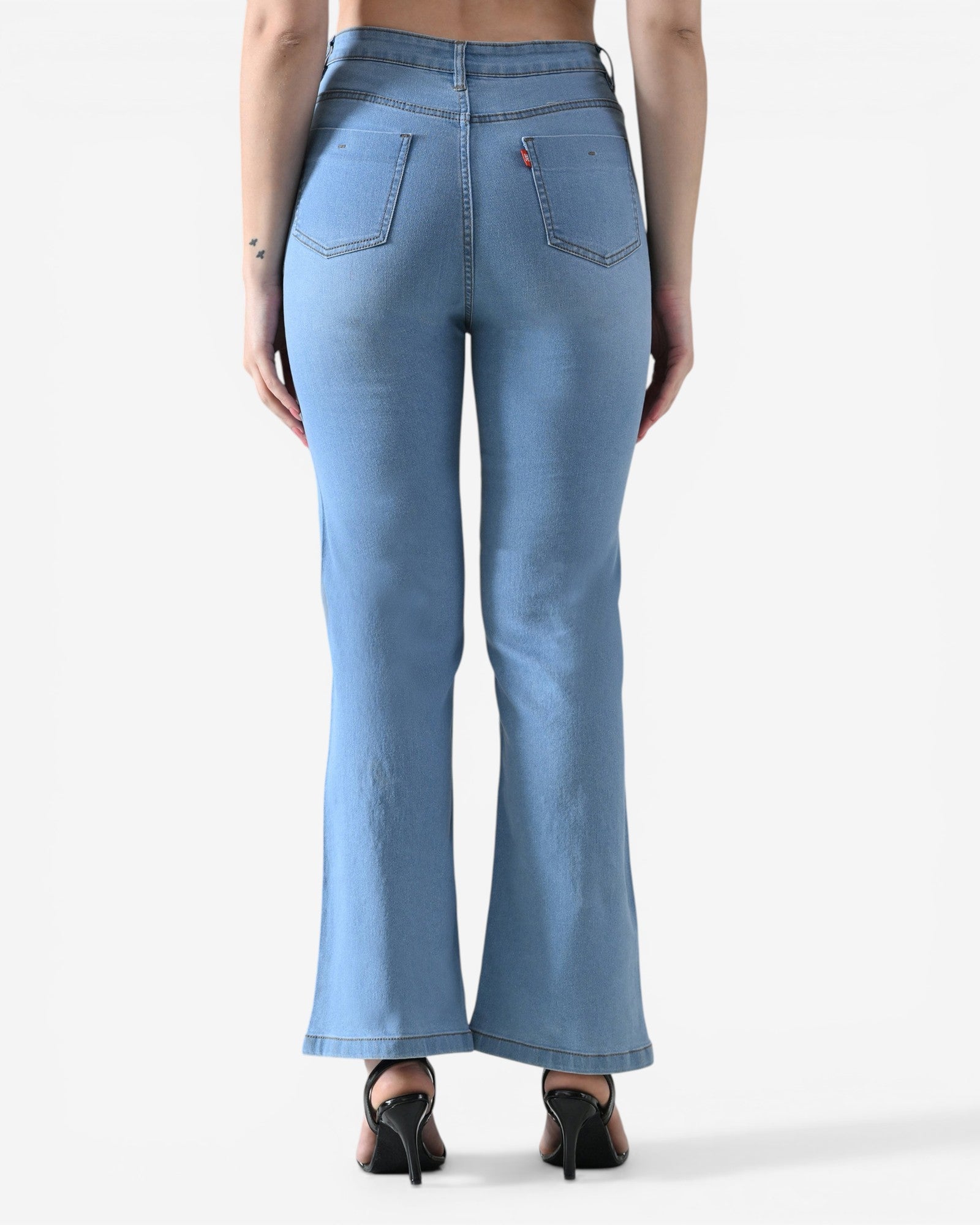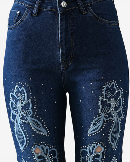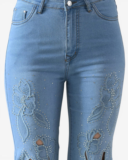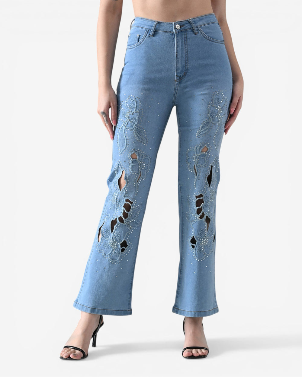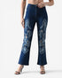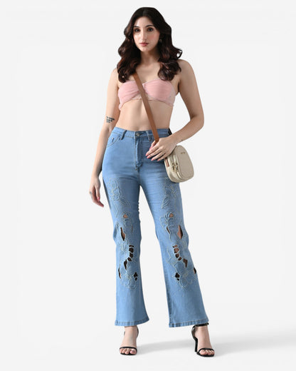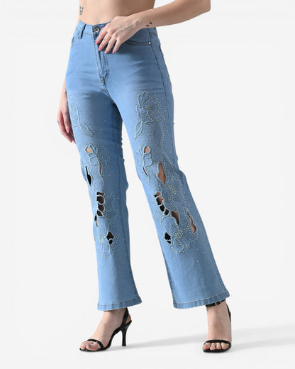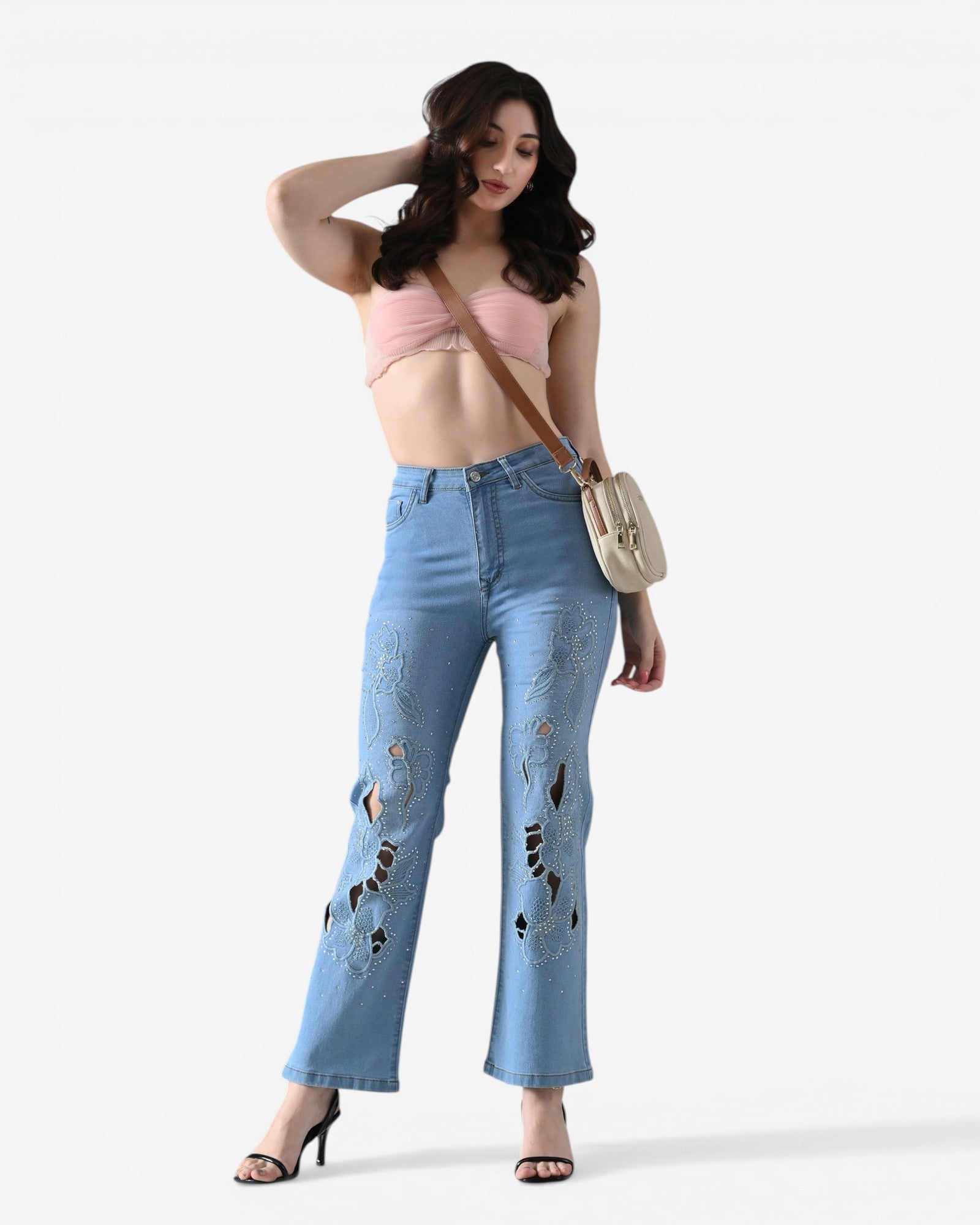 These denim jeans feature a statement floral cutwork design that adds an artistic, handcrafted appeal. Accented with delicate embellishments and sheer cut-out detailing, they create a striking balance between edgy and feminine. The straight-fit silhouette with a slight flare at the hem ensures a flattering shape while making these jeans a standout piece for festive, party, or elevated casual looks.