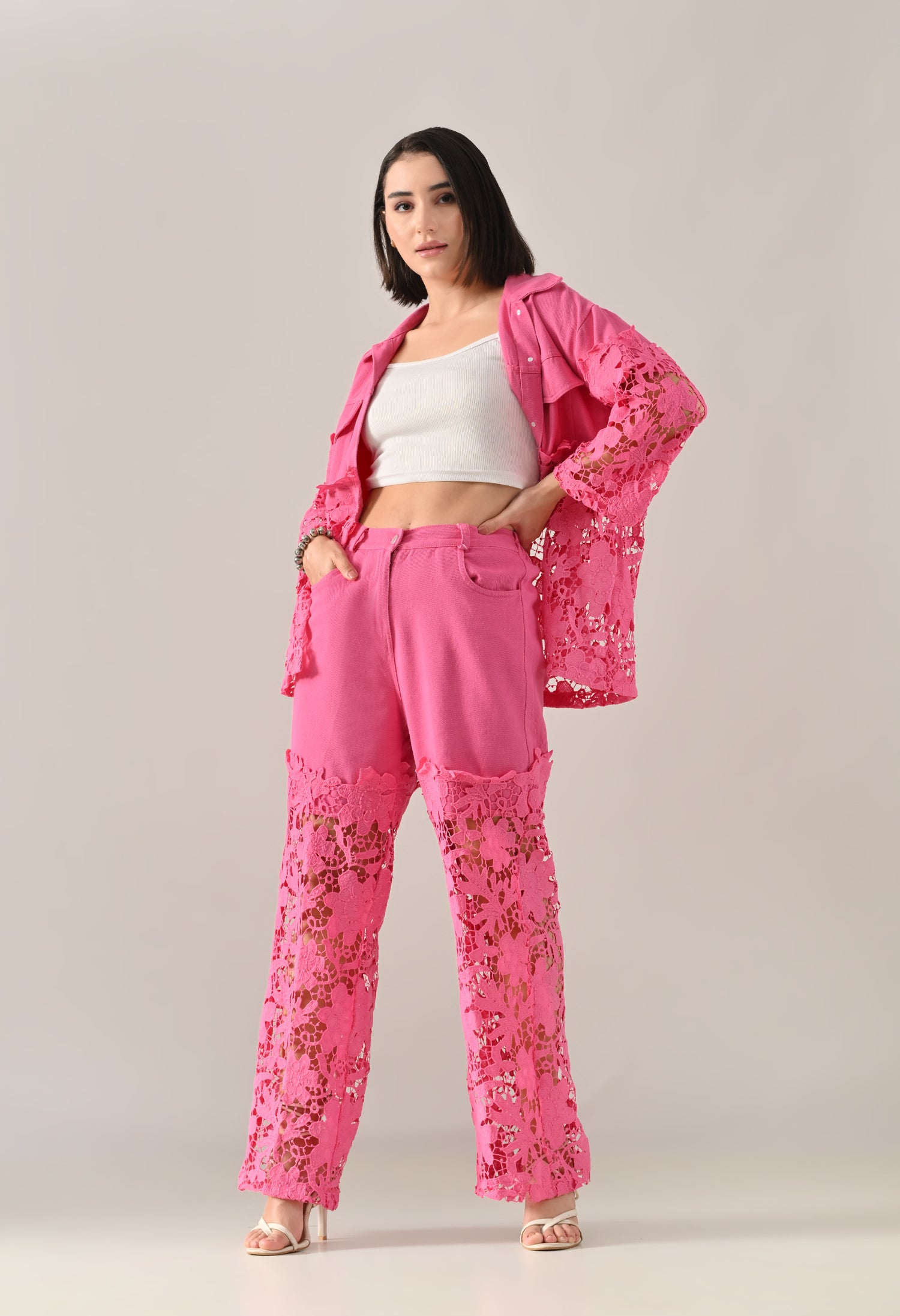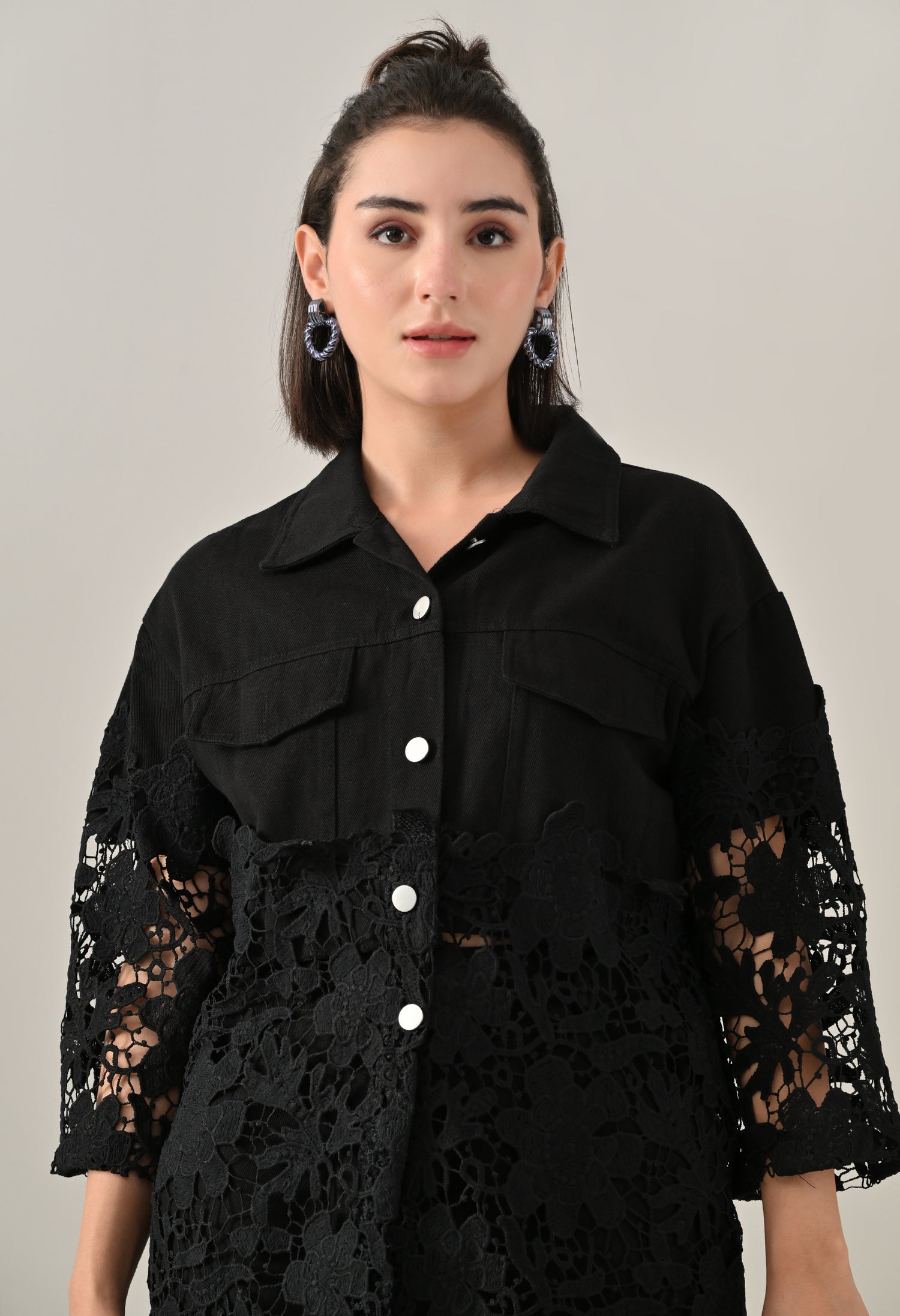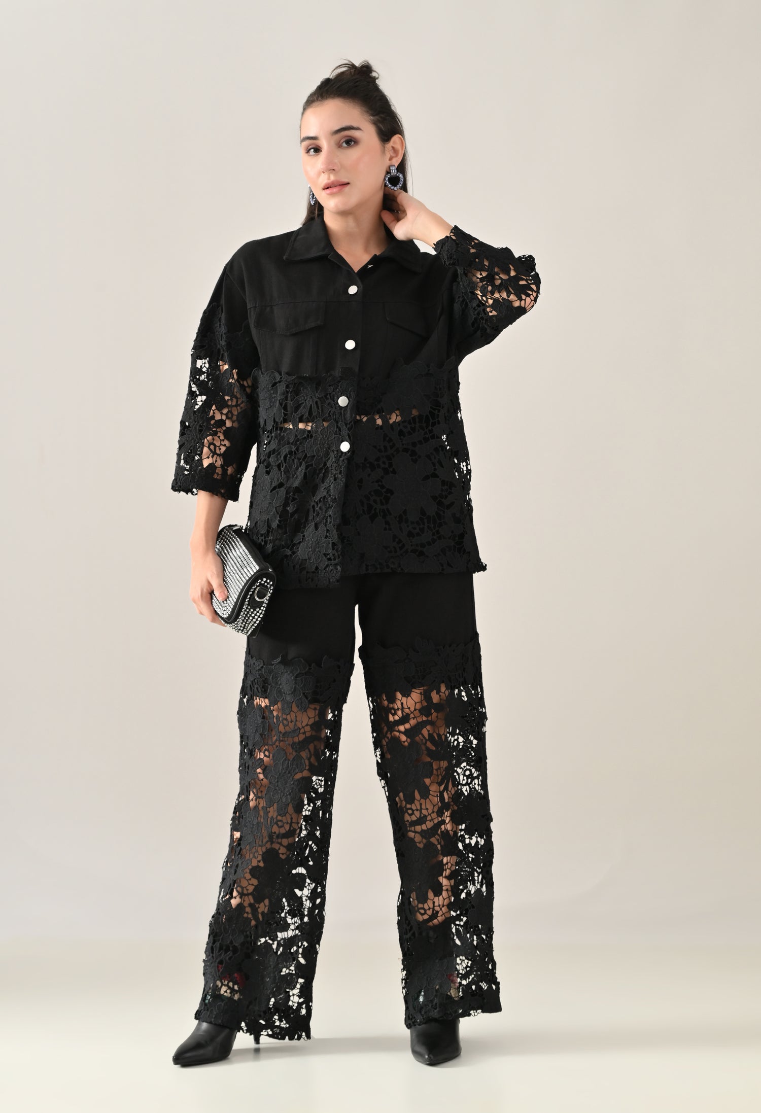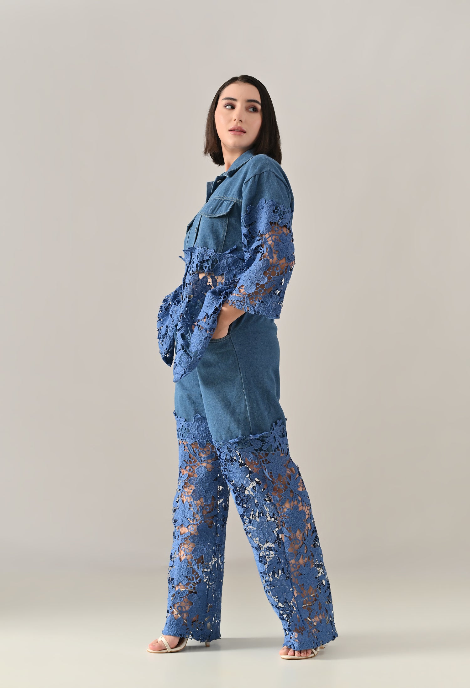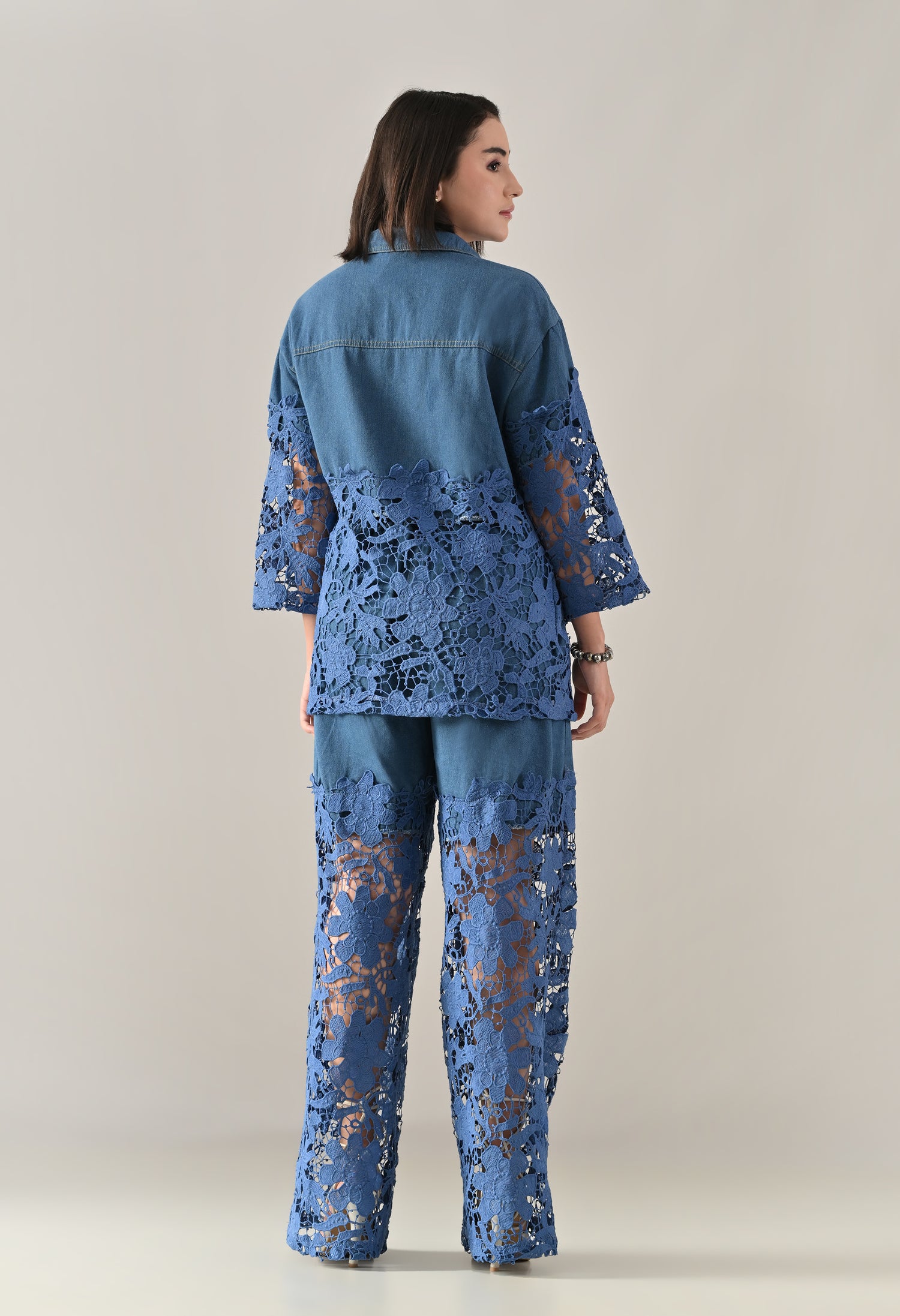 A trendy enzyme-washed denim cord set featuring a regular collar band shirt with an open front placket, showy pockets with flaps, and silver shank buttons for a stylish finish. The design is elevated with lace detailing at the bottom for a feminine touch. Paired with matching denim bottoms featuring a waistband with open fly and zipper, half elasticated waist, and belt loops for ease and comfort. Finished with contrast stitching details, this set is crafted from soft, comfortable, non-stretchable fabric, blending casual denim appeal with chic lace accents.