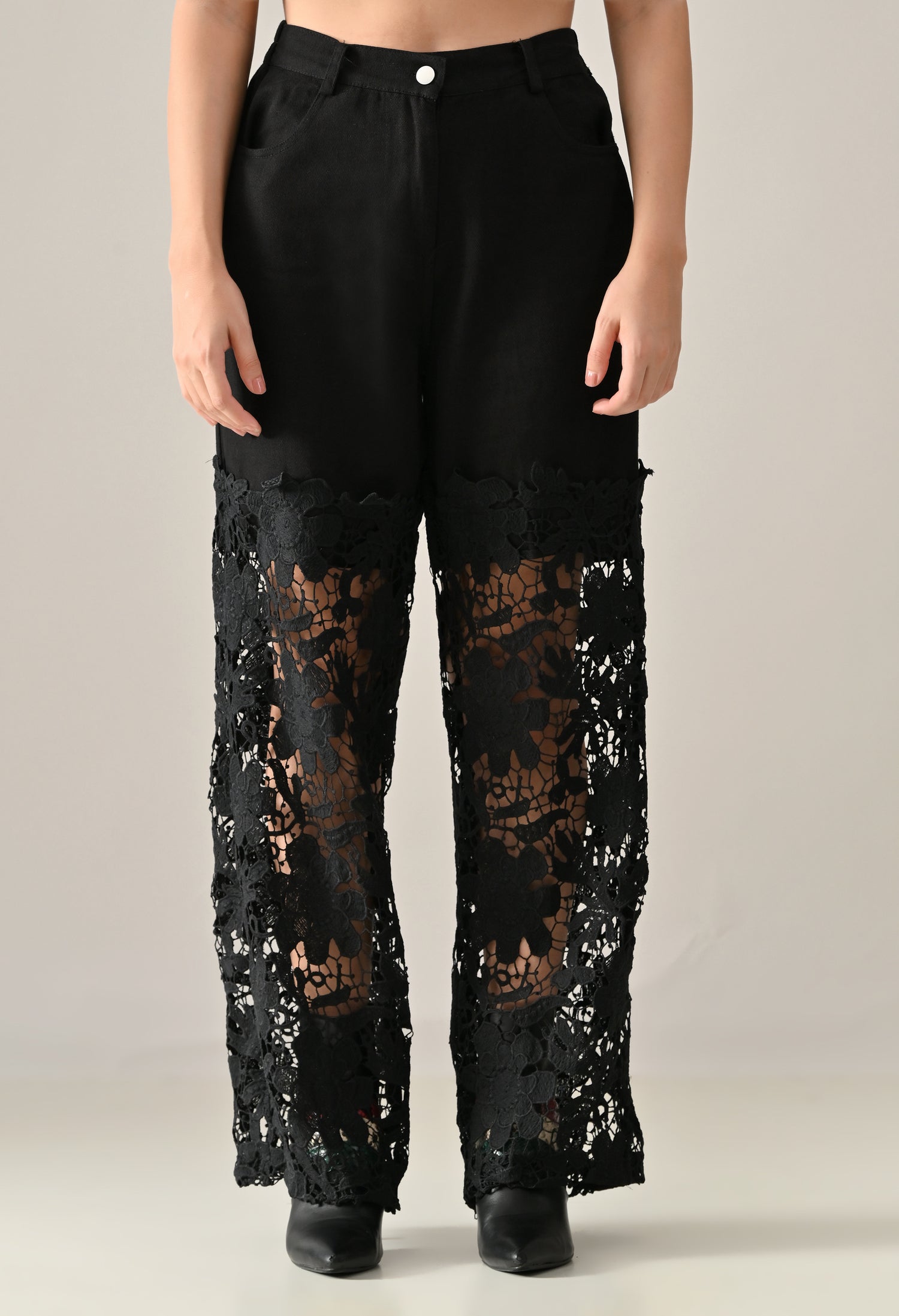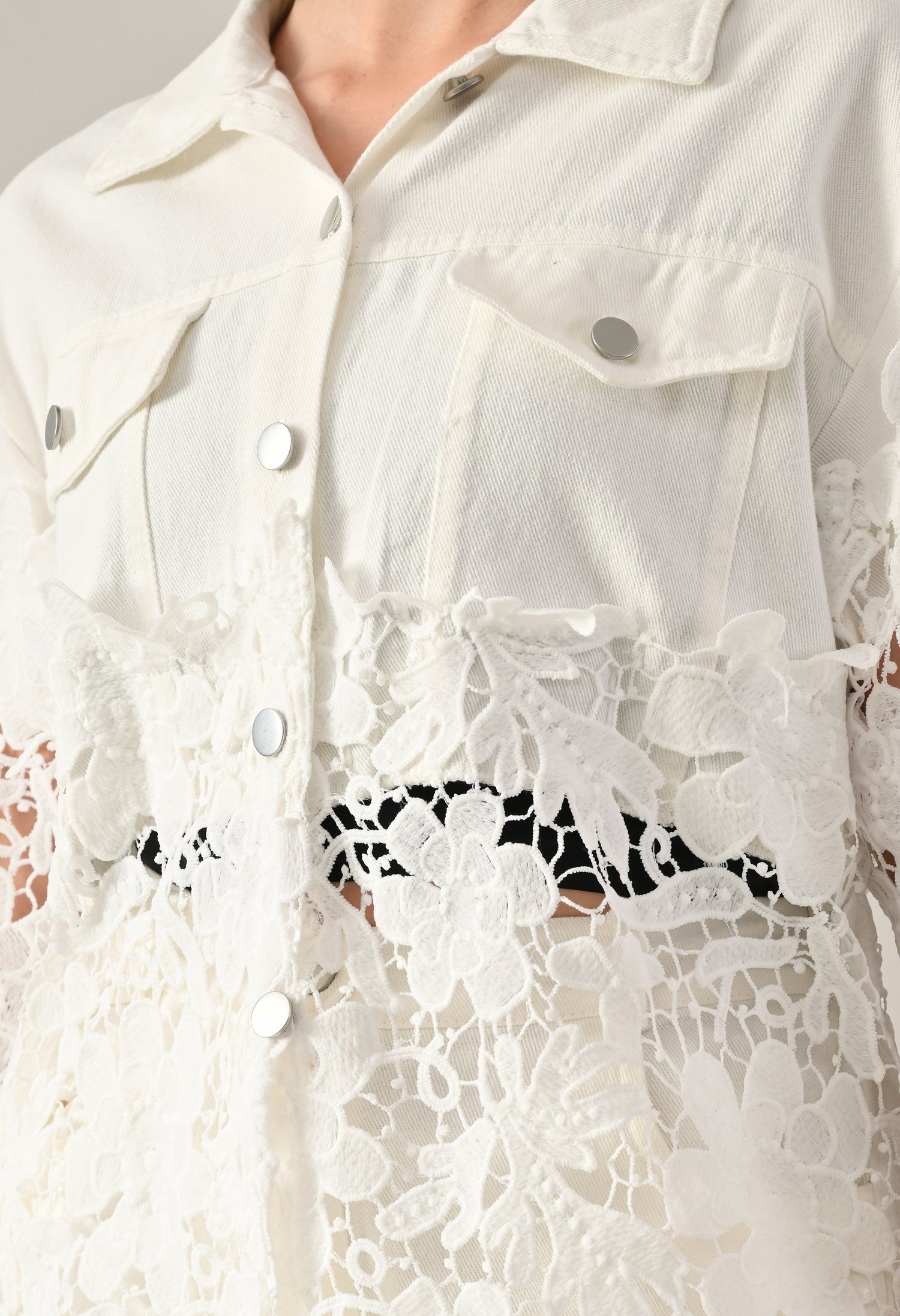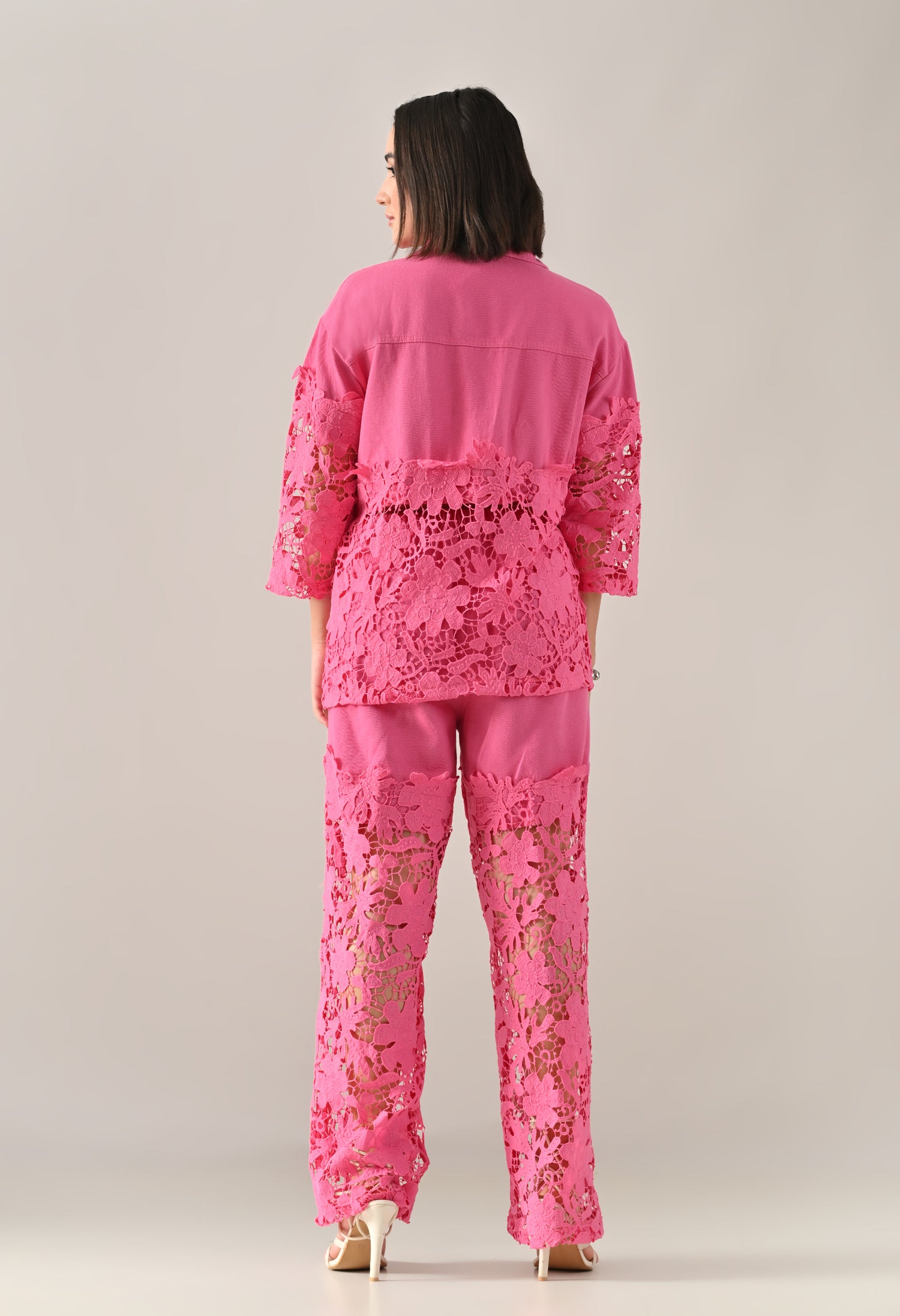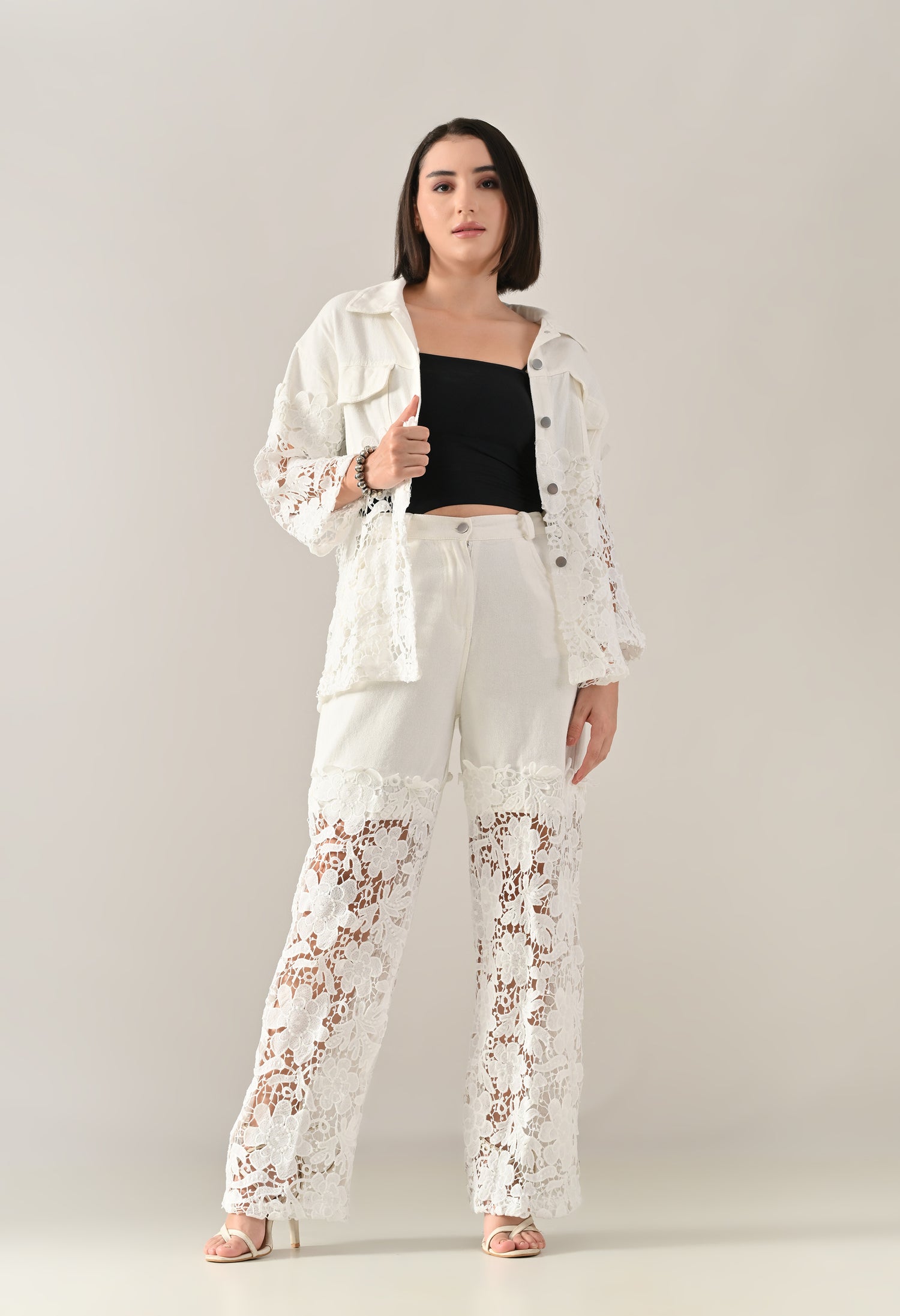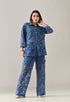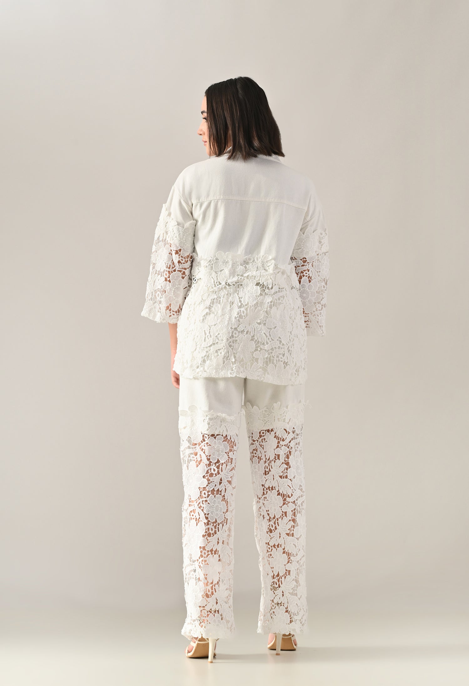 A trendy enzyme-washed denim cord set featuring a regular collar band shirt with an open front placket, showy pockets with flaps, and silver shank buttons for a stylish finish. The design is elevated with lace detailing at the bottom for a feminine touch. Paired with matching denim bottoms featuring a waistband with open fly and zipper, half elasticated waist, and belt loops for ease and comfort. Finished with contrast stitching details, this set is crafted from soft, comfortable, non-stretchable fabric, blending casual denim appeal with chic lace accents.