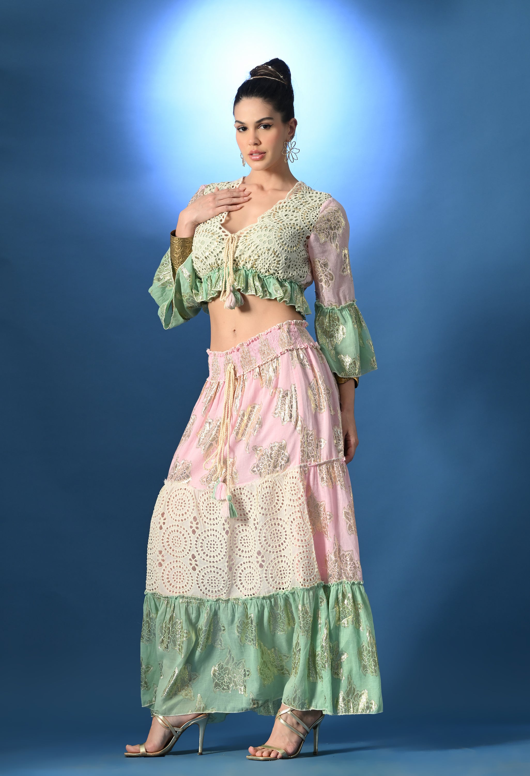 Elegant Co-ord set features a scalloped V-neckline with a string tie and multicolor tassels, paired with a schiffli front panel highlighted with delicate sequin work. The elasticated waist with gathers flatters the silhouette, while the ¾ sleeves with ruffle openings in lurex fabric add a chic touch. A lurex ruffle hem and schiffli cut & sew panel at the center front enhance the crafted look. The long flared lurex skirt, complete with a smocked waist and tassel tie, flows beautifully with every step. Soft, and comfortable, this non-stretchable piece is designed for elegance and ease, making it perfect for festive and special occasions.