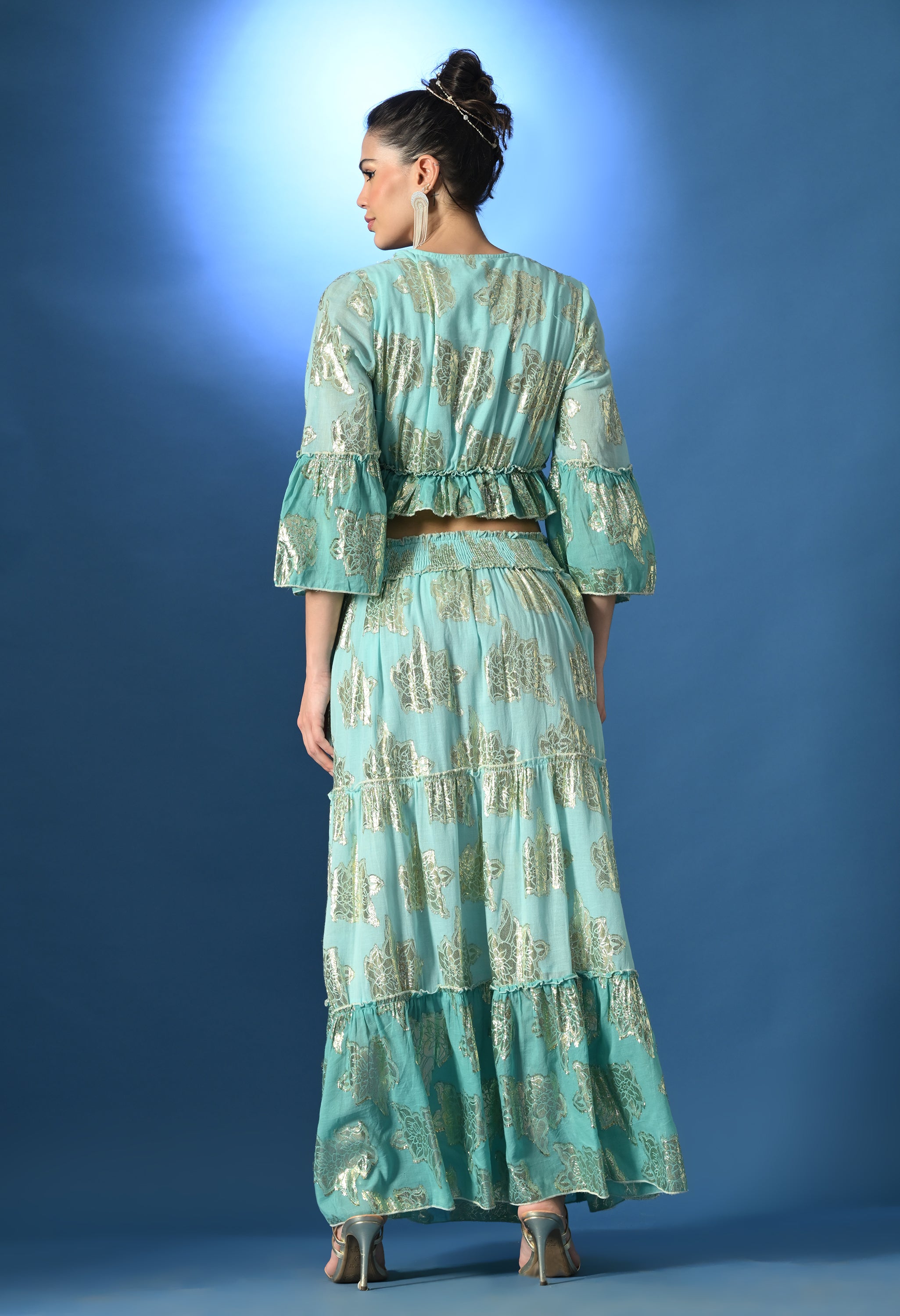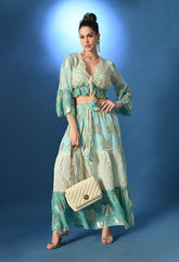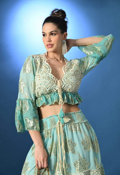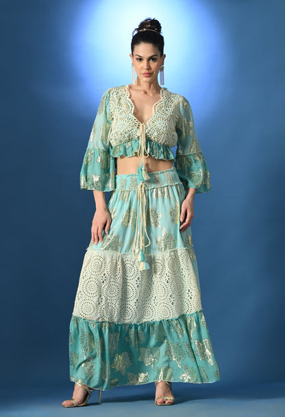 Elegant cordset features a scalloped V-neckline with a string tie and multicolor tassels, paired with a schiffli front panel highlighted with delicate sequin work. The elasticated waist with gathers flatters the silhouette, while the ¾ sleeves with ruffle openings in lurex fabric add a chic touch. A lurex ruffle hem and schiffli cut & sew panel at the center front enhance the crafted look. The long flared lurex skirt, complete with a smocked waist and tassel tie, flows beautifully with every step. Soft, and comfortable, this non-stretchable piece is designed for elegance and ease, making it perfect for festive and special occasions.