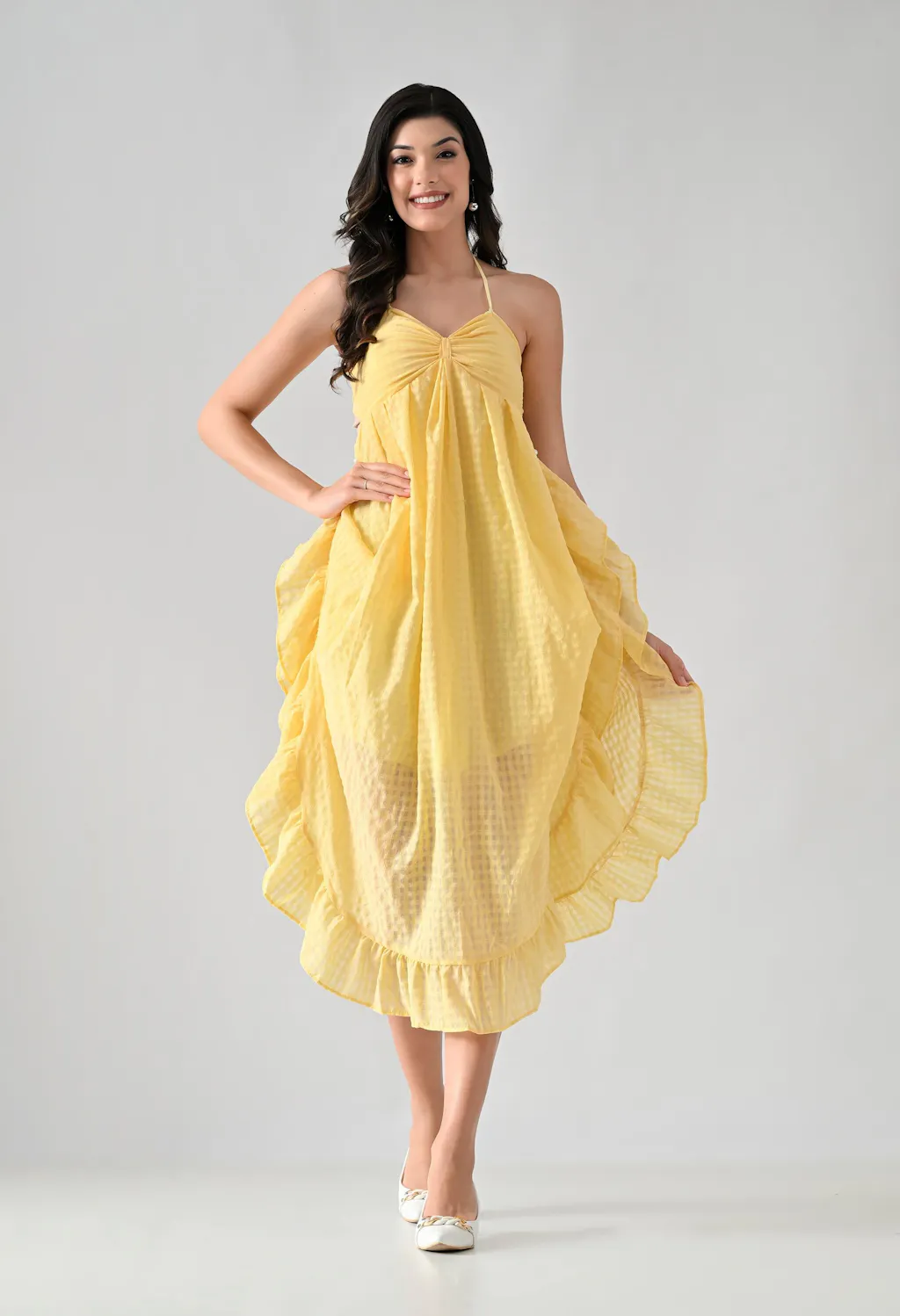 Light as sunshine, bold like summer. This flared halter dress features a gathered bust, subtle check texture, and a dramatic high-low ruffle hem. Whether you're lounging by the coast or strolling through city heat, this piece brings an easy, breezy vibe with a touch of drama.