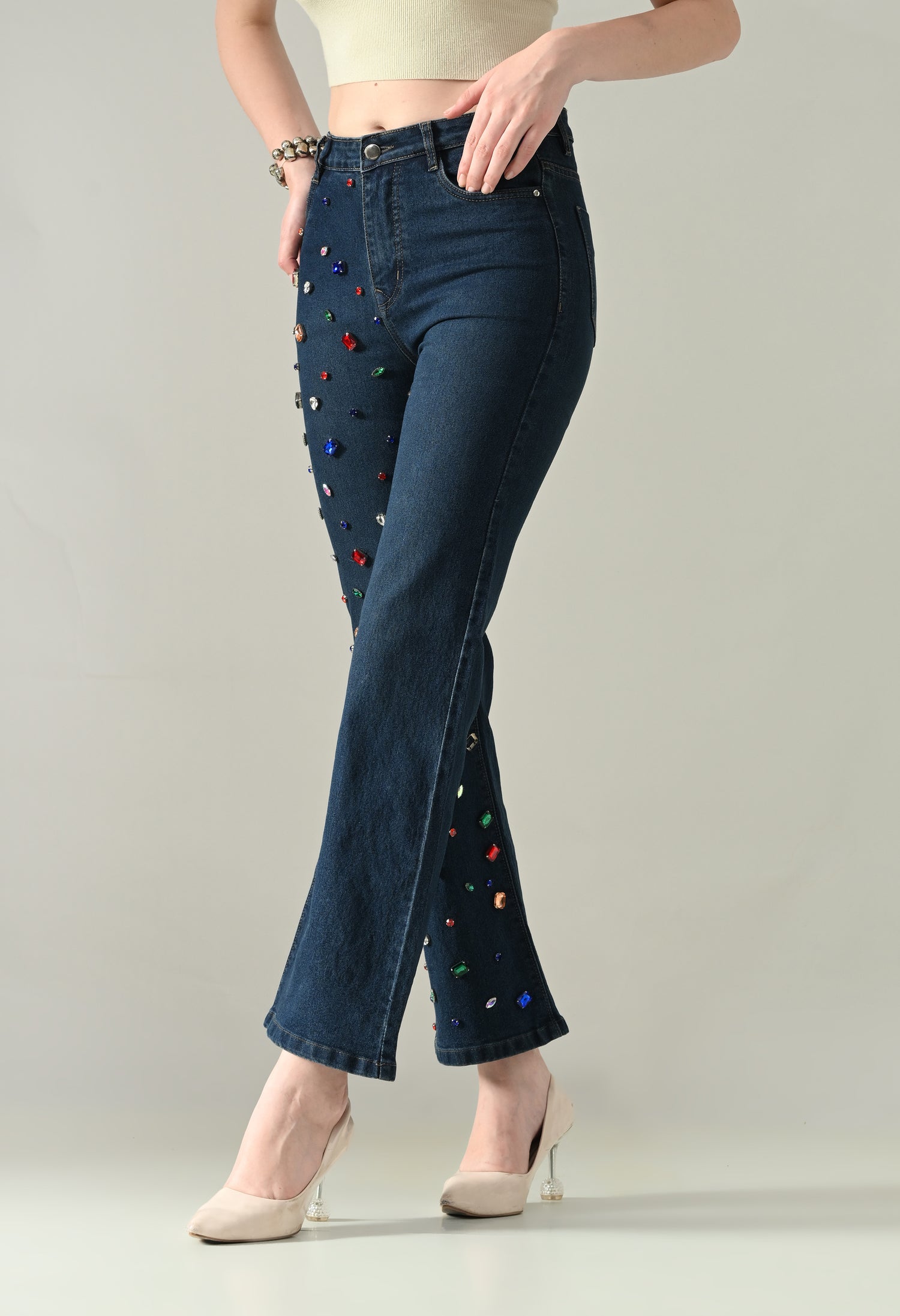 Shine in style with the Rhinestone Radiance Denim Jeans, designed in a flattering high-rise fit with a straight silhouette and full length cut. Embellished with multi-colour crystal glass diamante rhinestones, these jeans feature a front button closure with zip fly, classic 5-pocket styling (2 front with coin pocket, 2 back patch pockets), and a comfortable stretchable fabric for all-day wear.