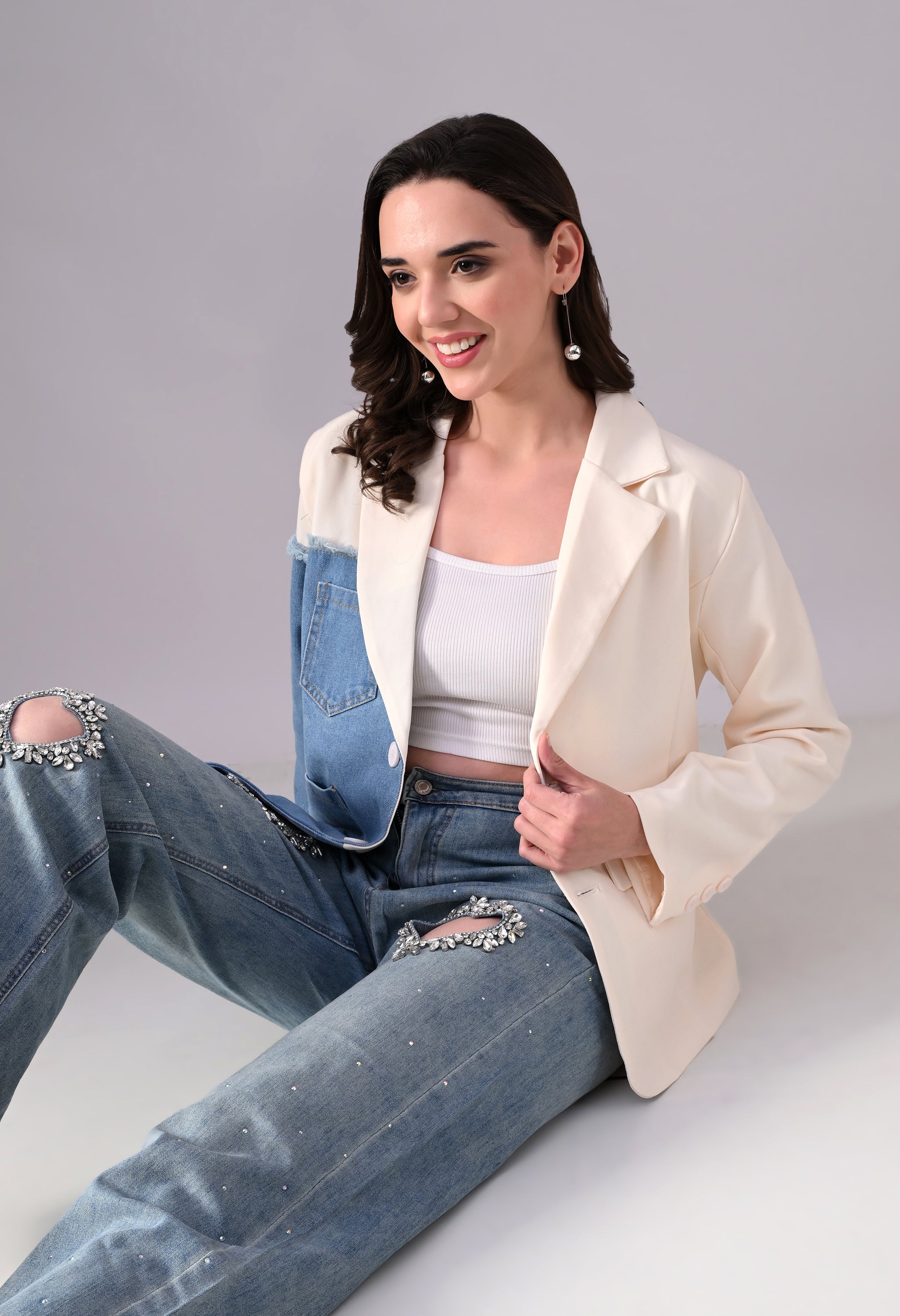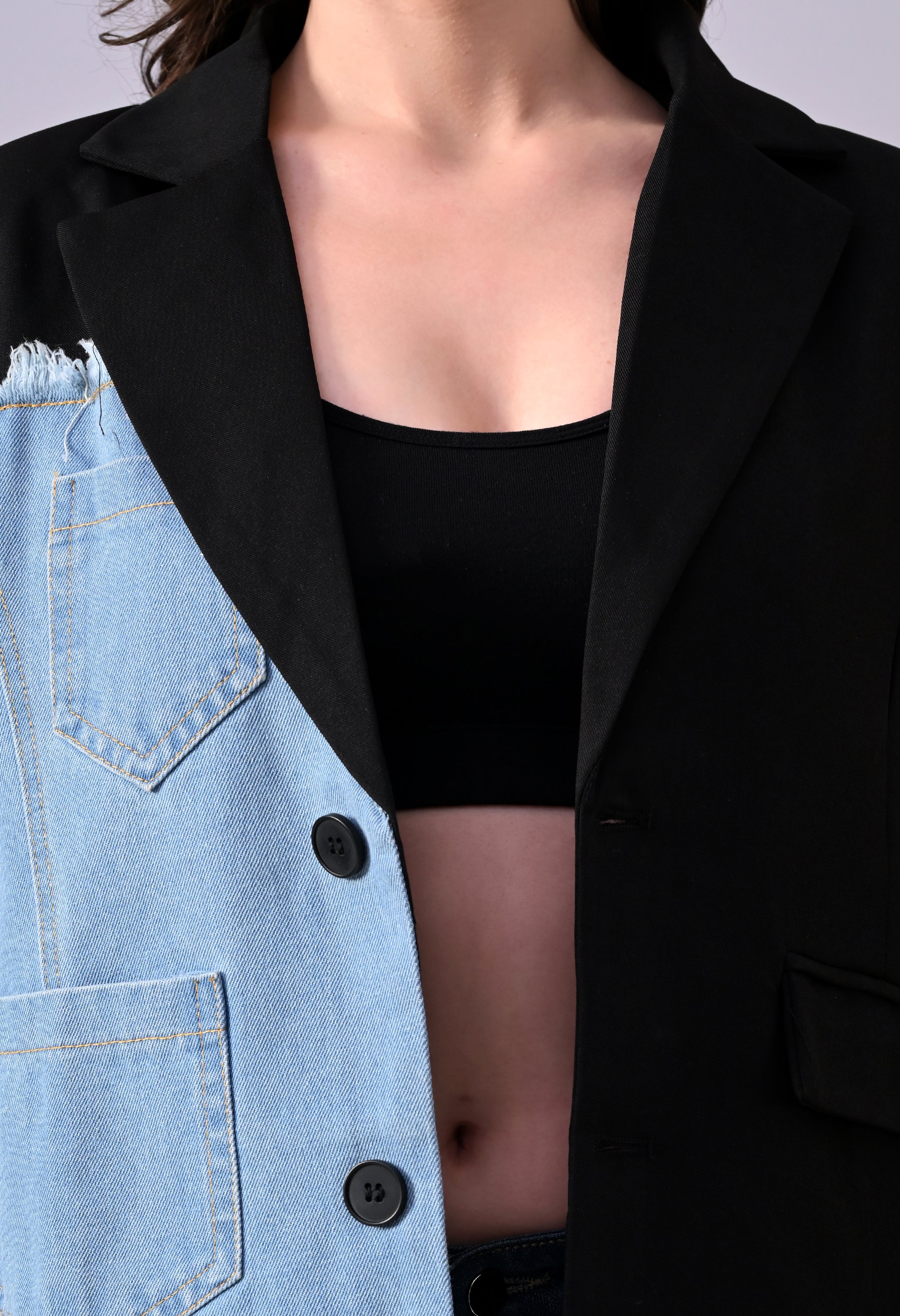 This statement blazer features a bold two-in-one design that fuses classic tailoring with contemporary denim detailing. Crafted with a structured blazer silhouette, it showcases a sharp notched lapel collar and a clean front button closure for a polished look. The contrast denim paneling with raw, frayed edges adds a modern, edgy twist, making it a standout layering piece for both casual and elevated styling. Available in contrasting color combinations, this blazer effortlessly balances sophistication with street-style appeal