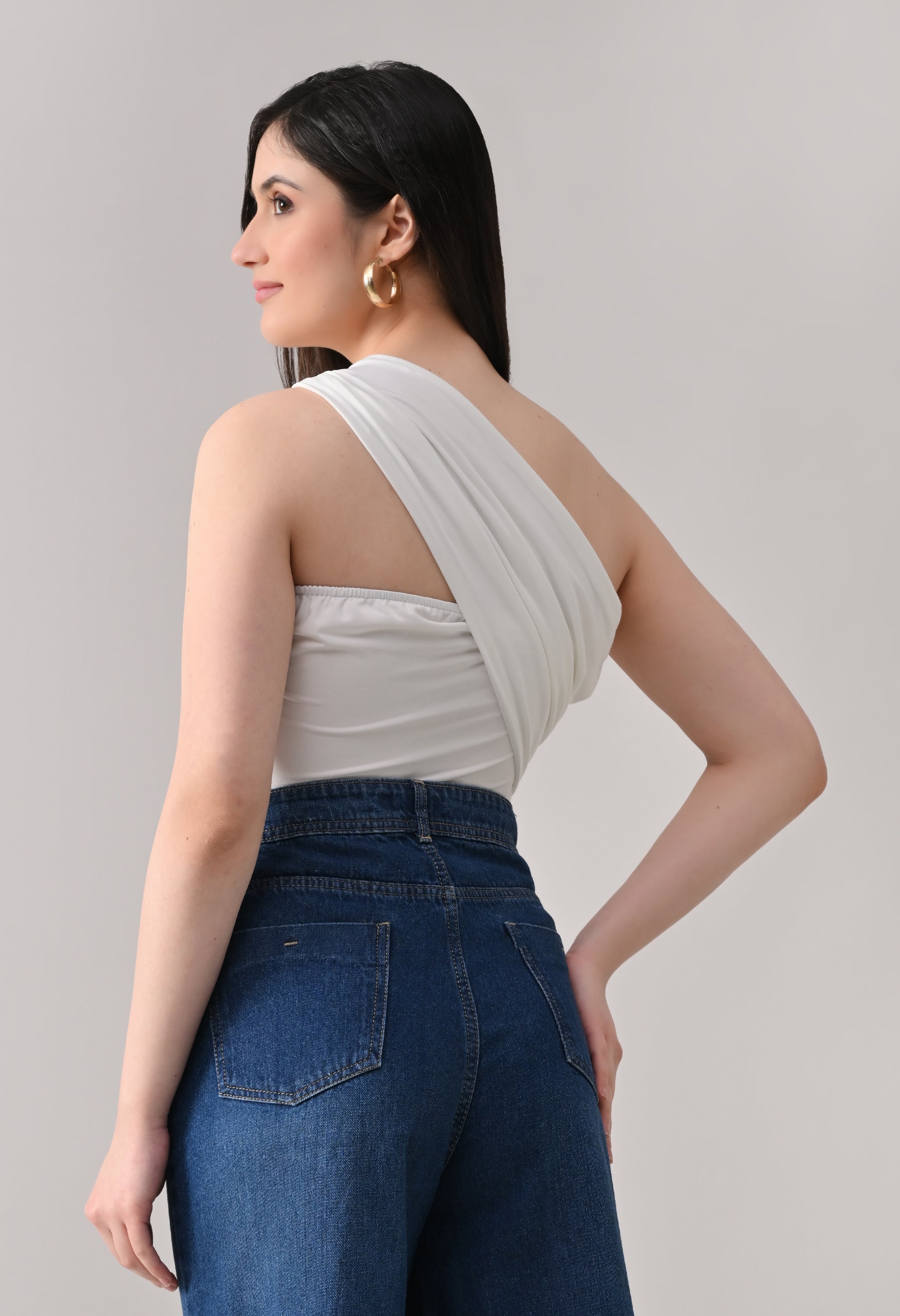 This one-shoulder bodysuit is crafted from soft stretchable fabric for a smooth, body-contouring fit, featuring an asymmetrical neckline with a statement metallic ring detail at the strap, gathered draping across the bodice for added texture and shape, and a secure snap-button closure at the base for comfortable and easy wear.