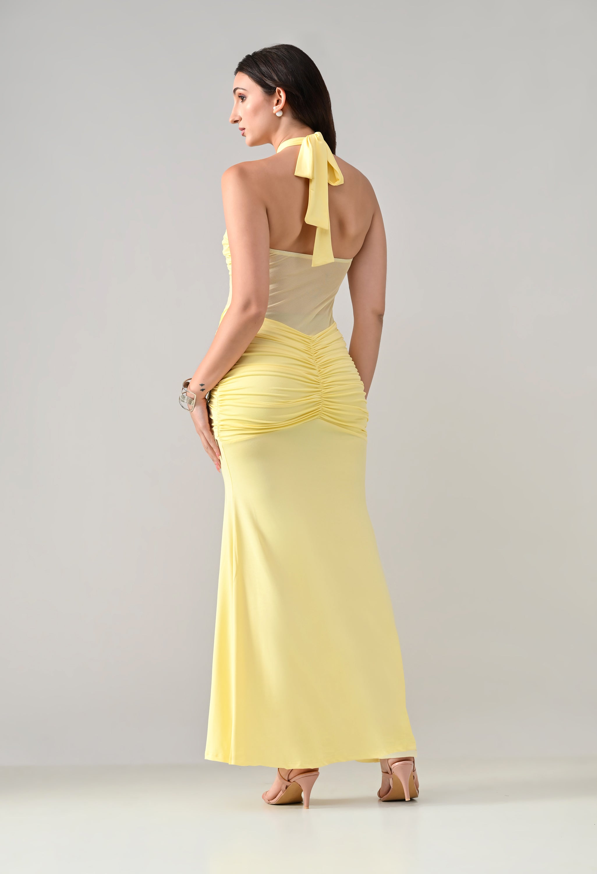 This elegant strapless maxi dress features a sculpted, body-contouring silhouette designed for statement evening wear. The bodice is enhanced with gathered ruching that accentuates the waist, while a sheer mesh waist panel creates a subtle see-through effect for a modern, flattering look. A soft cascading front drape adds movement and visual length to the design, and extended self-fabric tie straps allow adjustable styling. Crafted in a smooth, flowy fabric and finished in a rich wine/burgundy shade, this dress is ideal for parties, formal events, and special occasions.